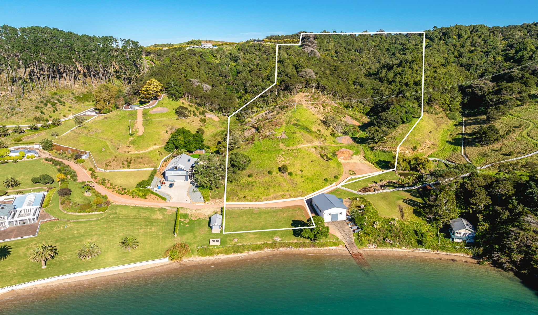An elevated building platform captures entire PIKAU Bay views, the islands of Pakotoa, Ponui and Rotoroa are front and centre. Breathtaking in scope and scale, an aquatic wonderland - enjoy the beach, a 49-metre jetty, two all tide boat launching ramps and helipad. Access to the sea is rarely available with this ease.