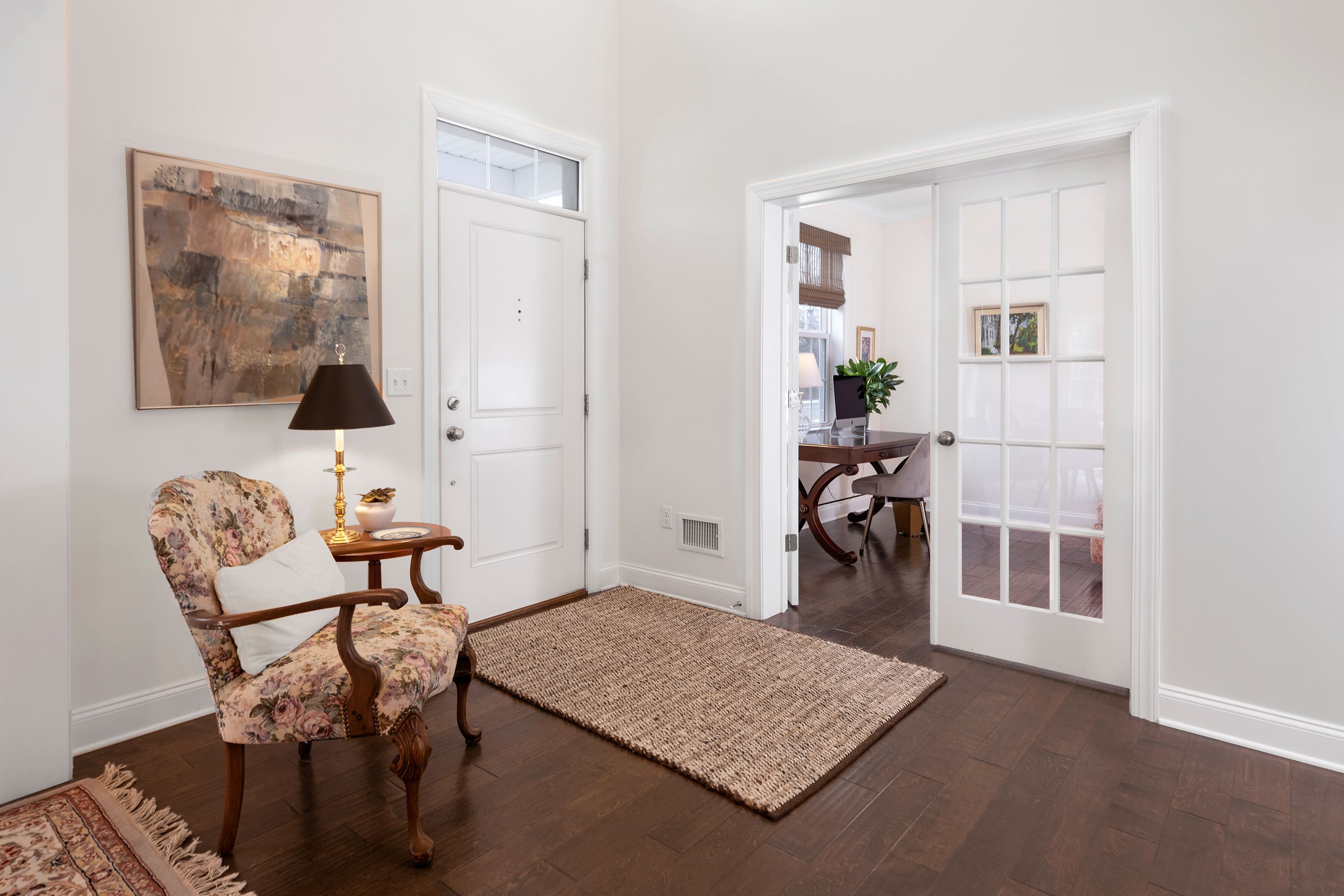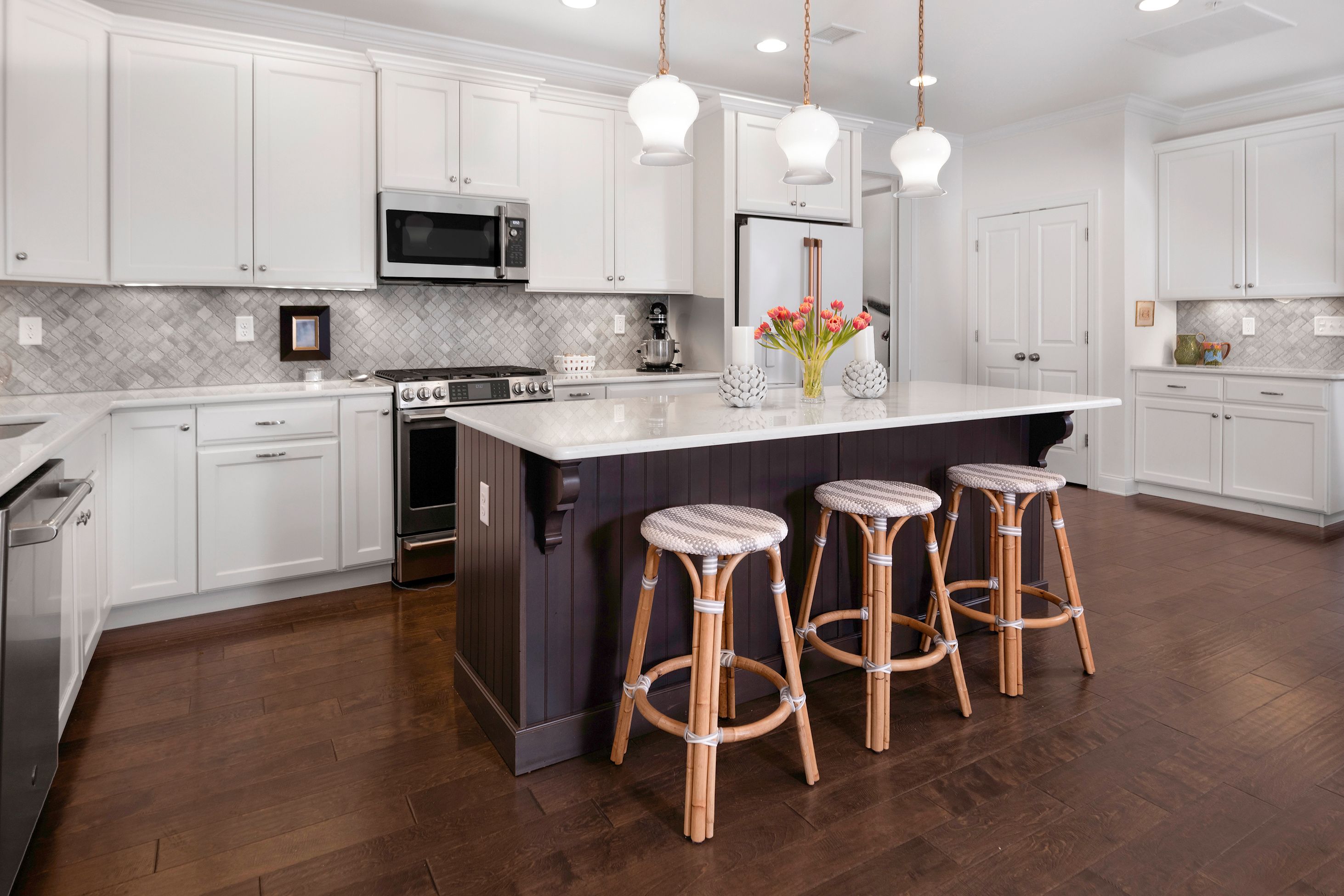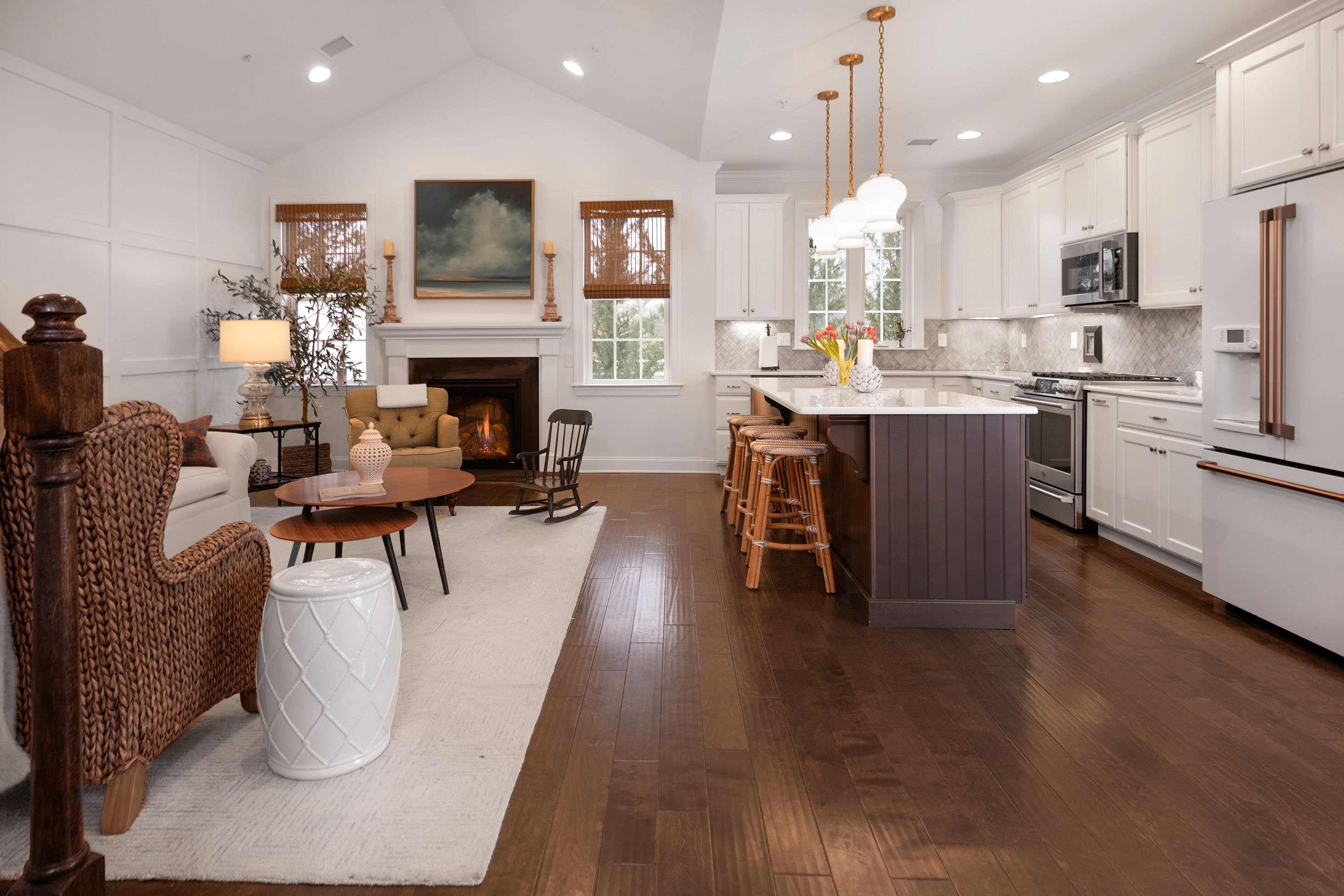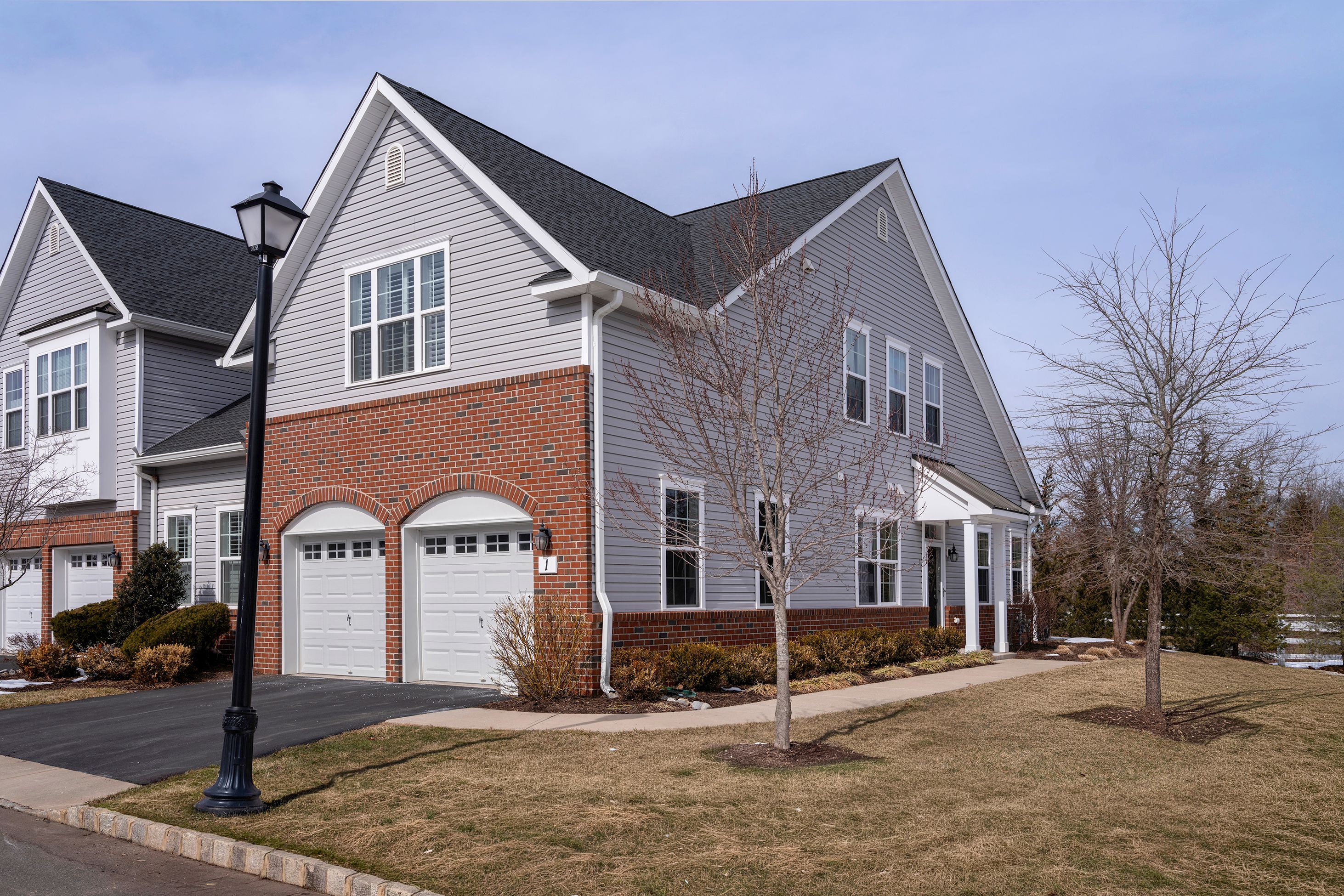 A rare end-unit offering in Heritage at Pennington, this sophisticated townhome pairs refined interiors with open-space views and a sidewalk that leads directly from the front door to Pennington’s beloved shops and cafés. Inside, find a fabulous home that begins with a home office/den behind French doors. The generously scaled dining room is designed for memorable gatherings, with sliding doors that open onto a patio with a dedicated gas line for grilling. The kitchen is urbane and beautifully integrated with the adjoining family room with a gas fireplace, creating a natural space for living and entertaining alike. A substantial quartz peninsula provides seating and prep space, complemented by attractive appliances and a clean, contemporary aesthetic that feels polished and inviting. The first-floor primary suite is enhanced by a striking picture-frame accent wall and an organized walk-in closet. The en suite bath is thoughtfully designed with backlit mirrors, a built-in chest between dual sinks, and an oversized glass shower that adds a spa-like touch. Practical comforts are seamlessly integrated into a laundry room and a powder room along the hallway leading to the insulated two-car garage, a hand-chosen upgrade that’s rare to find in this community. Upstairs, two spacious bedrooms each have a walk-in closet and share a well-appointed hall bathroom. A generous loft expands the living possibilities, easily serving as a media lounge, with storage thoughtfully positioned nearby. Refined, flexible, and ideally situated, this distinctive home offers an elevated lifestyle just under half a mile from Pennington’s heart.