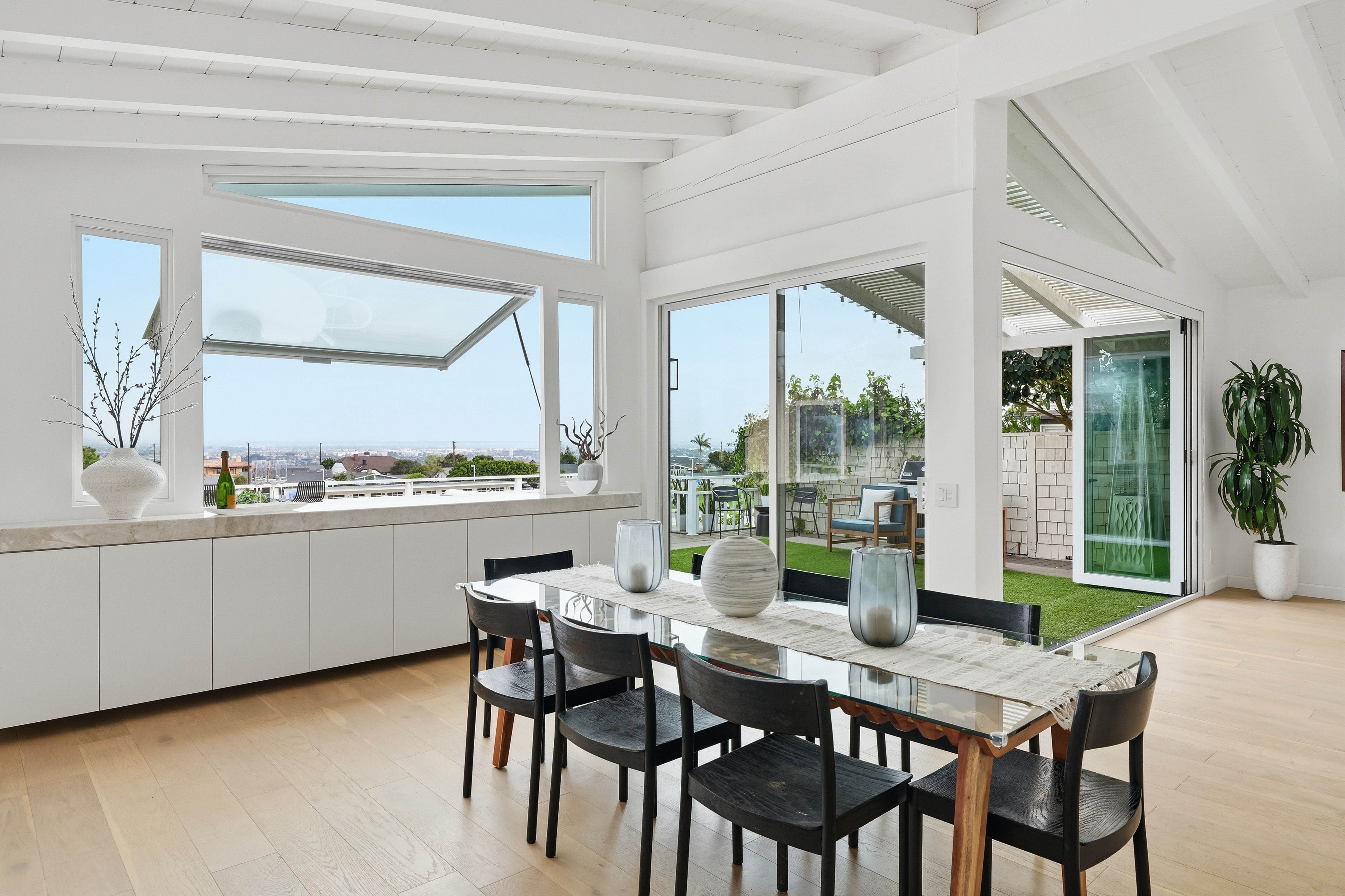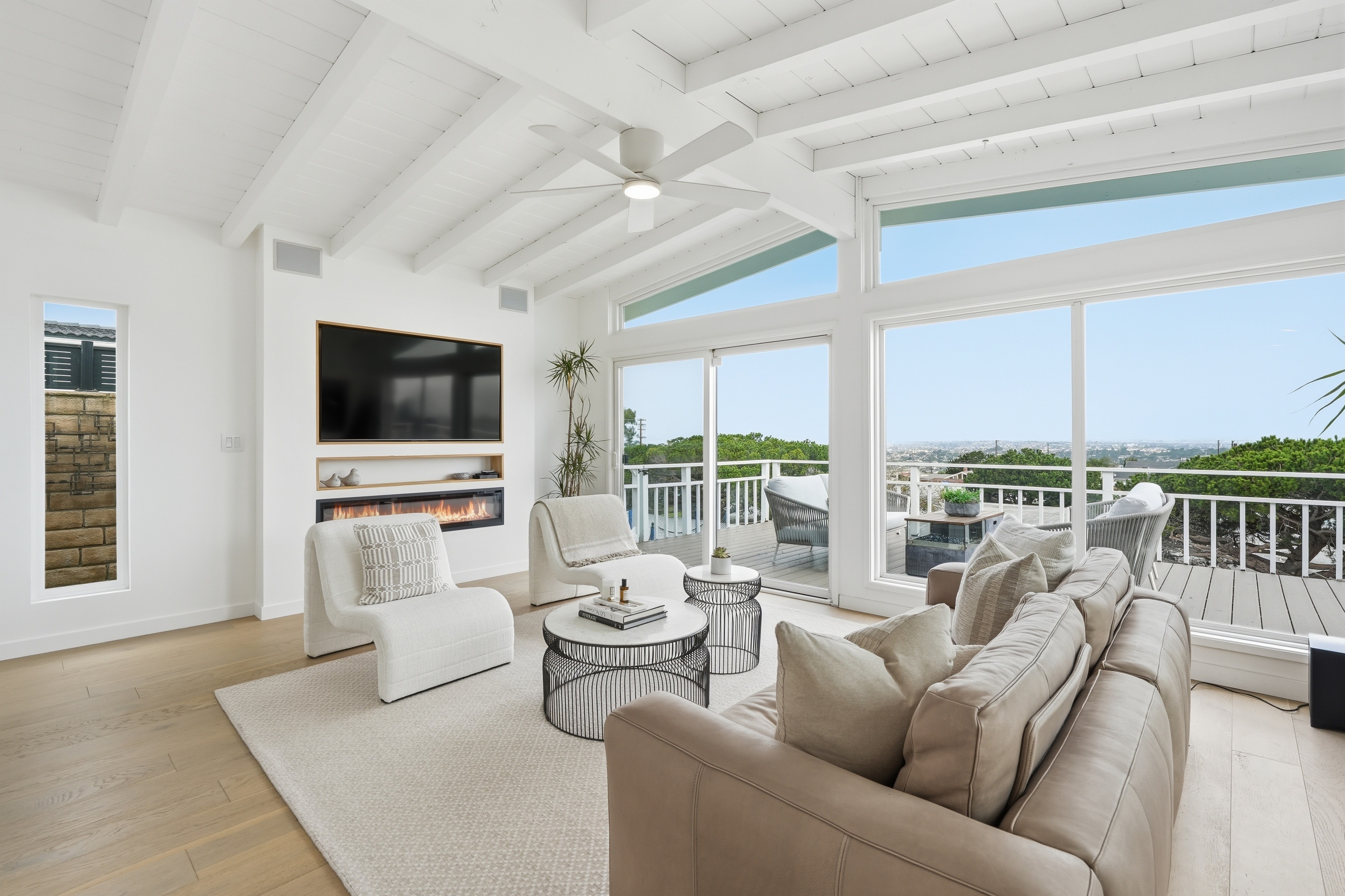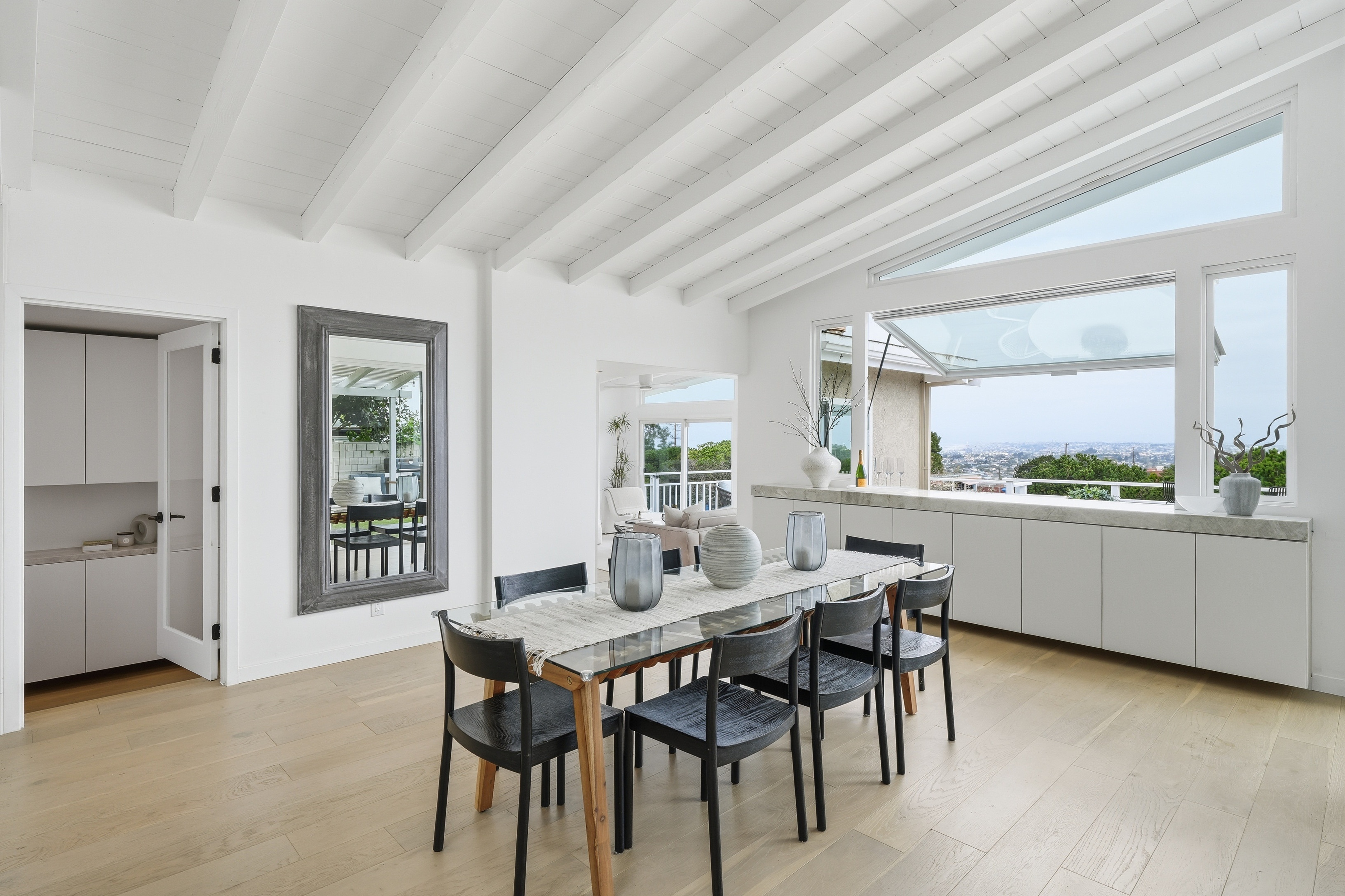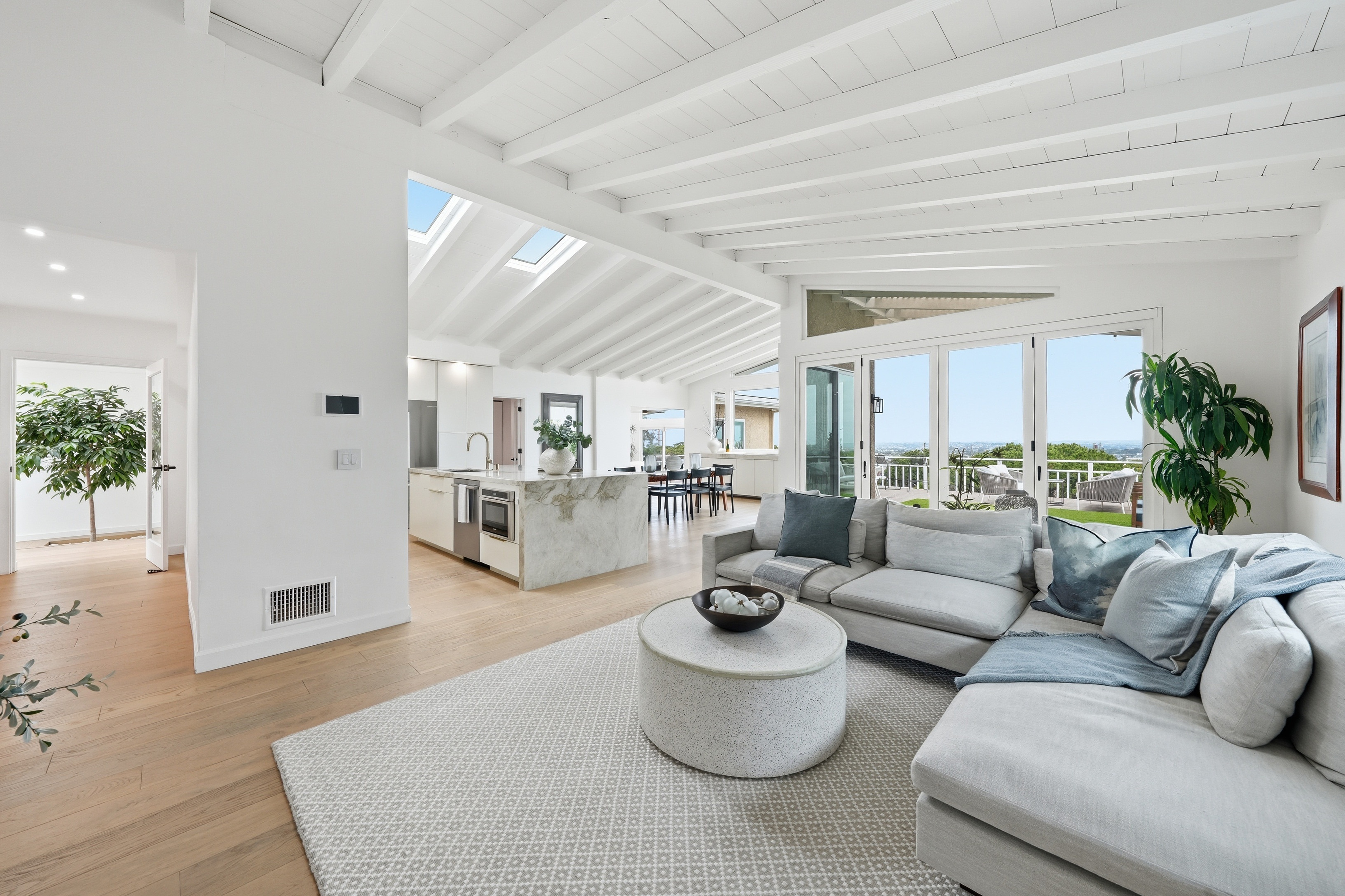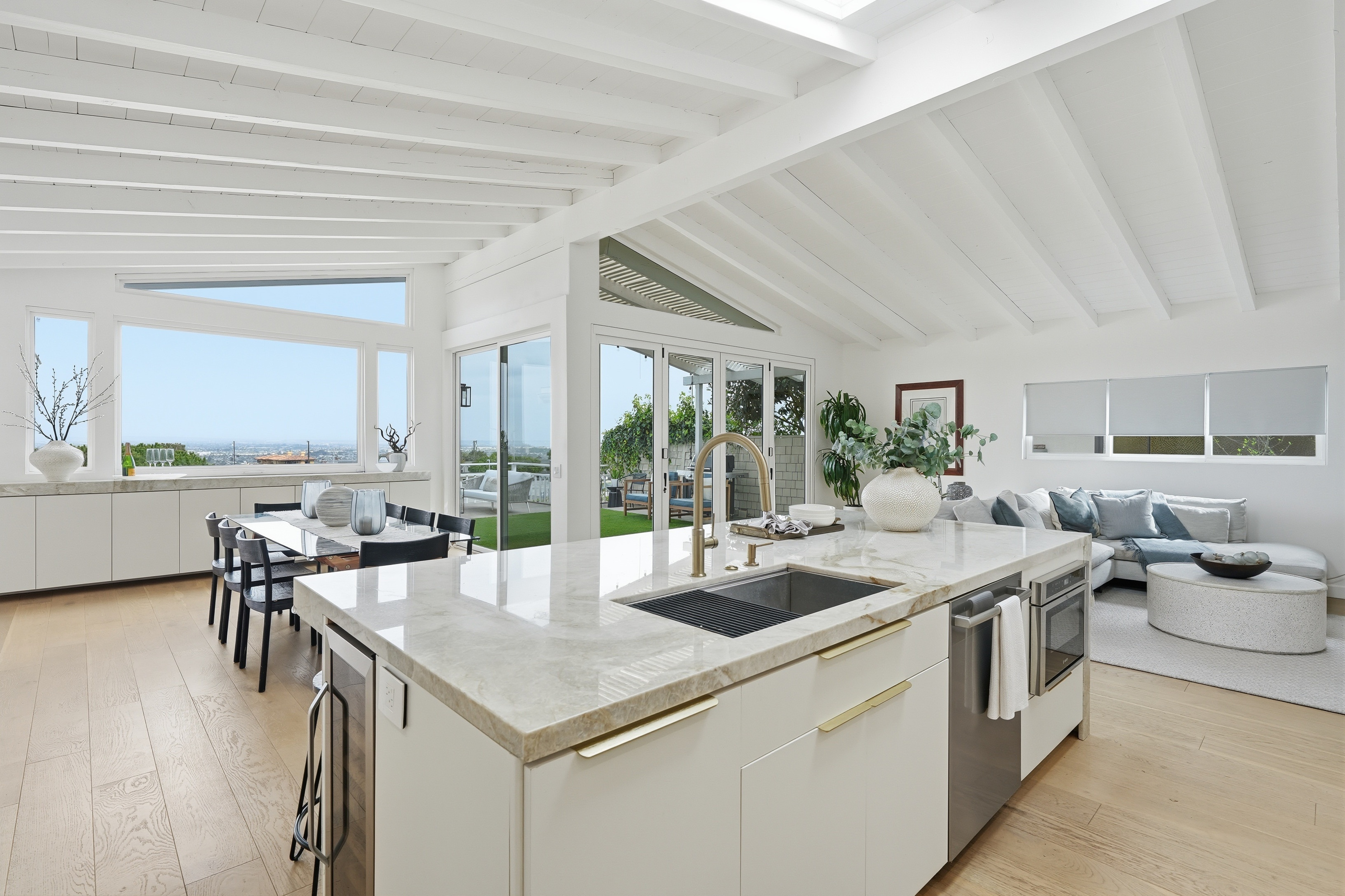 Set on a single level in the Riviera, this home has been beautifully remodeled with a refined, modern aesthetic and sweeping mountain, city and ocean views. Enterthrough steel 8-foot Pinky’s double doors into a welcoming foyer with a live ficus and engineered hardwood floors that run throughout the home. The dramaticmain living area has vaulted ceilings and an effortless indoor-outdoor connection. An accordion glass door opens wide to a newly completed 1,100-square-footcomposite deck, designed with multiple seating areas to take in the incredible views. Lighted stairs and smart-home exterior lighting elevate the outdoorexperience, while dual-zone wired speakers extend seamlessly from the interior to the deck for easy entertaining. At the center of it all is a stunning kitchenanchored by a massive island topped in premium Taj Mahal quartzite, seating for barstools, prep sink and a beverage refrigerator. Other nice details such as softaccent lighting, Bosch appliances and a Bertazzoni range with brass burners create a kitchen that is equal parts sleek and functional. Adjacent to the kitchen, theformal dining area is positioned beside an oversized custom window that opens directly to the outdoor bar, creating a seamless pass-through for entertaining. Abutler’s pantry adds convenience with its own sink and built-in wine and beverage refrigerator. Taj Mahal quartzite continues throughout the indoor-outdoor bar,butler’s pantry and primary bath, tying the spaces together with a cohesive and luxurious finish. Two secondary bedrooms share a bath with a floating vanity, tiledwalls, custom maple cabinetry, skylight and a wet-room setup with soaking tub. An additional bathroom features a spacious shower with a rainfall shower head.The formal living area captures the views through oversized windows and opens directly to the back deck through sliding doors. Custom built-ins include atelevision niche, accessory nook and an electric fireplace with heater. The primary suite is a calming retreat with a walk-in closet and a sliding door leading to aprivate side yard. The spa-like bath features dual sinks, maple cabinetry, large-scale tile and a lighted mirror. Completing the home is a finished garage with epoxyfloors, offering ideal flex space for a workout studio, office or playroom with direct access to the home. Additional upgrades include a 2025 gas tankless waterheater, ceiling fans in all bedrooms and living area.