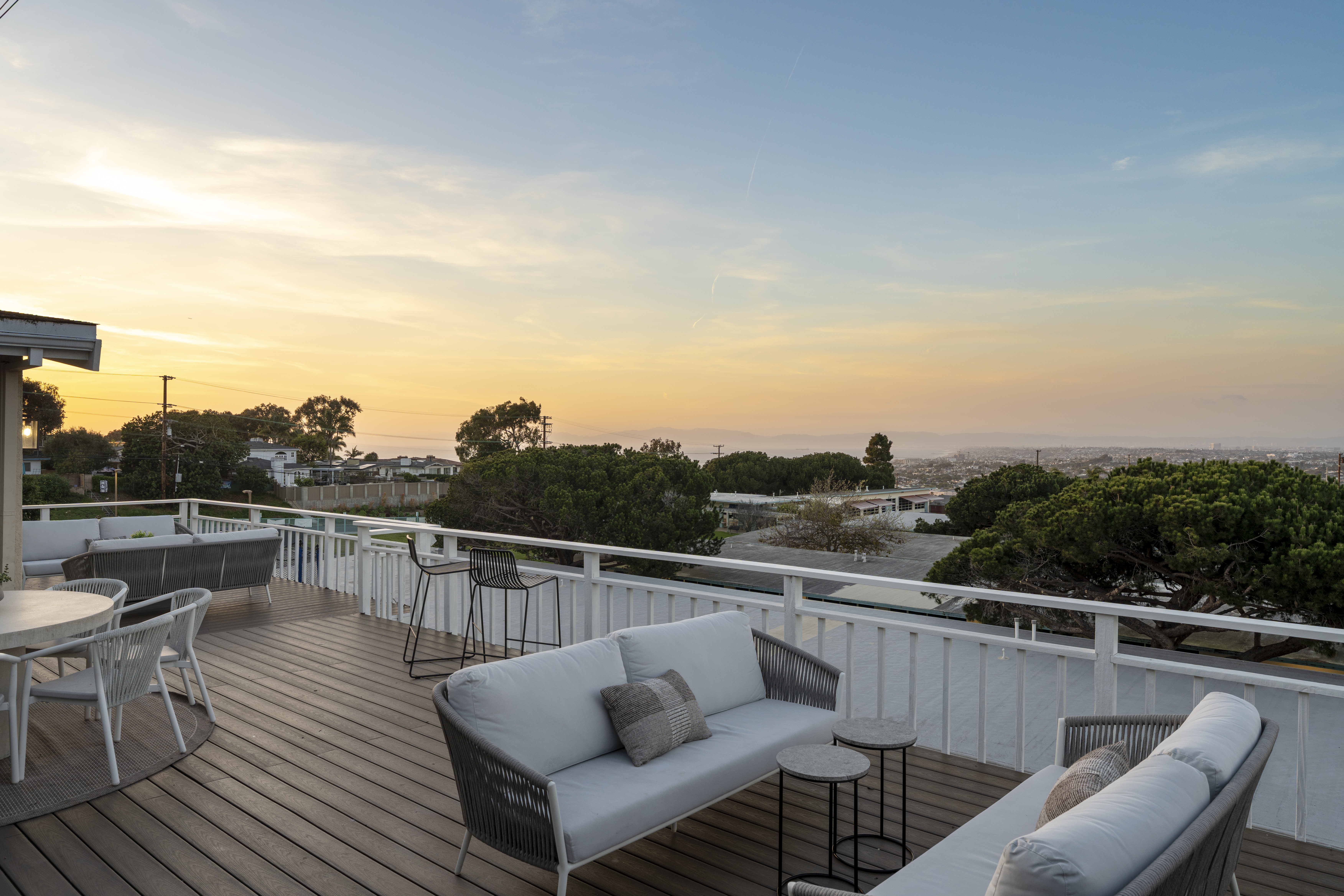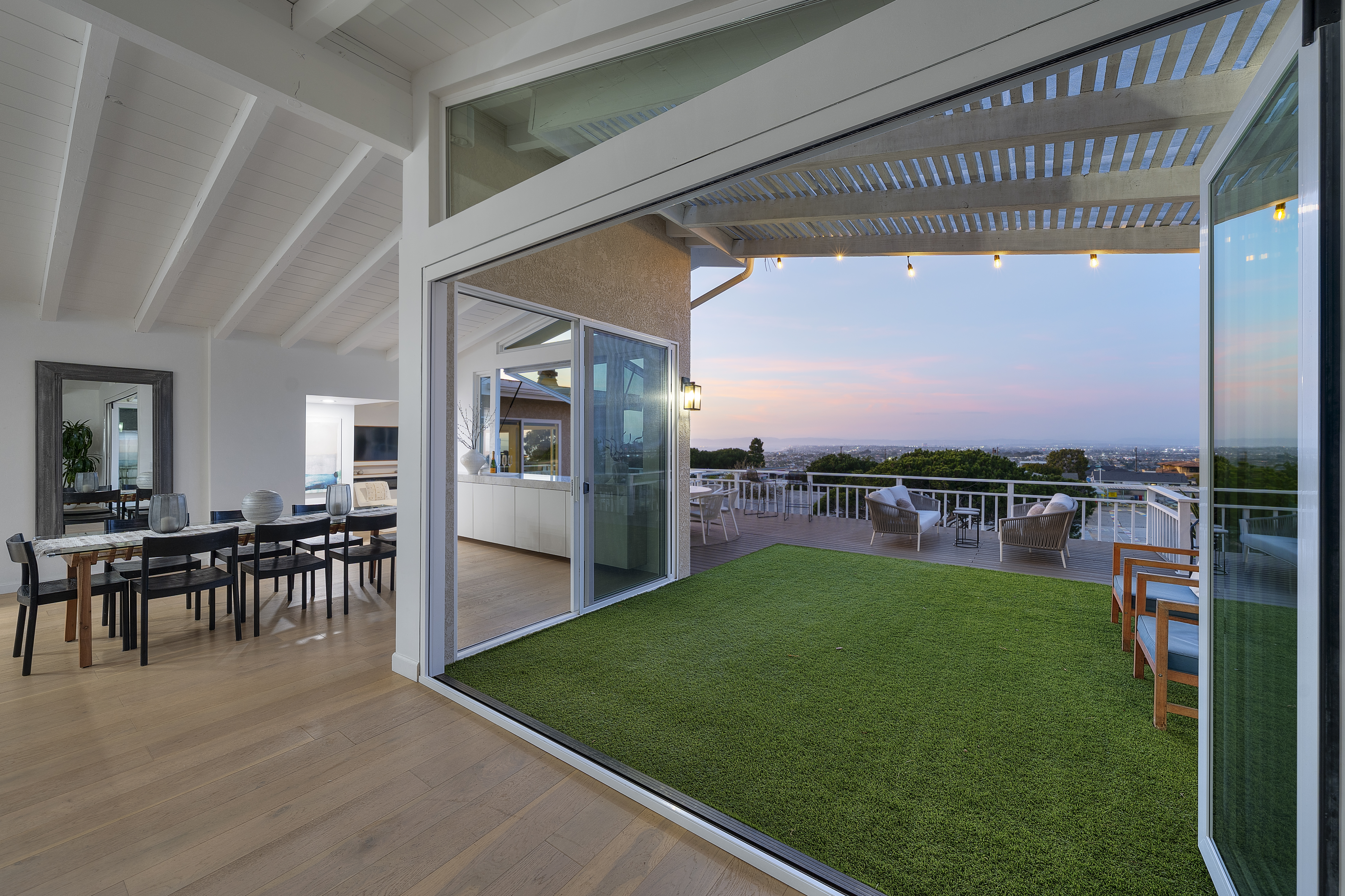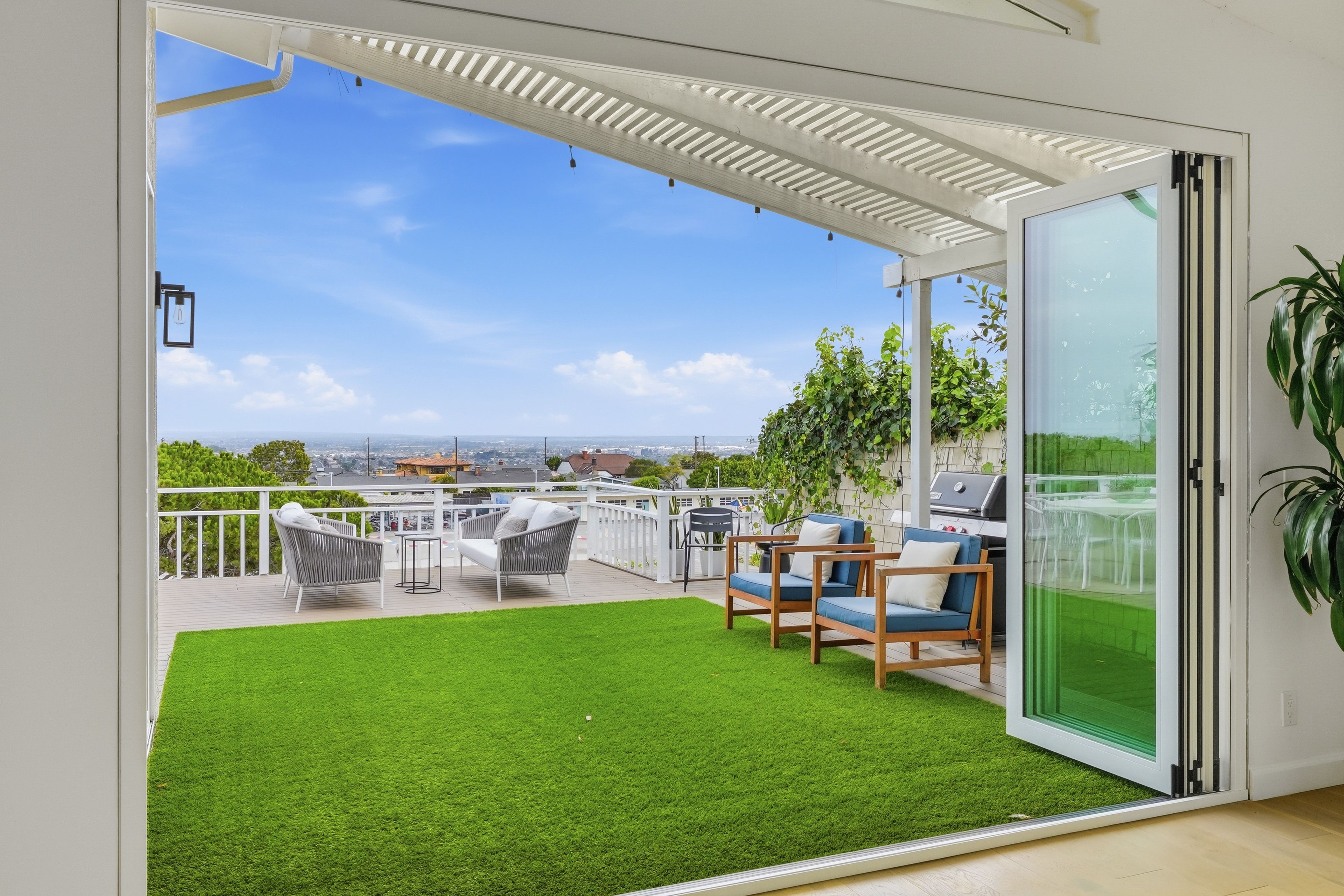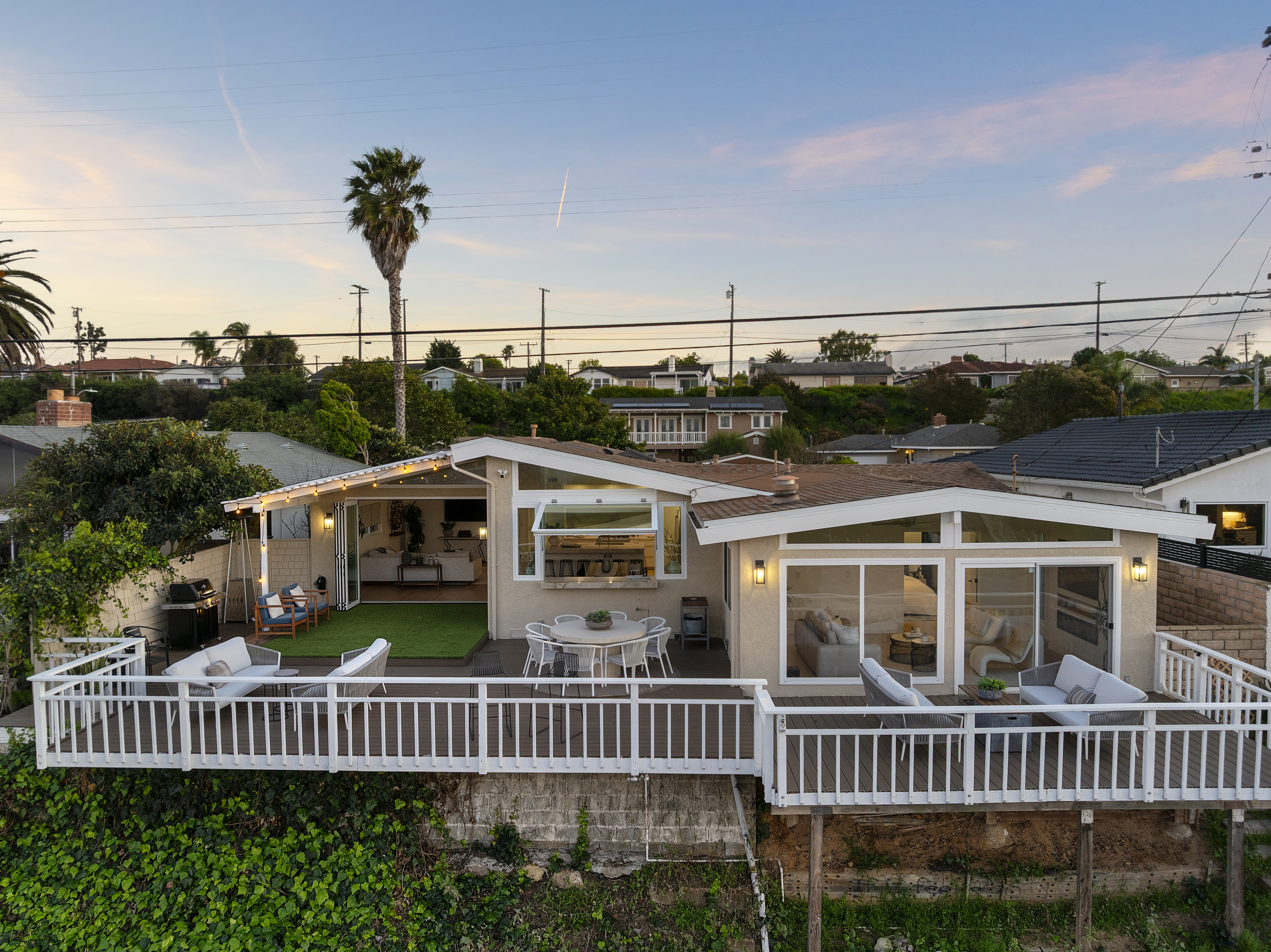 Set on a single level in the Riviera, this home has been beautifully remodeled with a refined, modern aesthetic and sweeping mountain, city and ocean views. Enterthrough steel 8-foot Pinky’s double doors into a welcoming foyer with a live ficus and engineered hardwood floors that run throughout the home. The dramaticmain living area has vaulted ceilings and an effortless indoor-outdoor connection. An accordion glass door opens wide to a newly completed 1,100-square-footcomposite deck, designed with multiple seating areas to take in the incredible views. Lighted stairs and smart-home exterior lighting elevate the outdoorexperience, while dual-zone wired speakers extend seamlessly from the interior to the deck for easy entertaining. At the center of it all is a stunning kitchenanchored by a massive island topped in premium Taj Mahal quartzite, seating for barstools, prep sink and a beverage refrigerator. Other nice details such as softaccent lighting, Bosch appliances and a Bertazzoni range with brass burners create a kitchen that is equal parts sleek and functional. Adjacent to the kitchen, theformal dining area is positioned beside an oversized custom window that opens directly to the outdoor bar, creating a seamless pass-through for entertaining. Abutler’s pantry adds convenience with its own sink and built-in wine and beverage refrigerator. Taj Mahal quartzite continues throughout the indoor-outdoor bar,butler’s pantry and primary bath, tying the spaces together with a cohesive and luxurious finish. Two secondary bedrooms share a bath with a floating vanity, tiledwalls, custom maple cabinetry, skylight and a wet-room setup with soaking tub. An additional bathroom features a spacious shower with a rainfall shower head.The formal living area captures the views through oversized windows and opens directly to the back deck through sliding doors. Custom built-ins include atelevision niche, accessory nook and an electric fireplace with heater. The primary suite is a calming retreat with a walk-in closet and a sliding door leading to aprivate side yard. The spa-like bath features dual sinks, maple cabinetry, large-scale tile and a lighted mirror. Completing the home is a finished garage with epoxyfloors, offering ideal flex space for a workout studio, office or playroom with direct access to the home. Additional upgrades include a 2025 gas tankless waterheater, ceiling fans in all bedrooms and living area.