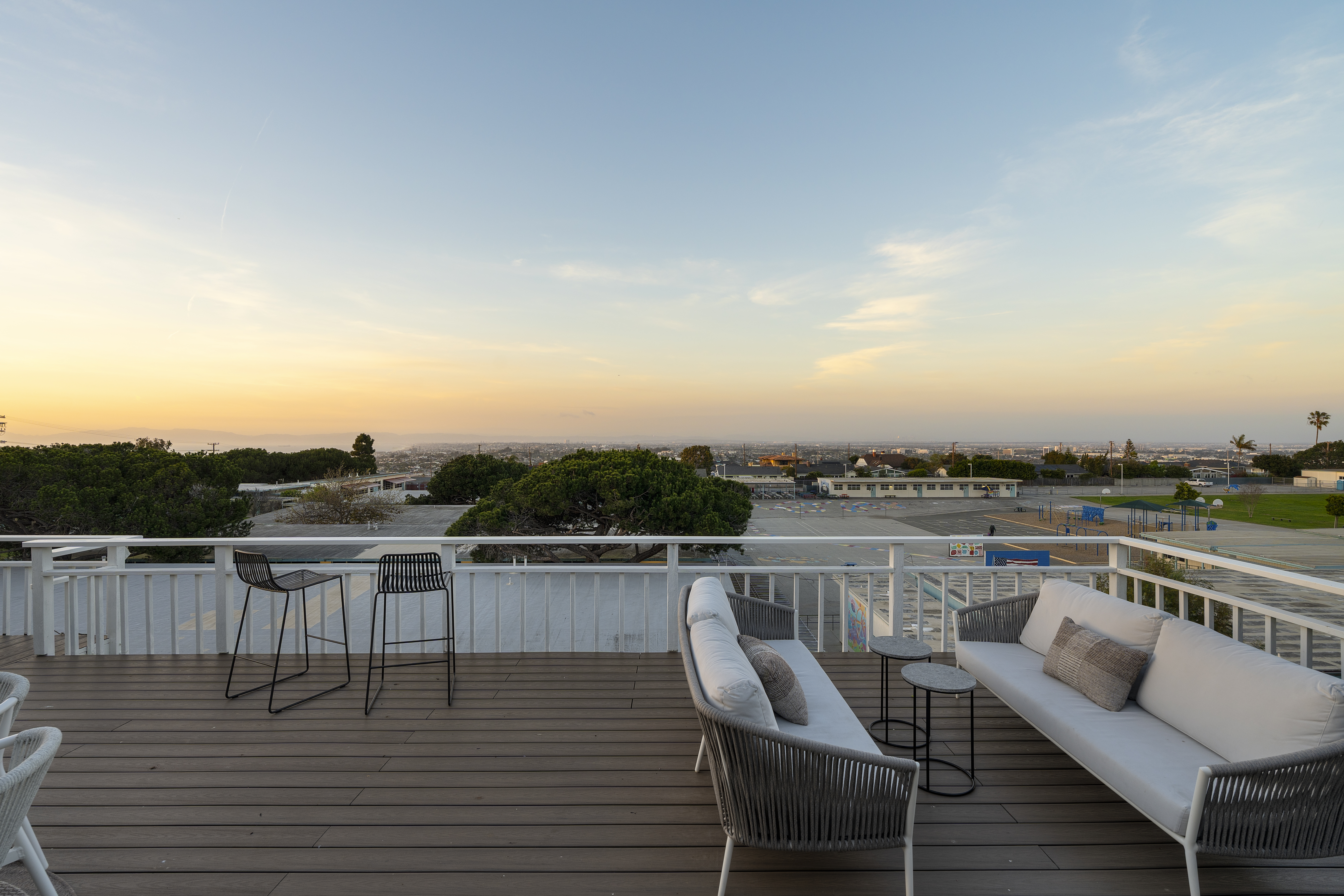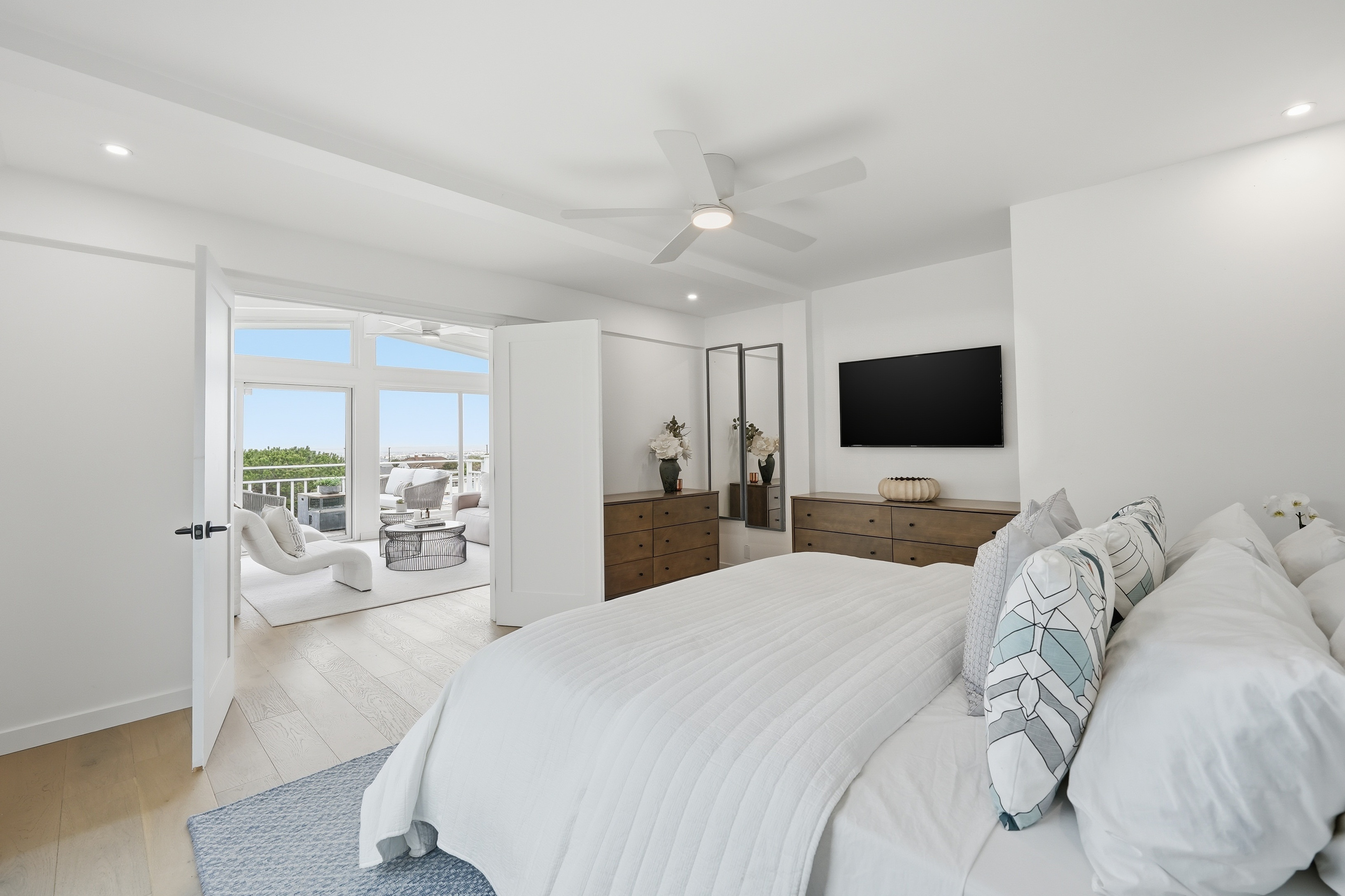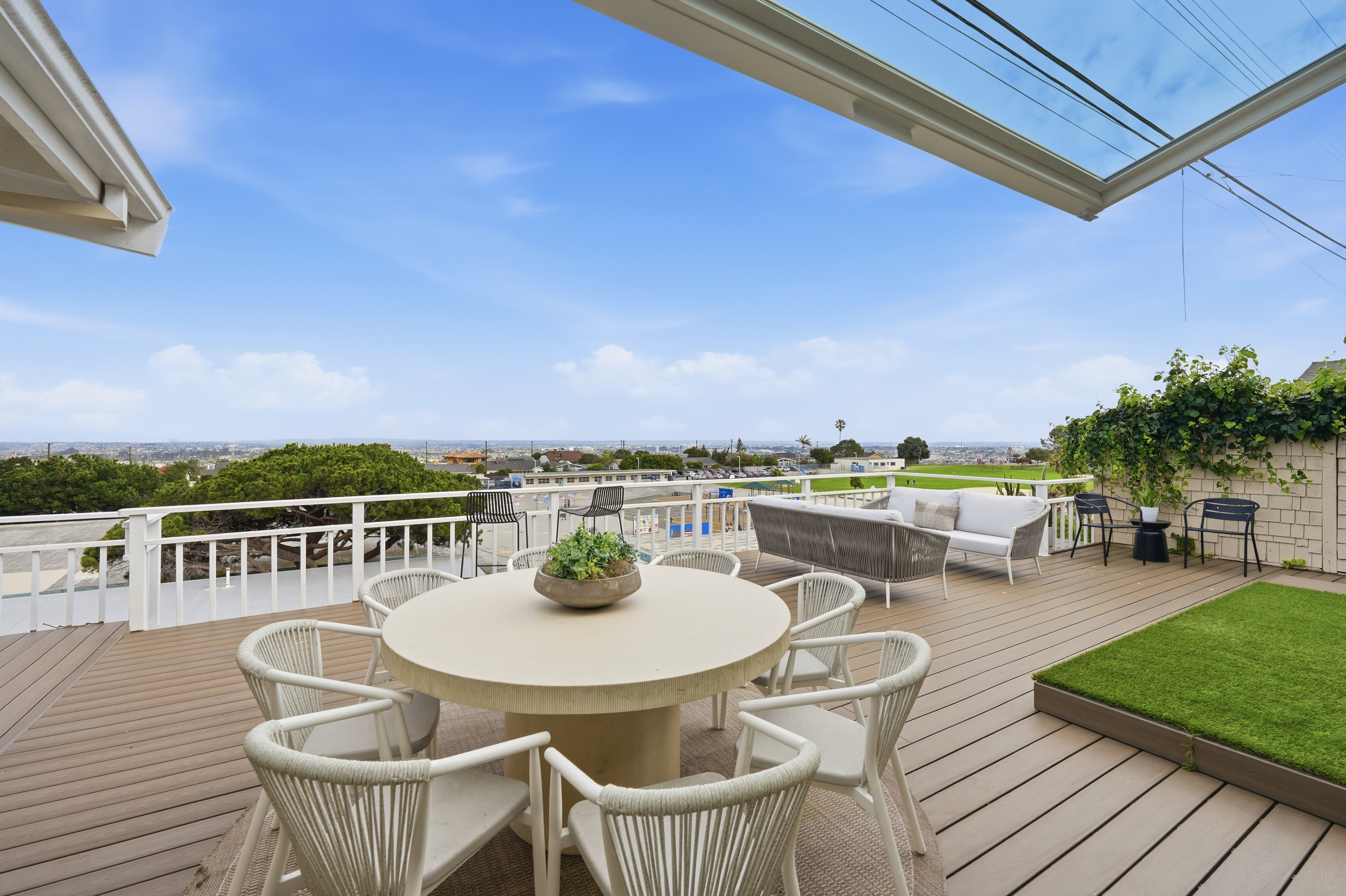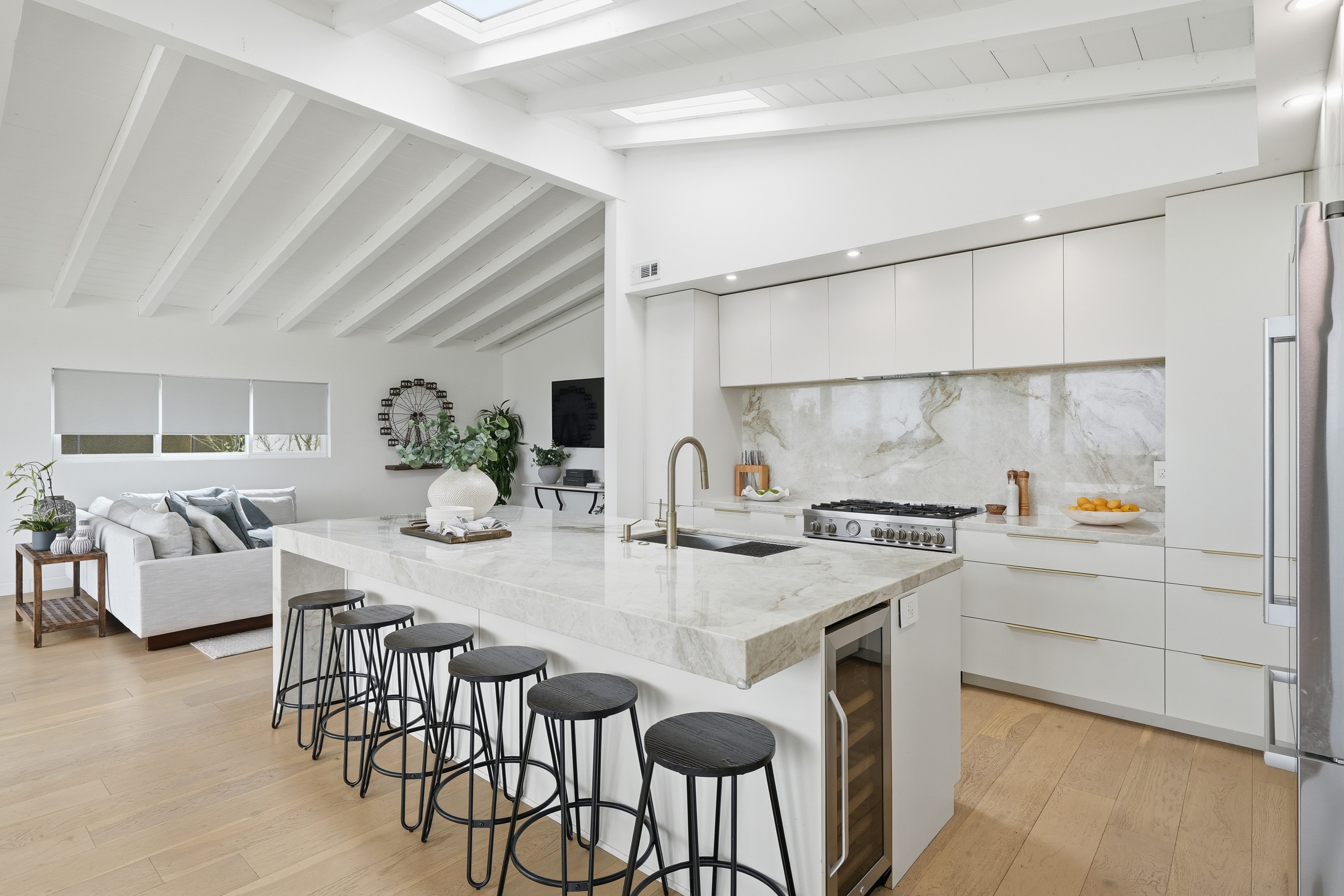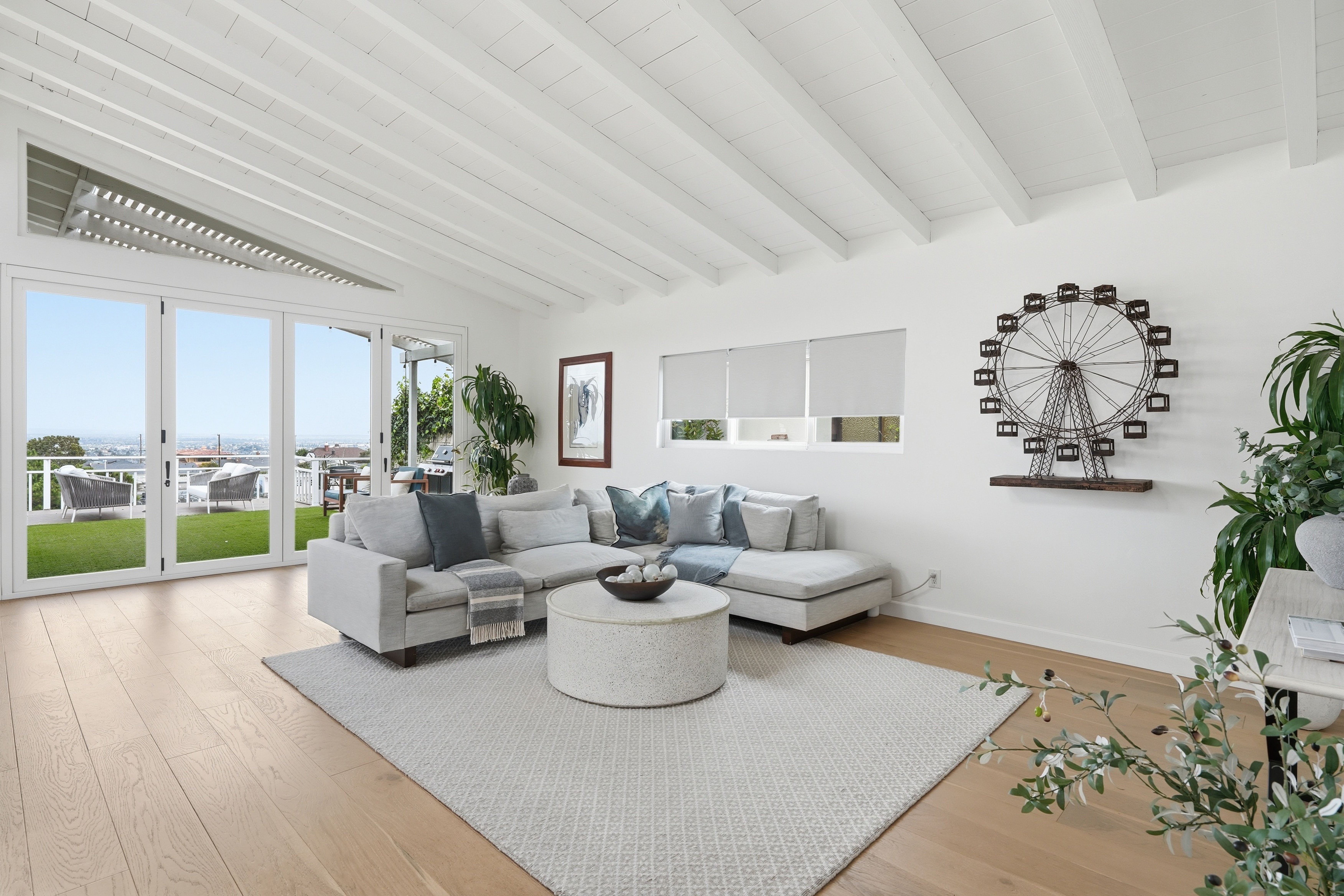 Set on a single level in the Riviera, this home has been beautifully remodeled with a refined, modern aesthetic and sweeping mountain, city and ocean views. Enterthrough steel 8-foot Pinky’s double doors into a welcoming foyer with a live ficus and engineered hardwood floors that run throughout the home. The dramaticmain living area has vaulted ceilings and an effortless indoor-outdoor connection. An accordion glass door opens wide to a newly completed 1,100-square-footcomposite deck, designed with multiple seating areas to take in the incredible views. Lighted stairs and smart-home exterior lighting elevate the outdoorexperience, while dual-zone wired speakers extend seamlessly from the interior to the deck for easy entertaining. At the center of it all is a stunning kitchenanchored by a massive island topped in premium Taj Mahal quartzite, seating for barstools, prep sink and a beverage refrigerator. Other nice details such as softaccent lighting, Bosch appliances and a Bertazzoni range with brass burners create a kitchen that is equal parts sleek and functional. Adjacent to the kitchen, theformal dining area is positioned beside an oversized custom window that opens directly to the outdoor bar, creating a seamless pass-through for entertaining. Abutler’s pantry adds convenience with its own sink and built-in wine and beverage refrigerator. Taj Mahal quartzite continues throughout the indoor-outdoor bar,butler’s pantry and primary bath, tying the spaces together with a cohesive and luxurious finish. Two secondary bedrooms share a bath with a floating vanity, tiledwalls, custom maple cabinetry, skylight and a wet-room setup with soaking tub. An additional bathroom features a spacious shower with a rainfall shower head.The formal living area captures the views through oversized windows and opens directly to the back deck through sliding doors. Custom built-ins include atelevision niche, accessory nook and an electric fireplace with heater. The primary suite is a calming retreat with a walk-in closet and a sliding door leading to aprivate side yard. The spa-like bath features dual sinks, maple cabinetry, large-scale tile and a lighted mirror. Completing the home is a finished garage with epoxyfloors, offering ideal flex space for a workout studio, office or playroom with direct access to the home. Additional upgrades include a 2025 gas tankless waterheater, ceiling fans in all bedrooms and living area.