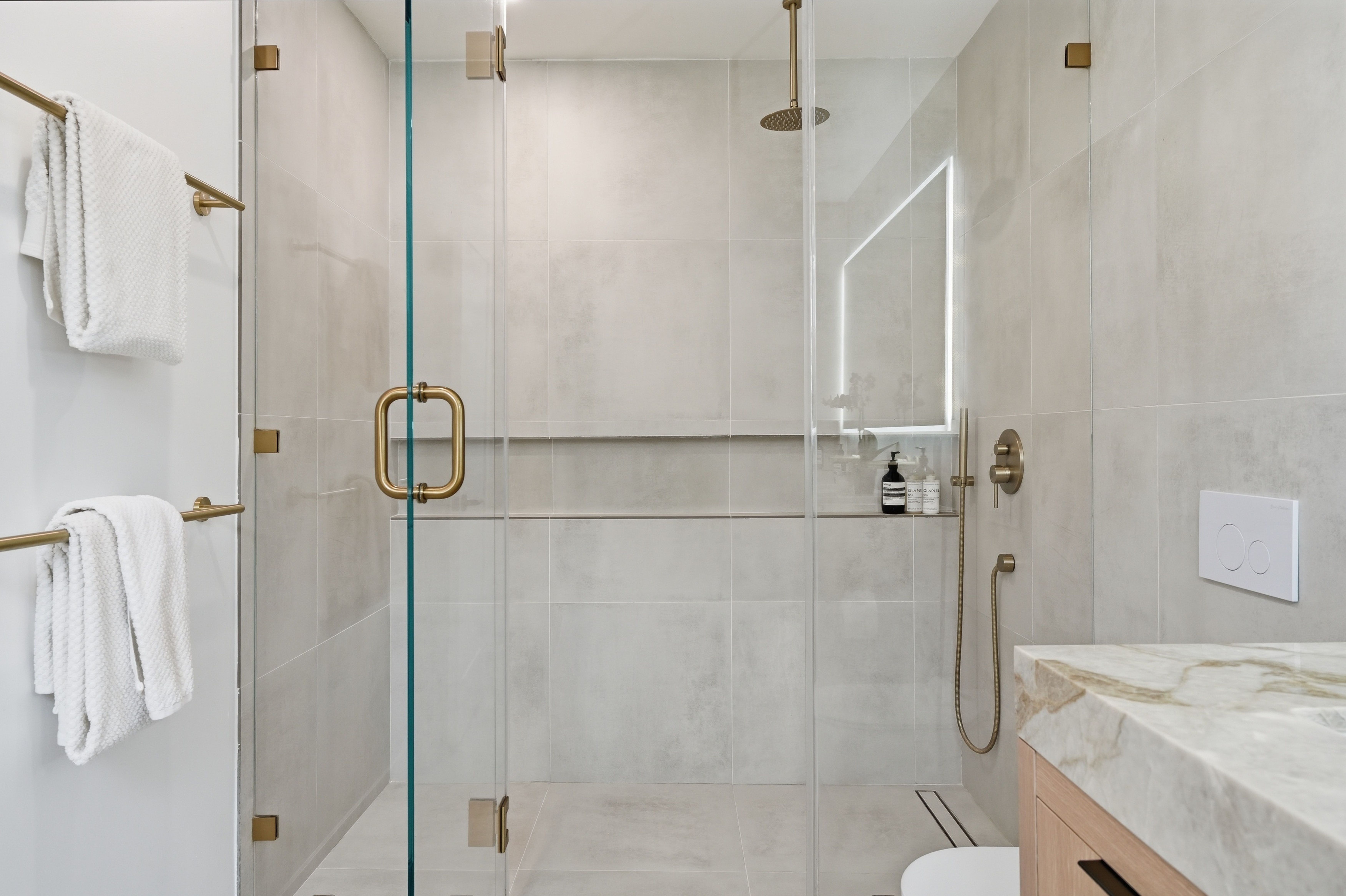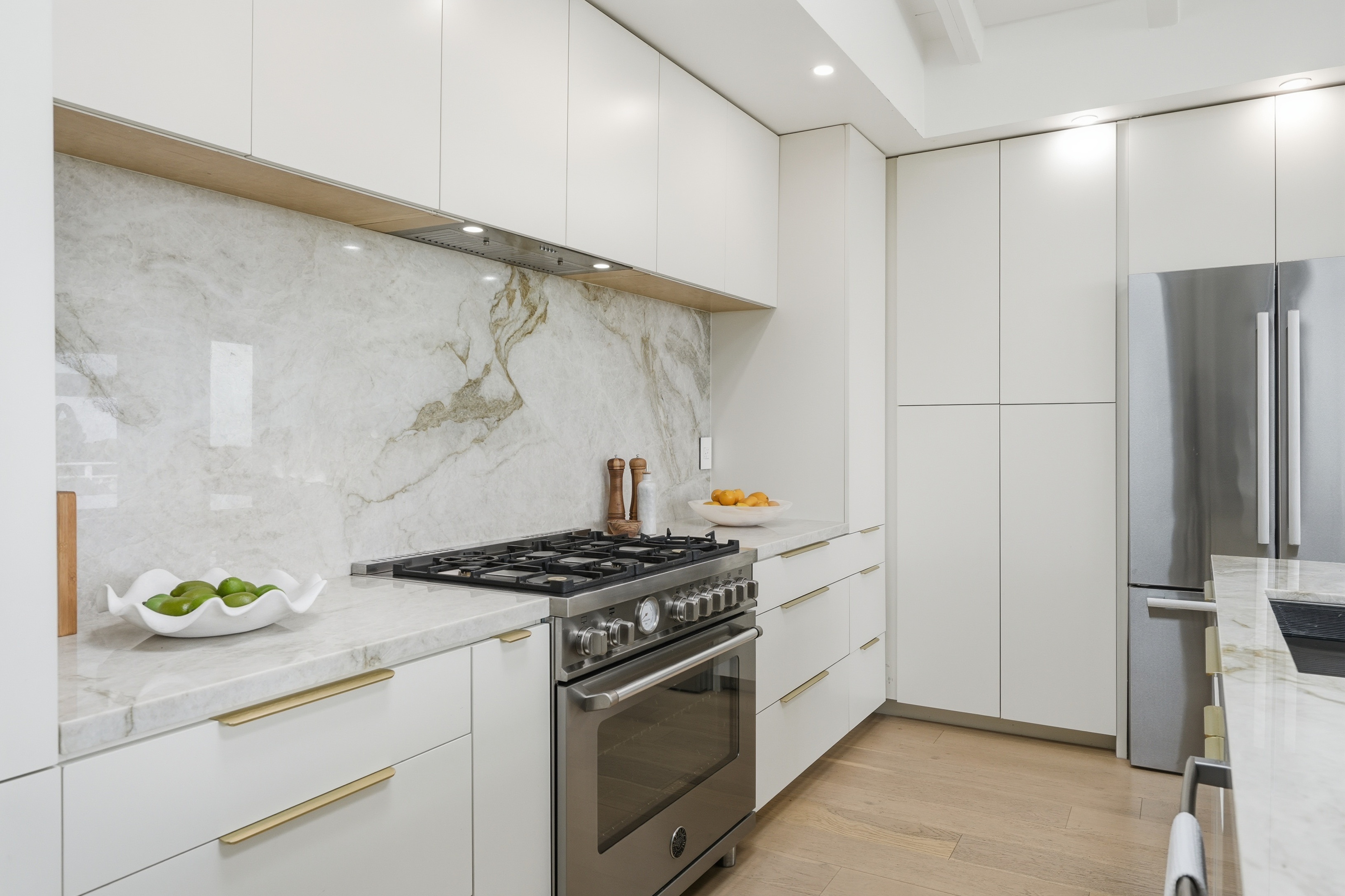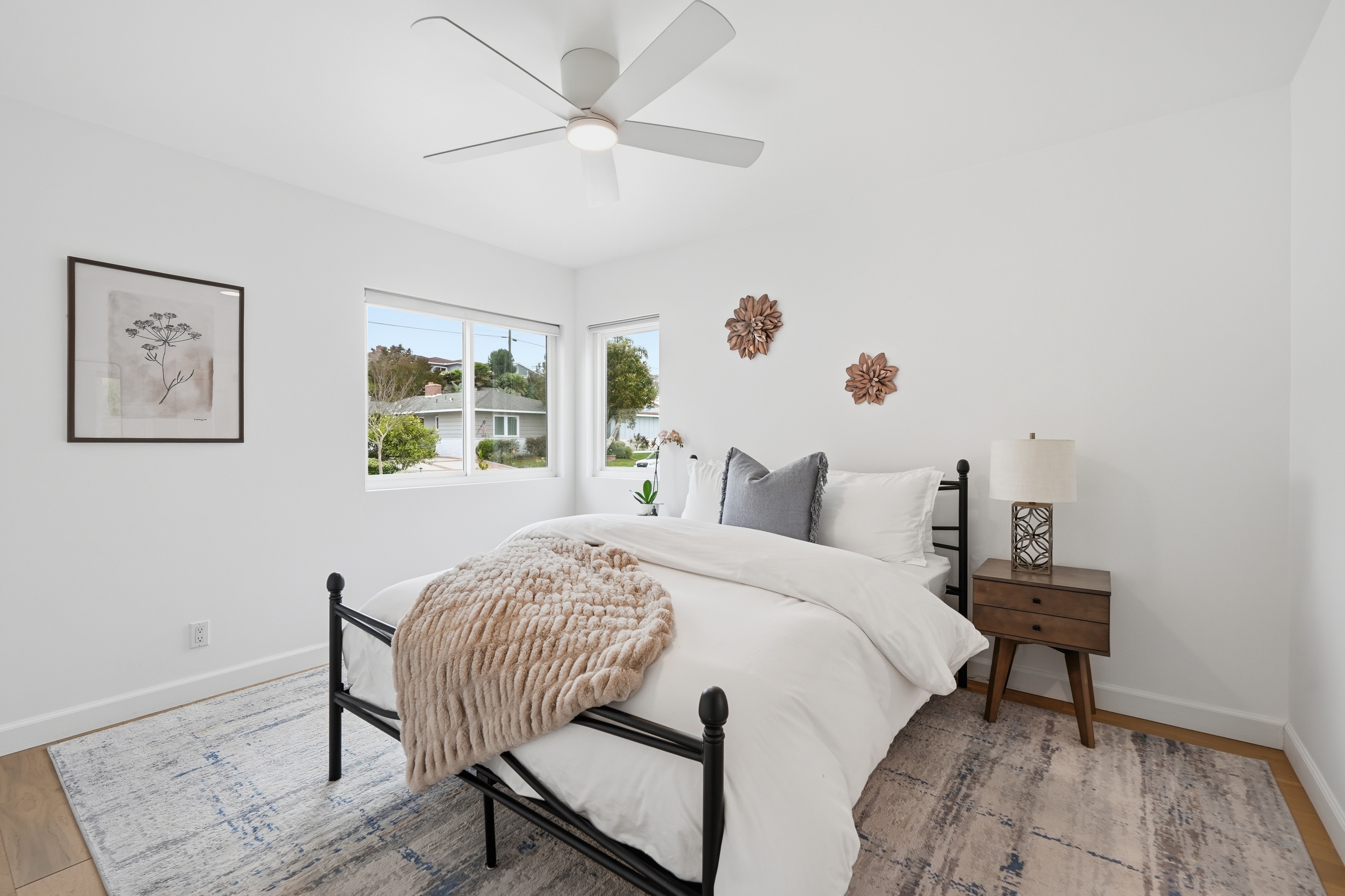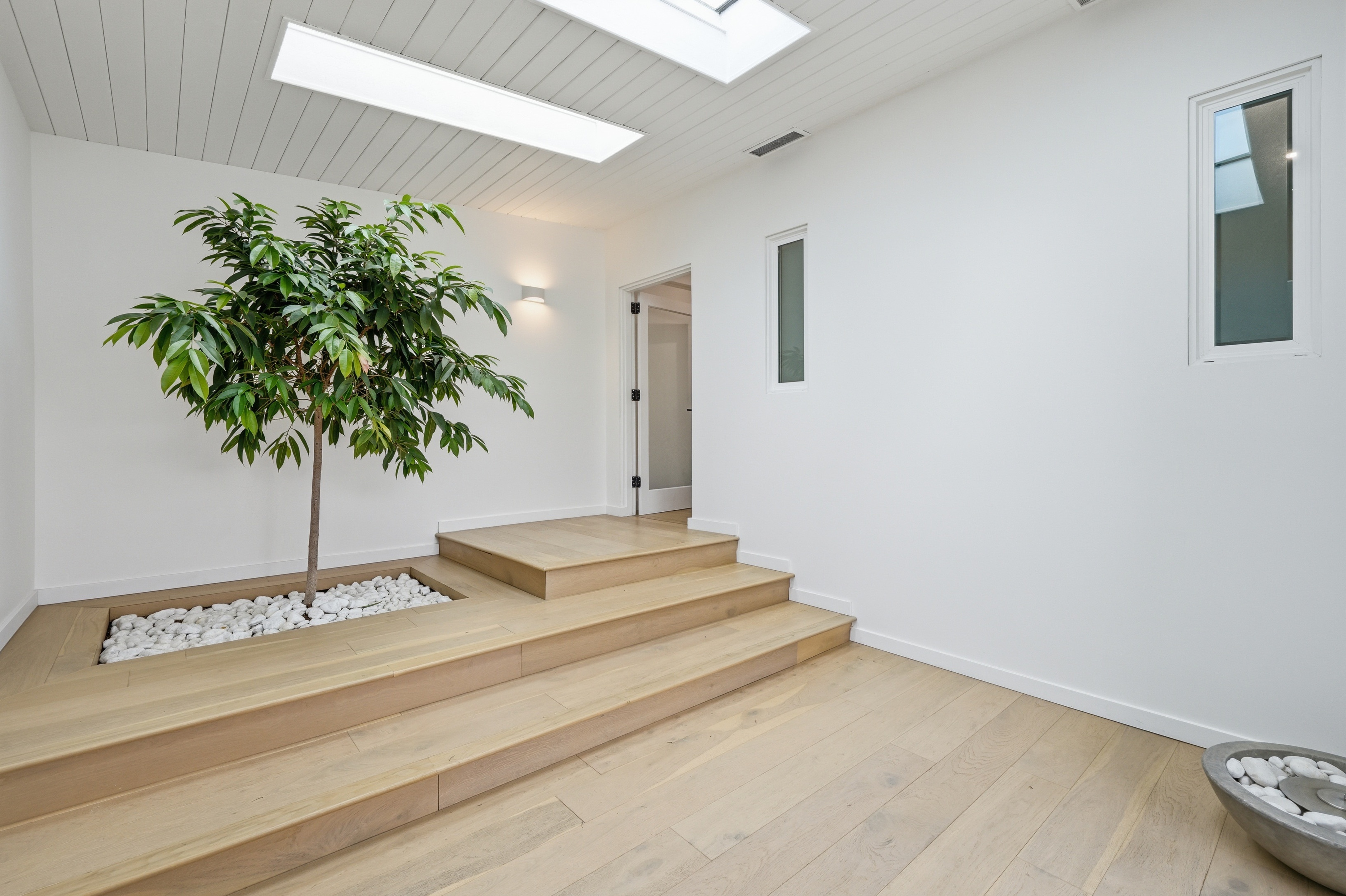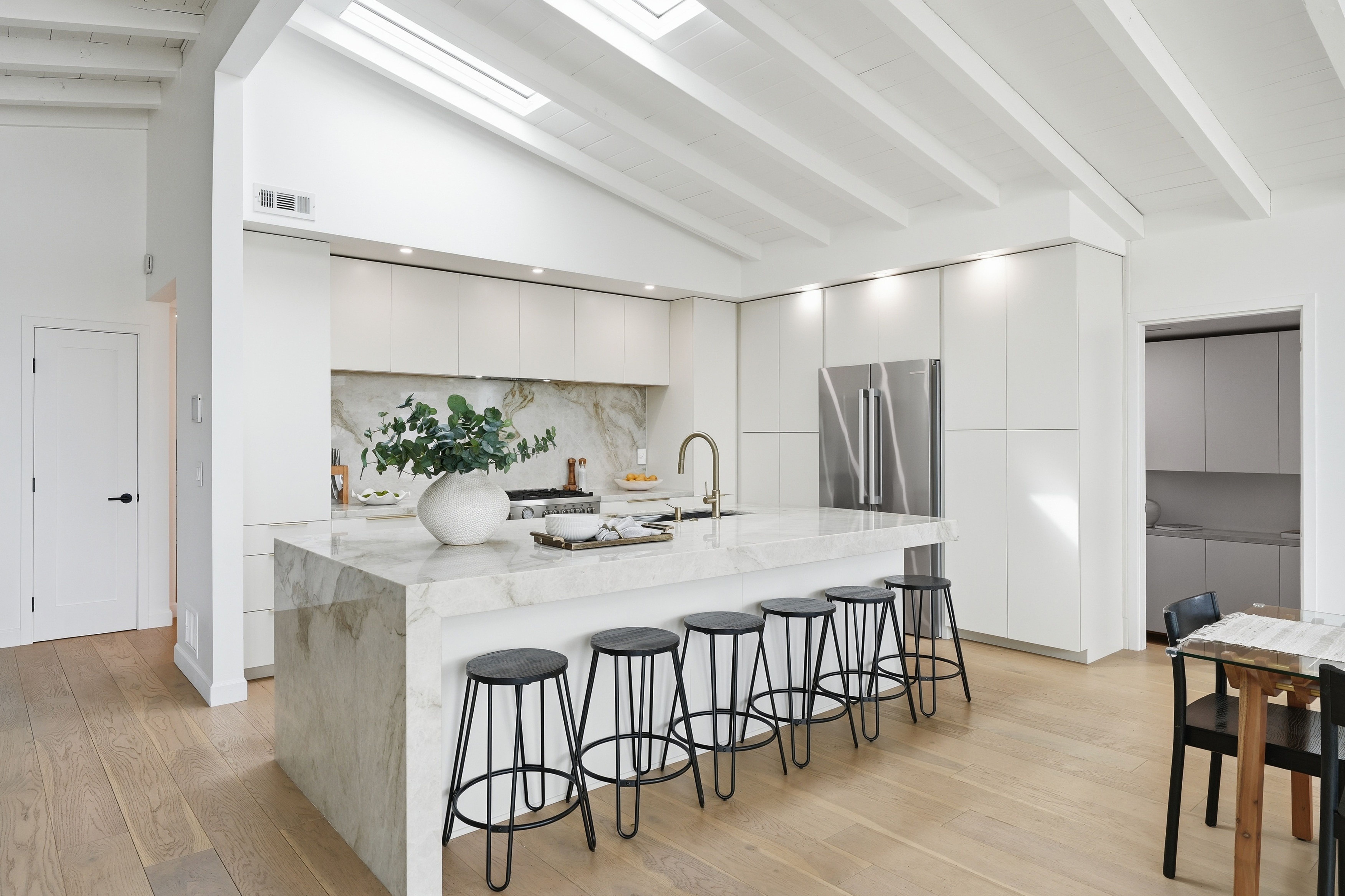 Set on a single level in the Riviera, this home has been beautifully remodeled with a refined, modern aesthetic and sweeping mountain, city and ocean views. Enterthrough steel 8-foot Pinky’s double doors into a welcoming foyer with a live ficus and engineered hardwood floors that run throughout the home. The dramaticmain living area has vaulted ceilings and an effortless indoor-outdoor connection. An accordion glass door opens wide to a newly completed 1,100-square-footcomposite deck, designed with multiple seating areas to take in the incredible views. Lighted stairs and smart-home exterior lighting elevate the outdoorexperience, while dual-zone wired speakers extend seamlessly from the interior to the deck for easy entertaining. At the center of it all is a stunning kitchenanchored by a massive island topped in premium Taj Mahal quartzite, seating for barstools, prep sink and a beverage refrigerator. Other nice details such as softaccent lighting, Bosch appliances and a Bertazzoni range with brass burners create a kitchen that is equal parts sleek and functional. Adjacent to the kitchen, theformal dining area is positioned beside an oversized custom window that opens directly to the outdoor bar, creating a seamless pass-through for entertaining. Abutler’s pantry adds convenience with its own sink and built-in wine and beverage refrigerator. Taj Mahal quartzite continues throughout the indoor-outdoor bar,butler’s pantry and primary bath, tying the spaces together with a cohesive and luxurious finish. Two secondary bedrooms share a bath with a floating vanity, tiledwalls, custom maple cabinetry, skylight and a wet-room setup with soaking tub. An additional bathroom features a spacious shower with a rainfall shower head.The formal living area captures the views through oversized windows and opens directly to the back deck through sliding doors. Custom built-ins include atelevision niche, accessory nook and an electric fireplace with heater. The primary suite is a calming retreat with a walk-in closet and a sliding door leading to aprivate side yard. The spa-like bath features dual sinks, maple cabinetry, large-scale tile and a lighted mirror. Completing the home is a finished garage with epoxyfloors, offering ideal flex space for a workout studio, office or playroom with direct access to the home. Additional upgrades include a 2025 gas tankless waterheater, ceiling fans in all bedrooms and living area.