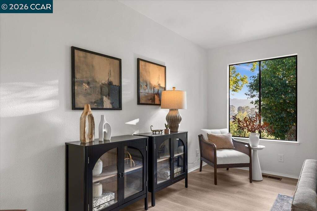 This renovated tri-level home on a 1/3+ acre lot in Richmond's scenic El Sobrante Hills offers spectacular views, privacy, and a floor plan ideal for multigenerational living. Rear-facing outlooks frame a lush landscape throughout, creating a constant connection to the outdoors. The dining room opens to a brick patio where valley vistas set the backdrop for morning coffee and sunset dinners, and the updated kitchen with stone countertops, stainless appliances, breakfast bar, and sunny nook is made for slow mornings. Upstairs, the primary suite is a private retreat with tree-framed views, walk-in closet, and updated bath with thoughtfully curated finishes. The hall bath reflects the same elevated style, while a secondary bedroom with built-in desk offers space for work and study. The lower level offers versatility with direct yard access, a separate family room, bedroom with walk-in closet, and spacious full bath ideal for guests or extended stays. Outside, the multi-level yard unfolds to a usable flat area at the base of the hill, awaiting your imagination. Wide side yards offer privacy and RV/boat space. Imagine daily walks to the neighborhood trail, epic bay views as your reward, miles of nearby parks to explore, and everyday amenities minutes away. Your sanctuary is calling.