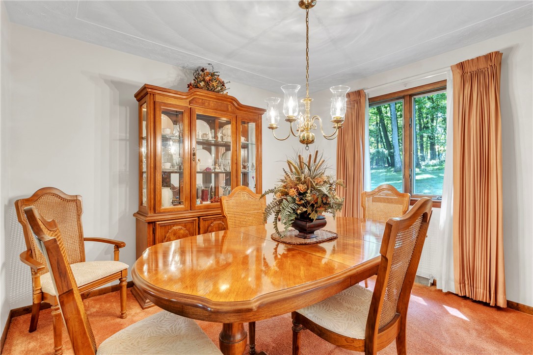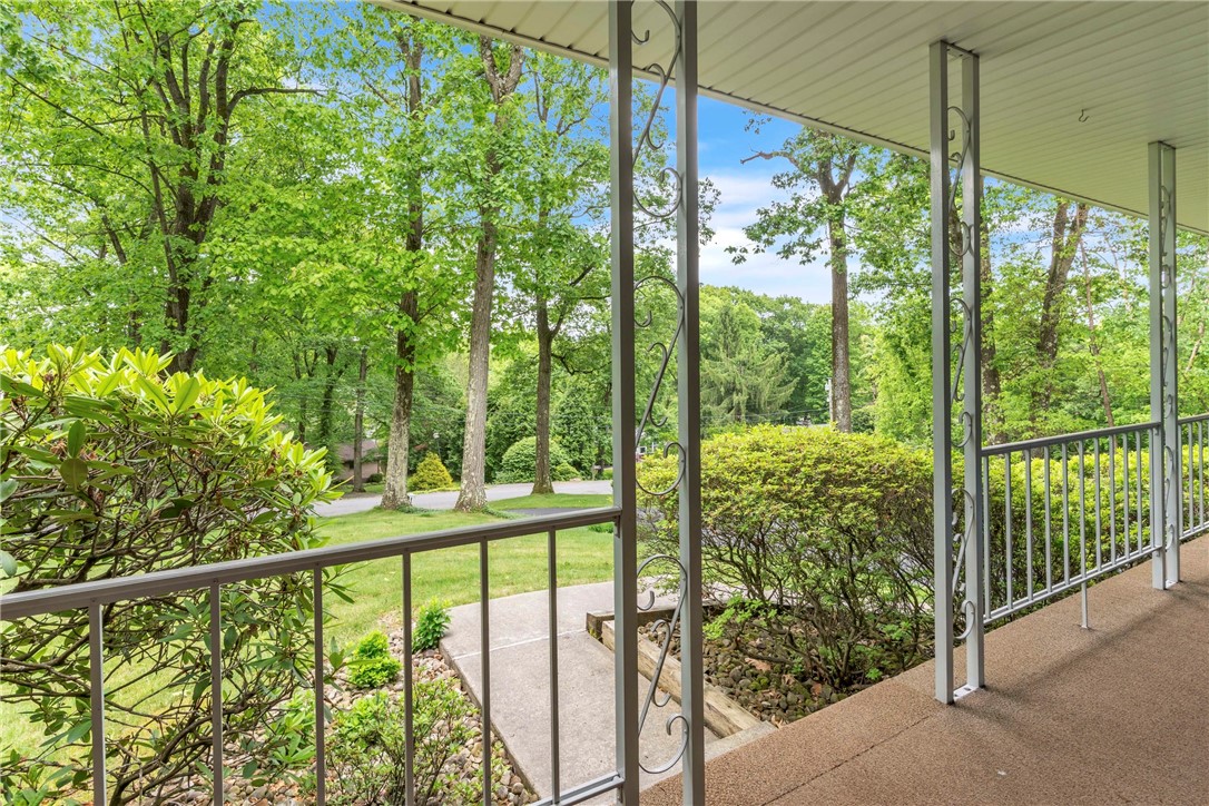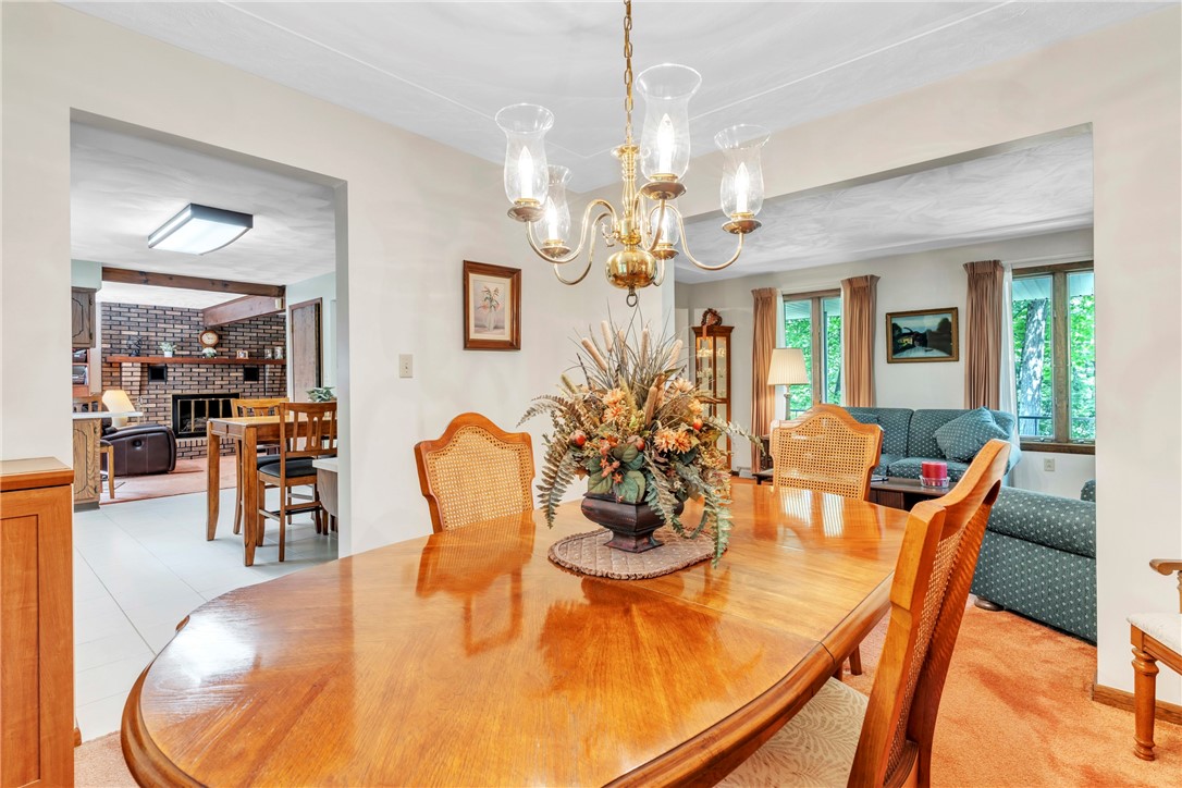 Enjoy peace and a sense of privacy from the welcoming covered front porch, perfectly positioned off the road overlooking Timberly Heights. This well-built home, proudly owned by its original owners and constructed by James Miller, showcases quality craftsmanship with solid plaster walls and ceilings throughout. Large windows throughout the home invite natural light and scenic views of the surrounding landscape, while the private wooded backyard offers endless opportunities for outdoor enjoyment. The living and dining rooms feature beautiful custom plaster ceilings that add character and charm. The kitchen is equipped with durable Hemphill cabinetry, a generous floor-to-ceiling pantry, a built-in desk area, and a convenient pass-through cabinet for added functionality. A spacious family room stretches across the rear of the home and features a beamed ceiling and cozy wood-burning fireplace. French doors open to a double-tier deck overlooking the backyard, while a window seat with storage and multiple closets provide additional comfort and practicality. The primary suite includes two closets, a full private bath, and a distinctive custom ceiling detail. Three additional bedrooms share a thoughtfully designed split-layout main bath, and attic access provides even more storage options. The lower level offers excellent potential with garage access, a fruit cellar, a built-in safe, laundry area, and plumbing rough-ins for an additional bathroom. Completing the home is a large garage with insulated doors and a built-in workbench, plus extra storage space located beneath the front porch. Some photos have been virtually staged and furniture has been removed.