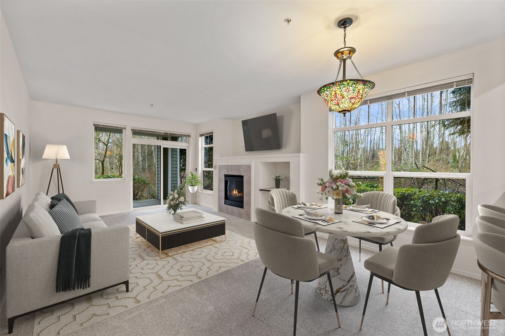 Well maintained, desirable end unit opens onto a protected greenbelt of woods, ponds and wildlife. Private patio off living room is covered and has an outside storage closet. Spacious living room features built in bookcases, gas fireplace and dining area. Kitchen offers lots of cabinets and countertop work space. 9'ceilings and transom windows give the unit a spacious feel. 2nd bedroom for guest or office. Two baths, one off primary, one with tub. Large separate laundry room with washer/dryer. All appliances and window coverings included. Fresh paint and new carpet throughout. Single car garage attached allows secure entry into unit and provides additional storage space. The Woodlands is a well established community with a great clubhouse for large gatherings and a playground for little ones. Easy access location and bus service on 128th St. S.W. Don't miss this one!