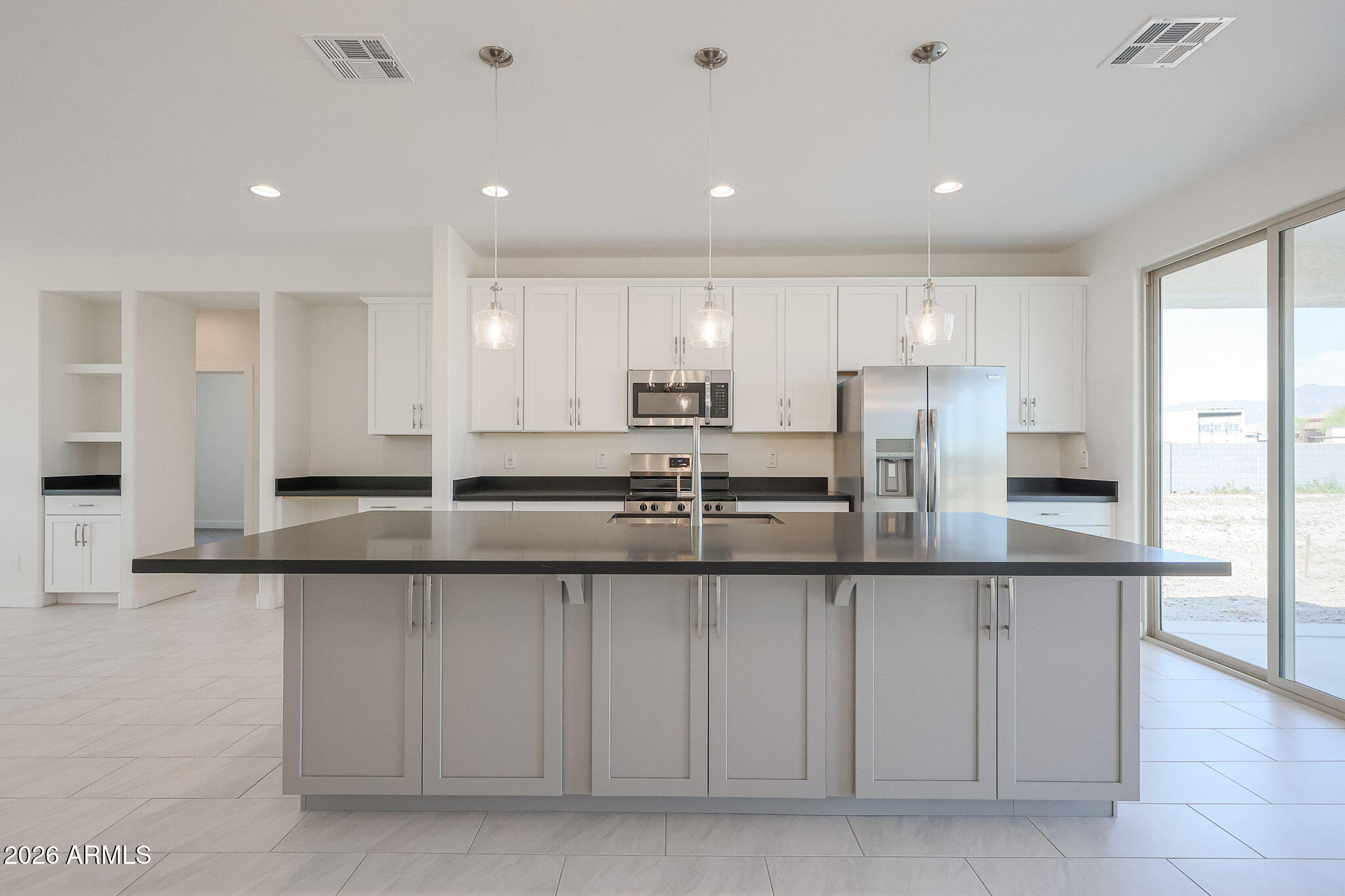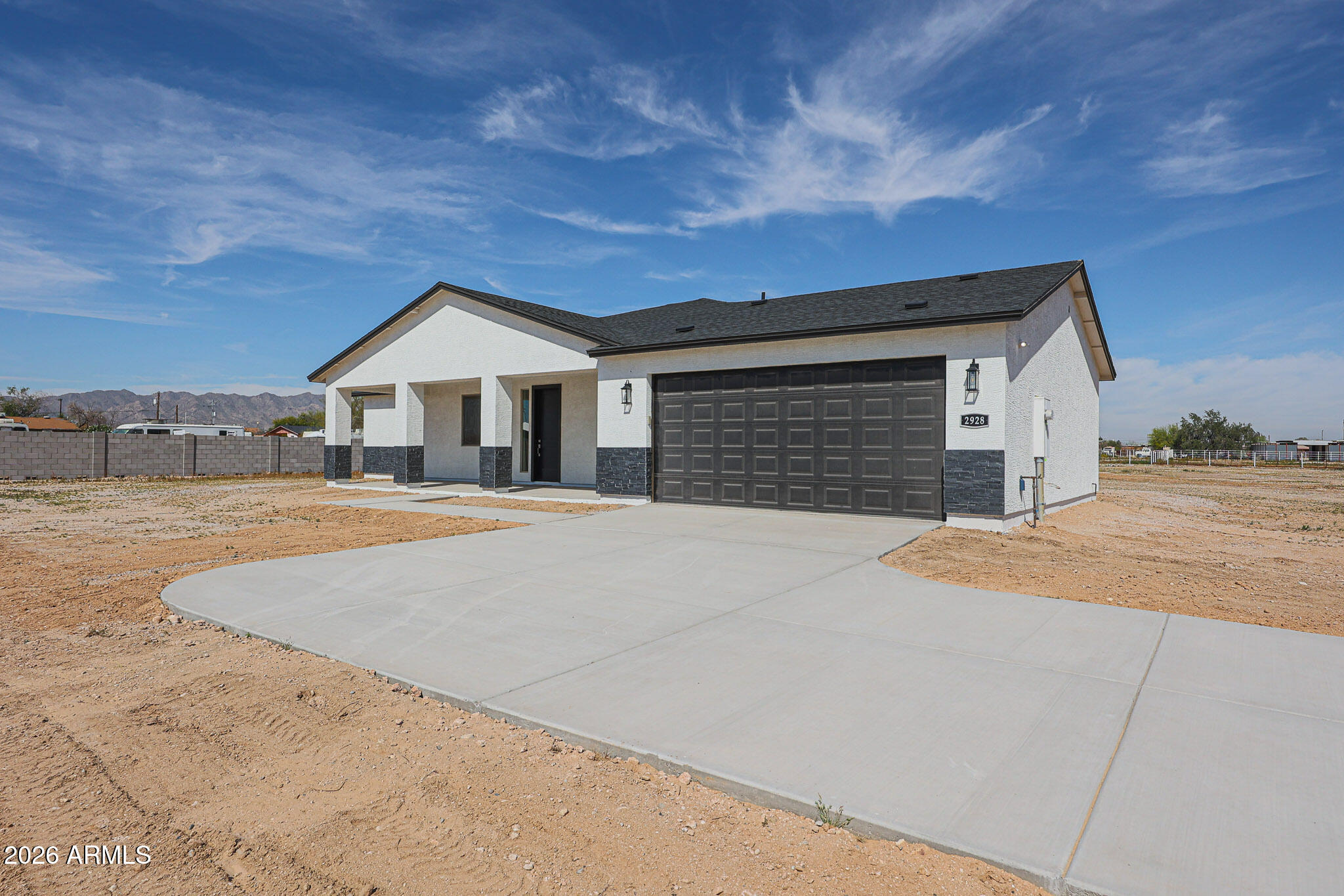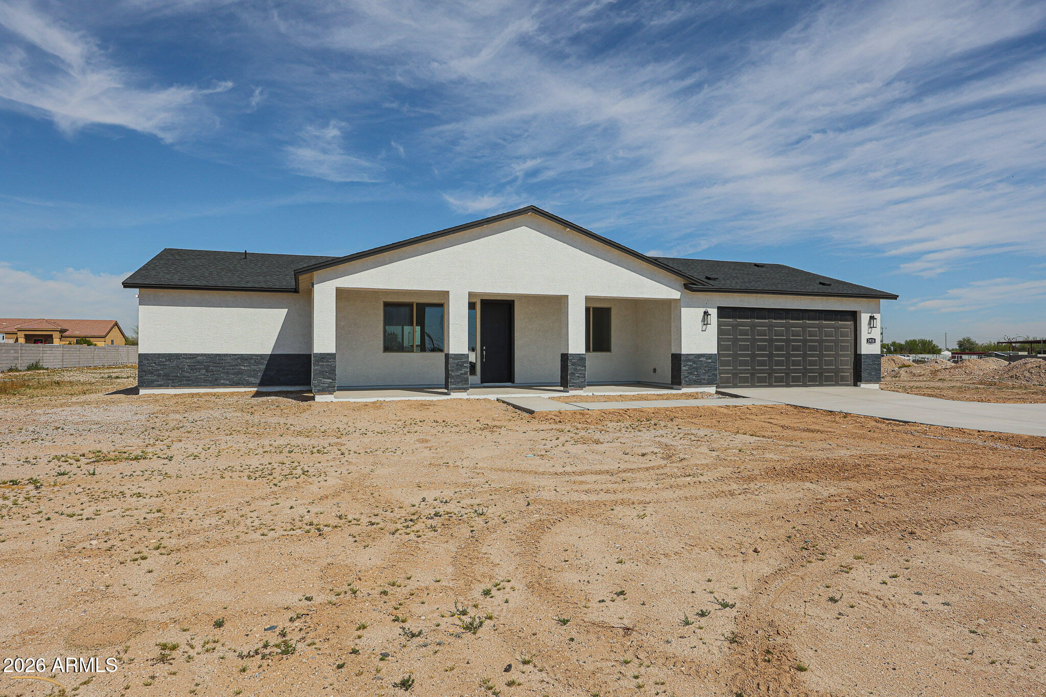 NO HOA!Situated on 1.3 acres with endless possibilities, this brand-new 4-bedroom, 2-bath home offers the perfect blend of modern design & wide-open space. Bring your horses, RVs, toys, and dreams, there's room to build a shop, add a pool, or create your ideal outdoor setup.. Inside, you'll find a modern open-concept layout with a beautiful kitchen featuring Frigidaire stainless steel appliances, granite countertops, abundant cabinetry and a spacious center island perfect for entertaining. Thoughtfully designed split floor plan provides privacy for the primary suite, which features a spacious walk-in shower and comfortable retreat feel. The secondary bathroom includes a tub/shower combination with convenient access from one of the bedrooms, creating a flexible layout-See more setup ideal for guests or shared living. Additional interior features include stylish barn doors, medicine cabinets for added storage, and pre-installed extensions for TV mounts. The home also offers a large laundry room and a well-planned layout designed for both everyday comfort and functionality. Designed with efficiency and comfort in mind, the home features spray foam insulation, a powerful 5-ton HVAC system, and architectural shingle roofing. Enjoy outdoor living with extended front and rear porch areas--perfect for relaxing and taking in the surrounding open space and Arizona sunsets. The two-car garage includes a storage closet, a 220 outlet, and plumbing already in place for a future water softener. With modern construction, energy-efficient features, and plenty of room to grow, this property offers the space, freedom, and versatility buyers are searching for!