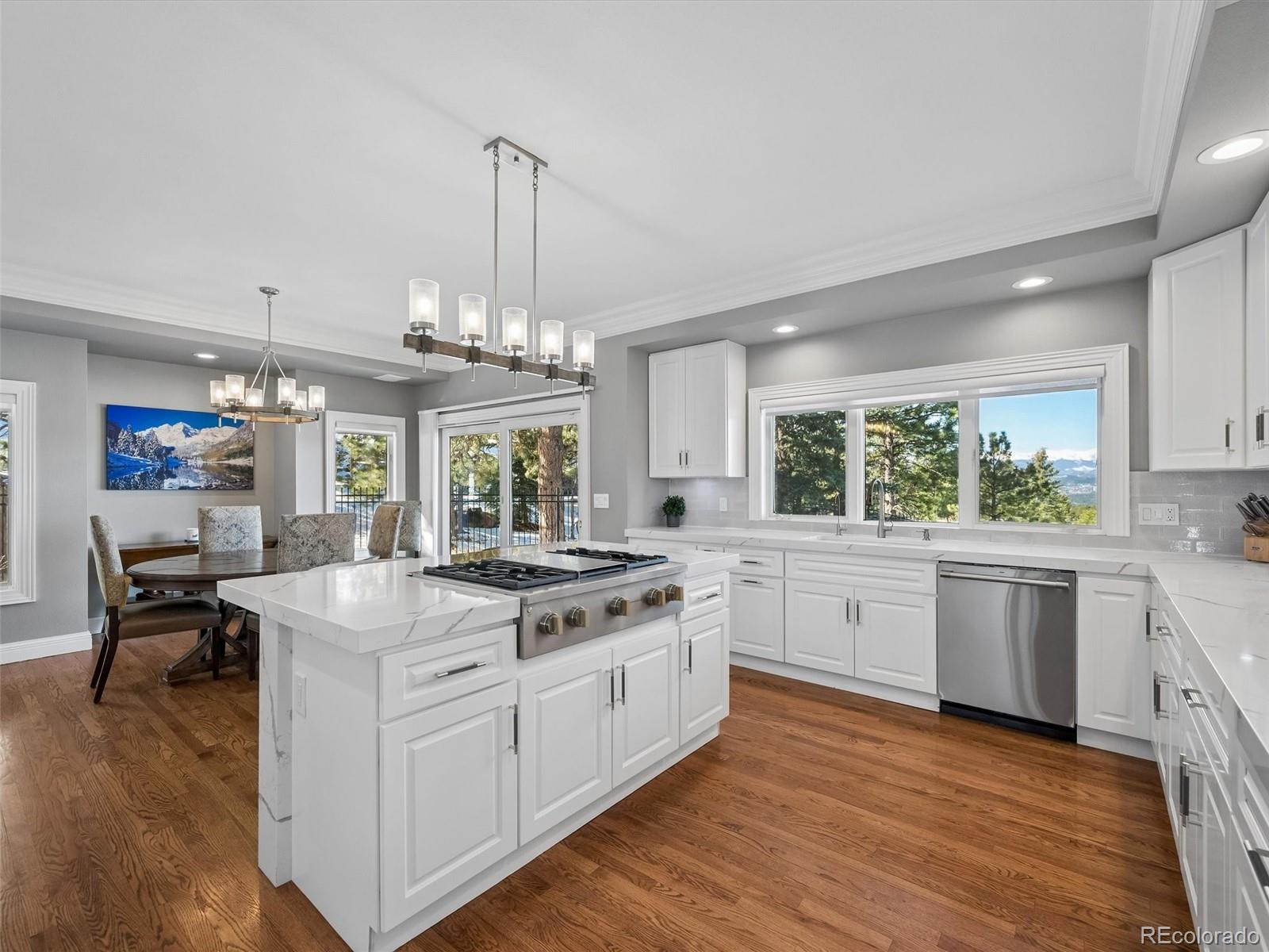 Upon entering, you're immediately captivated by sweeping views of Mt. Blue Sky framed by floor-to-ceiling windows in the great room. This luxurious Genesee residence showcases extraordinary mountain vistas, all visible from the living room, kitchen, primary suite, office and lower-level. Designed for both grand entertaining and everyday comfort, the open-concept seamlessly connects the great room to a beautifully renovated gourmet kitchen. Updated in 2021, the kitchen features new cabinetry, countertops, a generous island, pantry, wine cooler, electric window coverings, and updated lighting. Step effortlessly onto the outdoor oasis, complete with a concrete patio and landscaped gardens, or head just a few steps down to the lower-level backyard retreat. Hardwood floors span the main level, which also includes a formal dining room, private office with see through fireplace shared with the great room, and a piano room or extra office. Upstairs, the spacious primary suite offers expansive mountain views, a gas fireplace, ample space for a dedicated sitting area, a newly updated five-piece bath and walk-in closet. Two additional en-suite bedrooms provide comfort and privacy for family and guests. The walk-out lower level continues to impress with equally stunning views and direct access to the outdoor living spaces. This level features two additional bedrooms with a shared bath, a private fitness room, a large multi-purpose recreation area, gas fireplace, and a wet bar - perfect for entertaining. The oversized three-car garage offers new epoxy floors and a separate lock-off storage area. This sought-after Genesee community provides thousands of acres of hiking trails where the deer and elk are just part of the neighborhood. Luxury mountain living with unmatched city access-just 25 minutes to Denver and 45 minutes to world-class skiing. Come experience these breathtaking views in person, it is even better than the photos. Numerous updates, the list upon request.
