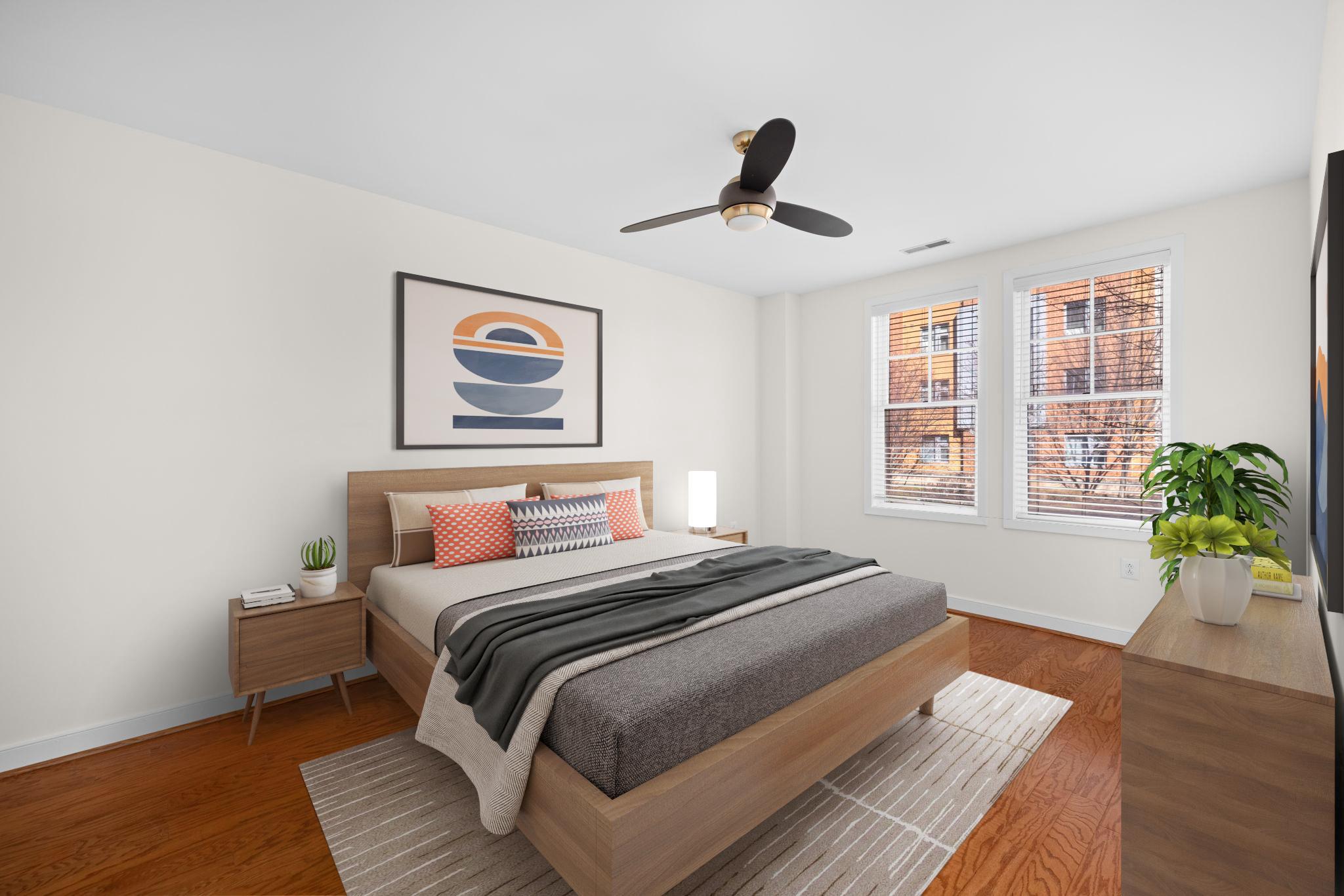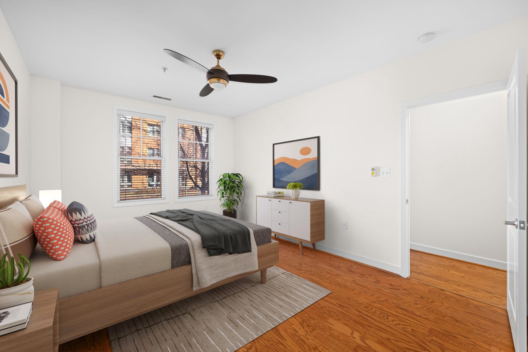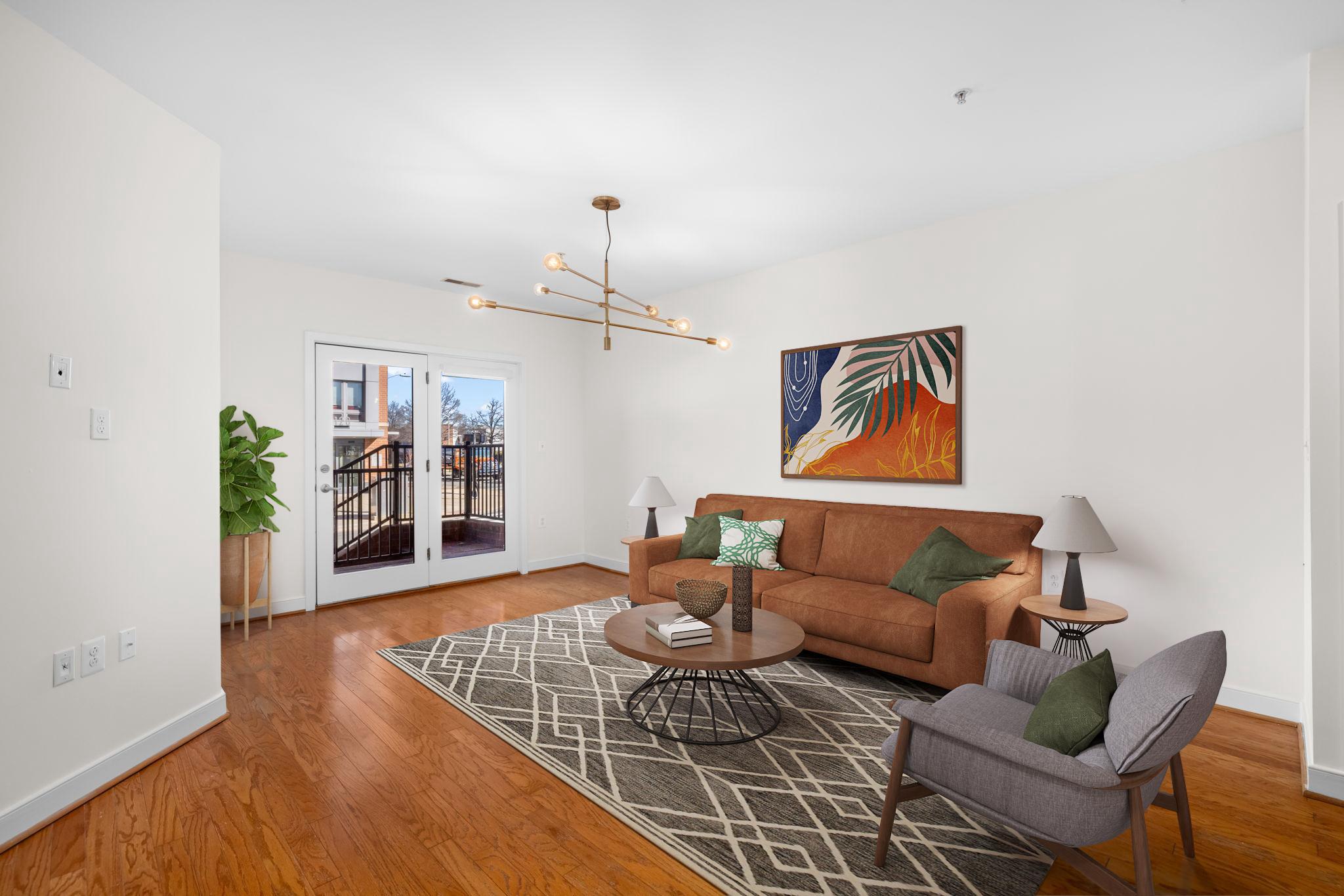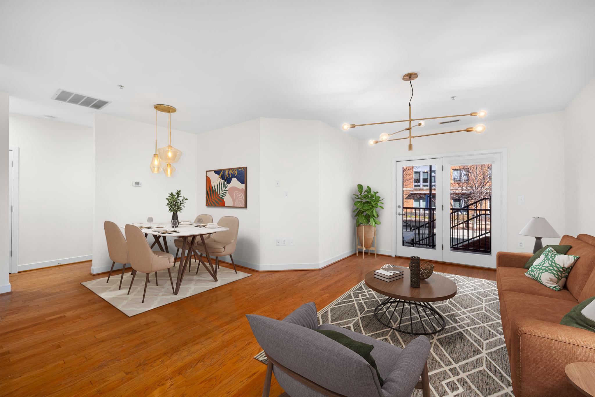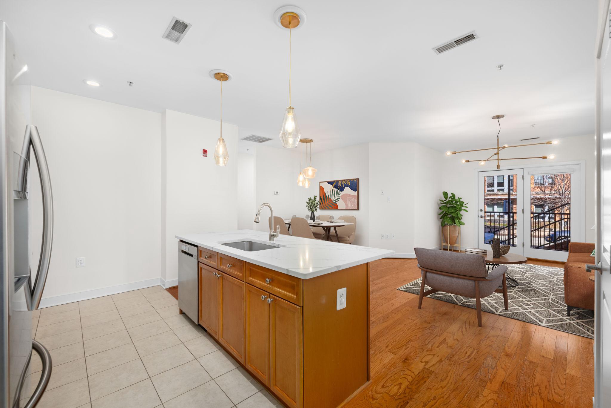 Welcome to Unit 110 at The Preston - a sophisticated 2-bedroom, 2-bathroom condominium offering 1,220 square feet of refined urban living in the heart of Alexandria's vibrant Potomac Yard neighborhood.The open-concept living and dining area makes an immediate impression, with rich hardwood floors, designer gold-accented light fixtures, and sliding doors opening to a private balcony overlooking the streetscape. The gourmet kitchen is anchored by a generous center island with quartz countertops, warm honey-toned cabinetry, a mosaic tile backsplash, and a full suite of stainless-steel appliances - including a gas range, perfect for the home chef.Both bedrooms are generously sized with hardwood floors and ceiling fans, while the primary suite features a walk-in closet with custom shelving and an en-suite bath. The second full bath is equally well-appointed, with quartz vanities and tub/shower combinations in both.Thoughtfully updated throughout: HVAC (3.5 years), water heater (3 years), washer (2025), microwave and range (3 years.) This home is truly move-in ready with nothing left to do but unpack.Additional highlights include two dedicated parking spaces, a private storage unit, and access to building amenities including a fitness center, rooftop deck, and community room. All of this directly across from Potomac Yard Shopping Center, with easy access to the Potomac Yard Metro, Route 1, and all that Old Town Alexandria has to offer.