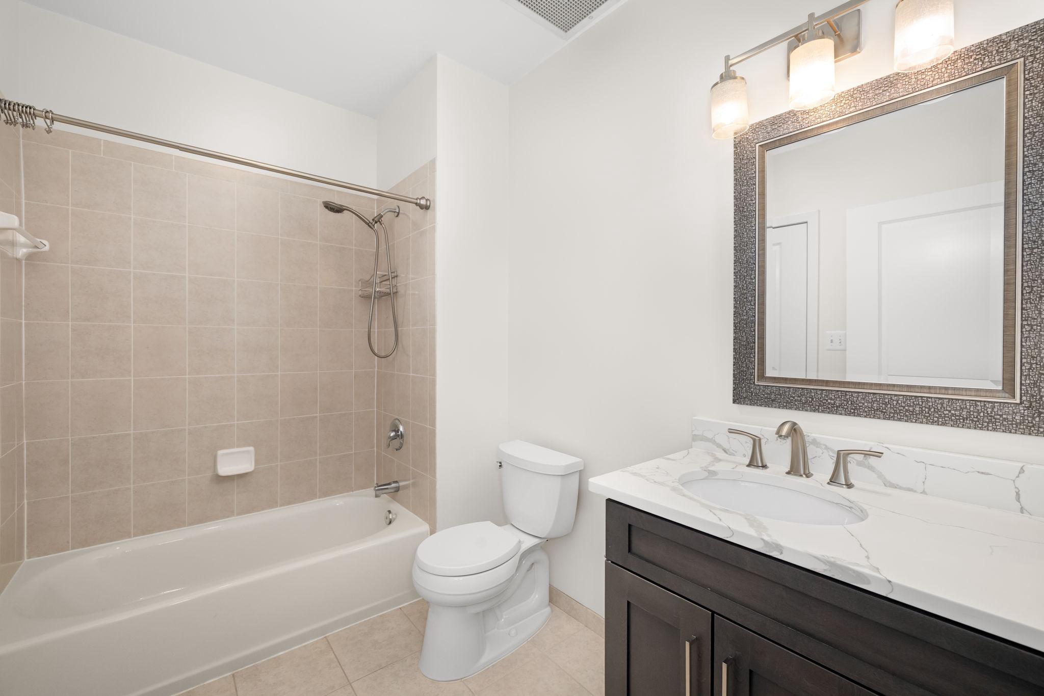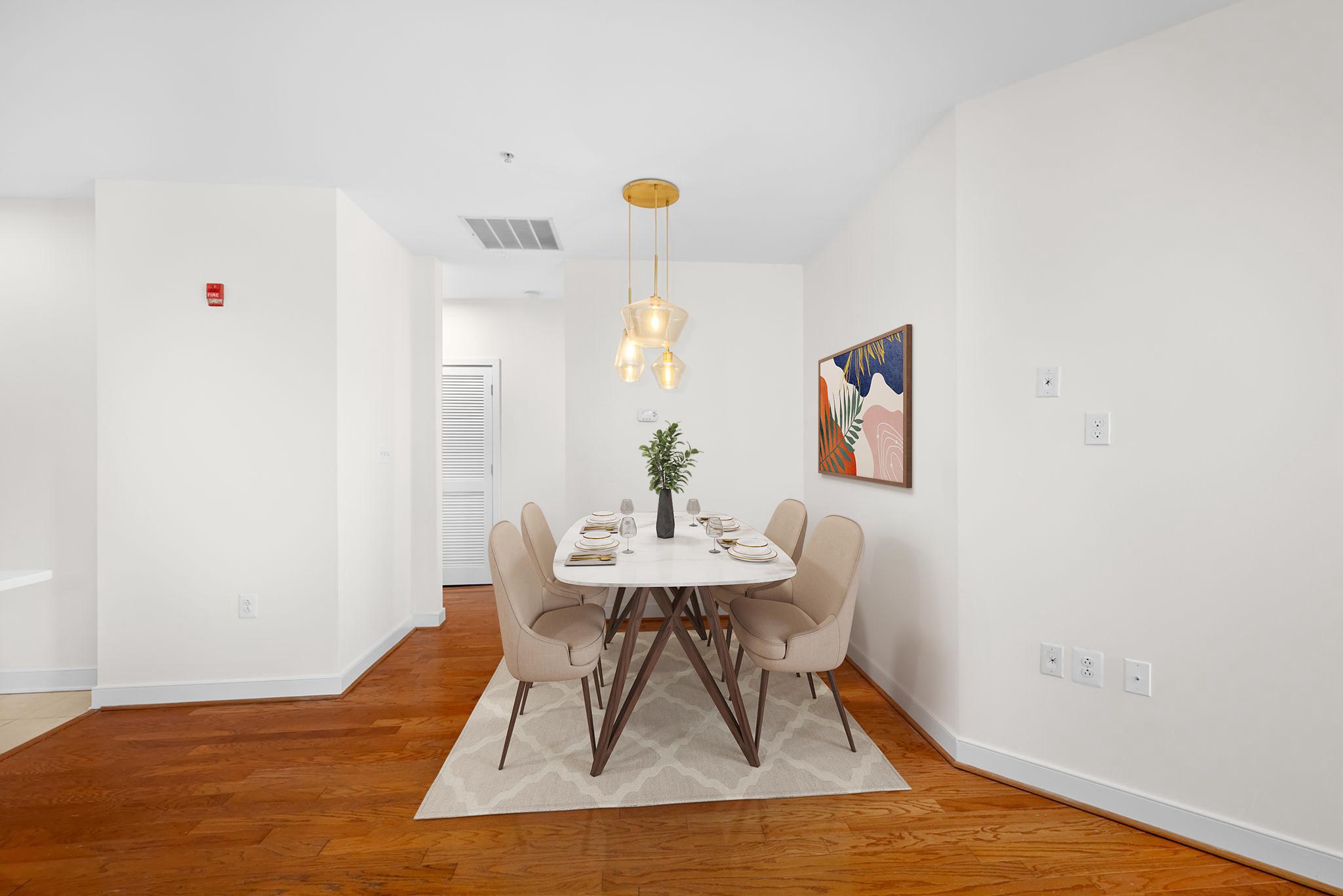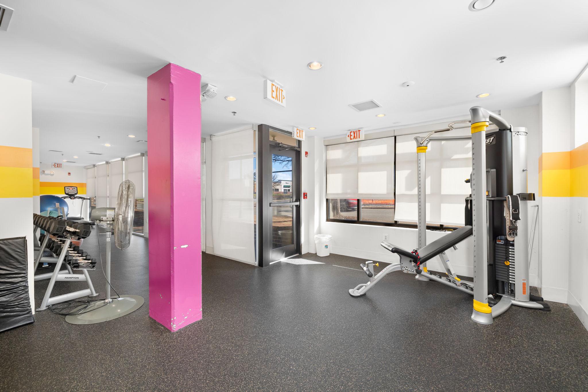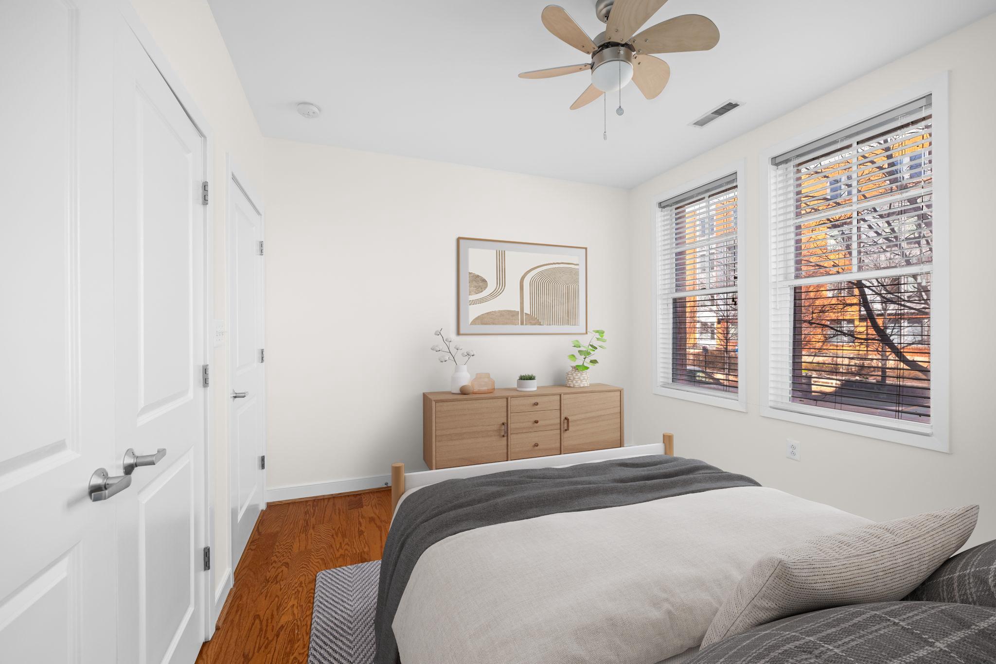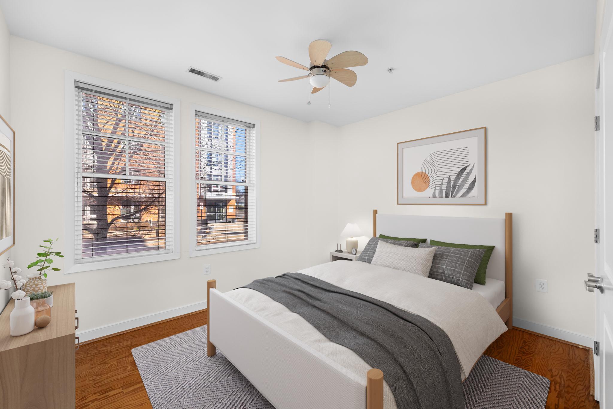 Welcome to Unit 110 at The Preston - a sophisticated 2-bedroom, 2-bathroom condominium offering 1,220 square feet of refined urban living in the heart of Alexandria's vibrant Potomac Yard neighborhood.The open-concept living and dining area makes an immediate impression, with rich hardwood floors, designer gold-accented light fixtures, and sliding doors opening to a private balcony overlooking the streetscape. The gourmet kitchen is anchored by a generous center island with quartz countertops, warm honey-toned cabinetry, a mosaic tile backsplash, and a full suite of stainless-steel appliances - including a gas range, perfect for the home chef.Both bedrooms are generously sized with hardwood floors and ceiling fans, while the primary suite features a walk-in closet with custom shelving and an en-suite bath. The second full bath is equally well-appointed, with quartz vanities and tub/shower combinations in both.Thoughtfully updated throughout: HVAC (3.5 years), water heater (3 years), washer (2025), microwave and range (3 years.) This home is truly move-in ready with nothing left to do but unpack.Additional highlights include two dedicated parking spaces, a private storage unit, and access to building amenities including a fitness center, rooftop deck, and community room. All of this directly across from Potomac Yard Shopping Center, with easy access to the Potomac Yard Metro, Route 1, and all that Old Town Alexandria has to offer.