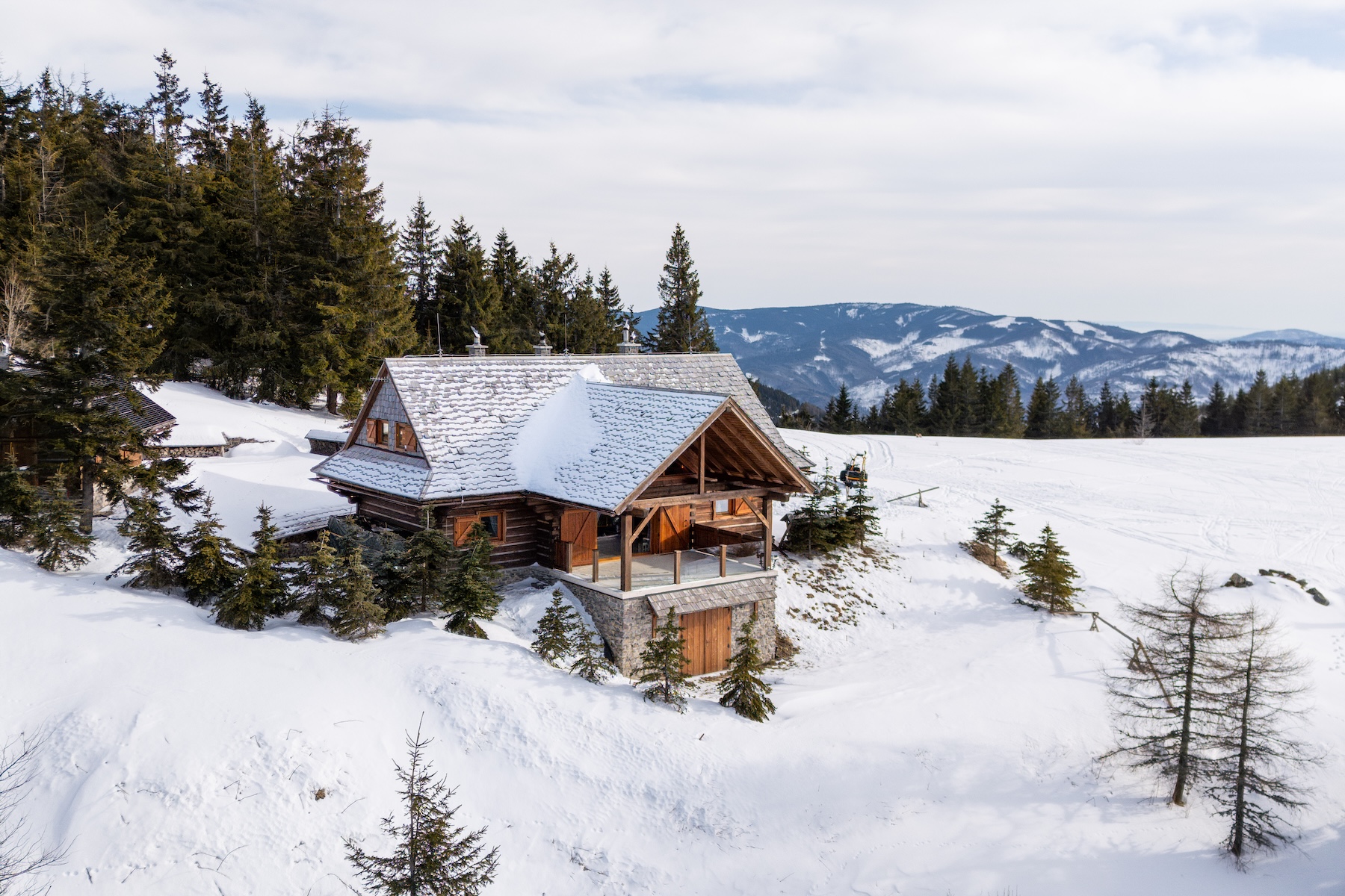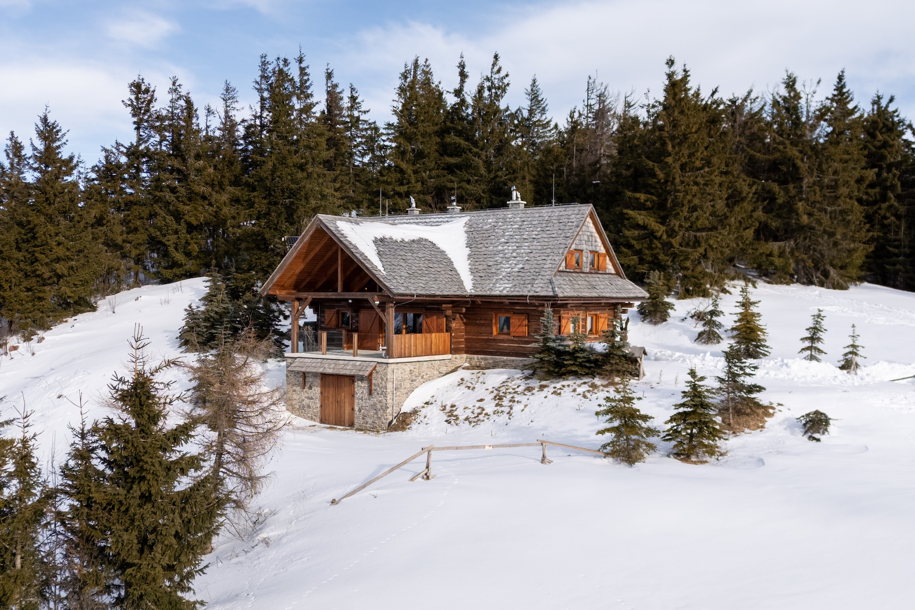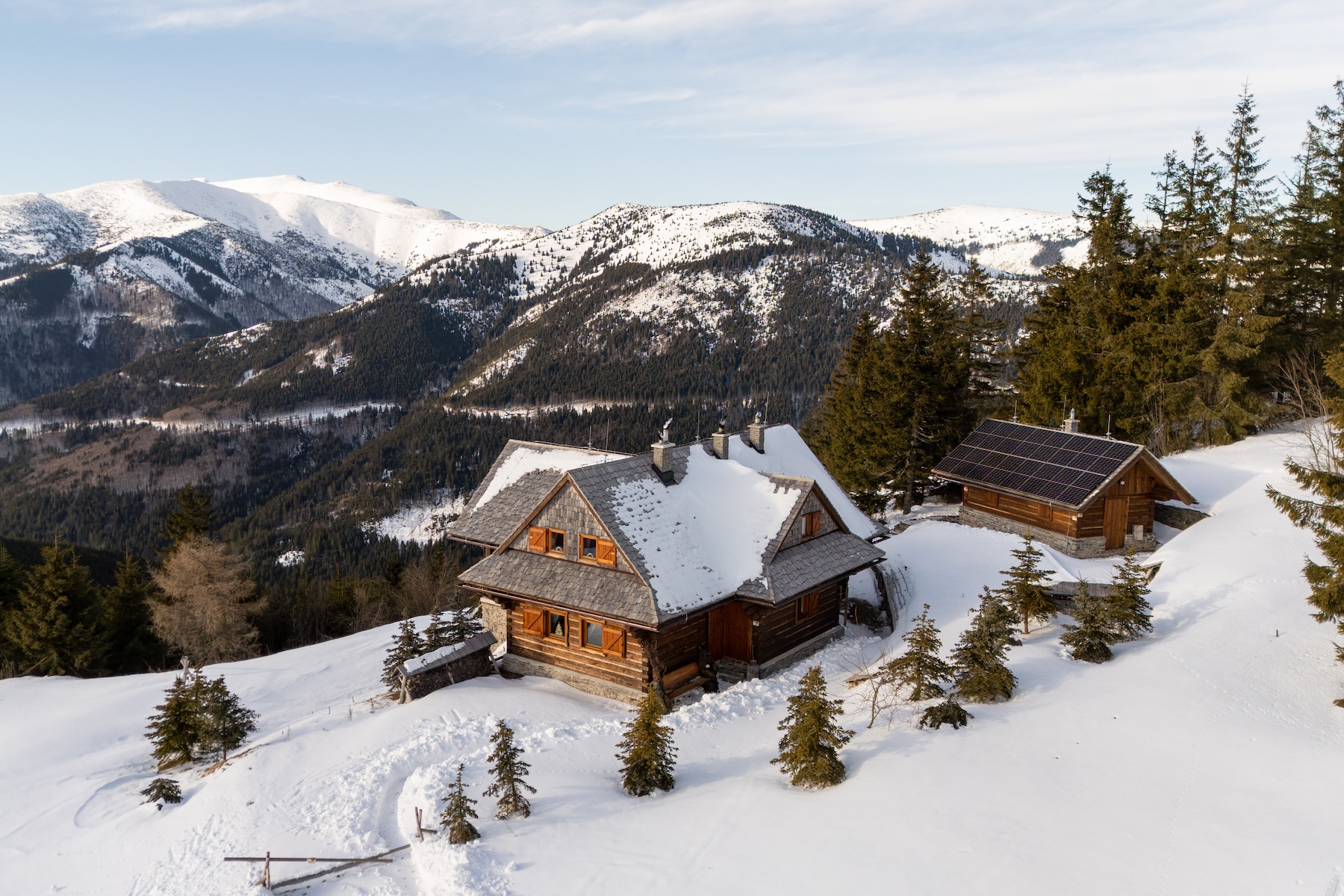 The technological backbone of the property is an off-grid energy system based on photovoltaic panels with high-capacity batteries and a backup power source. The combination of modern technologies and traditional materials allows for comfortable year-round use of the chalet even in a more secluded mountain environment.