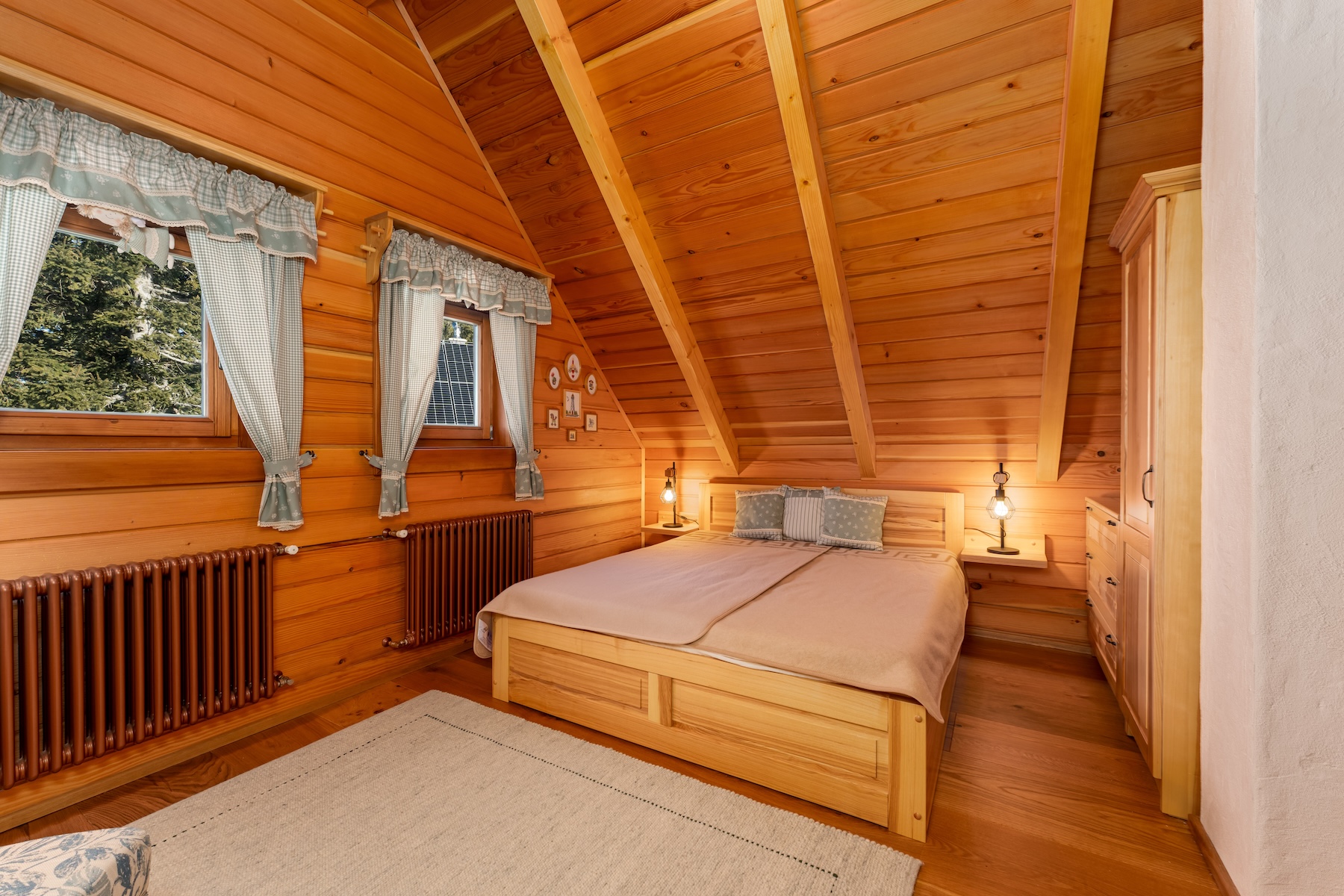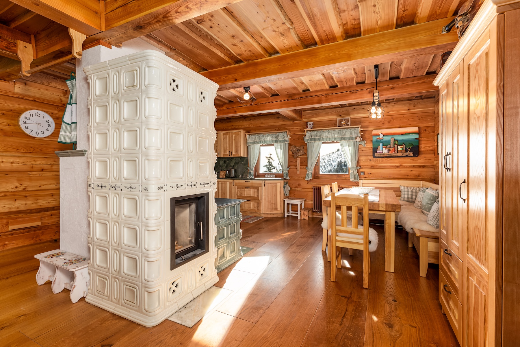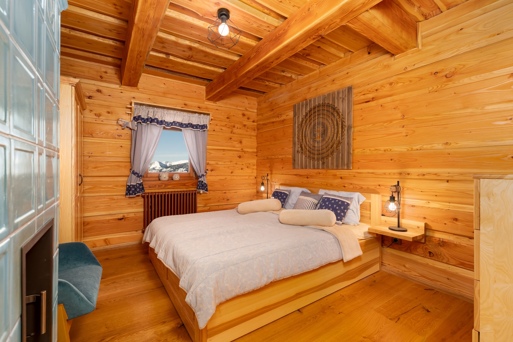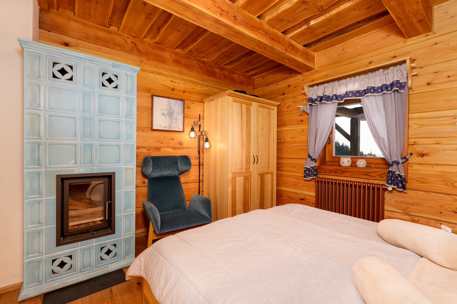 The upper floor forms the night zone consisting of three bedrooms and two bathrooms. The master bedroom offers a peaceful retreat complemented by traditional ceramic tiled stoves that enhance the atmosphere of a mountain hideaway. The remaining two rooms provide flexible use for family members or guests. Thanks to windows oriented toward the surrounding landscape, every room benefits from natural daylight.