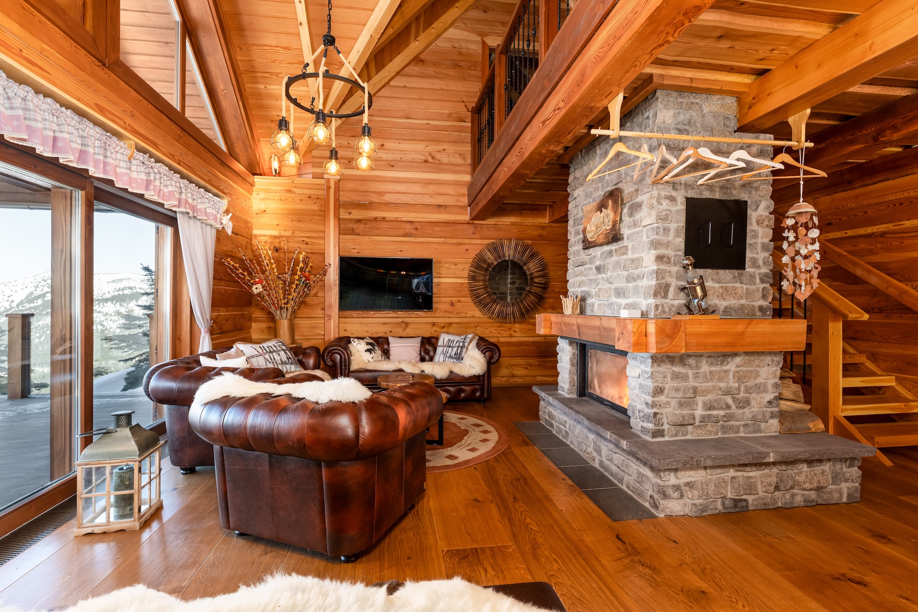 The living area on the ground floor is designed as an open-plan space combining a living room with fireplace, a dining area and a fully equipped kitchen. Large-format glazing seamlessly connects the interior with the exterior and leads to a covered terrace offering panoramic views of the mountain valleys and forests of the Low Tatras. The interior is characterized by high ceilings, exposed wooden beams and handcrafted details that together create an authentic mountain atmosphere. The ground floor also includes a wellness zone with a Finnish sauna and shower, a separate toilet and a technical room.