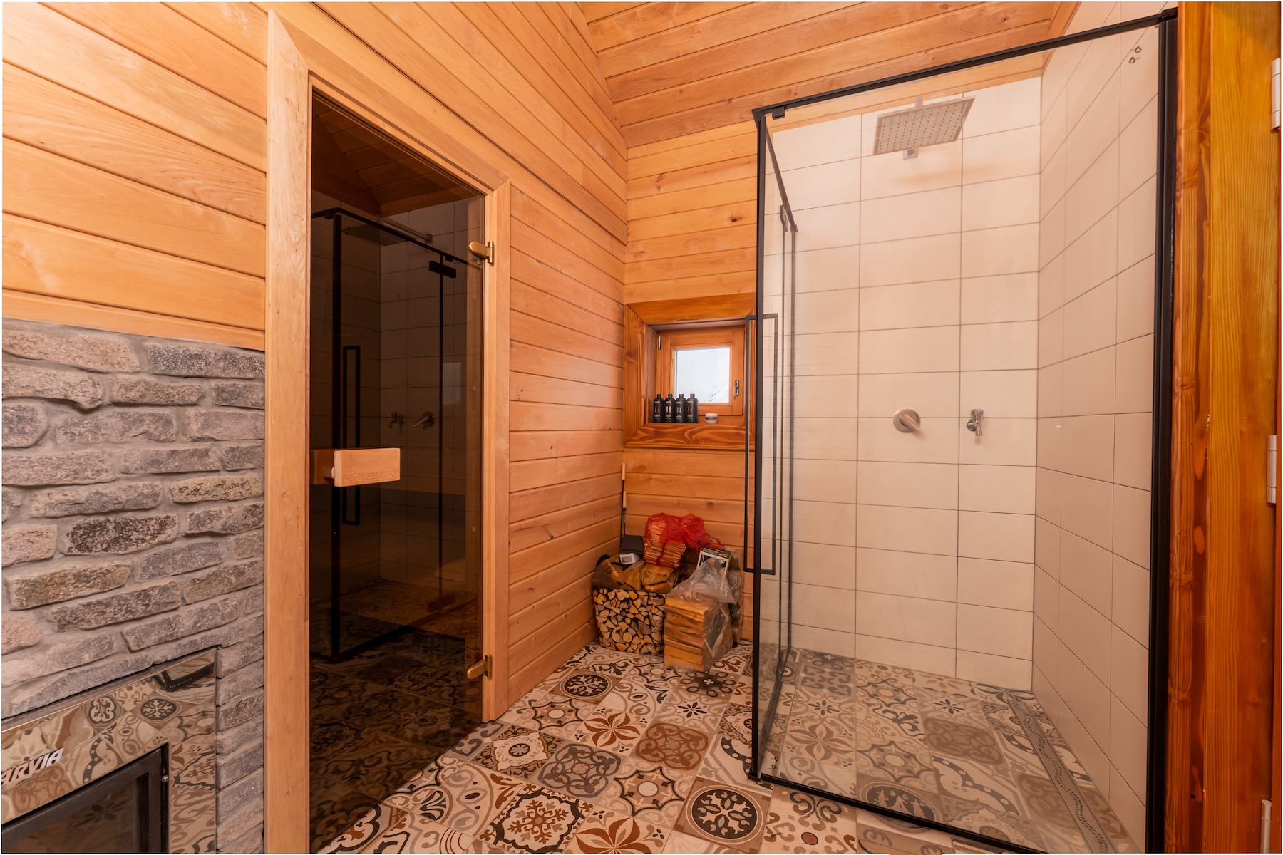 newly build (2022 – 2024) wood construction (Canadian cedar) wellness area with Finnish sauna fireplace and traditional ceramic tiled stoves off-grid energy system photovoltaic panels, batteries, backup power source gas tank and gas generator camera and alarm security system EC not required according to applicable legislation