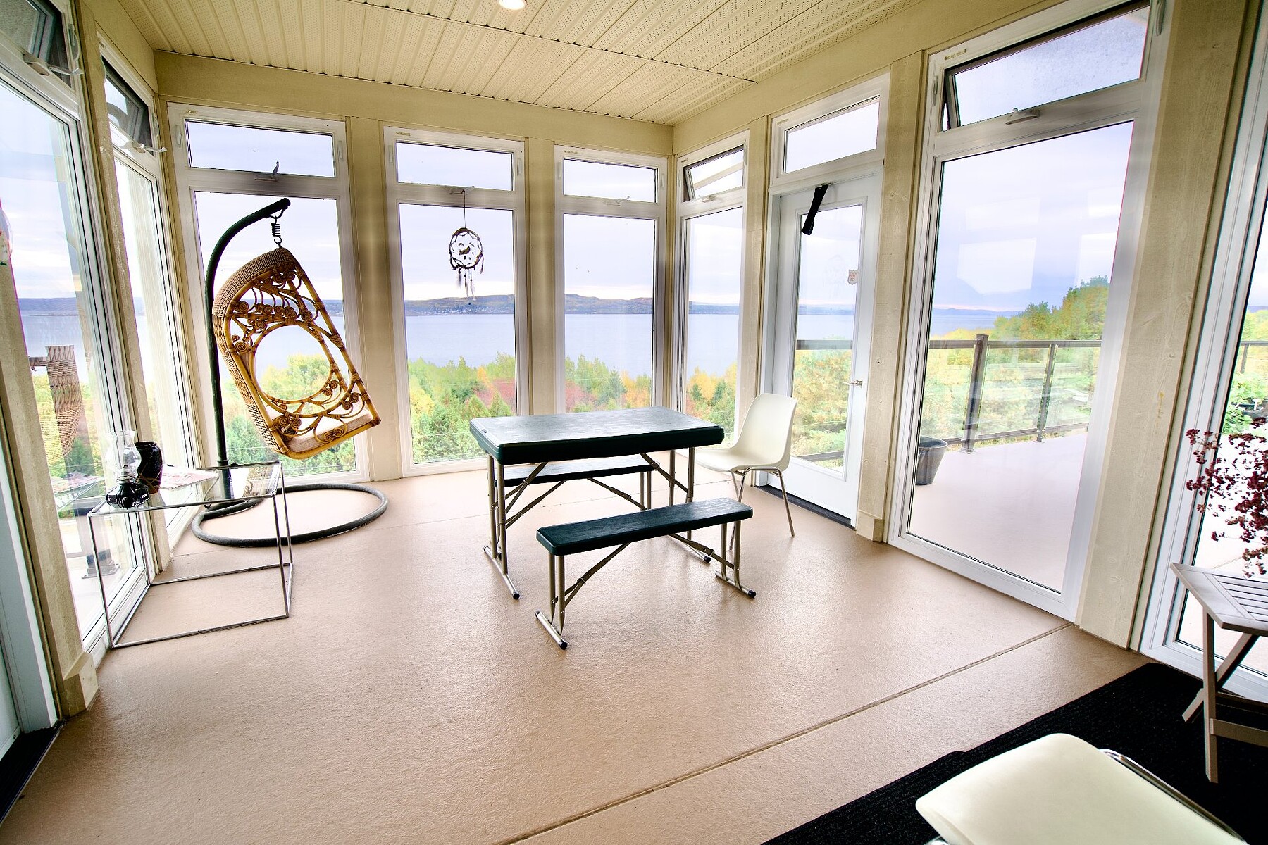 With its large windows, 9-foot ceilings, and high-quality materials, this multigenerational home was designed to showcase the breathtaking view of Chaleur Bay. The two-story main residence features a large open-concept living area with a double-sided fireplace, 4 bedrooms (2 with fireplaces), 3 bathrooms (including one en suite to the master bedroom), a magnificent glass-enclosed patio, 2 spacious balconies, and a double garage. One of the bedrooms has direct access to the outdoors (ideal for home-based workers). On the garden level : 3½-bedroom unit adapted for people with reduced mobility (lots of light, wide living area, sunroom, terrace).