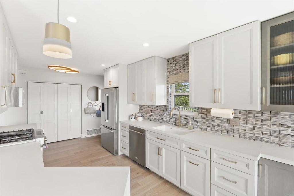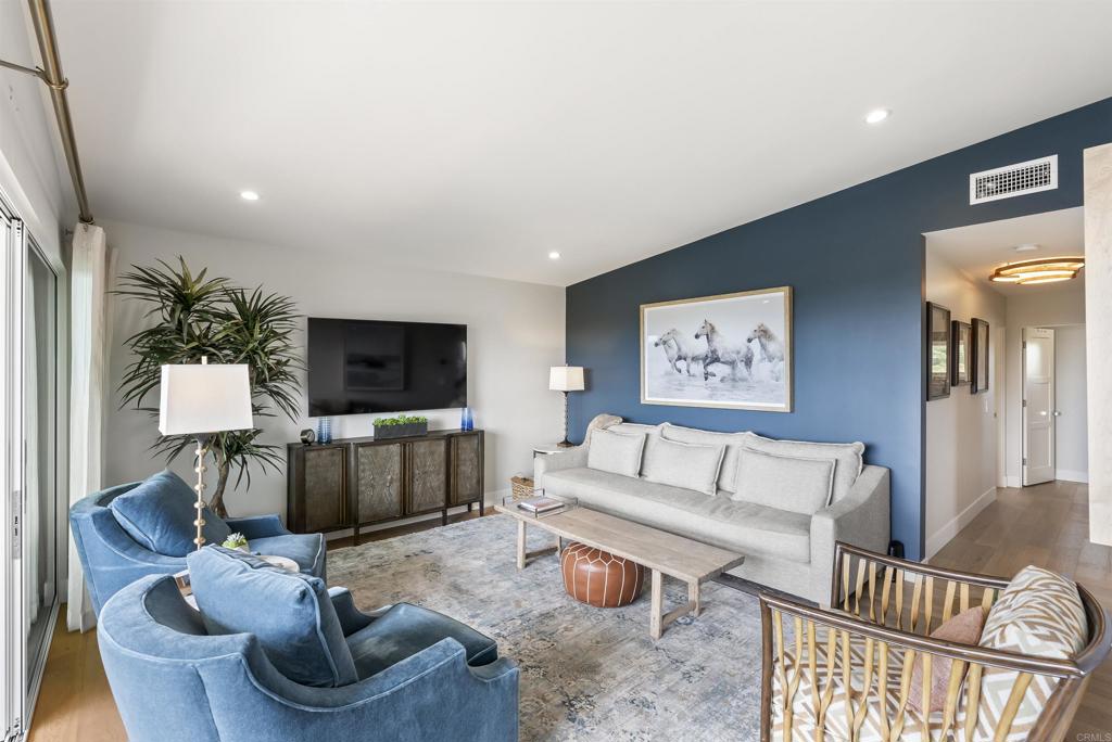 STUNNING LOCATION! Rare top-level end unit, this single-story luxury penthouse in Park Del Mar offers breathtaking panoramic ocean views. Completely remodeled from top to bottom with premium finishes, the home features custom folding glass doors that open seamlessly to your private patio, perfect for enjoying uninterrupted ocean breezes and spectacular sunsets. The open-concept floor plan showcases vaulted ceilings, beautiful wood flooring throughout, and abundant natural light. The residence offers 2 bedrooms and 2 full baths, thoughtfully designed with exquisite, spa-inspired finishes. The gourmet kitchen is equipped with top-of-the-line KitchenAid appliances and a Bosch refrigerator, ideal for both everyday living and entertaining. A full-size washer and dryer are conveniently located within the unit. Additional highlights include a nearby covered carport plus an additional open parking space for a second vehicle, as well as a private storage unit. The home also overlooks a tranquil greenbelt with a park-like setting. Residents enjoy resort-style amenities including a pool, sauna, and spectacular ocean-view clubhouse featuring a kitchen, showers, changing areas, ping pong, shuffleboard, and more. Ideally located just minutes from the beautiful beaches of Solana Beach, Del Mar, and Encinitas, as well as outstanding restaurants, shopping, and the world-famous Del Mar Racetrack.