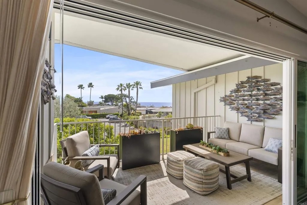 STUNNING LOCATION! Rare top-level end unit, this single-story luxury penthouse in Park Del Mar offers breathtaking panoramic ocean views. Completely remodeled from top to bottom with premium finishes, the home features custom folding glass doors that open seamlessly to your private patio, perfect for enjoying uninterrupted ocean breezes and spectacular sunsets. The open-concept floor plan showcases vaulted ceilings, beautiful wood flooring throughout, and abundant natural light. The residence offers 2 bedrooms and 2 full baths, thoughtfully designed with exquisite, spa-inspired finishes. The gourmet kitchen is equipped with top-of-the-line KitchenAid appliances and a Bosch refrigerator, ideal for both everyday living and entertaining. A full-size washer and dryer are conveniently located within the unit. Additional highlights include a nearby covered carport plus an additional open parking space for a second vehicle, as well as a private storage unit. The home also overlooks a tranquil greenbelt with a park-like setting. Residents enjoy resort-style amenities including a pool, sauna, and spectacular ocean-view clubhouse featuring a kitchen, showers, changing areas, ping pong, shuffleboard, and more. Ideally located just minutes from the beautiful beaches of Solana Beach, Del Mar, and Encinitas, as well as outstanding restaurants, shopping, and the world-famous Del Mar Racetrack.