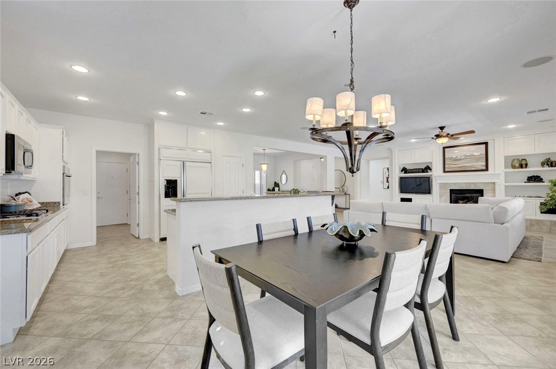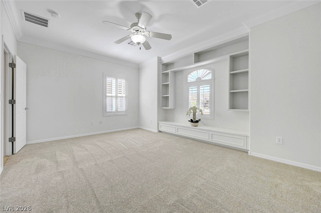 Sun City Anthem golf course frontage! This light-filled, open floorplan features brand new interior paint, cabinet paint & brand new carpet. Inviting great room offers custom built-ins, fireplace, TV & surround sound system. The den includes custom built-in cabinets. Spacious kitchen has granite counters, RO System, Built in GE Monogram refrigerator & brand new stainless steel GE oven, dishwasher, stove & microwave. Primary suite with backyard access, en-suite bath with 2 sinks, sep. tub & shower & walk-in closet. Large secondary bedroom with built-ins. Additional upgrades include owned solar panels, plantation shutters, custom built-in office, Pella French doors, Rolladen shutters, tankless water heater, full house water filtration, Sola Tube skylights, power sun shades, newer HVAC-2020 & gated front courtyard. Garage has generous cabinet storage, evaporative cooler & insulated doors. Enjoy mountain views in the backyard with a covered patio, brand new synthetic turf & built-in BBQ!