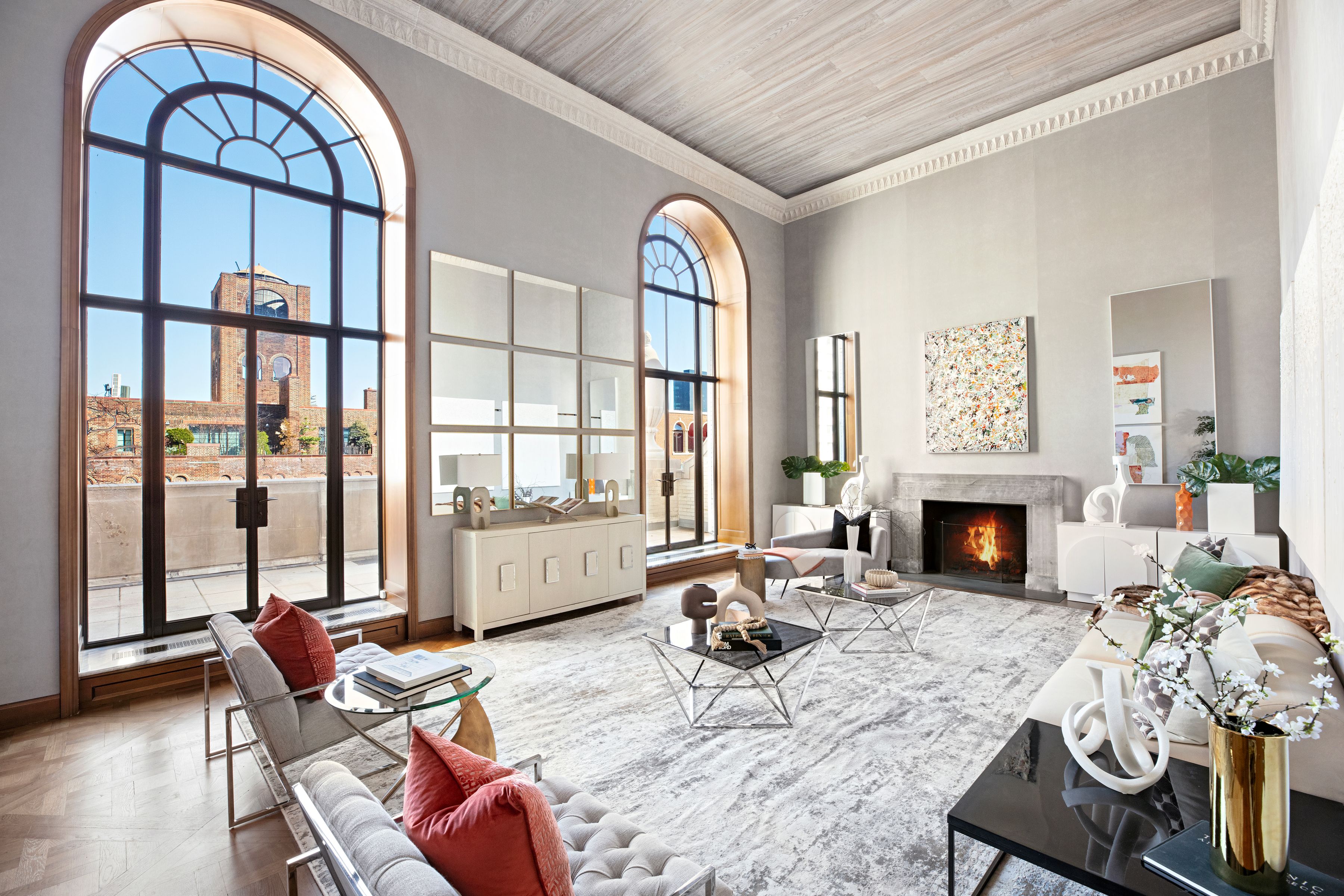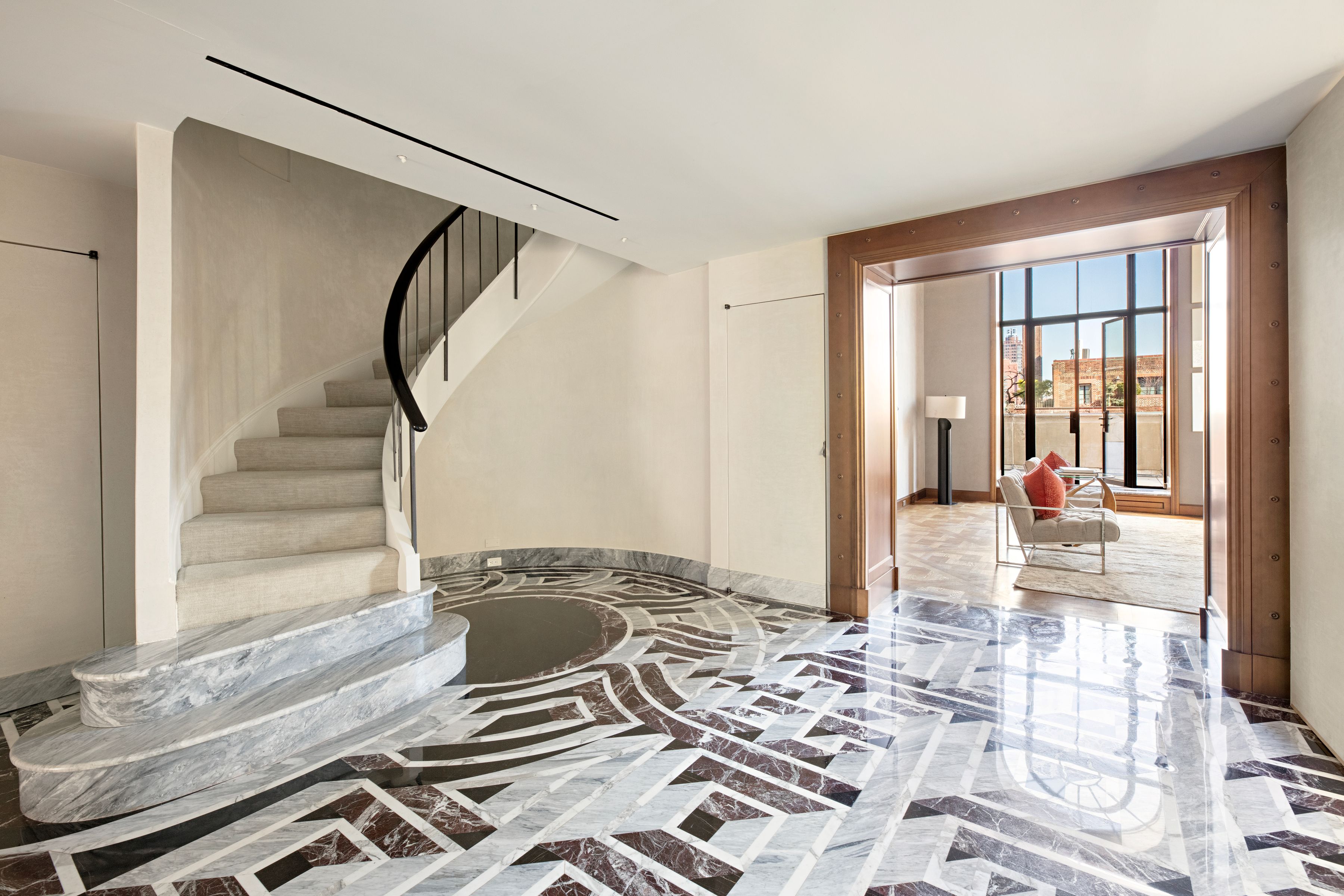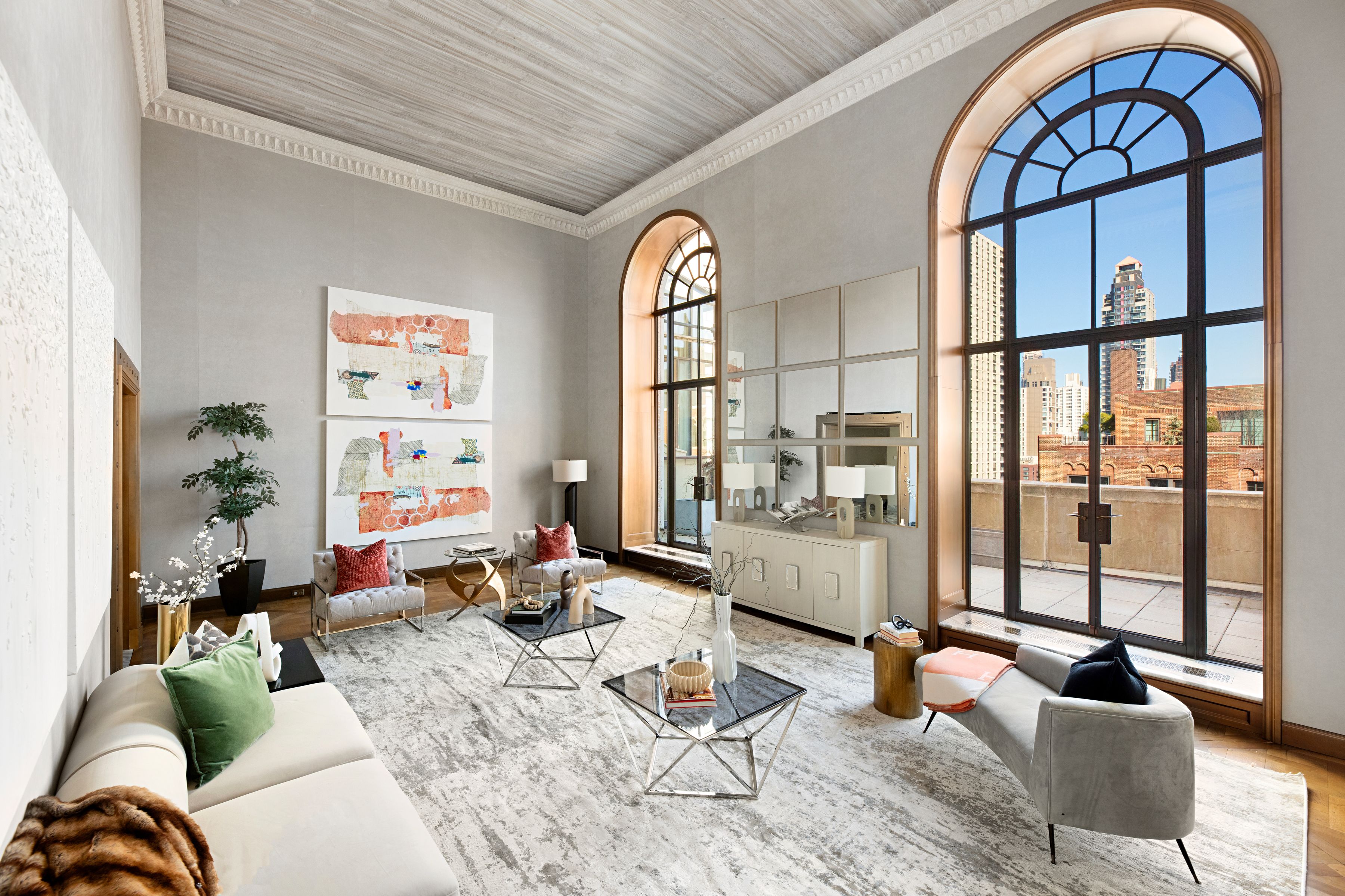 This extraordinary Sutton Place penthouse has been masterfully reimagined by AD100 designer Juan Pablo Molyneux, resulting in a residence of exceptional scale, craftsmanship, and elegance. Offering approximately 3,300 square feet of interior space and over 450 square feet of exterior space, this two-bedroom, three-bathroom home has been thoughtfully designed with every detail carefully curated. A private elevator landing opens to a gracious entrance gallery, where custom inlaid marble mosaic floors, 6-inch marble baseboards, and finely finished stone-painted walls set a sophisticated tone and lead seamlessly into the entertaining spaces. The dramatic living room is defined by soaring 18-foot ceilings, a wood-burning fireplace with a custom-molded glass mantel, and exquisite Parquet de Versailles oak flooring. Oversized French windows, crowned with arched lunettes, open onto an approximately 30-foot, sun-filled north-facing terrace—perfectly designed for entertaining and enhanced by elegant architectural detailing. A formal dining room comfortably accommodates up to twelve guests and is bathed in natural light from a large south-facing window. Lutron lighting throughout allows for an equally refined ambiance in the evening. The windowed chef’s kitchen is impeccably appointed with Porcelanosa cabinetry, striking marble countertops and backsplash, and top-of-the-line appliances, including a Sub-Zero side-by-side refrigerator/freezer, Miele oven and cooktop with vented hood, Miele microwave, an additional Sub-Zero refrigerator, Grohe fixtures, and a 28-bottle wine cooler. A beautifully renovated powder room serves this level and leads to the private wing. The serene primary suite features a south-facing terrace, a wood-burning fireplace, and two luxurious en-suite bathrooms. One is finished in elegant grey and white marble with mirrored walls, a built-in vanity, and generous storage. The second is richly appointed with Wenge wood paneling and flooring, Travertine marble, a soaking tub, and a separate shower with a 24-inch rain shower head. Both bathrooms are windowed and feature heated marble floors and imported Sardinelli fixtures. Adjacent to the suite is a private windowed room, ideal as a home office, gym, or dressing room. A sculptural curved staircase leads to the upper level, where a spacious open room offers flexibility as a library, media room, home office, or artist’s studio. A secondary bedroom with an east-facing window and en-suite black and white marble bath completes this floor. The residence is equipped with top-tier systems, including central HVAC, Lutron lighting throughout, a washer/dryer, and upgraded electrical and plumbing systems. Additional features include heated marble floors in the gallery, dining room, and primary bathrooms, as well as a private storage bin. 322 East 57th Street is one of Manhattan’s most distinguished prewar cooperative buildings, designed in 1929 by Harry M. Clawson. This neo-Classical limestone building comprises just 19 residences across 21 floors and is renowned for its grand proportions and iconic double-height living spaces. Long favored by those seeking a refined and discreet lifestyle, the building offers a full-time staff, allows pied-à-terre ownership and pets, and is ideally located in Sutton Place near the East River Promenade and some of the neighborhood’s best dining and shopping. 3% flip tax.