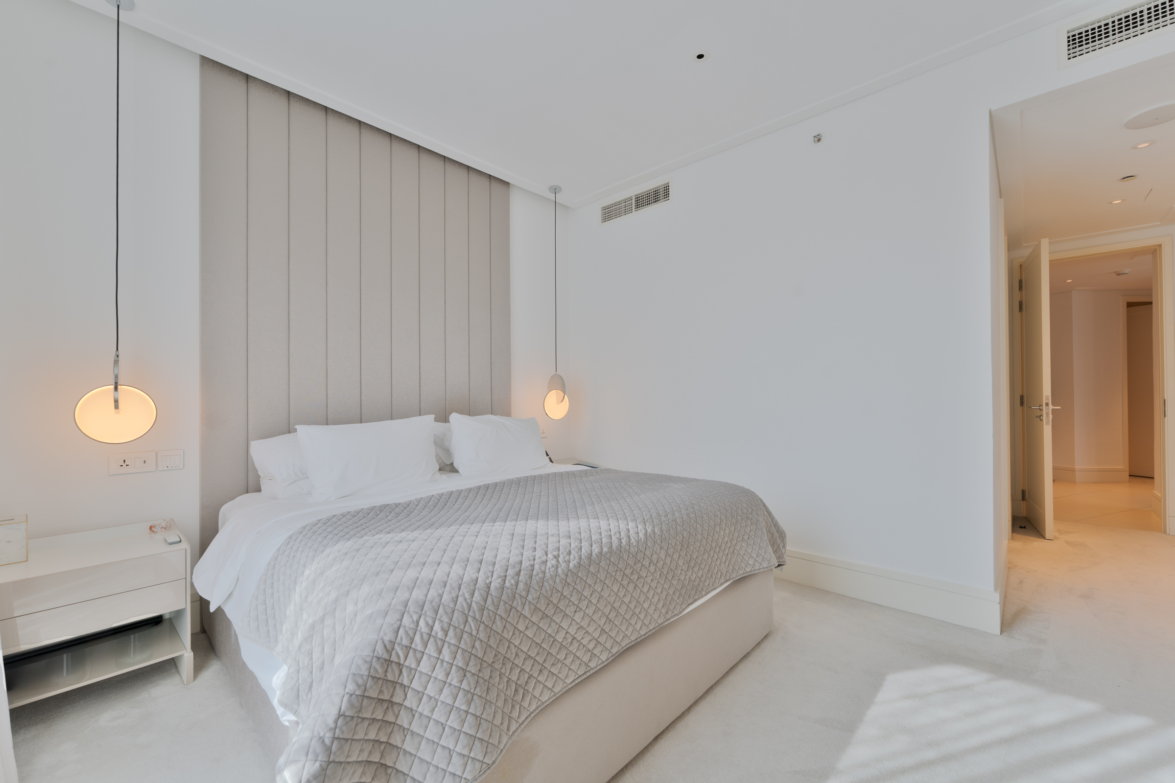 The bedrooms — equally considered — present serene and relaxing accommodation complemented by elegant built-in wardrobes and bathrooms with premium fittings. The apartment is also served by two parkings.