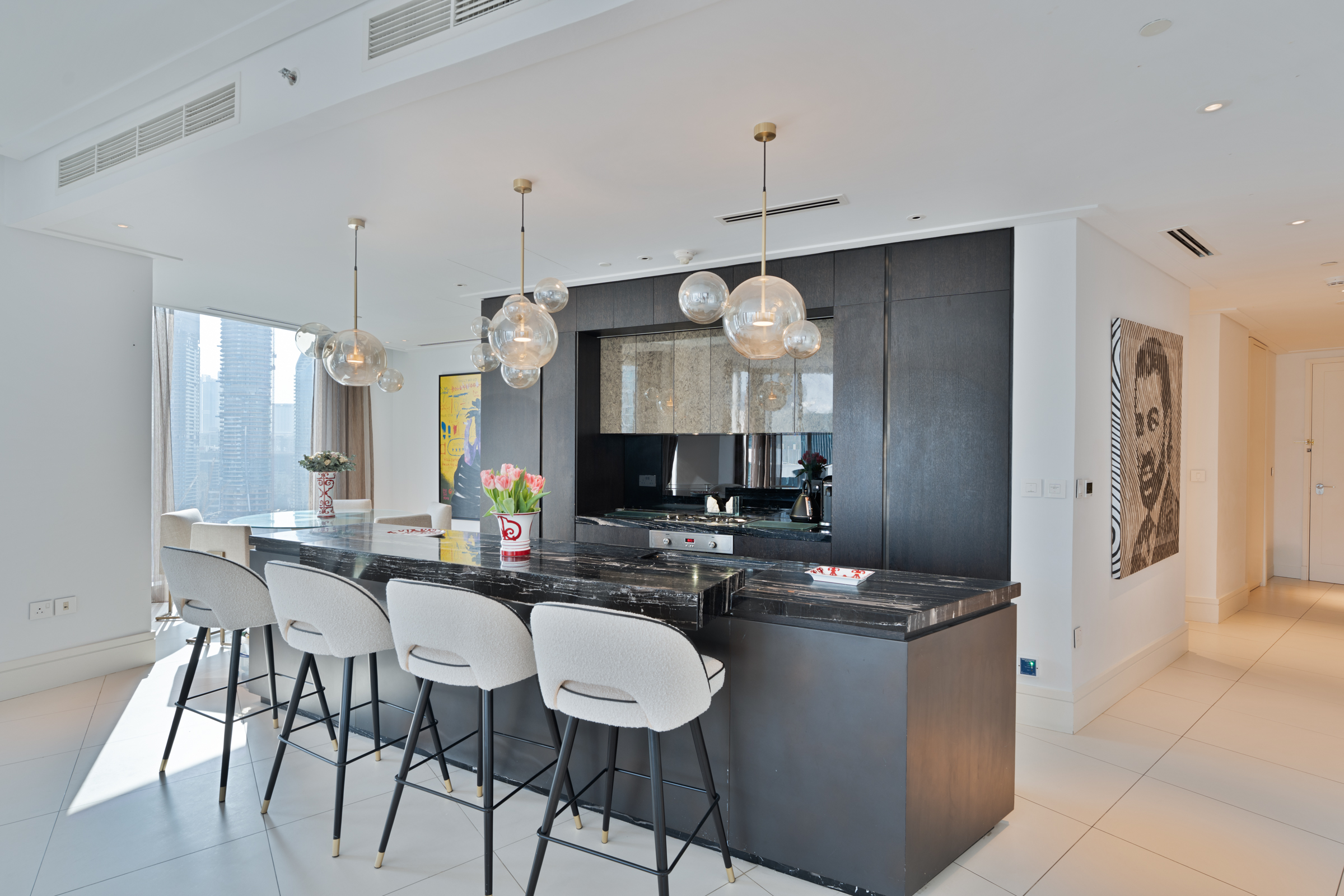 The entrance gives way to an open-concept living room, kitchen, and dining space — the heart of the home — accentuated by iconic views of Downtown Dubai. The upgraded kitchen comes well-appointed and fitted with built-in appliances, featuring an island finished with fine wooden panelling and marble slabs. This communal space seamlessly flows out to a private balcony overlooking the beautiful cityscape.