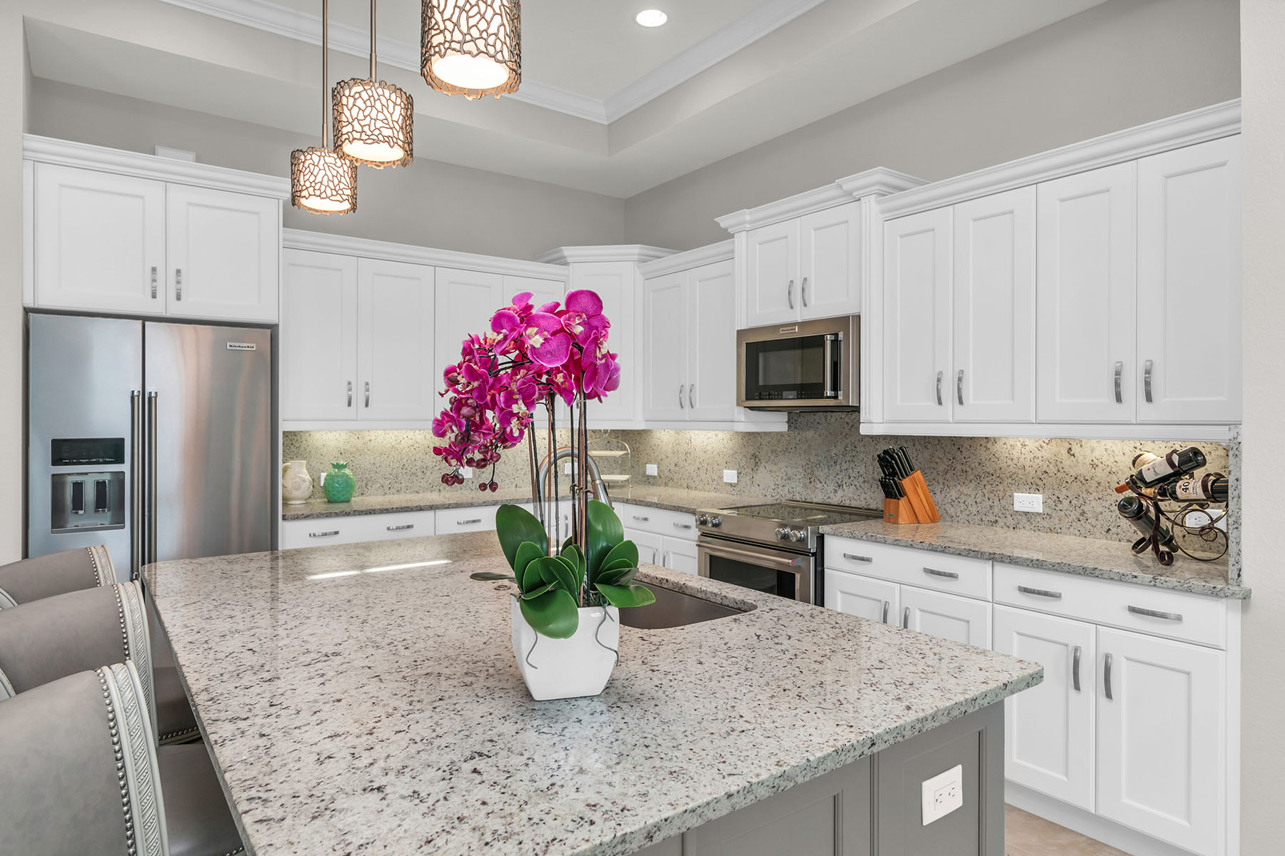 Welcome to this spacious and stunning Stock Custom Home, in the vibrant gated community of Naples Reserve. Go inside this Venice floorplan design and be greeted by the refined elegance of crown molding throughout, accentuating the home's sophisticated features. The expansive great room with 14-foot tray ceiling, neutral toned-tile floors, is bathed in natural sunlight, creating a warm and inviting atmosphere. The gourmet kitchen is a chef's delight, complete with white cabinetry, under-mount lighting, soft-close drawers and doors, and an expansive island adorned with elegant granite counters and a matching backsplash. Sleek KitchenAid stainless steel appliances complete this culinary haven. Enjoy your morning coffee in the cozy breakfast nook and host formal dinners in the adjacent dining room. Retreat to your spacious primary suite, featuring his and her walk-in closets and a luxurious en-suite bath. The split floor plan includes two spacious guest bedrooms that share a second bath and a roomy fourth bedroom presently used as a den. Relax on your expansive lanai with new screening, southerly long lake view, heated salt-water pool, spa and gorgeous summer kitchen. Enjoy peace of mind with impact glass windows and doors, Storm Smart shades, split air conditioner in the THREE-CAR GARAGE, whole-house water filtration system, whole-house surge protection, pool equipment surge protection and Vitex alarm system. Active clubhouse offers an impressive array of amenities and a lively event calendar. Stay fit in the fitness center, play bocce ball or beach volleyball, and unwind at the tiki bar and café. Dive into the resort-style pool with lap lanes or gather around the fire pit. Adventure awaits on the private Kon Tiki island with paddleboards, kayaks and bicycles. Sports enthusiasts will love the tennis and pickleball courts, basketball court, and miles of recreational and biking paths. Pet owners can take advantage of the dog parks, and families will adore the kid's cove with a tot lot. Conveniently between downtown Naples and Marco Island, this home offers easy access to shopping, entertainment, dining and numerous Gulf beaches. Not in flood zone (Zone X). Don't miss your chance to experience this exceptional lifestyle!
