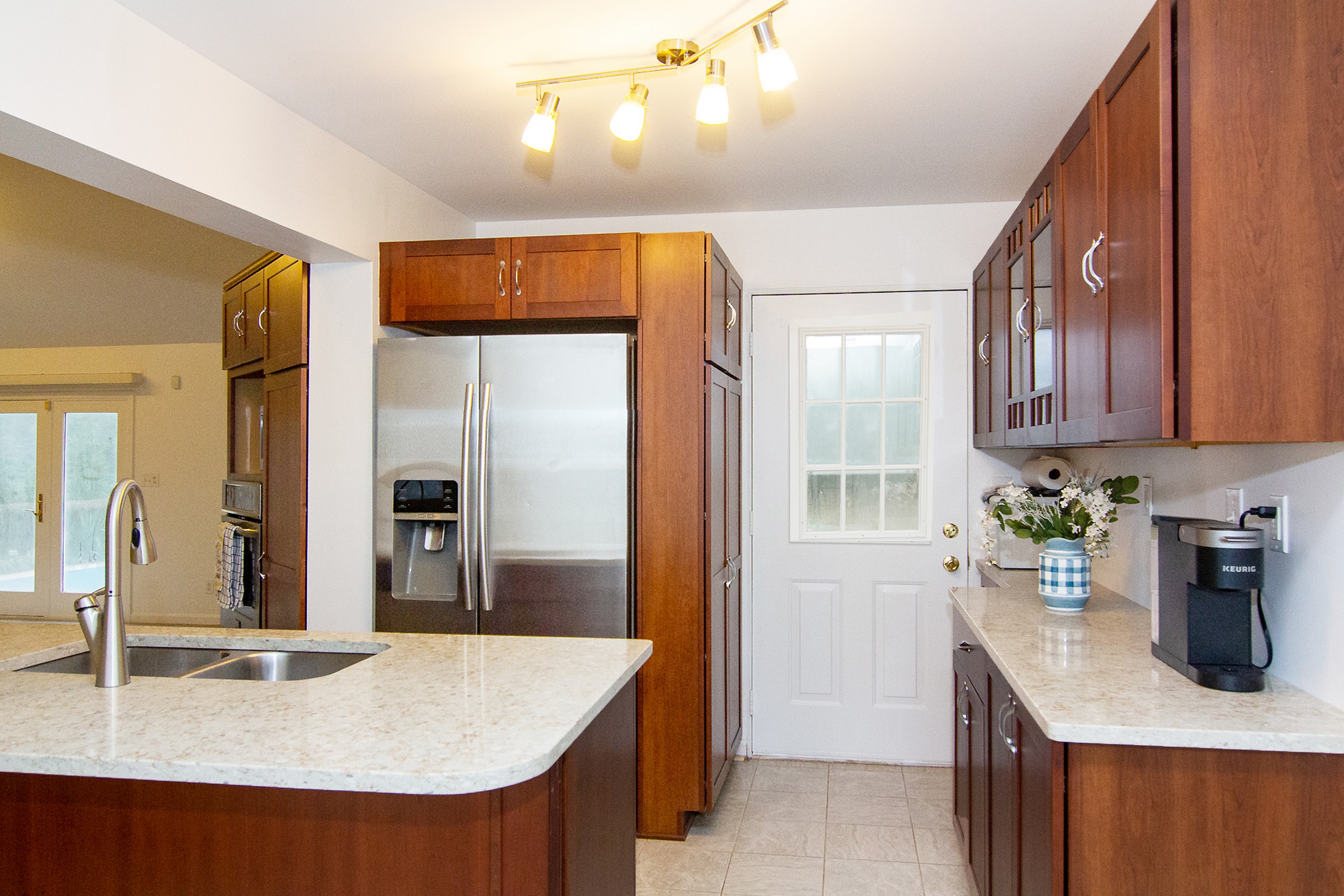 Embraced by approximately one acre with one of the best views in Carroll County, this truly unique home offers character and an abundance of serenity. Designed with an open and airy layout, the home features three spacious bedrooms—each with its own private bath—thoughtfully positioned for privacy on separate spaces of the home. Let's emphasize 3 FULL baths plus one half bath! Super sized gathering area in the heart of the home is the expansive open kitchen with large "island type" counter, beautiful cabinetry stretching from wall to wall, quartz/silestone countertop, stainless steel appliances & disposal. This is a fun kitchen that flows seamlessly into the family room and dining area, creating an ideal space for entertaining family and friends. Atruim door leads from the Familyroom to the rear yard, where an in-ground pool awaits for some fun in the sun. (Pool offers newer pool pump). Also FIRST FLOOR living with one of the large bedroom suites with full bath plus laundry room adjacent as well as outside entry to rear yard.