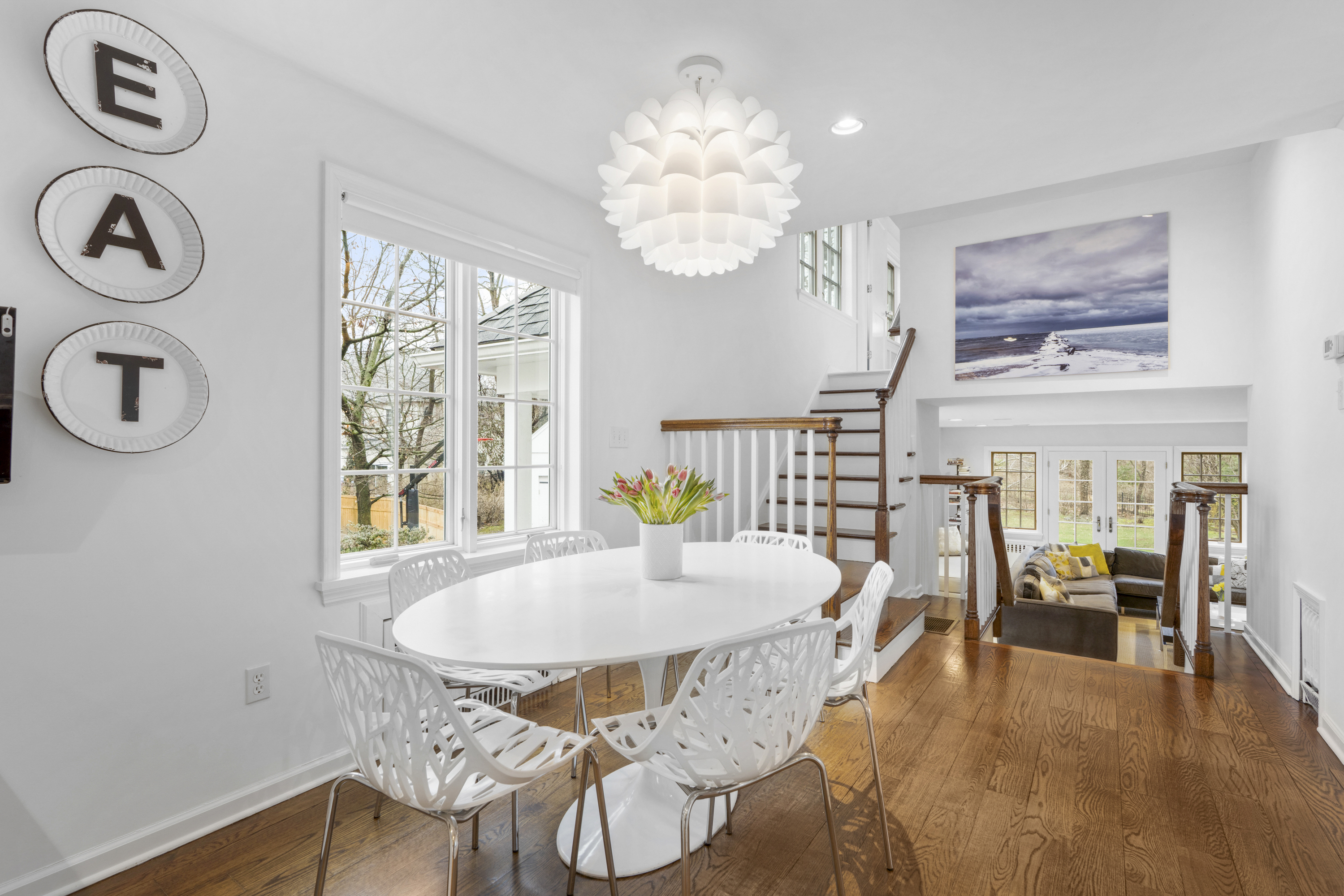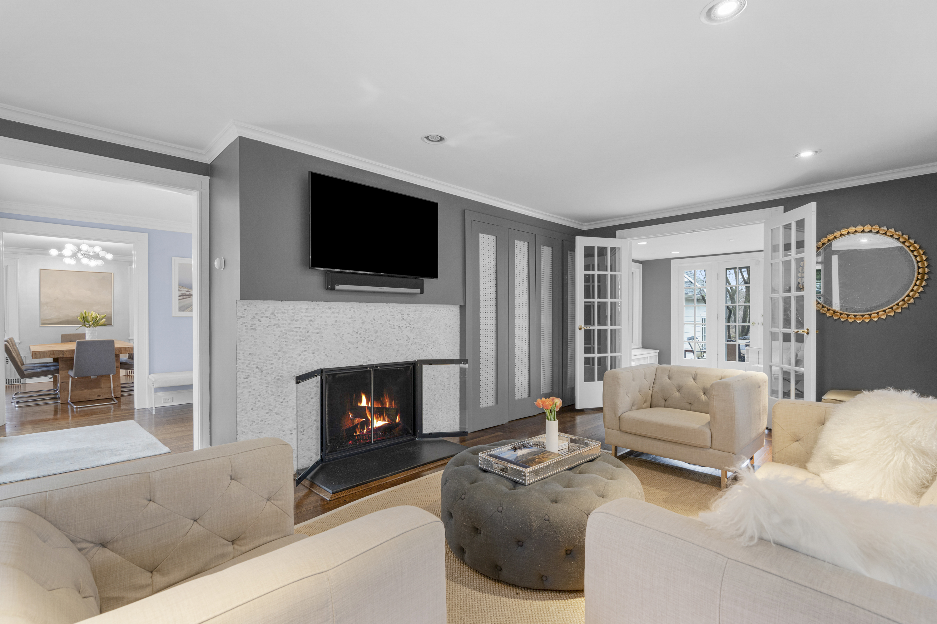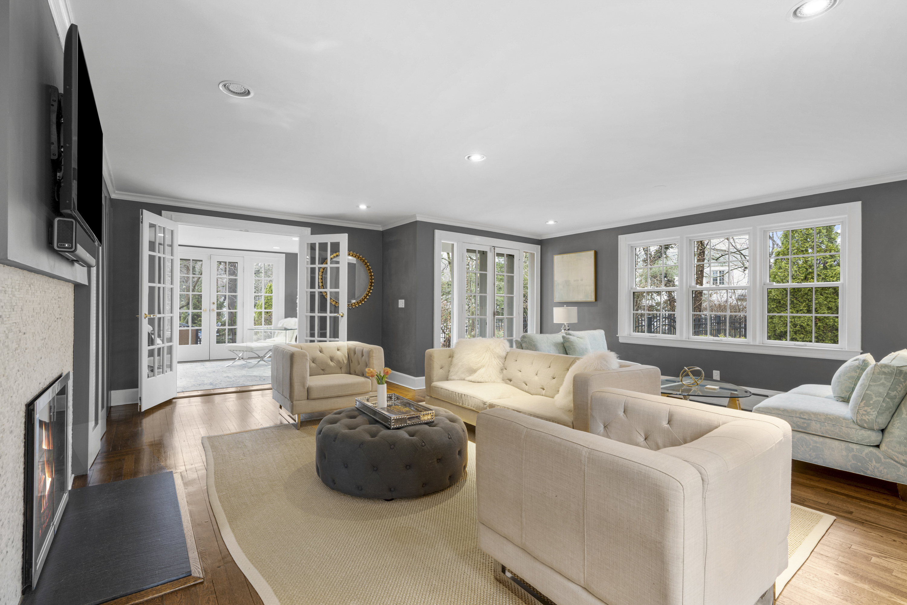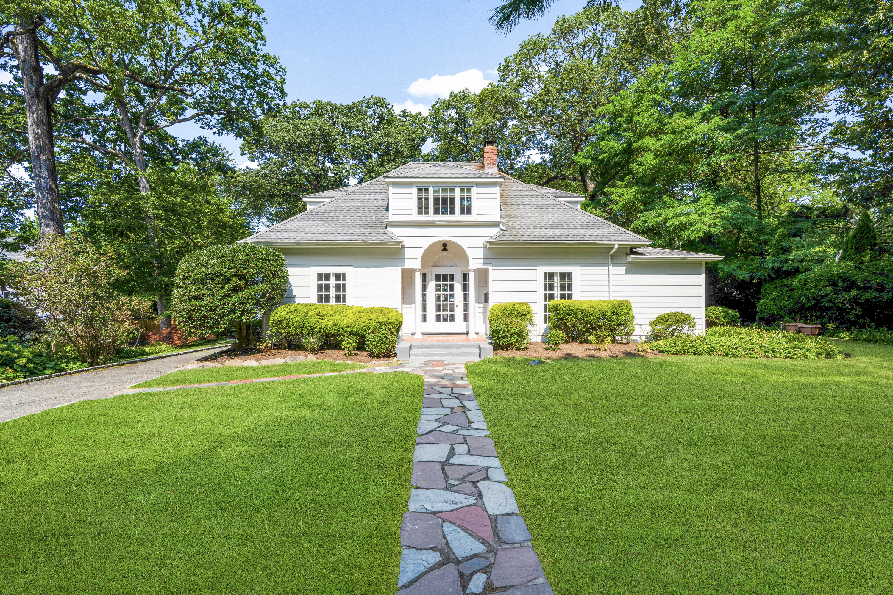 Fantastic Colonial set back from Forest Avenue in a highly convenient location near Larchmont village and the train. This Larchmont Woods property offers a wonderful layout with great natural light throughout. A large living room with gas fireplace opens to a bright sunroom with walls of windows, which can be used as a home office or sitting room. The formal dining room connects to the updated eat-in kitchen with a large pantry. Just off the kitchen is an oversized family room with views of the park-like backyard and a wood-burning stove, creating a warm and inviting gathering space. A first-floor bedroom with adjacent half bath, currently used as an office, completes the main level. Above the family room is a spacious ensuite bedroom with cathedral ceilings. The second level features a generous primary bedroom with two walk-in closets and a newly renovated ensuite bath with separate shower and soaking tub, along with two additional bedrooms and an updated hall bath. The basement offers laundry and excellent storage with direct access to the driveway. An oversized two-car garage includes stairs to a great finished storage space with endless possibilities.
