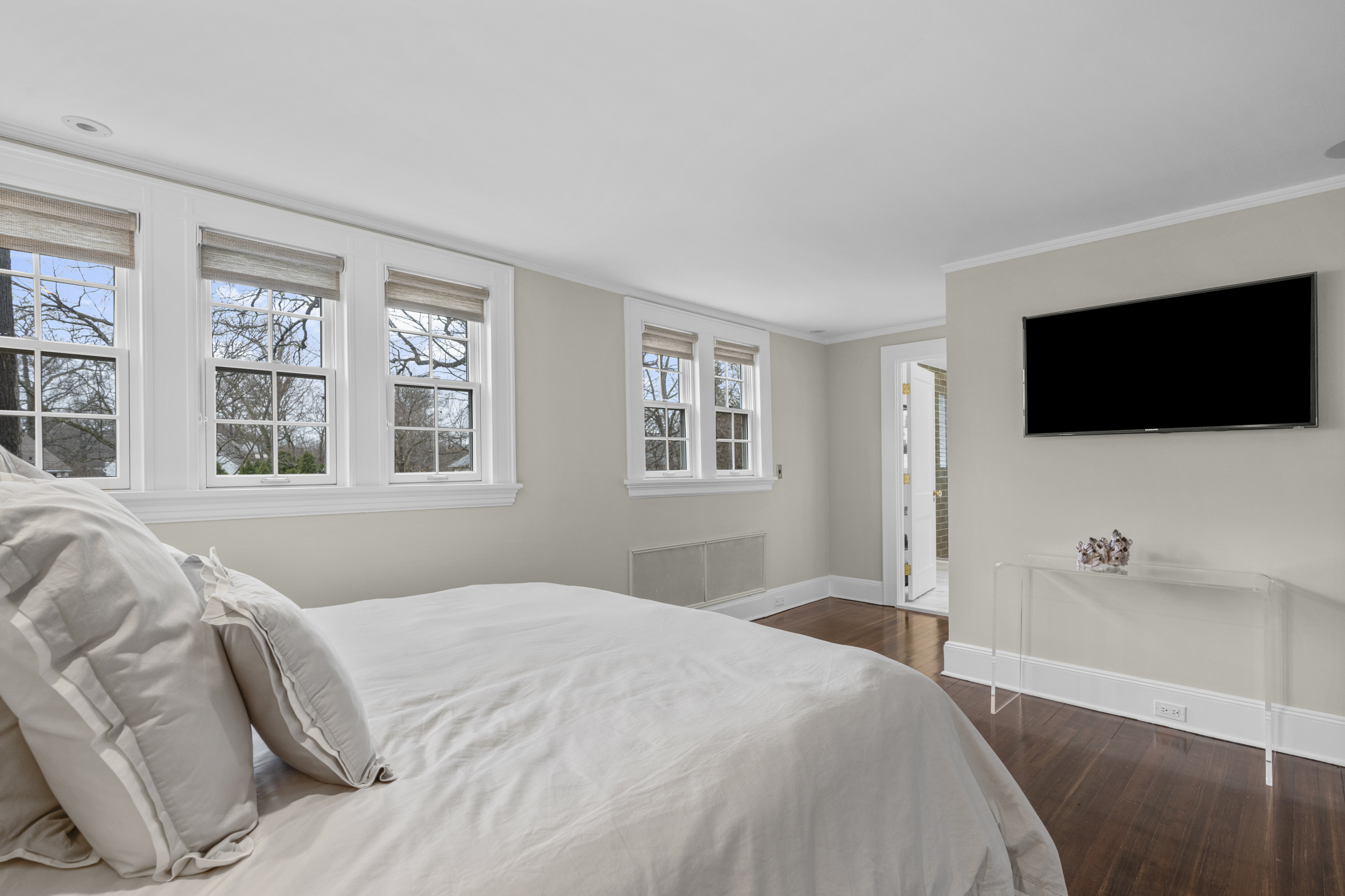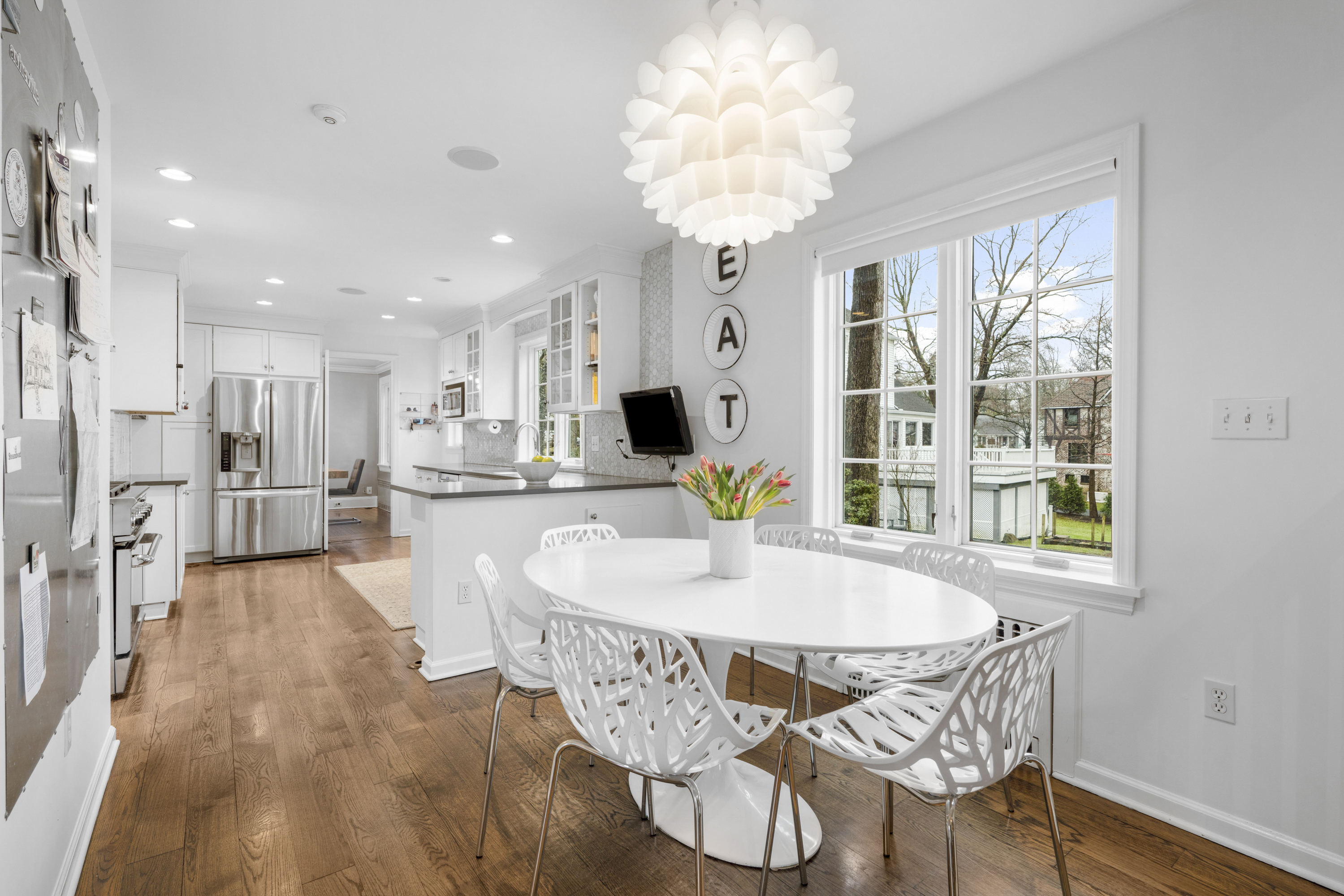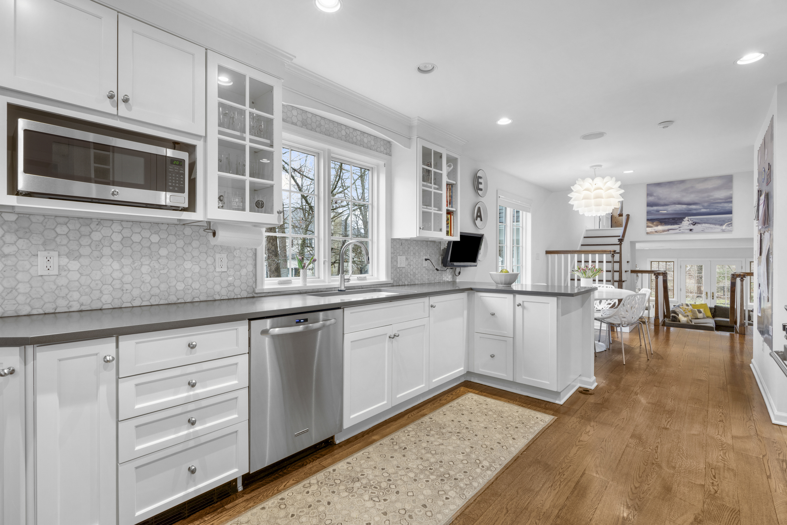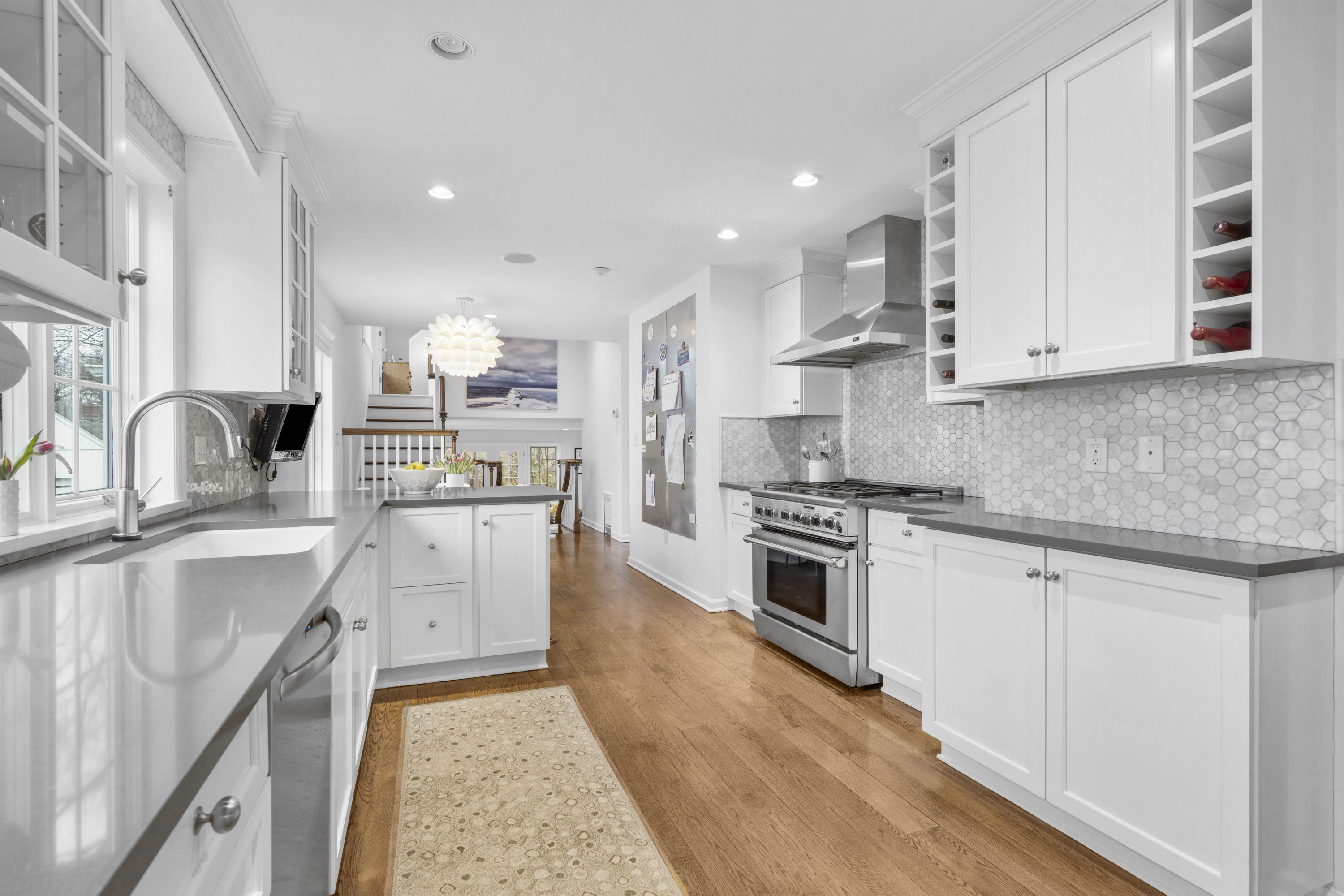 Fantastic Colonial set back from Forest Avenue in a highly convenient location near Larchmont village and the train. This Larchmont Woods property offers a wonderful layout with great natural light throughout. A large living room with gas fireplace opens to a bright sunroom with walls of windows, which can be used as a home office or sitting room. The formal dining room connects to the updated eat-in kitchen with a large pantry. Just off the kitchen is an oversized family room with views of the park-like backyard and a wood-burning stove, creating a warm and inviting gathering space. A first-floor bedroom with adjacent half bath, currently used as an office, completes the main level. Above the family room is a spacious ensuite bedroom with cathedral ceilings. The second level features a generous primary bedroom with two walk-in closets and a newly renovated ensuite bath with separate shower and soaking tub, along with two additional bedrooms and an updated hall bath. The basement offers laundry and excellent storage with direct access to the driveway. An oversized two-car garage includes stairs to a great finished storage space with endless possibilities.