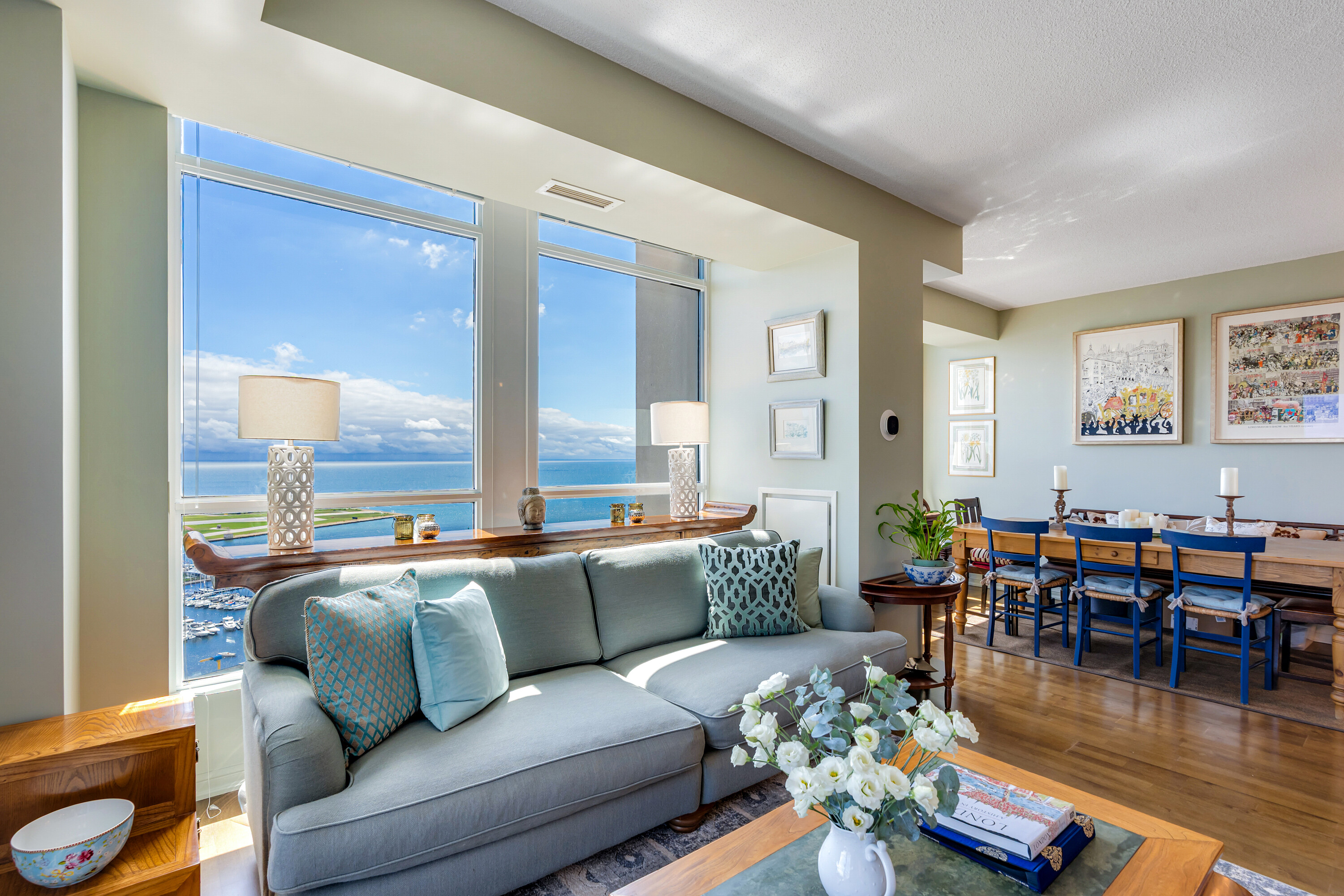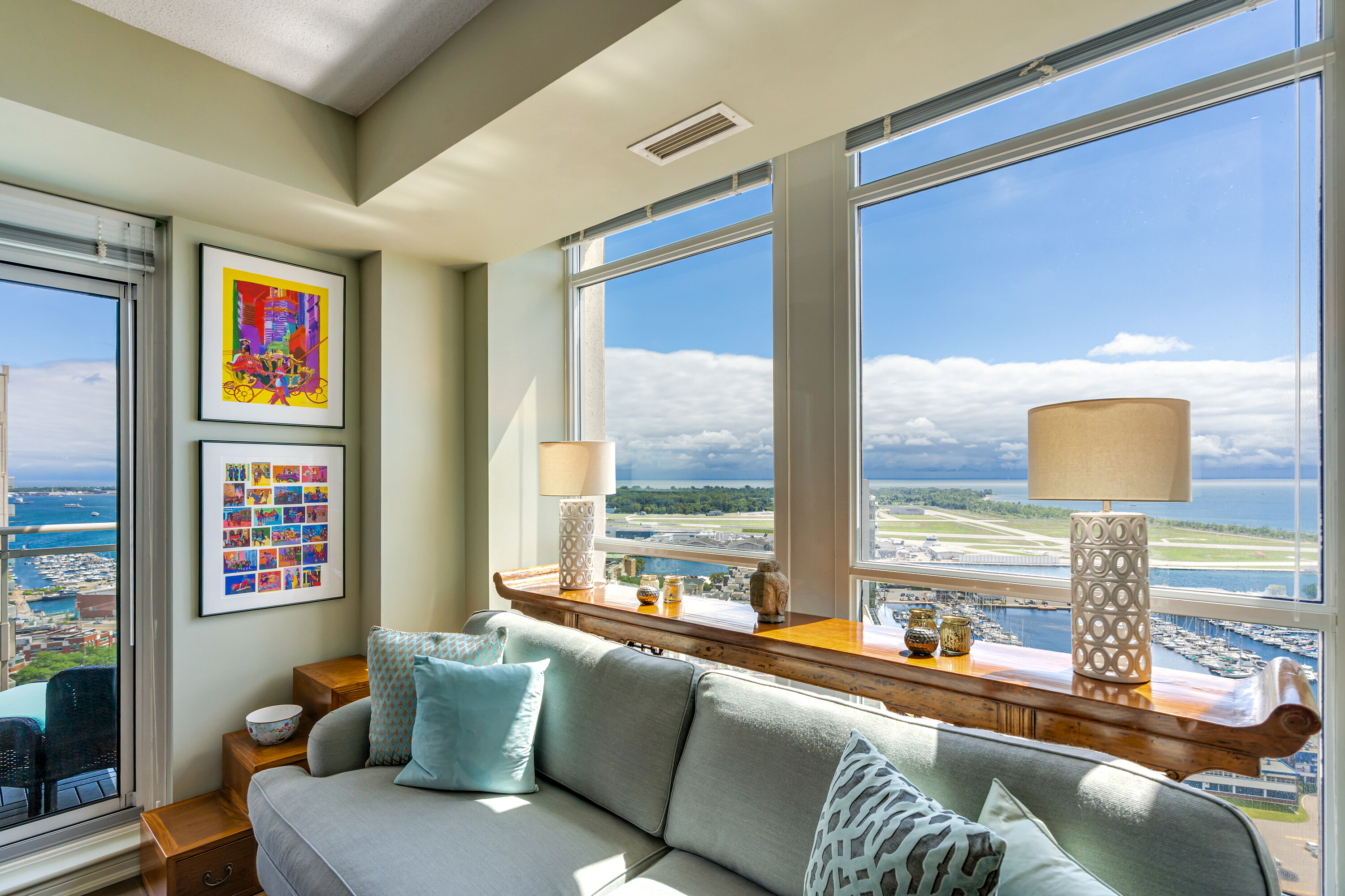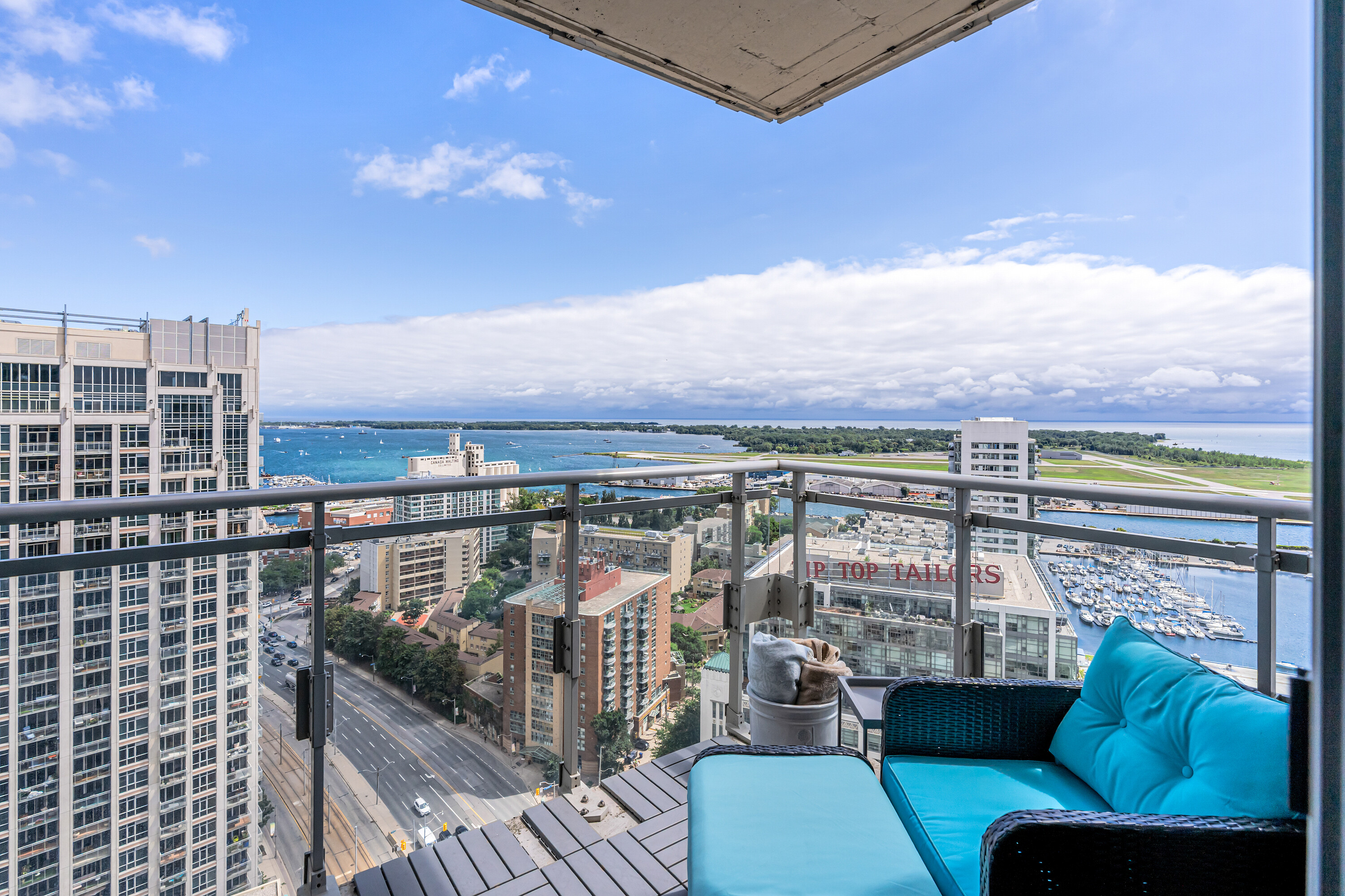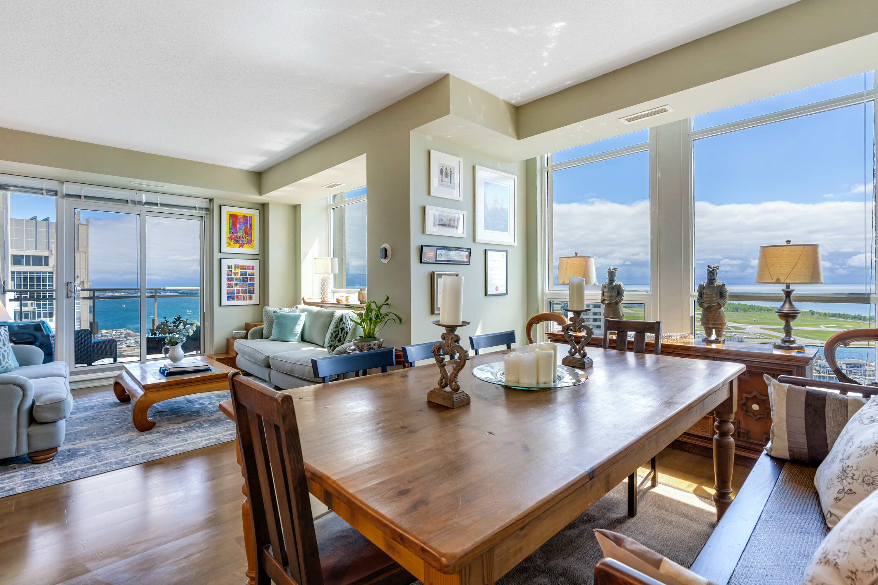 Looking for a large, almost 1400 square feet condo in Downtown Toronto with parking and locker? This is the one you want. A beautifully spacious 2 bedroom + den, two bathrooms, two balconies (110 square feet total), South East corner unit with stunning uninterrupted panoramic views of Lake Ontario, Toronto Islands, Coronation Park and the CN Tower. Designed by Quadrangle Architects, this building offers high-end living in the popular waterfront district. The site is part of the revitalization of the historic Fort York area, offering a great mix of urban energy and waterfront proximity. Engineered hardwood floors, floor-ceiling windows, 9 feet ceilings, granite countertops, marble bathroom vanity and floor tiles, upgraded air conditioning / Eco bee thermostats, and quality Farrow and Ball paint in 2024 all make this a well-maintained and luxurious home. The primary bedroom includes a generous walk-in closet and 4 piece ensuite bathroom. The second bedroom is adjacent to the second bathroom for your guests' convenience. If you need to use the den as a home office, or as an additional guest room, the French doors will give you privacy. Every single room has windows and natural light, and two South exposure balconies complete the picture. The Harbour Club, located on the 11th floor is for the exclusive use of residents and their guests and features an indoor pool with 12 feet high floor-to-ceiling windows offering panoramic views, a whirlpool hot tub, wrap-around promenade deck and terrace with loungers, barbecue area, cardio room, weight training room, yoga room, theatre room and party room. Guest suites and a library are on the 2nd floor and a landscaped courtyard garden is available for residents' use. With ample visitor parking and fob-controlled, secure bike lockers on the ground level, this building has it all!