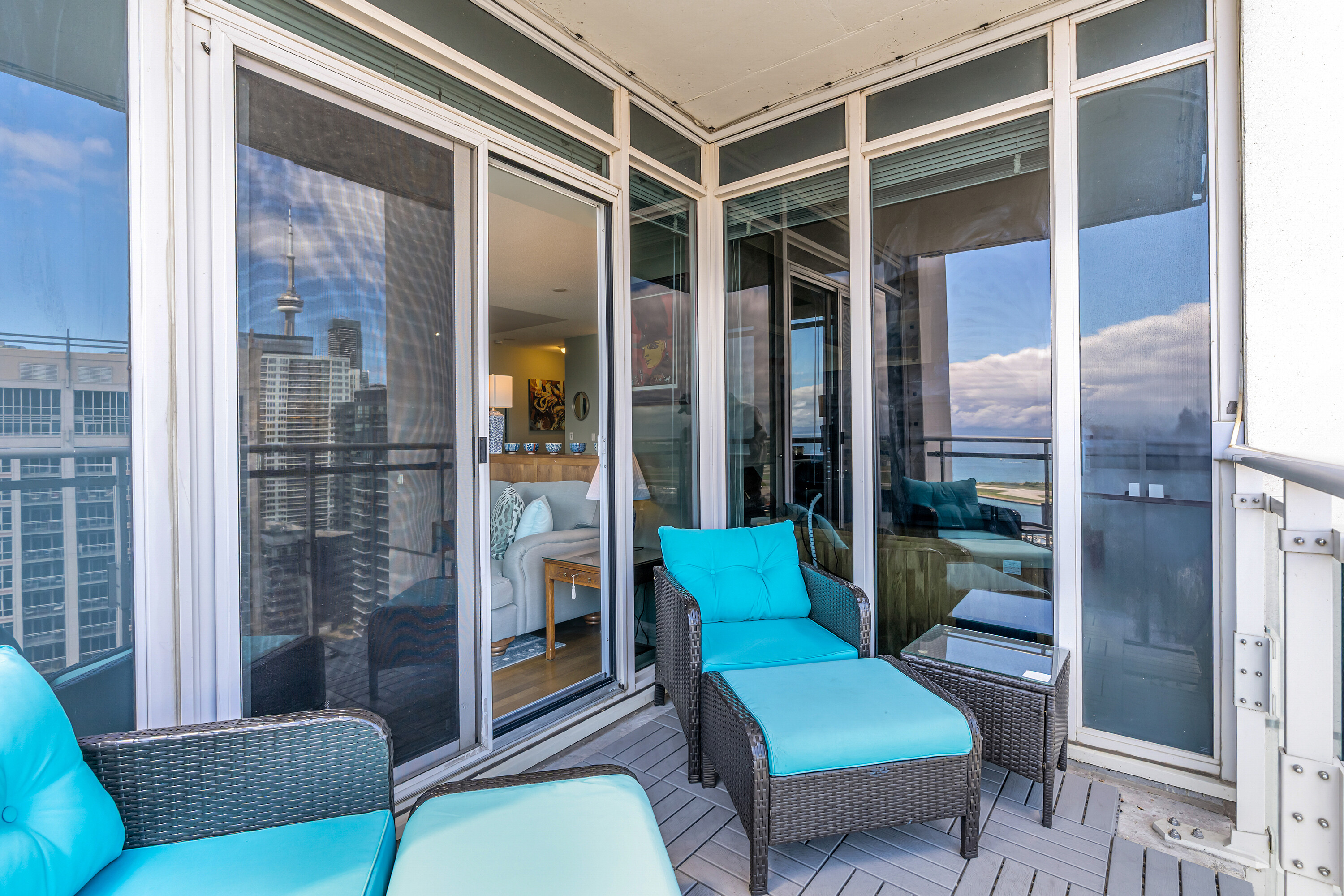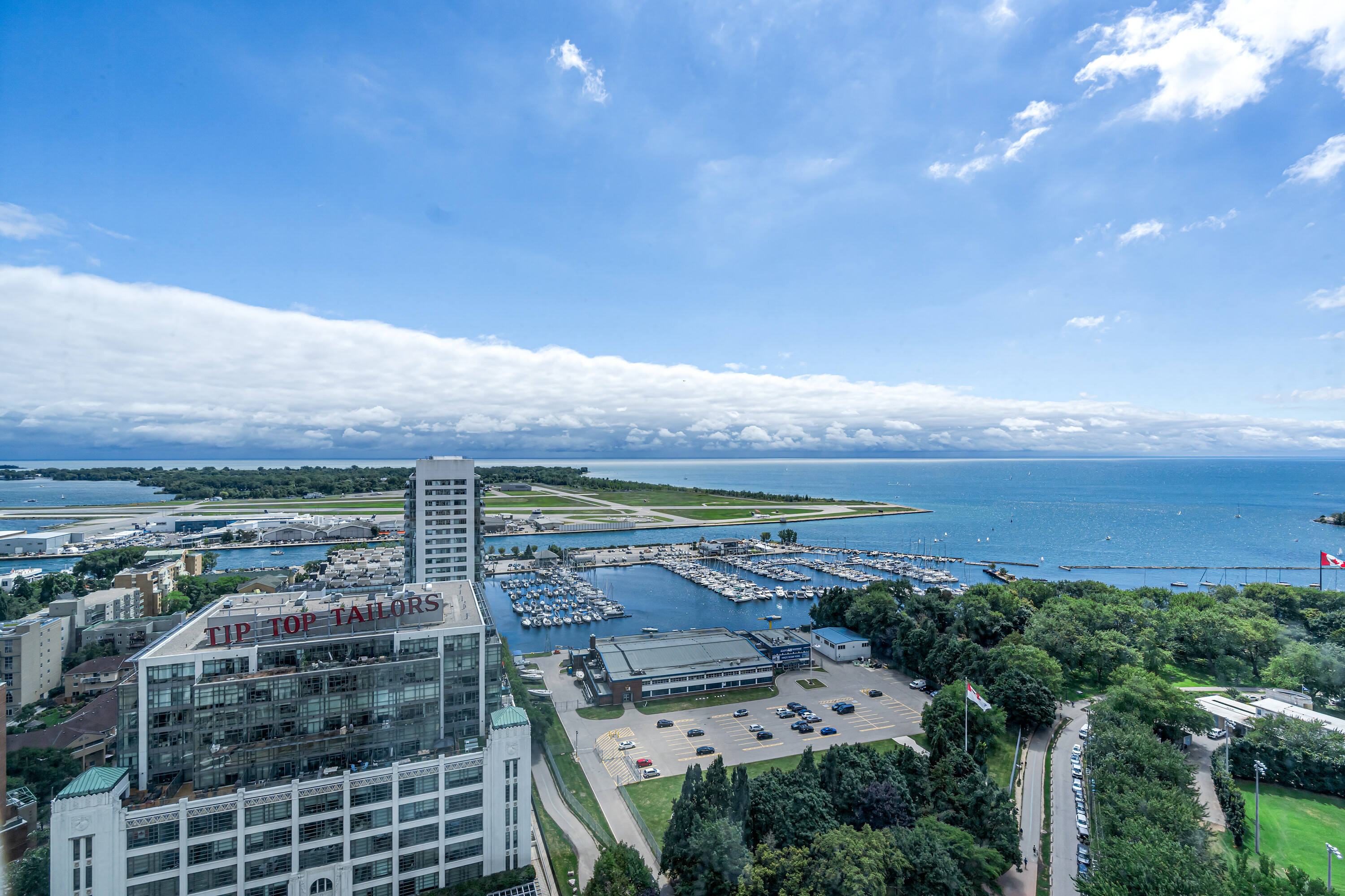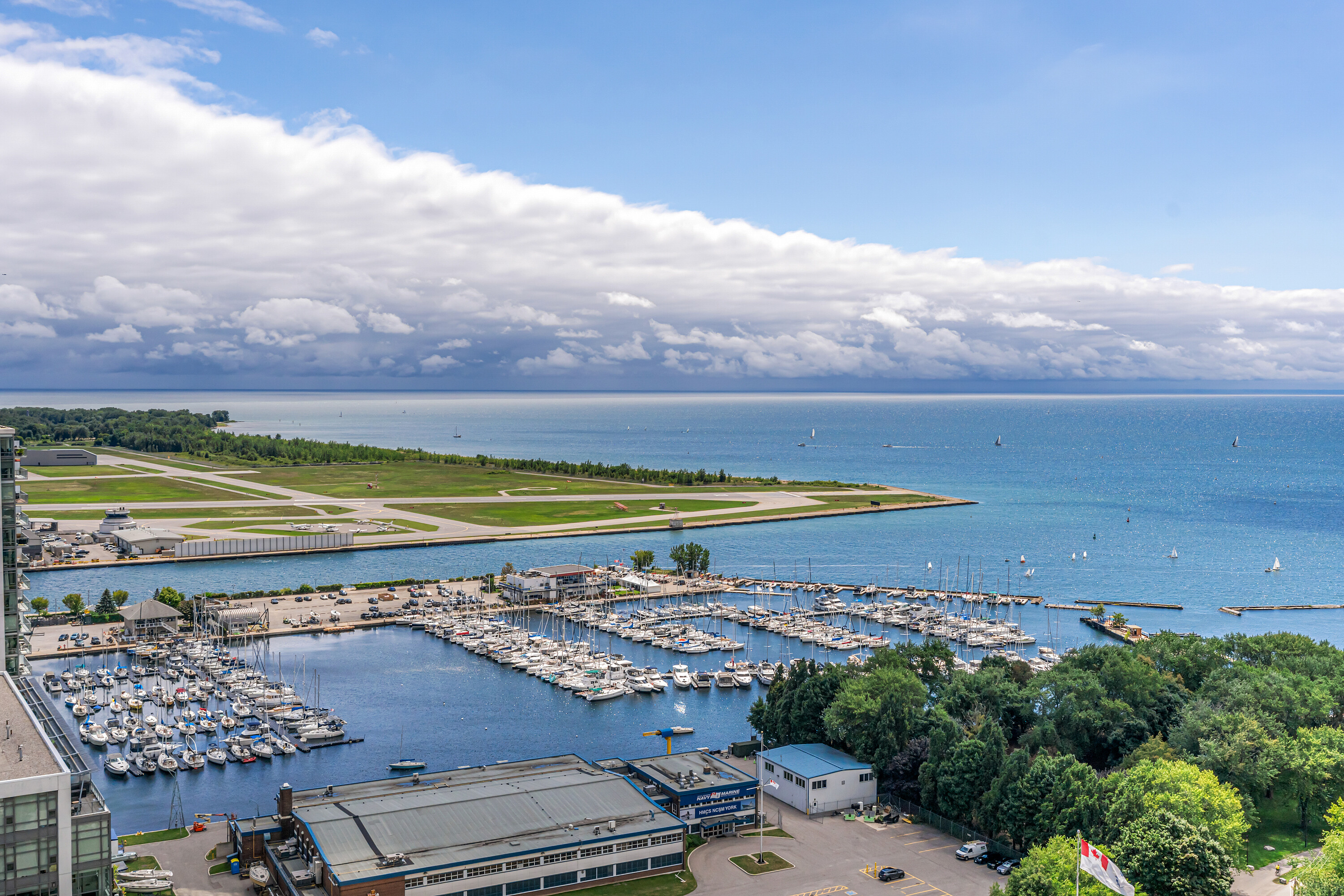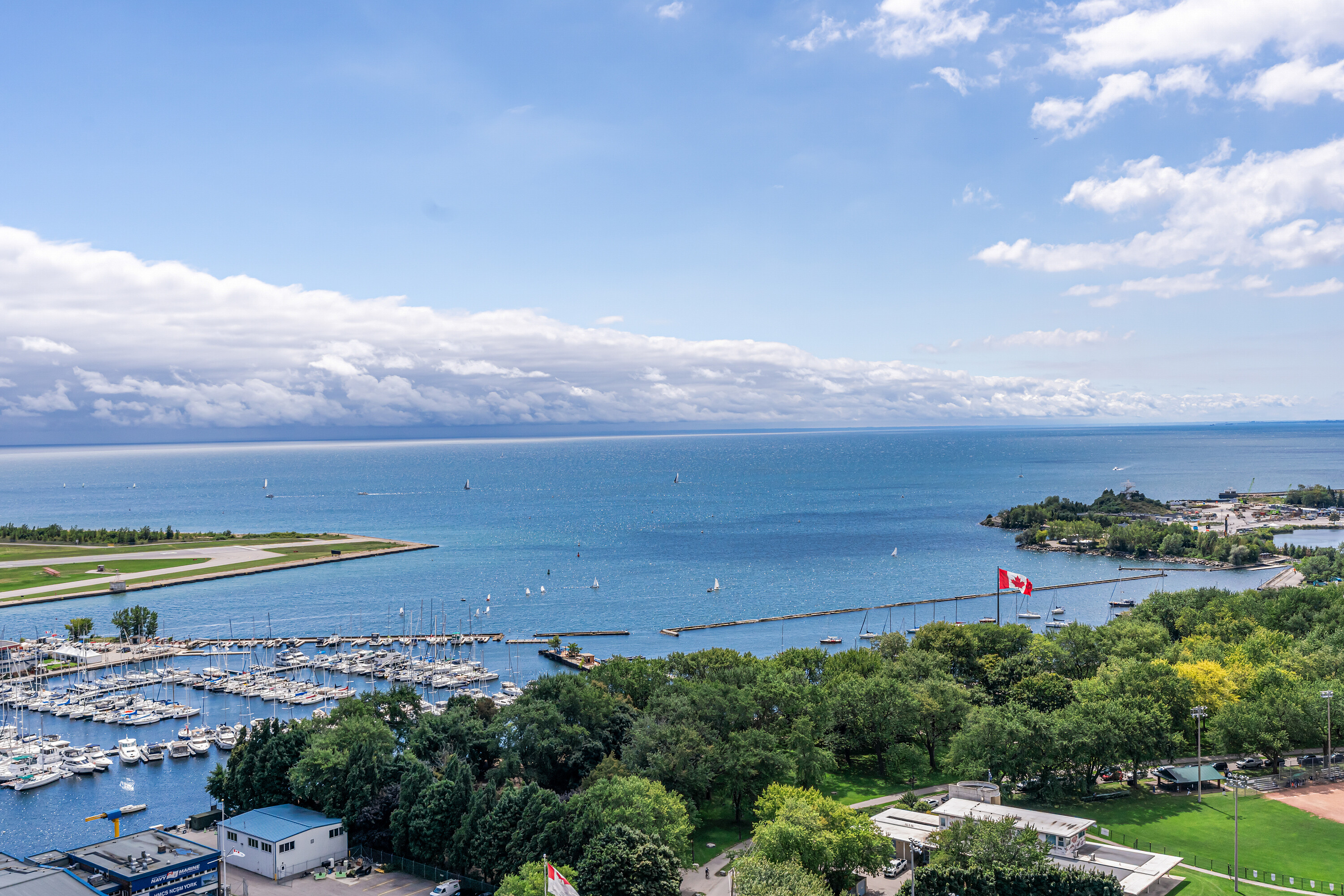 Looking for a large, almost 1400 square feet condo in Downtown Toronto with parking and locker? This is the one you want. A beautifully spacious 2 bedroom + den, two bathrooms, two balconies (110 square feet total), South East corner unit with stunning uninterrupted panoramic views of Lake Ontario, Toronto Islands, Coronation Park and the CN Tower. Designed by Quadrangle Architects, this building offers high-end living in the popular waterfront district. The site is part of the revitalization of the historic Fort York area, offering a great mix of urban energy and waterfront proximity. Engineered hardwood floors, floor-ceiling windows, 9 feet ceilings, granite countertops, marble bathroom vanity and floor tiles, upgraded air conditioning / Eco bee thermostats, and quality Farrow and Ball paint in 2024 all make this a well-maintained and luxurious home. The primary bedroom includes a generous walk-in closet and 4 piece ensuite bathroom. The second bedroom is adjacent to the second bathroom for your guests' convenience. If you need to use the den as a home office, or as an additional guest room, the French doors will give you privacy. Every single room has windows and natural light, and two South exposure balconies complete the picture. The Harbour Club, located on the 11th floor is for the exclusive use of residents and their guests and features an indoor pool with 12 feet high floor-to-ceiling windows offering panoramic views, a whirlpool hot tub, wrap-around promenade deck and terrace with loungers, barbecue area, cardio room, weight training room, yoga room, theatre room and party room. Guest suites and a library are on the 2nd floor and a landscaped courtyard garden is available for residents' use. With ample visitor parking and fob-controlled, secure bike lockers on the ground level, this building has it all!