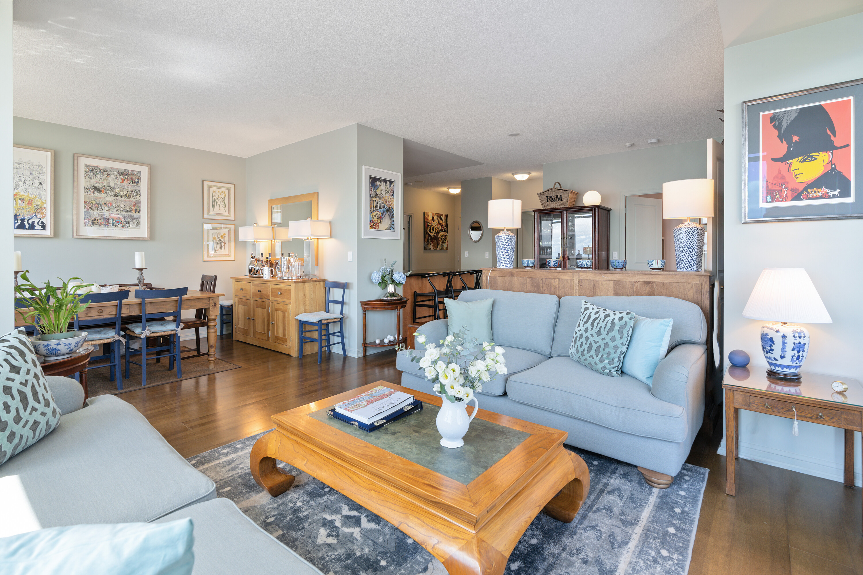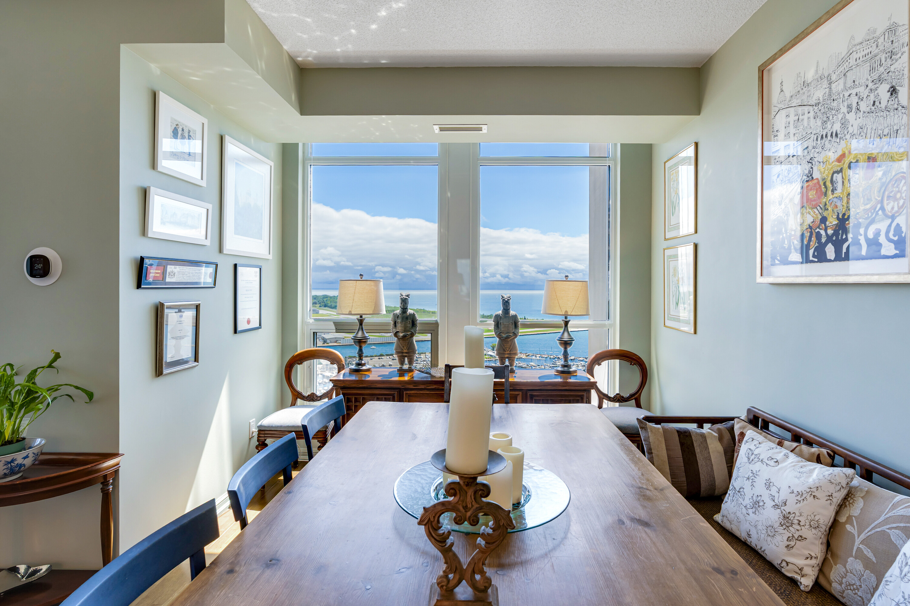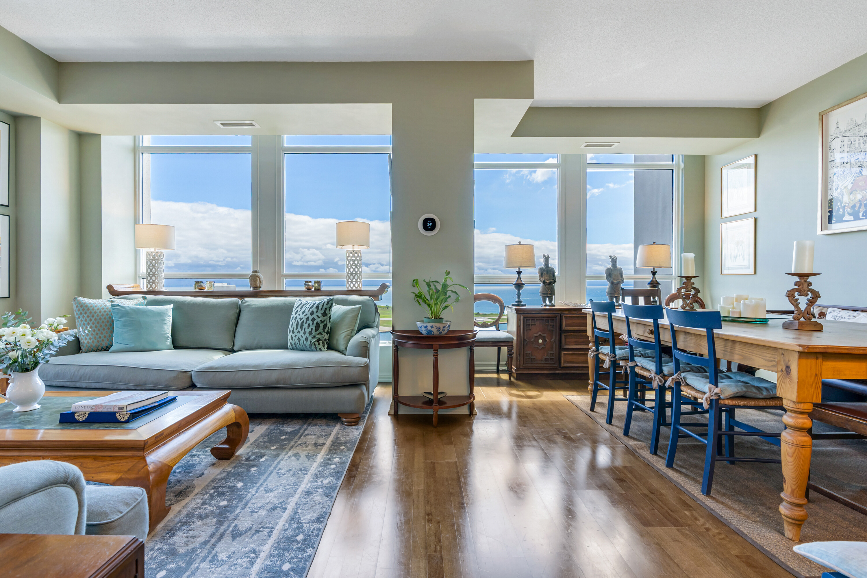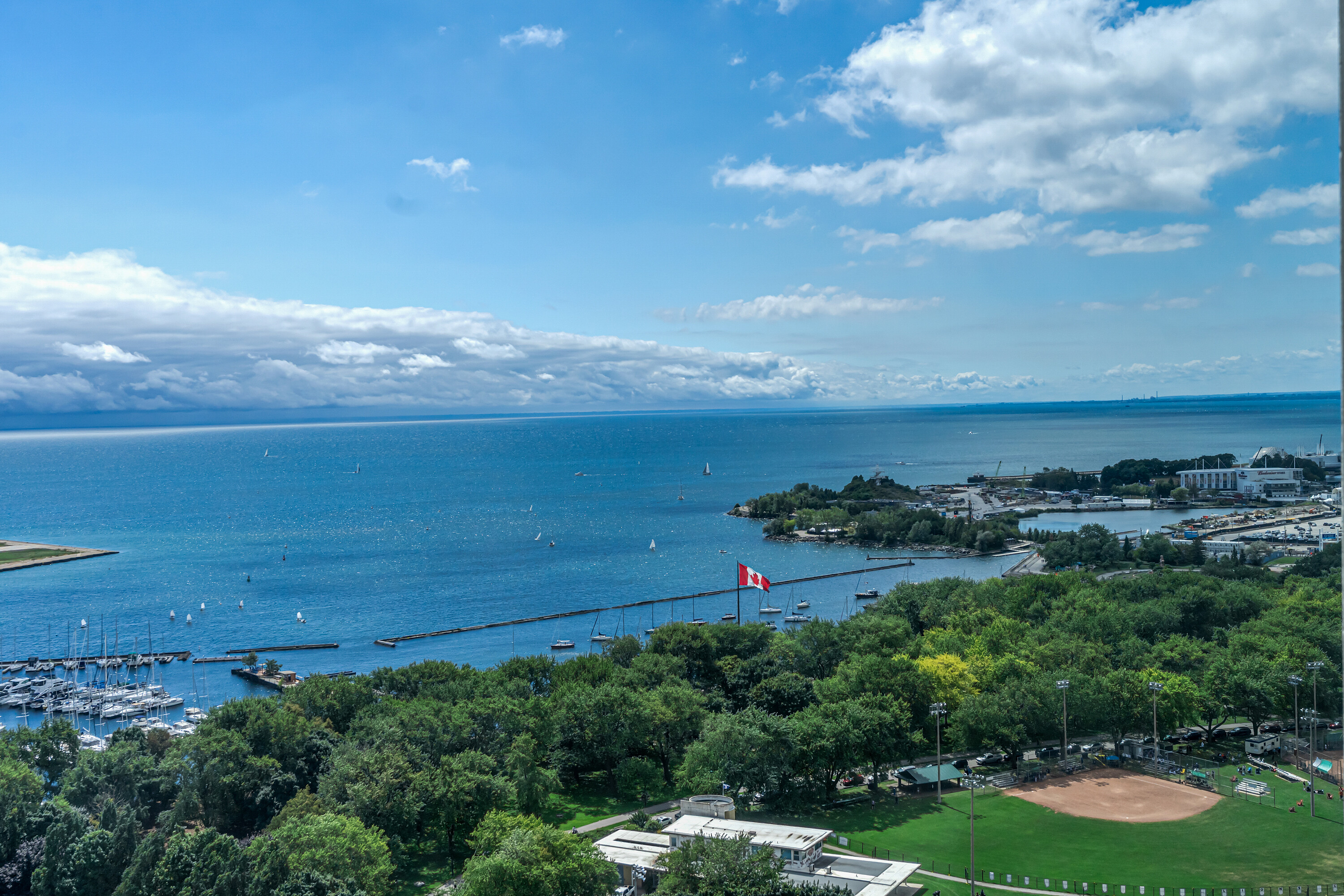 Looking for a large, almost 1400 square feet condo in Downtown Toronto with parking and locker? This is the one you want. A beautifully spacious 2 bedroom + den, two bathrooms, two balconies (110 square feet total), South East corner unit with stunning uninterrupted panoramic views of Lake Ontario, Toronto Islands, Coronation Park and the CN Tower. Designed by Quadrangle Architects, this building offers high-end living in the popular waterfront district. The site is part of the revitalization of the historic Fort York area, offering a great mix of urban energy and waterfront proximity. Engineered hardwood floors, floor-ceiling windows, 9 feet ceilings, granite countertops, marble bathroom vanity and floor tiles, upgraded air conditioning / Eco bee thermostats, and quality Farrow and Ball paint in 2024 all make this a well-maintained and luxurious home. The primary bedroom includes a generous walk-in closet and 4 piece ensuite bathroom. The second bedroom is adjacent to the second bathroom for your guests' convenience. If you need to use the den as a home office, or as an additional guest room, the French doors will give you privacy. Every single room has windows and natural light, and two South exposure balconies complete the picture. The Harbour Club, located on the 11th floor is for the exclusive use of residents and their guests and features an indoor pool with 12 feet high floor-to-ceiling windows offering panoramic views, a whirlpool hot tub, wrap-around promenade deck and terrace with loungers, barbecue area, cardio room, weight training room, yoga room, theatre room and party room. Guest suites and a library are on the 2nd floor and a landscaped courtyard garden is available for residents' use. With ample visitor parking and fob-controlled, secure bike lockers on the ground level, this building has it all!