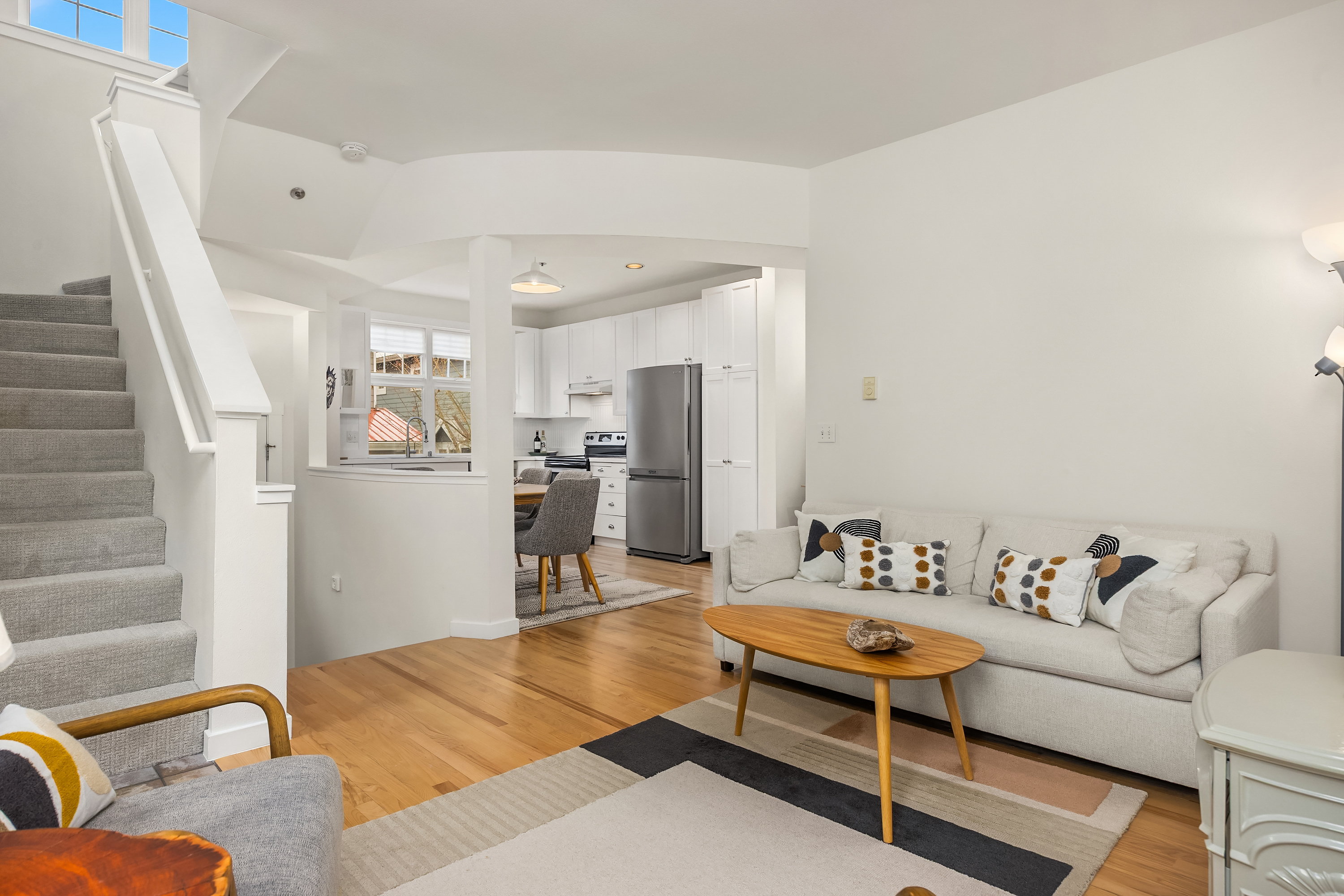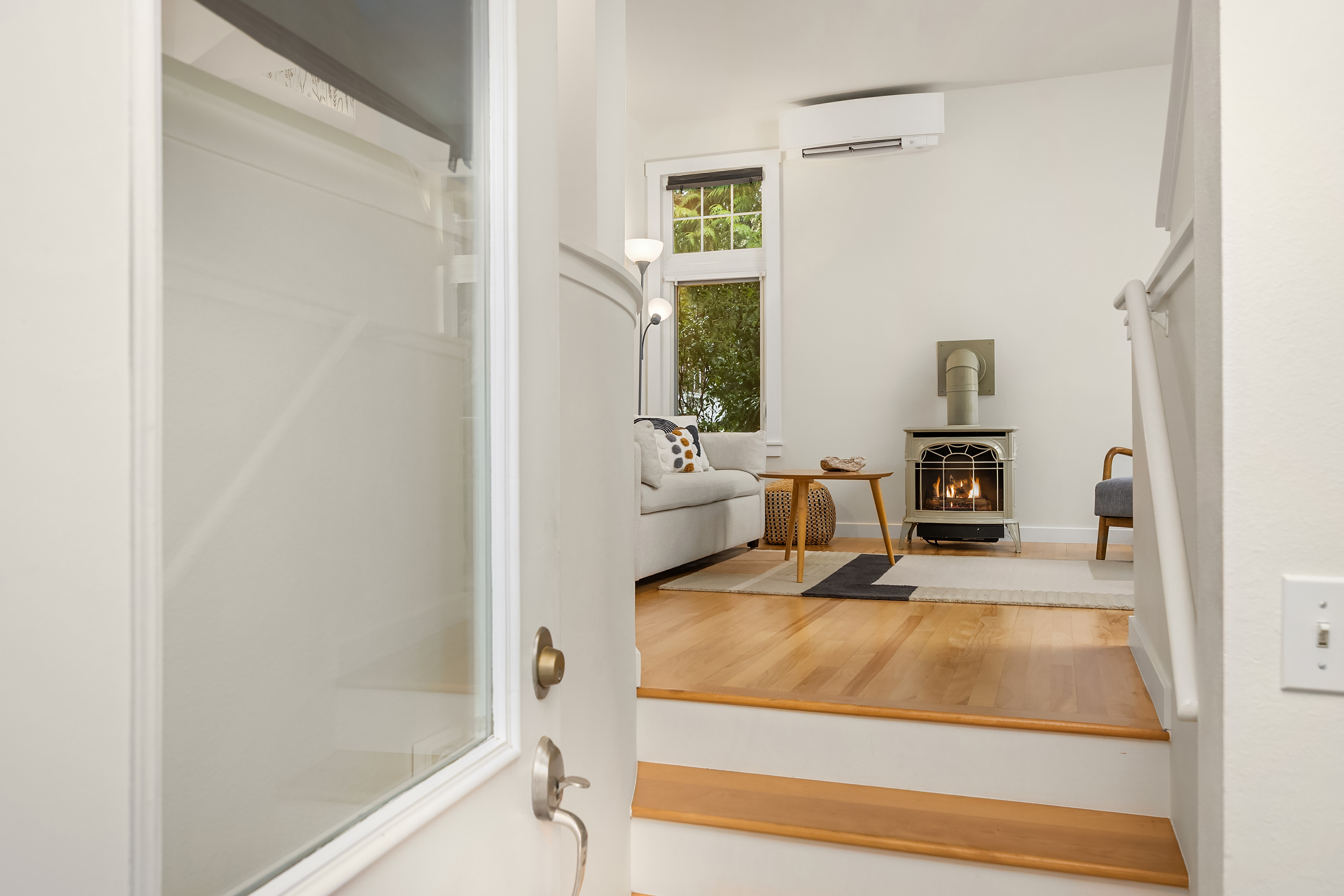 A delightful in-town retreat! This standalone cottage is tucked within a charming, small cottage community on the edge of downtown Winslow. The light-filled, open-concept main level features hardwood floors, 9' ceilings, a cozy propane fireplace and oversized windows. Step outside to a sunny, south-facing private deck—perfect for morning coffee, relaxing afternoons, or casual entertaining. Upstairs, vaulted ceilings enhance the airy feel of the home. Situated on a corner lot that backs to green space, the property enjoys a south-western orientation and added privacy. Recent updates include efficient mini-splits for heating and cooling, a washer and dryer, water heater, and a large kitchen sink. The home also includes an attached single-car garage with generous storage space. Ideally located near Winslow’s shops, restaurants, bakeries, theaters, parks, and the ferry, this home offers the perfect balance of peaceful living and in-town convenience. Low HOA dues of just $153/month make this charming cottage an exceptional opportunity.