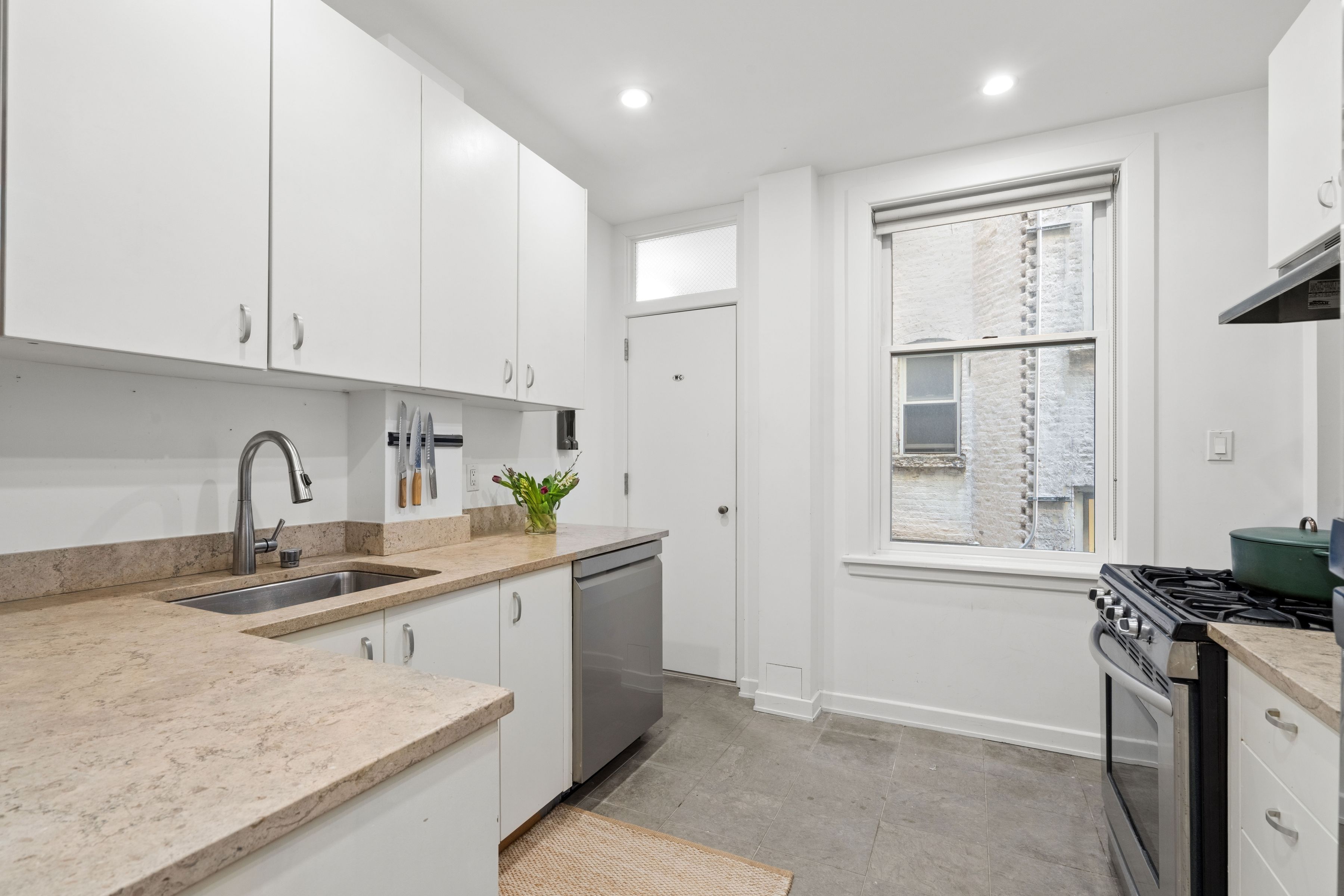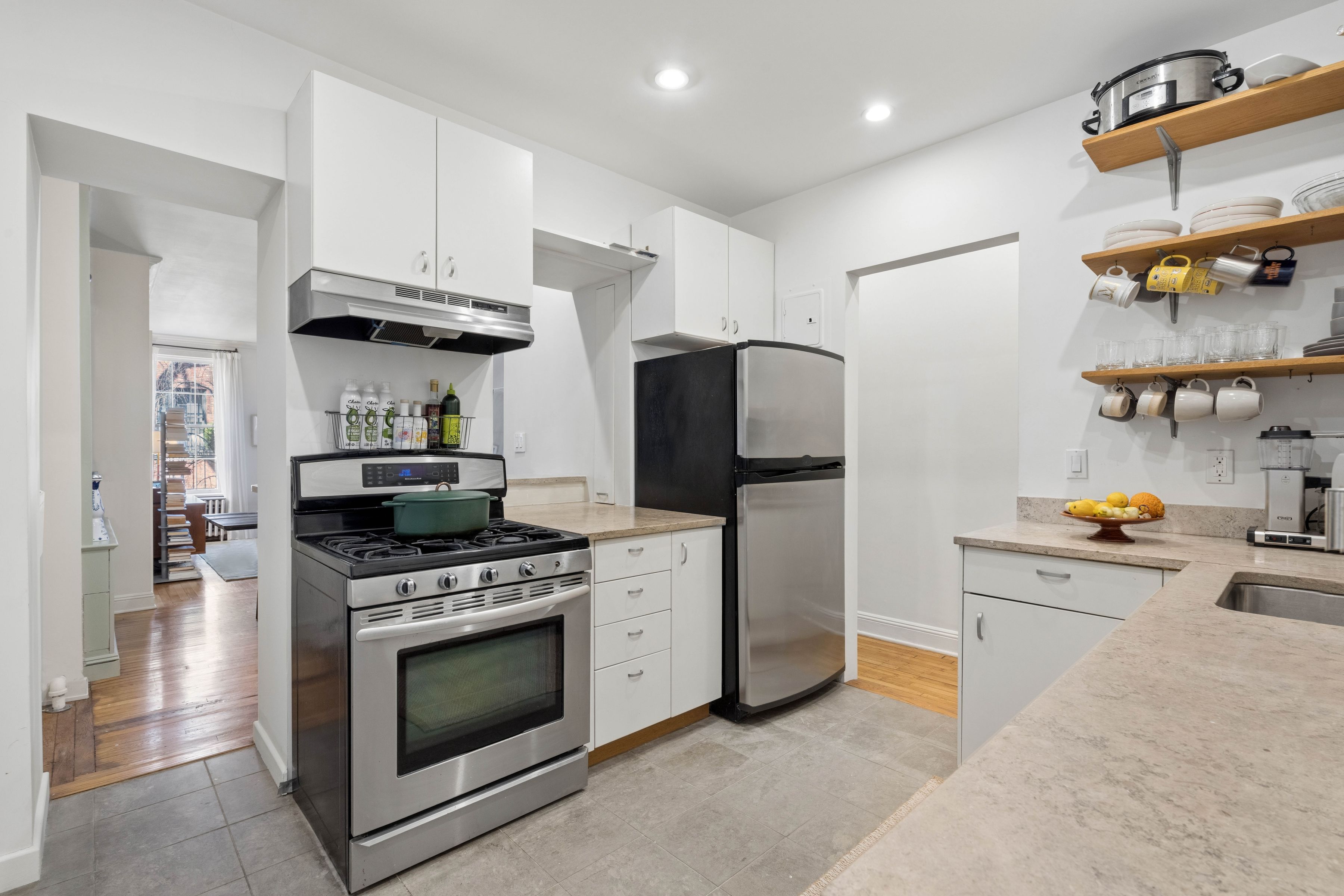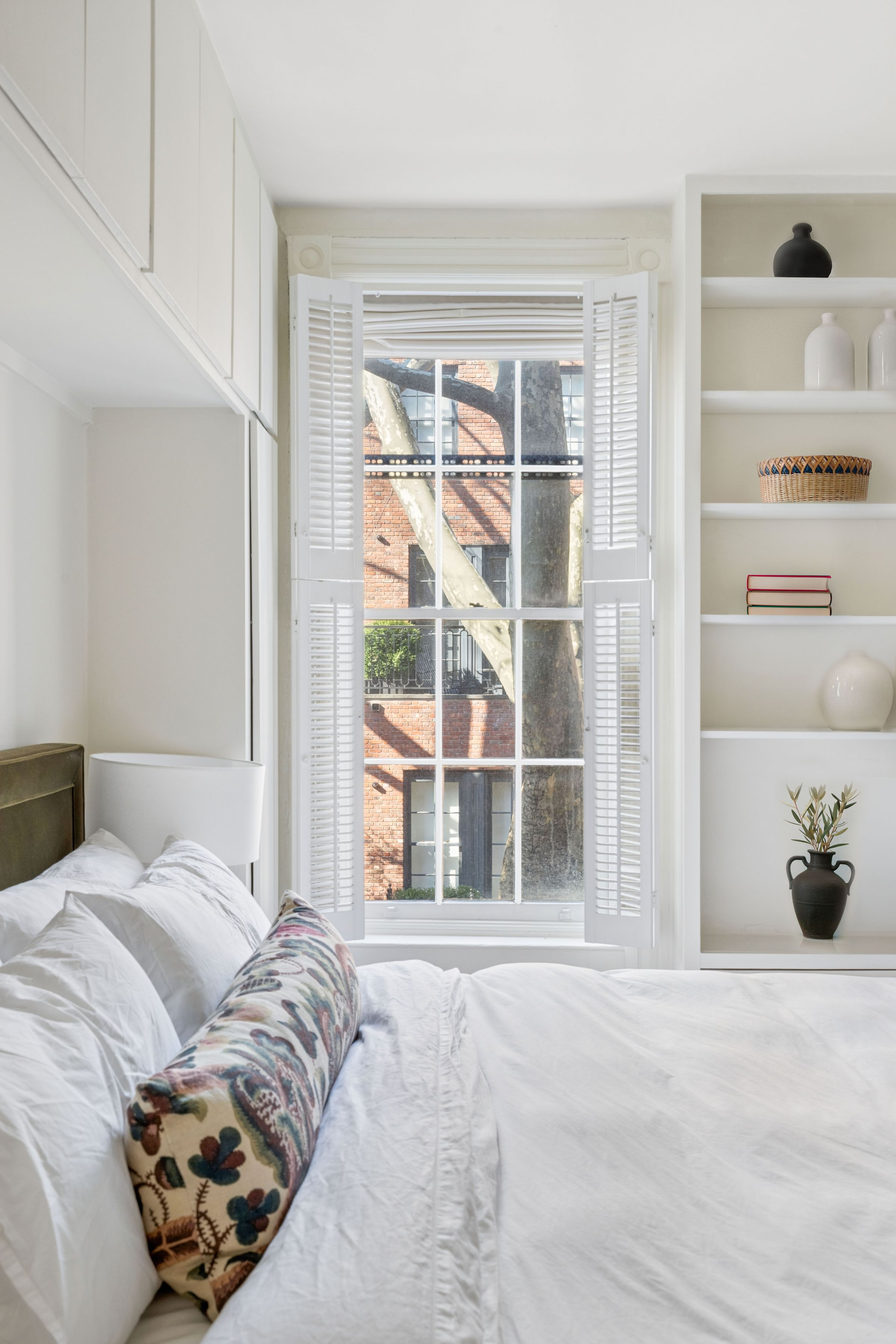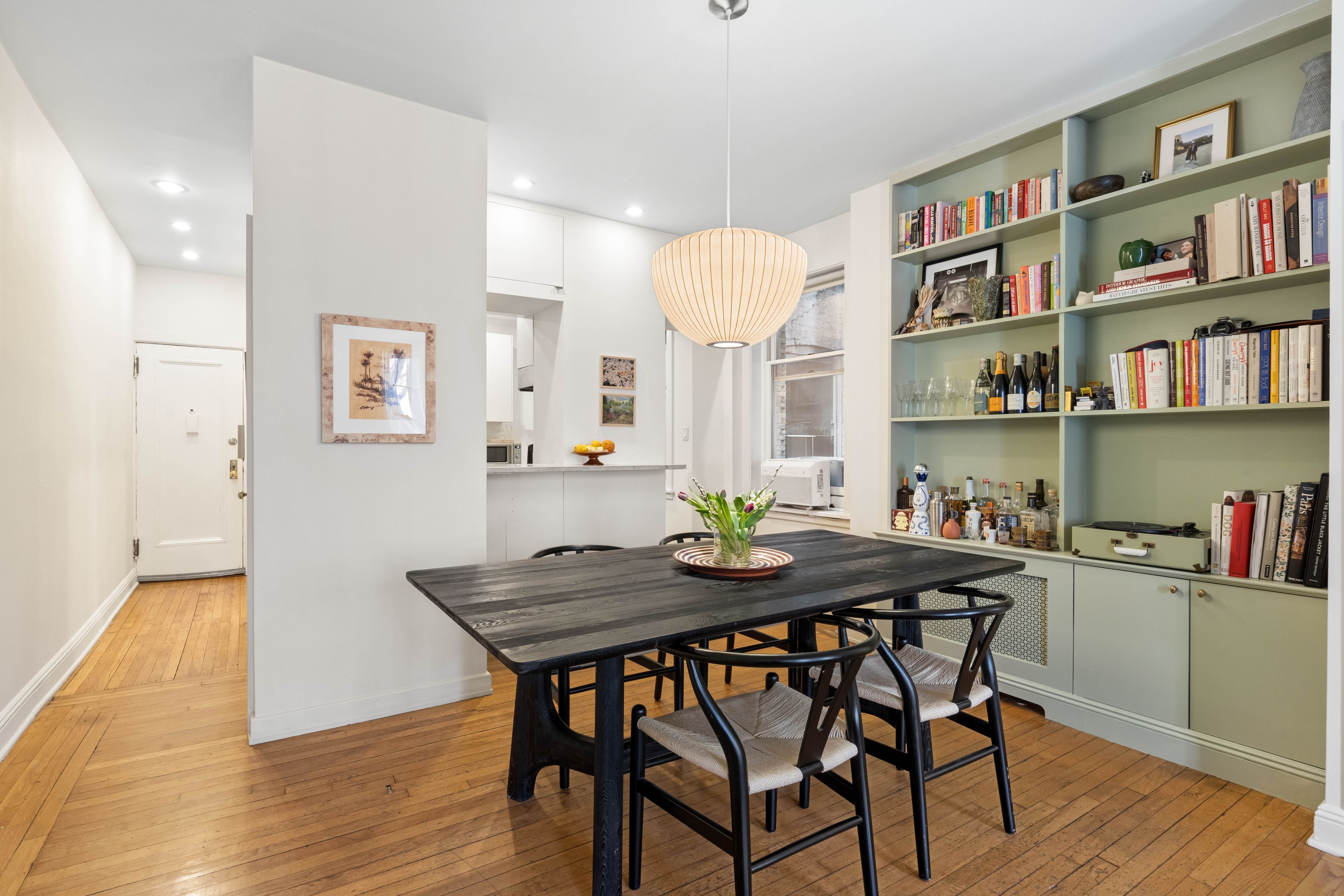 Situated on a tree-lined stretch of Perry Street between West 4th and Bleecker Streets, Apartment 2R is the quintessential West Village home. Just one flight up in a boutique landmarked co-op, this spacious one-bedroom (originally configured as two) overlooks charming townhouse gardens. Natural light fills the classic pre-war interior, highlighted by high ceilings, hardwood floors, sash windows, and floor-to-ceiling built-ins. An entry hall with coat closet opens to a bright, well-proportioned living and dining area ideal for entertaining or relaxing. The windowed dining area flows seamlessly into a thoughtfully designed kitchen with ample storage, travertine countertops, white cabinetry, stone-tiled floors, bar seating, and stainless steel appliances, including a dishwasher. A fully renovated, windowed bathroom with walk-in shower sits just off the kitchen. The large bedroom, with windows on opposite exposures, offers flexibility to convert back to a two-bedroom. Currently configured with a dressing area, the room features custom built-ins including above-bed cabinetry, bookshelves, and a deep closet. 79 Perry Street is a nine-unit, self-managed co-op that welcomes well-behaved pets and offers complimentary laundry. Co-purchasing is considered; subletting is not permitted. Enjoy the best of the West Village with its historic charm, picturesque streets, parks, markets, boutiques, and acclaimed restaurants just outside your door.
