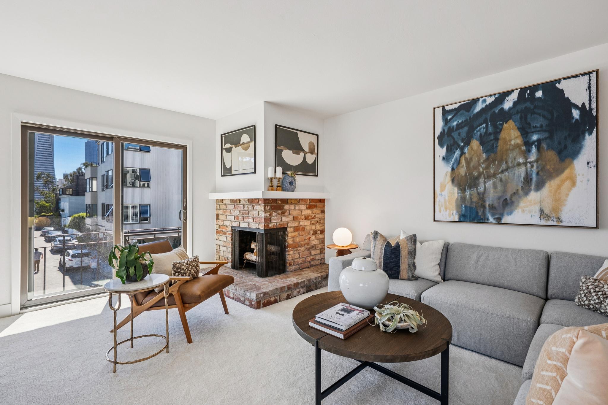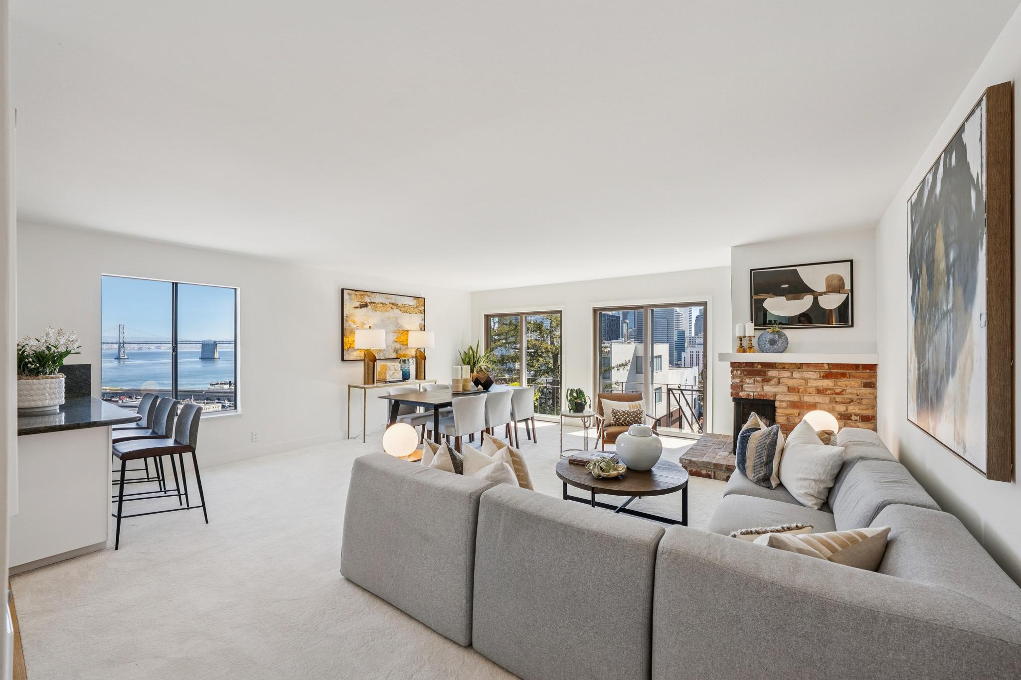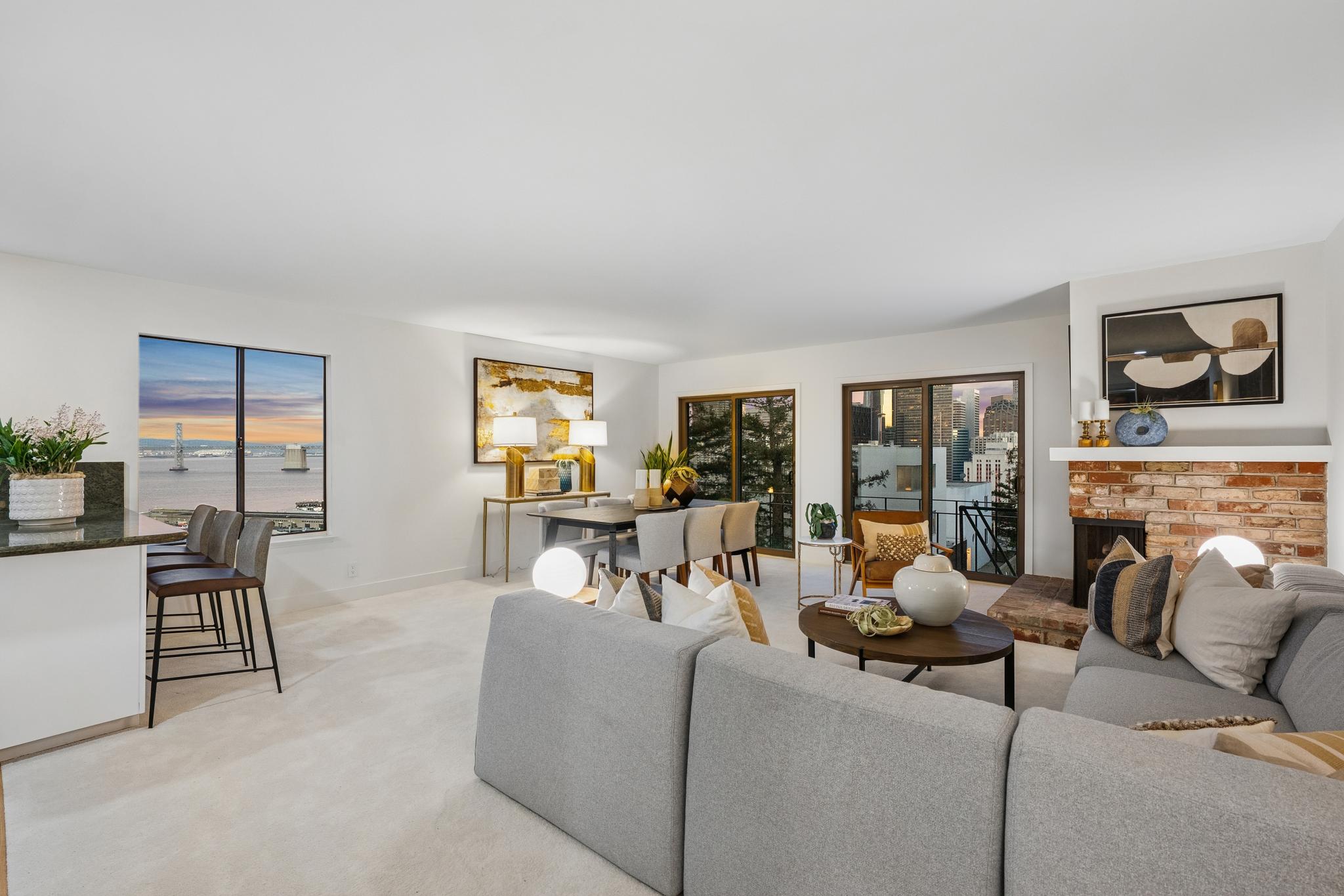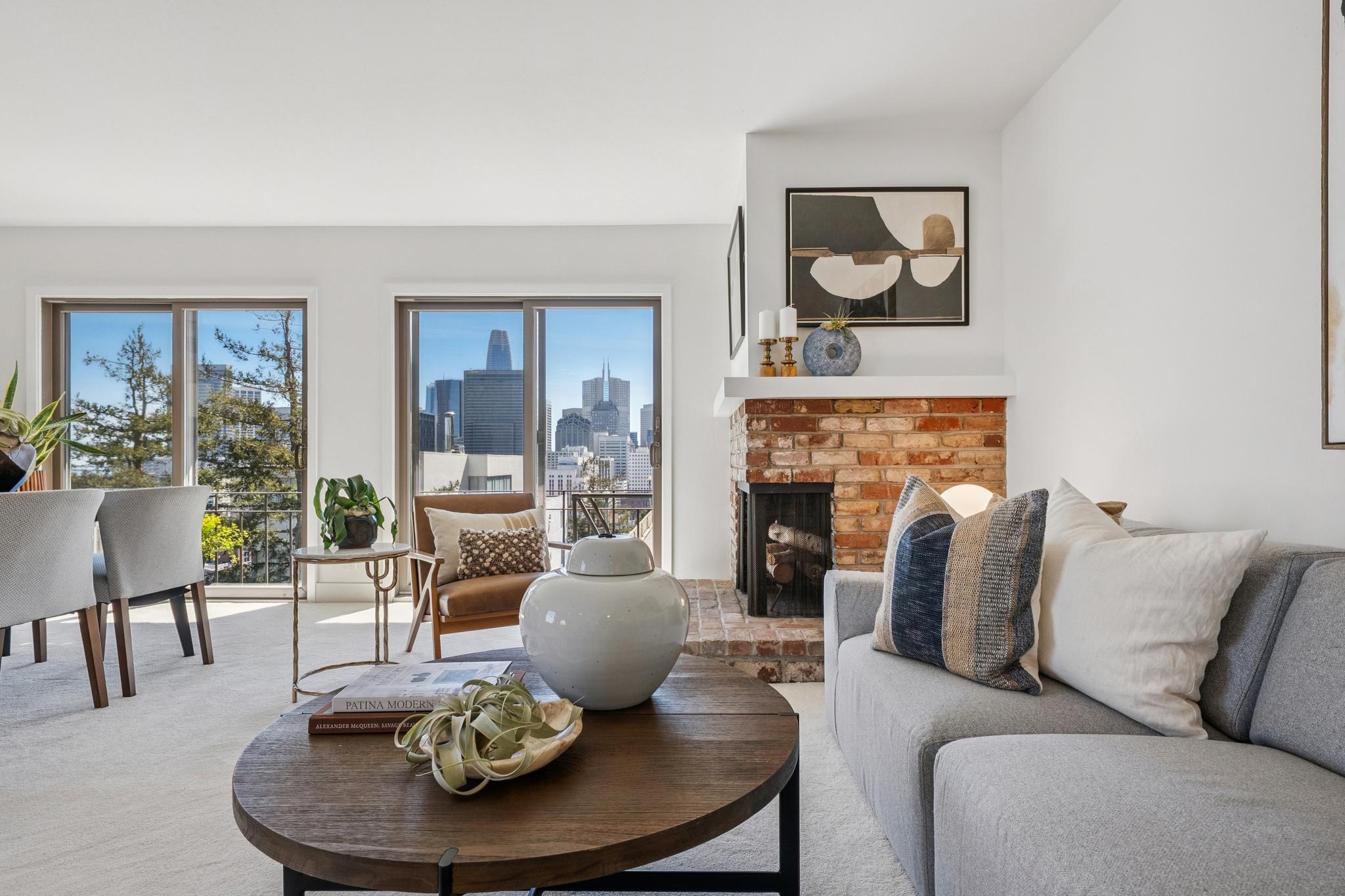 Built in 1963 and located on one of Telegraph Hill's most desirable cul-de-sacs, this exceptional Mid-Century corner apartment showcases breathtaking views of the Bay Bridge, San Francisco Bay, Treasure Island, and the Downtown skyline. Situated in a boutique 7-unit building, this residence offers a rare advantage, no unit above, providing added privacy. The home is sun-drenched and open, creating a bright, inviting space that is perfect for entertaining while enjoying the spectacular views. Adding to the neighborhood's character, the famous wild parrots of Telegraph Hill are frequently seen and heard flying overhead and directly across from the apartment. One large view bedroom with spacious closet, view entrance hallway, view formal living room with woodburning fireplace, view dining room, view kitchen with new stainless-steel appliances, large walk-in closet off hallway, balcony, one car garage parking space, storage, building lobby. Solar panels for interior stairways. Newly painted interior, new baseboards and new carpeting. Common roof deck with jaw dropping views that showcase Coit Tower, Alcatraz Island, Angel Island, Marin Headlands, Treasure Island, East Bay, Bay Bridge, the Ferry Building and Downtown skyline. Walk Score of 98! A walker's paradise! Located in Telegraph Hill, this historic San Francisco neighborhood is known for its charming hillside homes, lush gardens, and iconic city views. Close to the landmark Coit Tower, the area blends quiet residential streets with easy access to the vibrant dining and cafs of North Beach. Residents enjoy scenic walking routes along the famous Filbert Street Steps and Greenwich Steps, Calhoun Terrace steps, hillside stairways lined with gardens and views of the Bay. The Embarcadero, Levi's Plaza, Financial District, Ferry building, and the waterfront are just minutes away, offering parks, restaurants, and convenient transportation options.