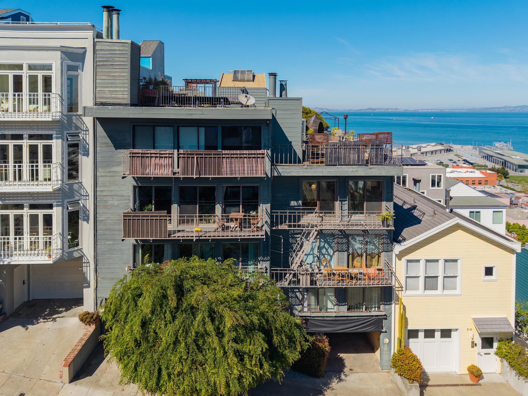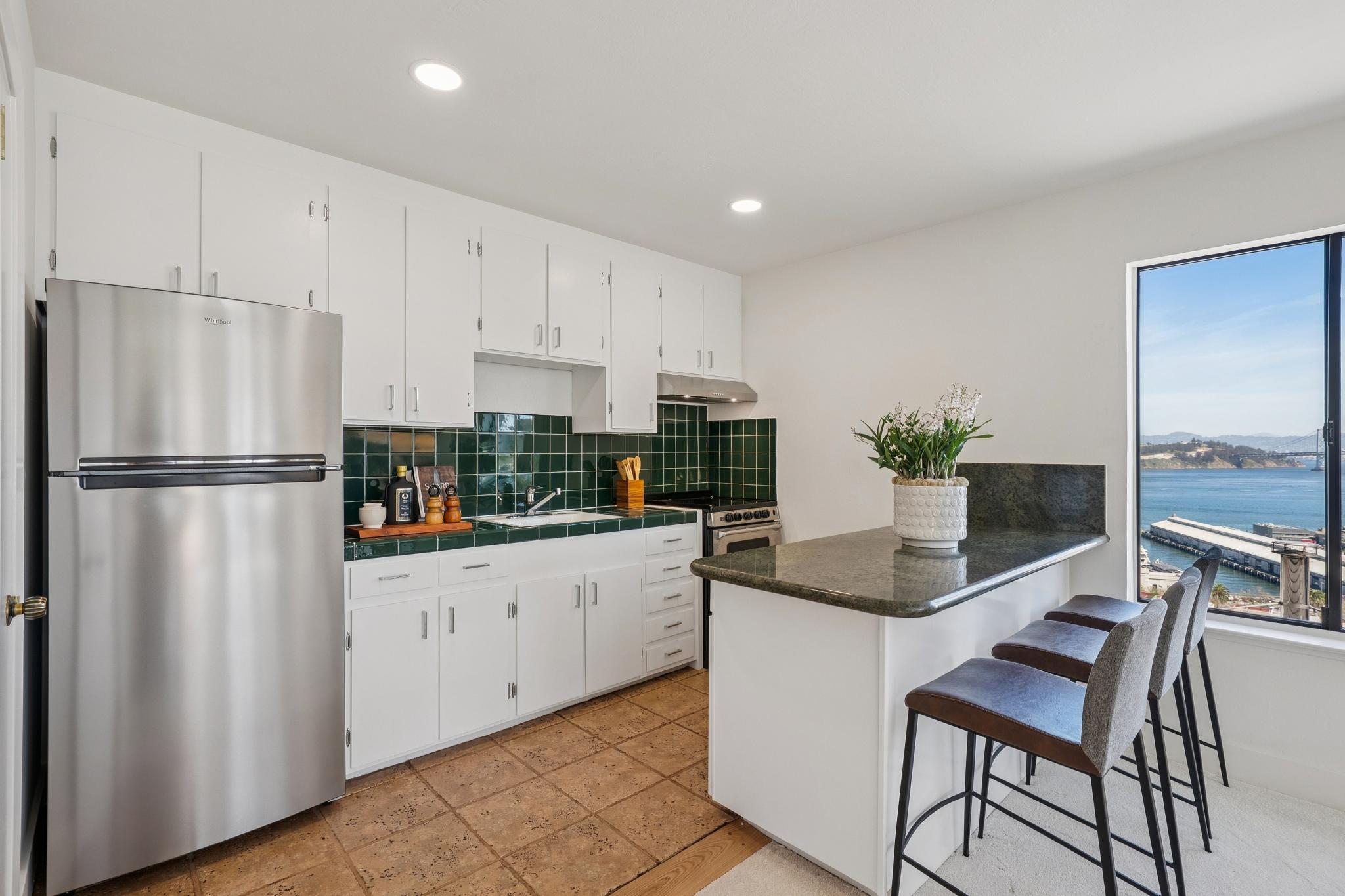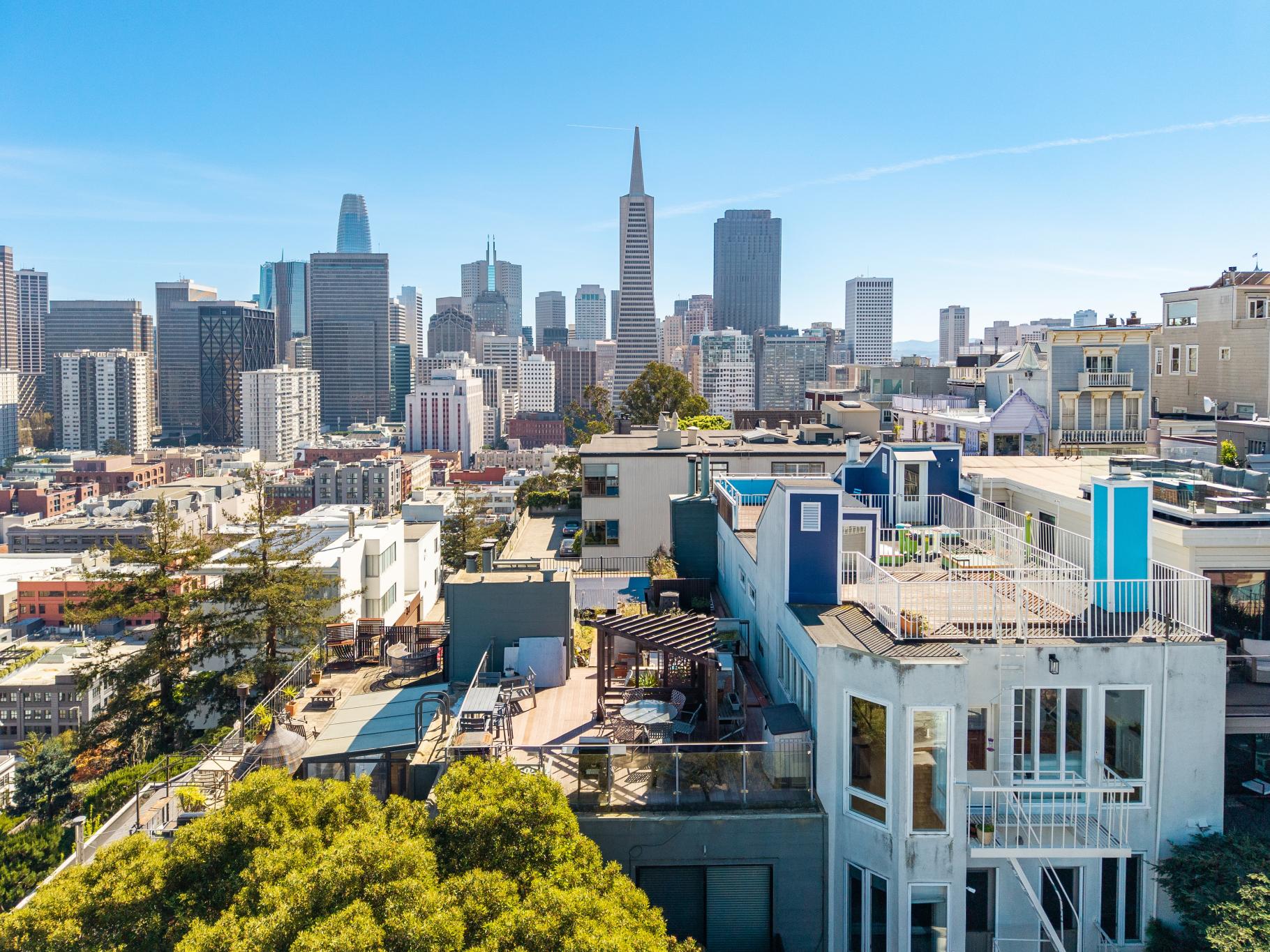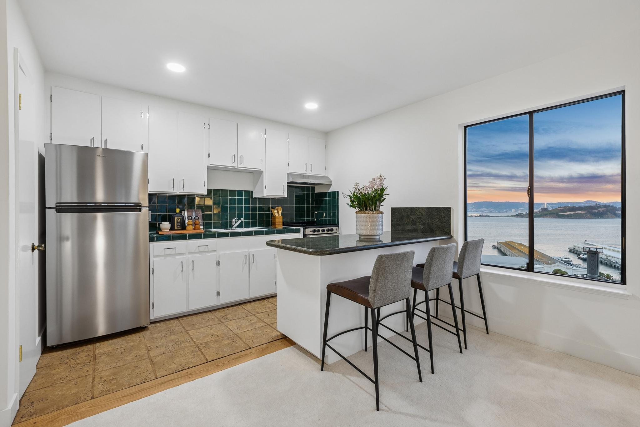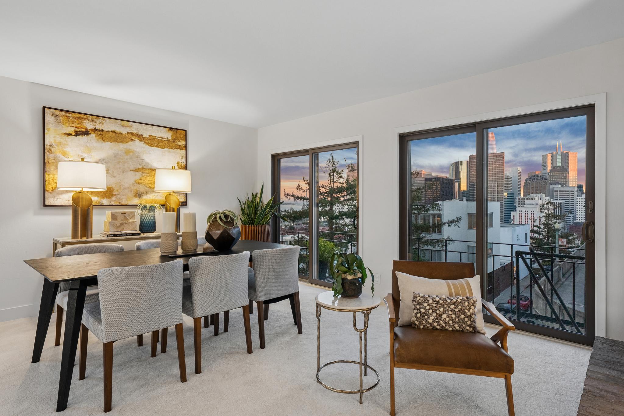 Built in 1963 and located on one of Telegraph Hill's most desirable cul-de-sacs, this exceptional Mid-Century corner apartment showcases breathtaking views of the Bay Bridge, San Francisco Bay, Treasure Island, and the Downtown skyline. Situated in a boutique 7-unit building, this residence offers a rare advantage, no unit above, providing added privacy. The home is sun-drenched and open, creating a bright, inviting space that is perfect for entertaining while enjoying the spectacular views. Adding to the neighborhood's character, the famous wild parrots of Telegraph Hill are frequently seen and heard flying overhead and directly across from the apartment. One large view bedroom with spacious closet, view entrance hallway, view formal living room with woodburning fireplace, view dining room, view kitchen with new stainless-steel appliances, large walk-in closet off hallway, balcony, one car garage parking space, storage, building lobby. Solar panels for interior stairways. Newly painted interior, new baseboards and new carpeting. Common roof deck with jaw dropping views that showcase Coit Tower, Alcatraz Island, Angel Island, Marin Headlands, Treasure Island, East Bay, Bay Bridge, the Ferry Building and Downtown skyline. Walk Score of 98! A walker's paradise! Located in Telegraph Hill, this historic San Francisco neighborhood is known for its charming hillside homes, lush gardens, and iconic city views. Close to the landmark Coit Tower, the area blends quiet residential streets with easy access to the vibrant dining and cafs of North Beach. Residents enjoy scenic walking routes along the famous Filbert Street Steps and Greenwich Steps, Calhoun Terrace steps, hillside stairways lined with gardens and views of the Bay. The Embarcadero, Levi's Plaza, Financial District, Ferry building, and the waterfront are just minutes away, offering parks, restaurants, and convenient transportation options.