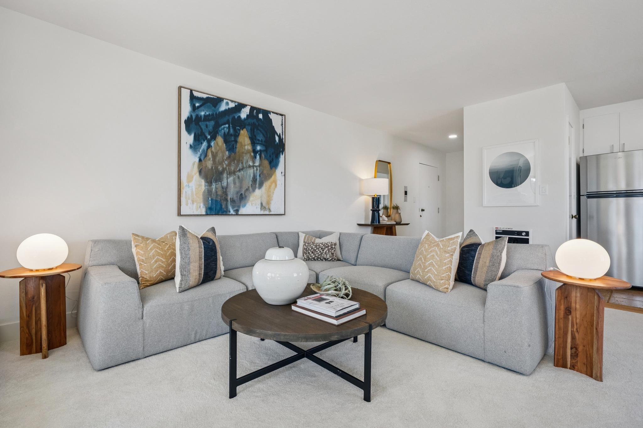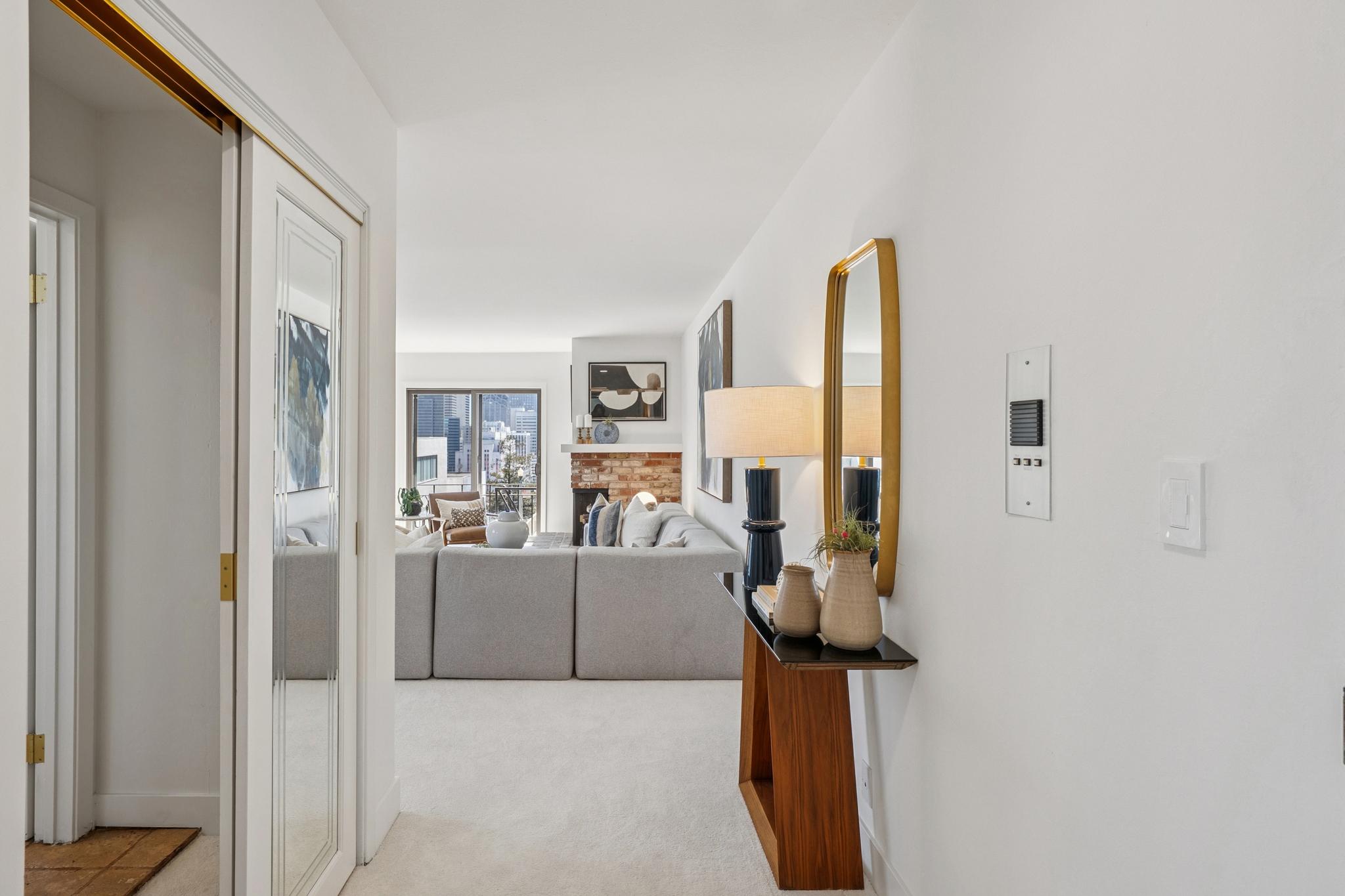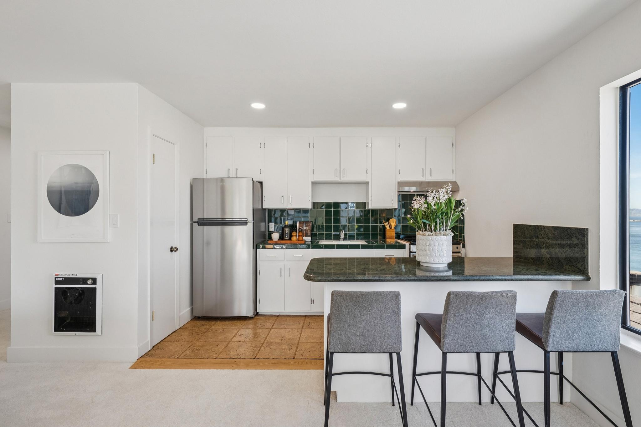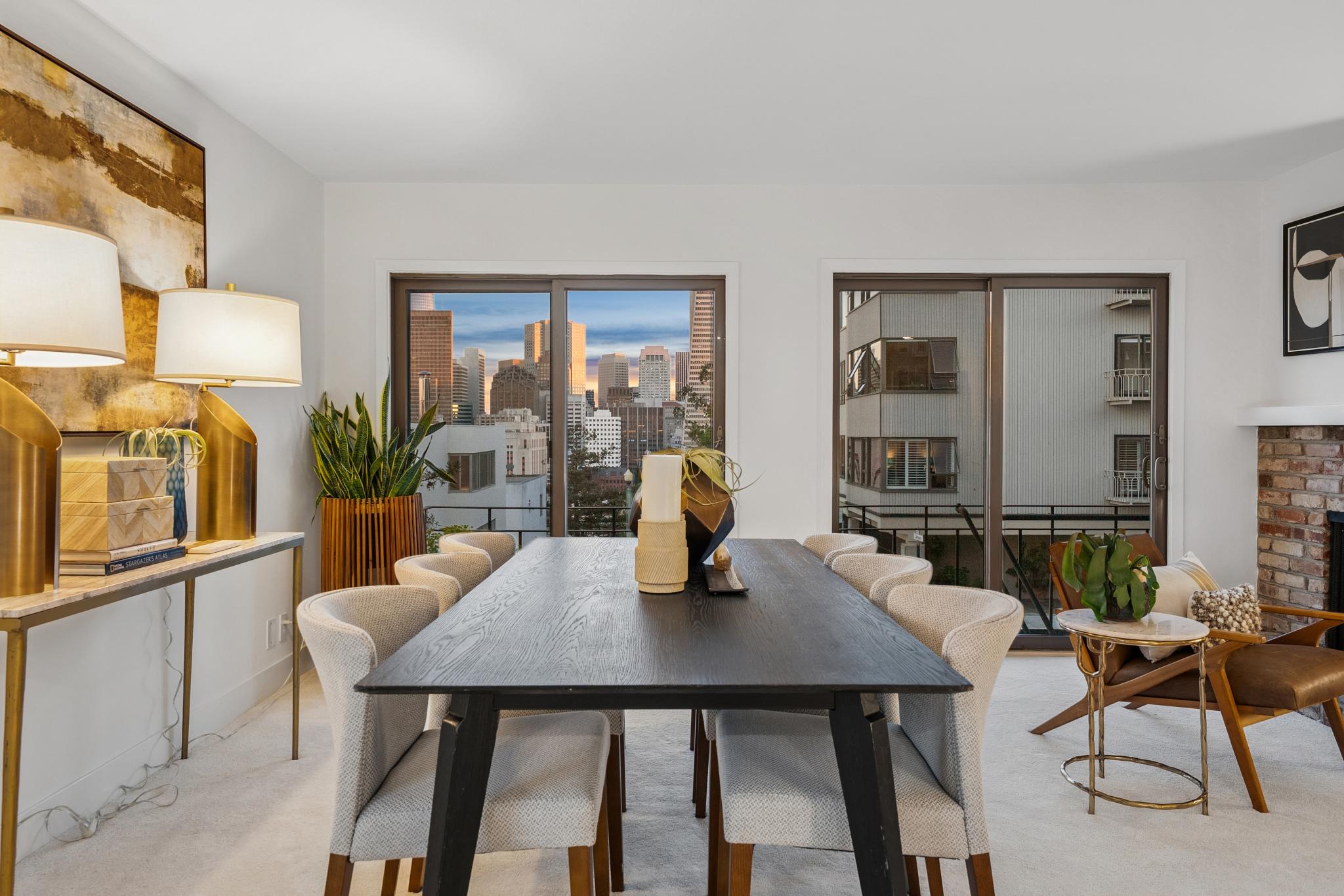 Built in 1963 and located on one of Telegraph Hill's most desirable cul-de-sacs, this exceptional Mid-Century corner apartment showcases breathtaking views of the Bay Bridge, San Francisco Bay, Treasure Island, and the Downtown skyline. Situated in a boutique 7-unit building, this residence offers a rare advantage, no unit above, providing added privacy. The home is sun-drenched and open, creating a bright, inviting space that is perfect for entertaining while enjoying the spectacular views. Adding to the neighborhood's character, the famous wild parrots of Telegraph Hill are frequently seen and heard flying overhead and directly across from the apartment. One large view bedroom with spacious closet, view entrance hallway, view formal living room with woodburning fireplace, view dining room, view kitchen with new stainless-steel appliances, large walk-in closet off hallway, balcony, one car garage parking space, storage, building lobby. Solar panels for interior stairways. Newly painted interior, new baseboards and new carpeting. Common roof deck with jaw dropping views that showcase Coit Tower, Alcatraz Island, Angel Island, Marin Headlands, Treasure Island, East Bay, Bay Bridge, the Ferry Building and Downtown skyline. Walk Score of 98! A walker's paradise! Located in Telegraph Hill, this historic San Francisco neighborhood is known for its charming hillside homes, lush gardens, and iconic city views. Close to the landmark Coit Tower, the area blends quiet residential streets with easy access to the vibrant dining and cafs of North Beach. Residents enjoy scenic walking routes along the famous Filbert Street Steps and Greenwich Steps, Calhoun Terrace steps, hillside stairways lined with gardens and views of the Bay. The Embarcadero, Levi's Plaza, Financial District, Ferry building, and the waterfront are just minutes away, offering parks, restaurants, and convenient transportation options.