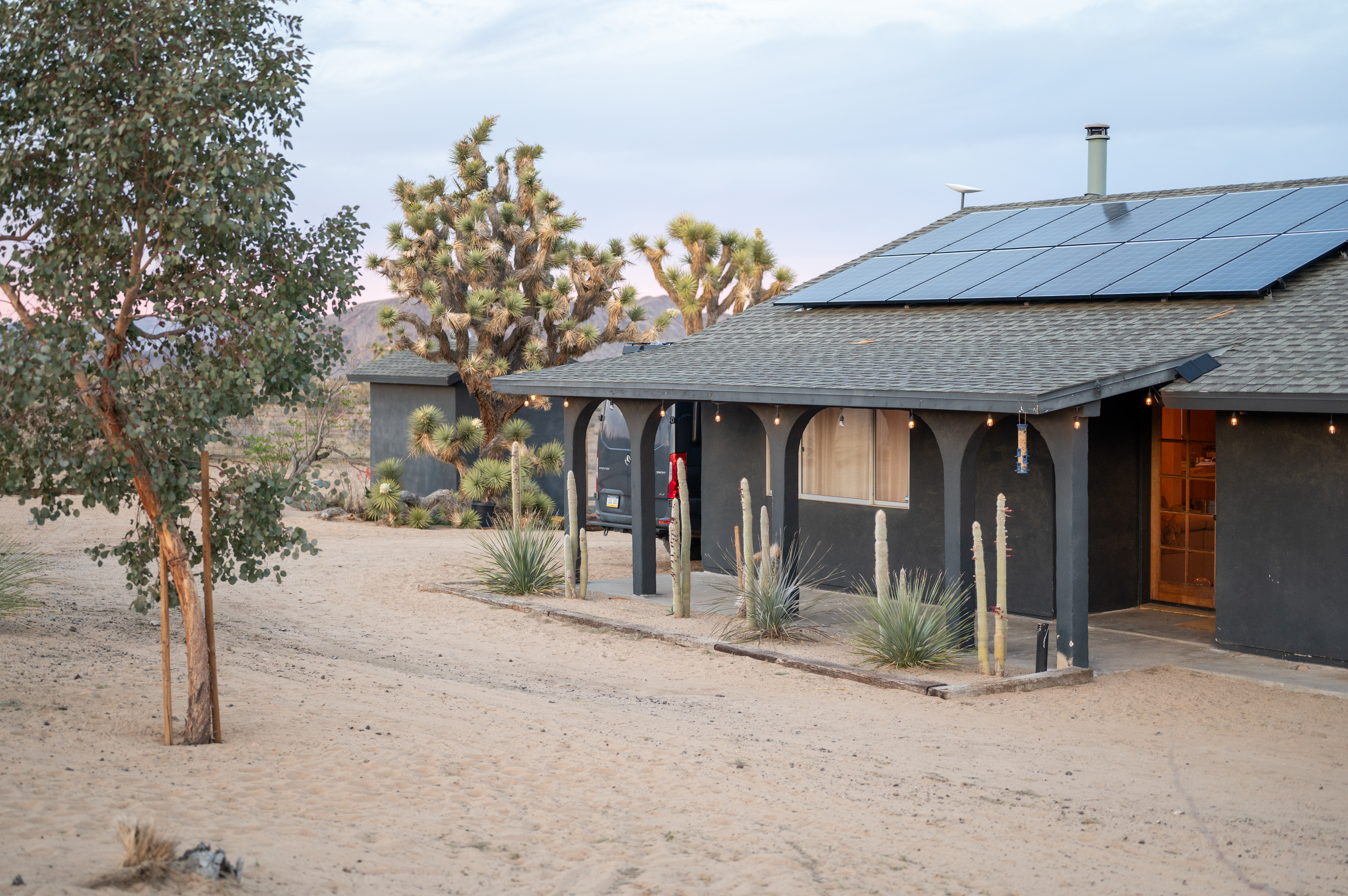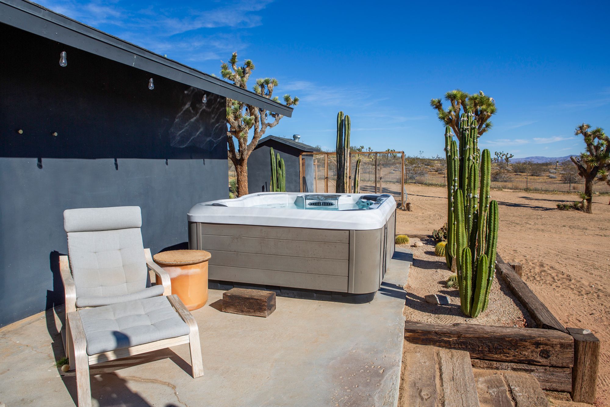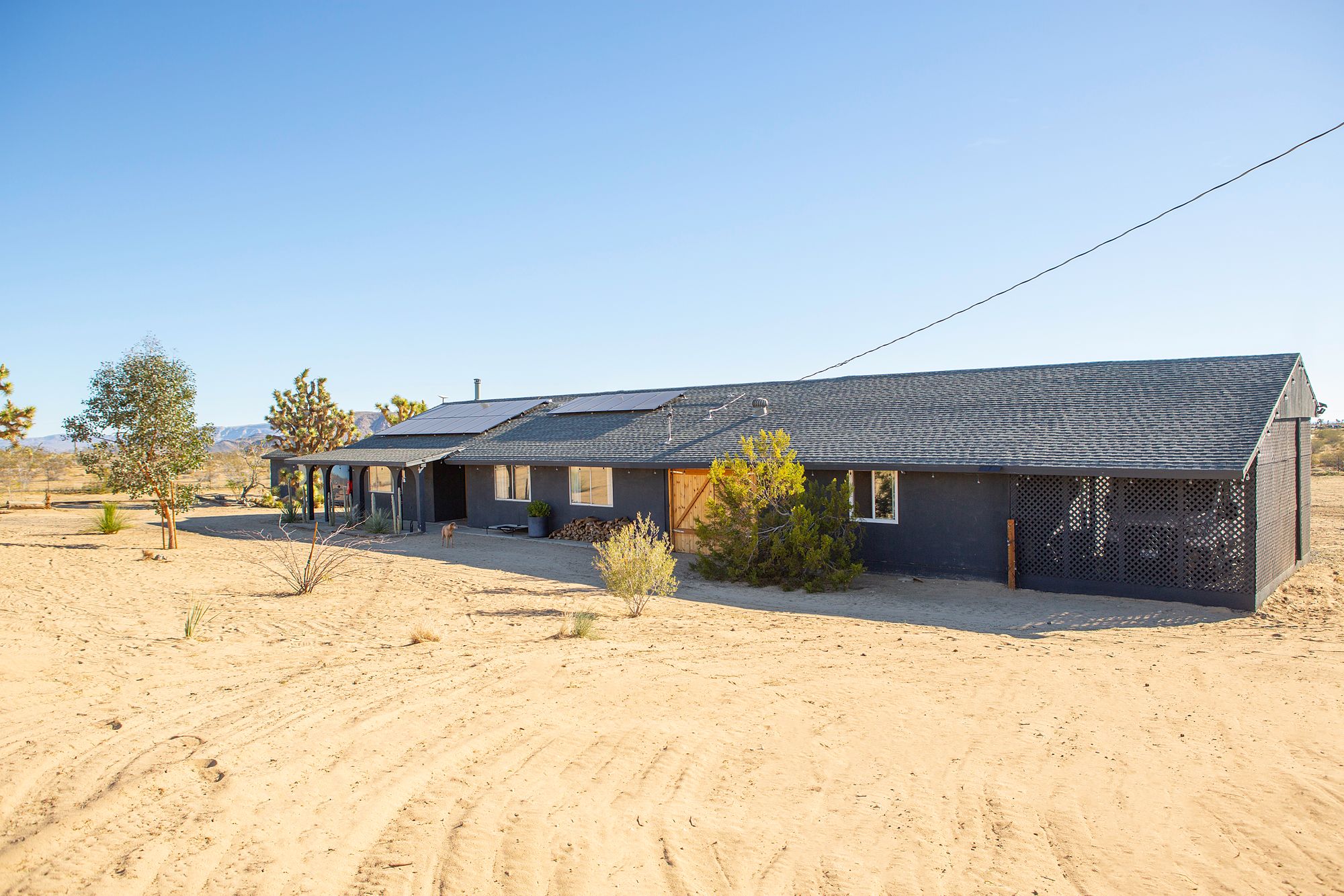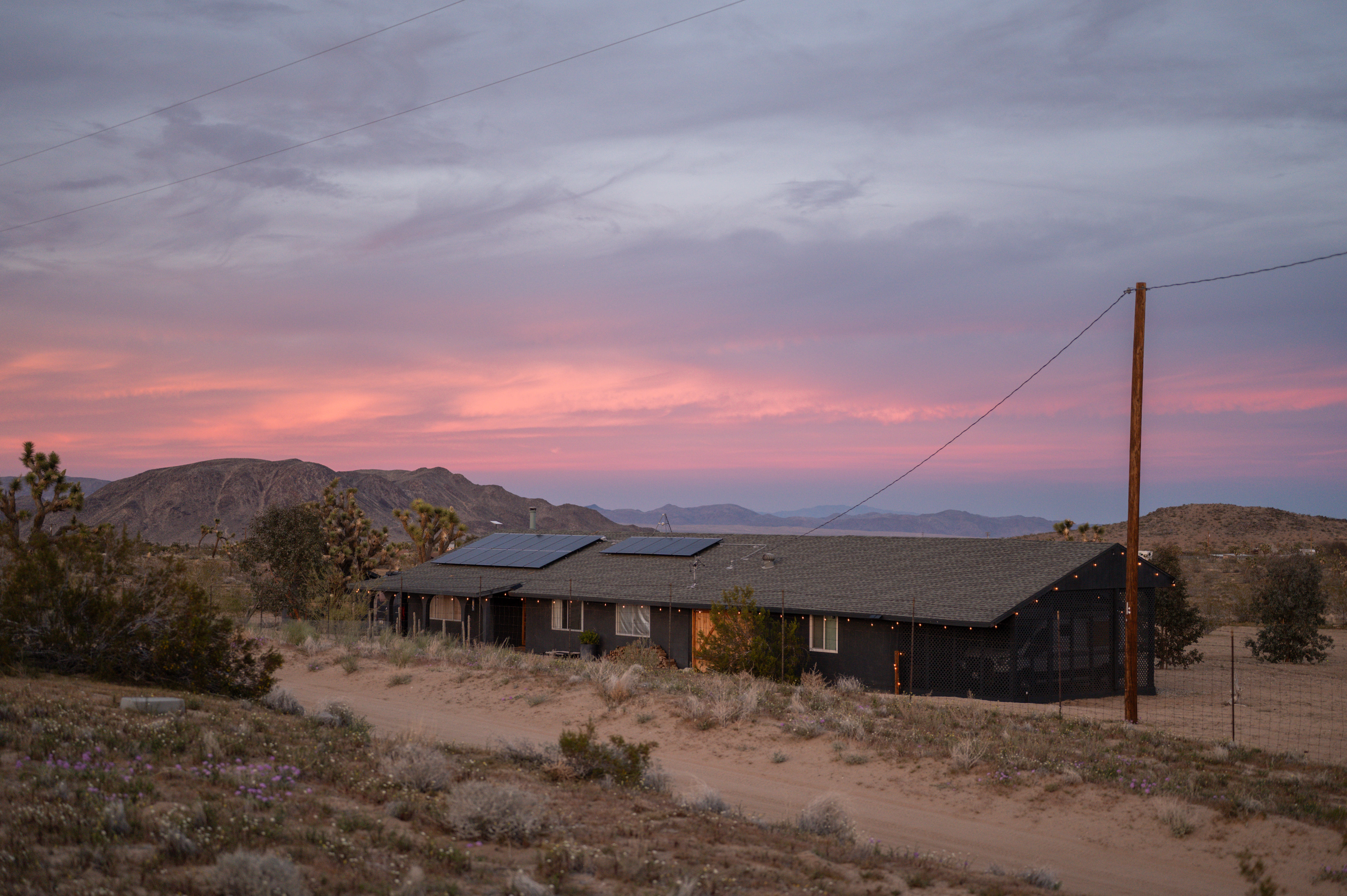 Discover a desert sanctuary thoughtfully designed to harmonize with its natural surroundings. This custom retreat showcases non-toxic, earth-derived materials, seamlessly blending modern living with the beauty of the landscape. Every detail has been carefully considered, from hand-applied lime plaster walls to custom vanities throughout. The home features fully owned solar panels for energy efficiency and long-term peace of mind. Just off the garage, a versatile flex/office space with its own mini-split AC and heating system offers year-round comfort, perfect for work, fitness, or creative use. The fully fenced property, complete with rattlesnake fencing, provides ample space for families and pets to roam freely. Young Palo Verde, Eucalyptus, and Joshua trees are beginning to take root, adding to the property's natural charm and future privacy. Unwind under the desert stars in the hot tub, soaking in breathtaking views and sunsets over Goat Mountain. This home balances privacy and accessibility - remote enough for tranquility, yet just a short drive to town. A rare opportunity to experience desert living at its finest. I'd love to show you this special home!