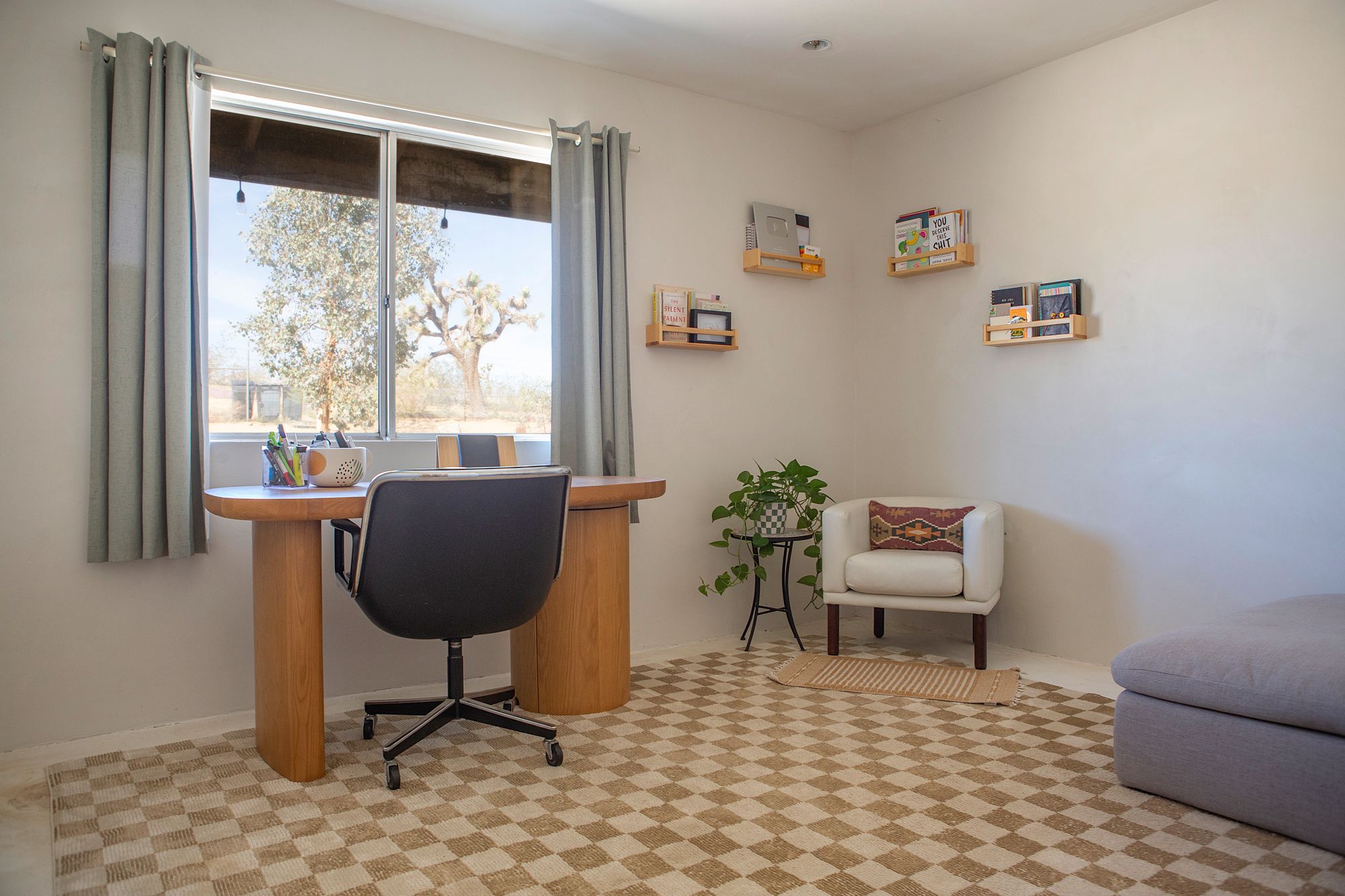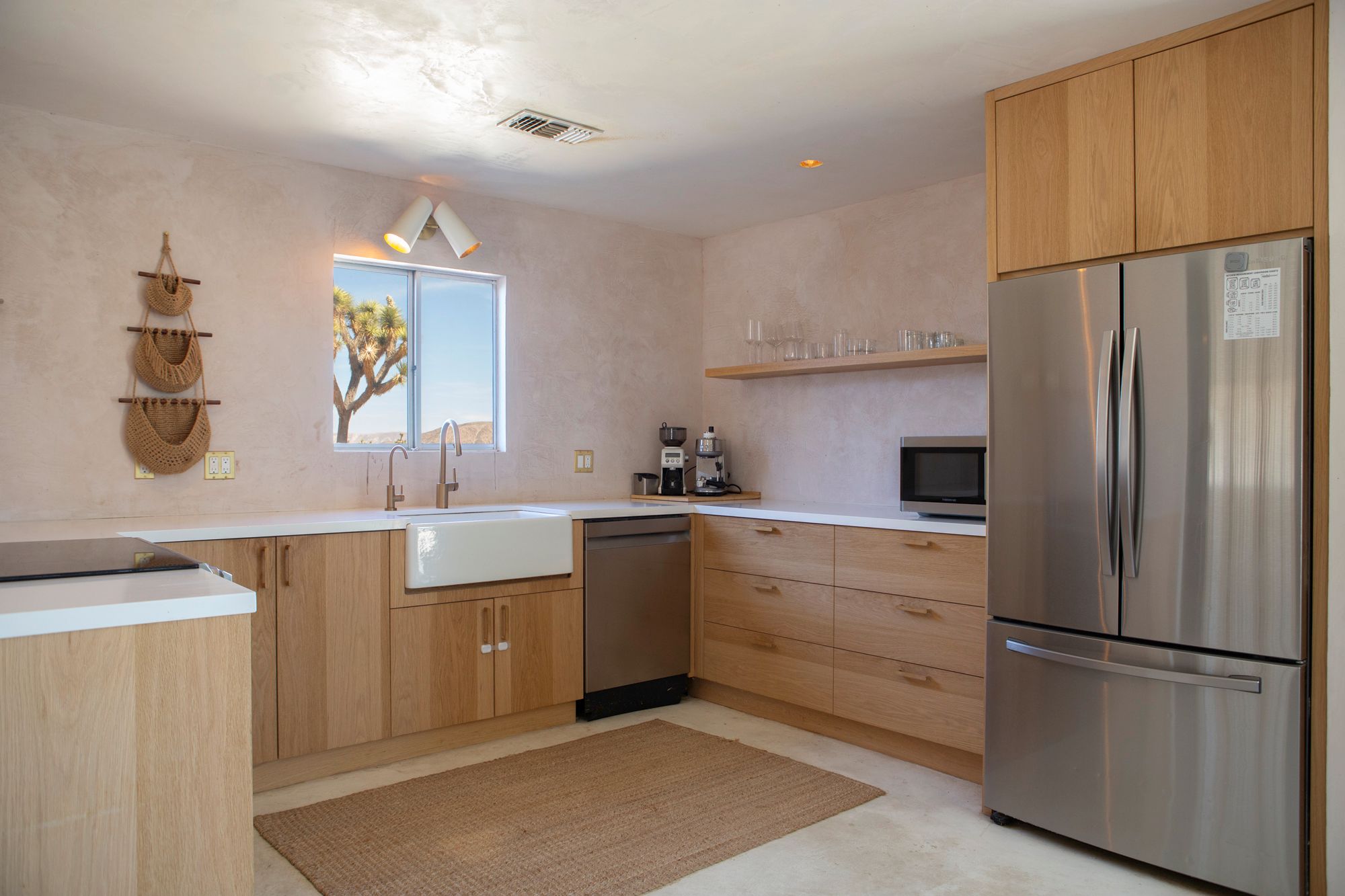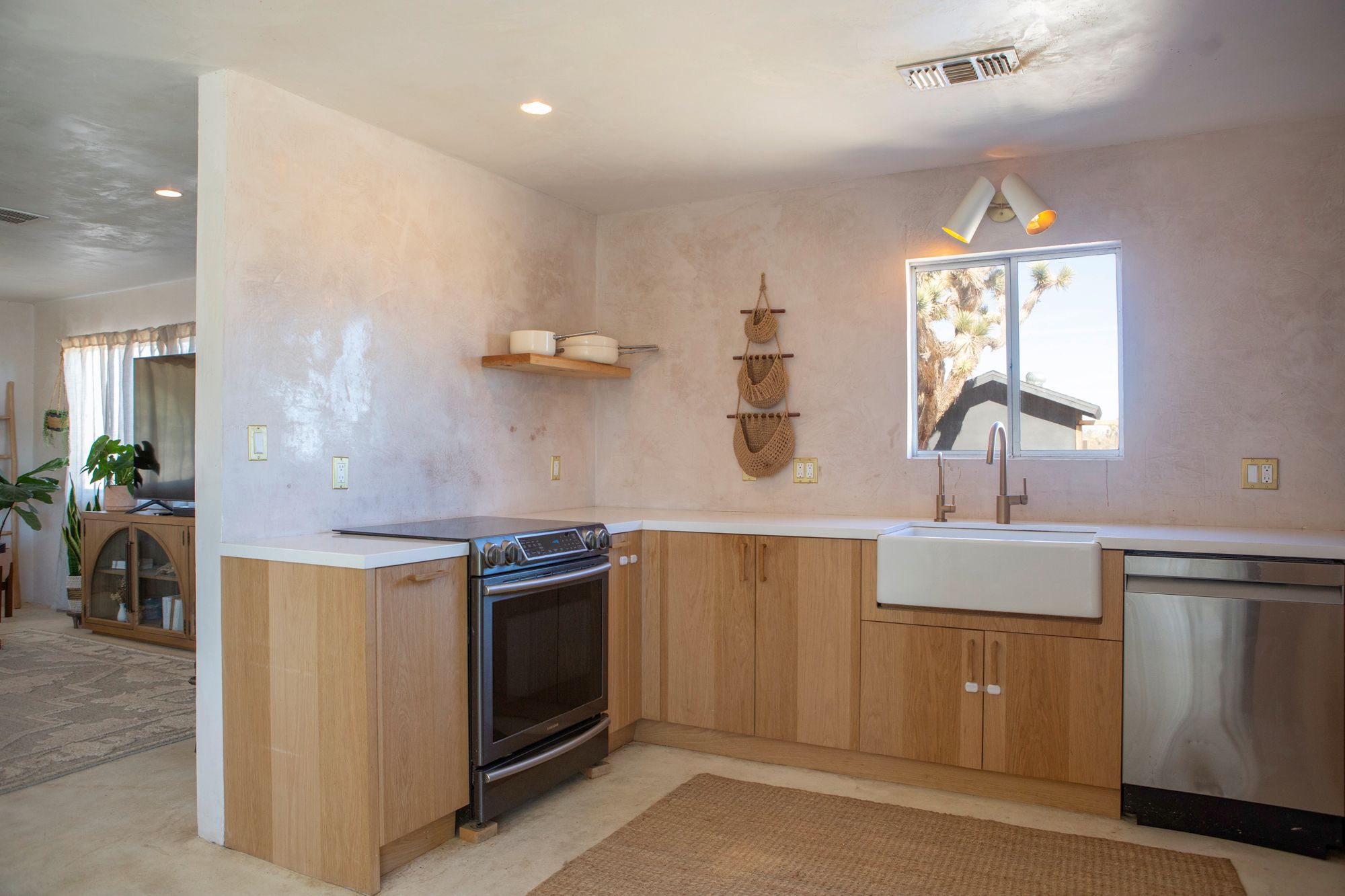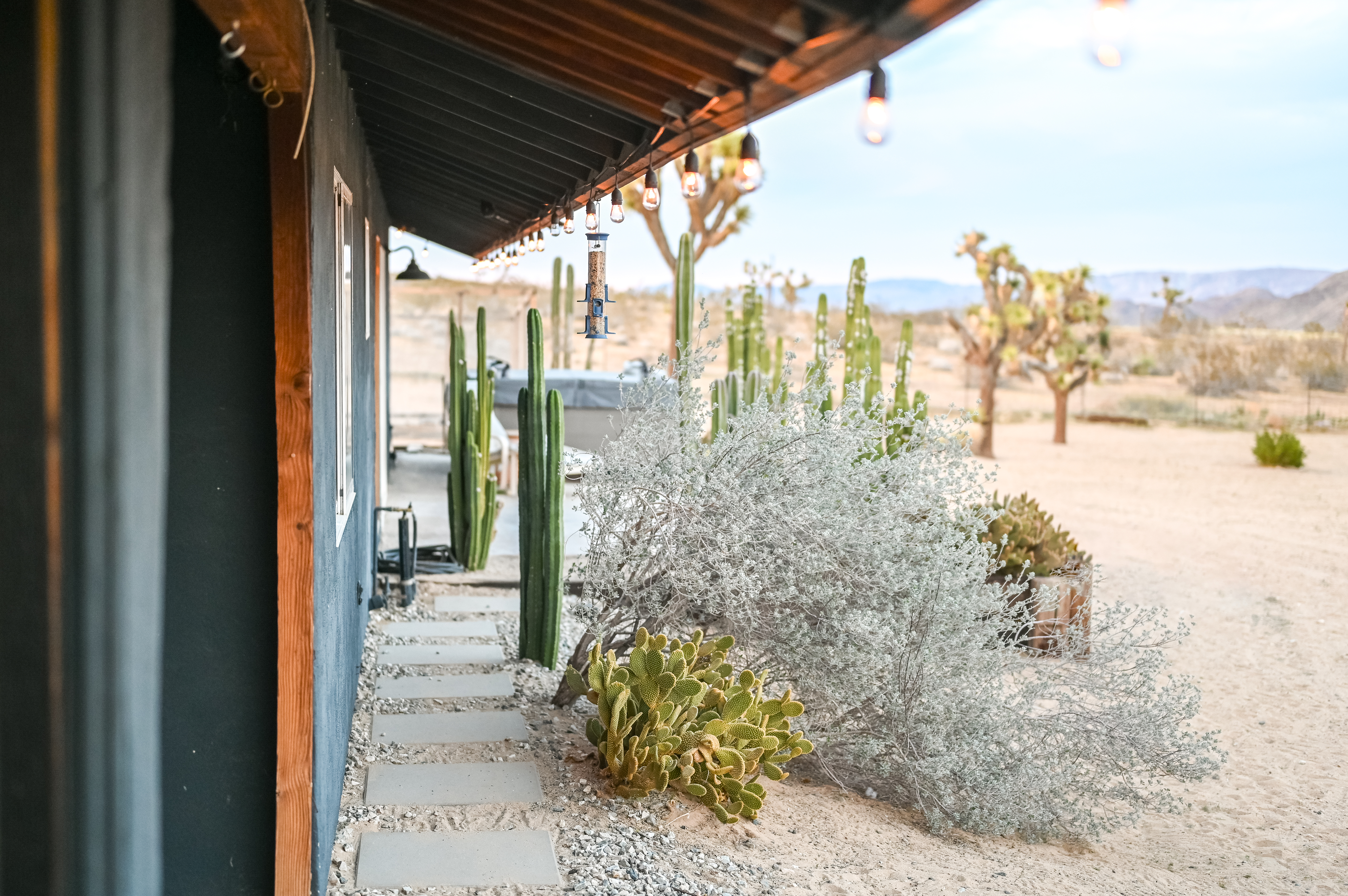 Discover a desert sanctuary thoughtfully designed to harmonize with its natural surroundings. This custom retreat showcases non-toxic, earth-derived materials, seamlessly blending modern living with the beauty of the landscape. Every detail has been carefully considered, from hand-applied lime plaster walls to custom vanities throughout. The home features fully owned solar panels for energy efficiency and long-term peace of mind. Just off the garage, a versatile flex/office space with its own mini-split AC and heating system offers year-round comfort, perfect for work, fitness, or creative use. The fully fenced property, complete with rattlesnake fencing, provides ample space for families and pets to roam freely. Young Palo Verde, Eucalyptus, and Joshua trees are beginning to take root, adding to the property's natural charm and future privacy. Unwind under the desert stars in the hot tub, soaking in breathtaking views and sunsets over Goat Mountain. This home balances privacy and accessibility - remote enough for tranquility, yet just a short drive to town. A rare opportunity to experience desert living at its finest. I'd love to show you this special home!