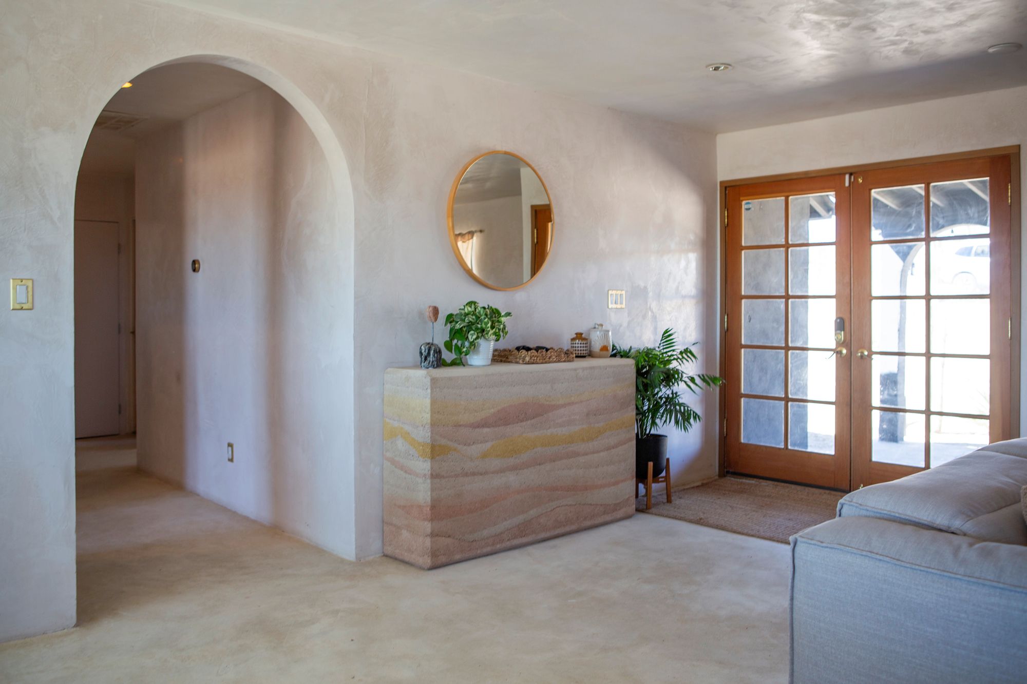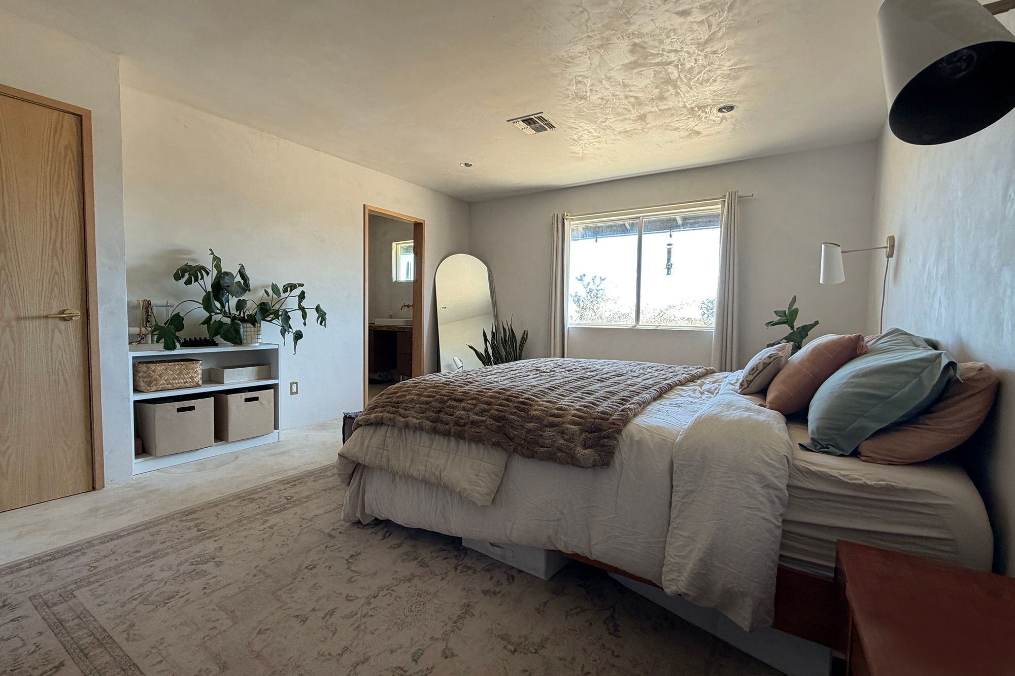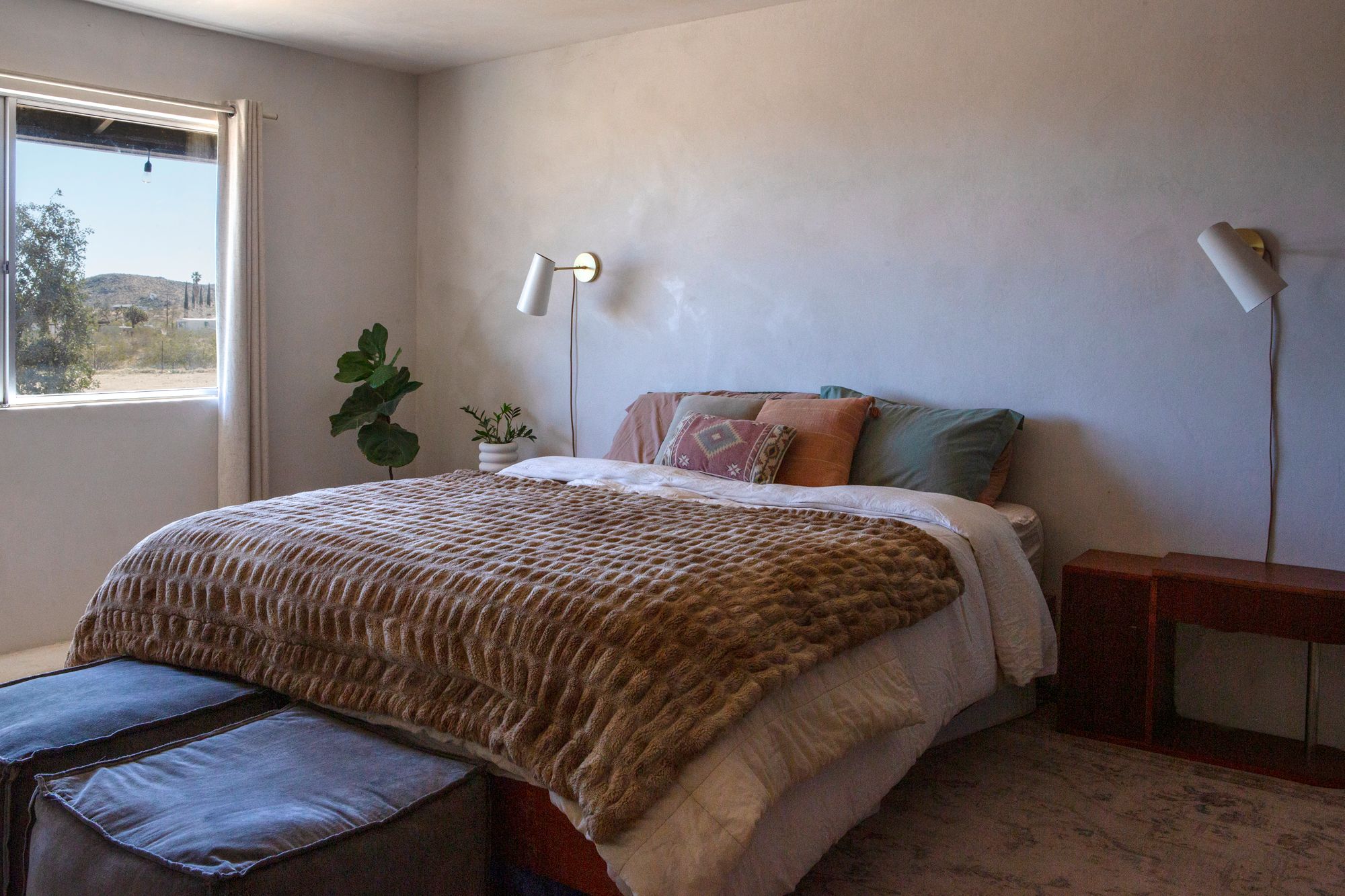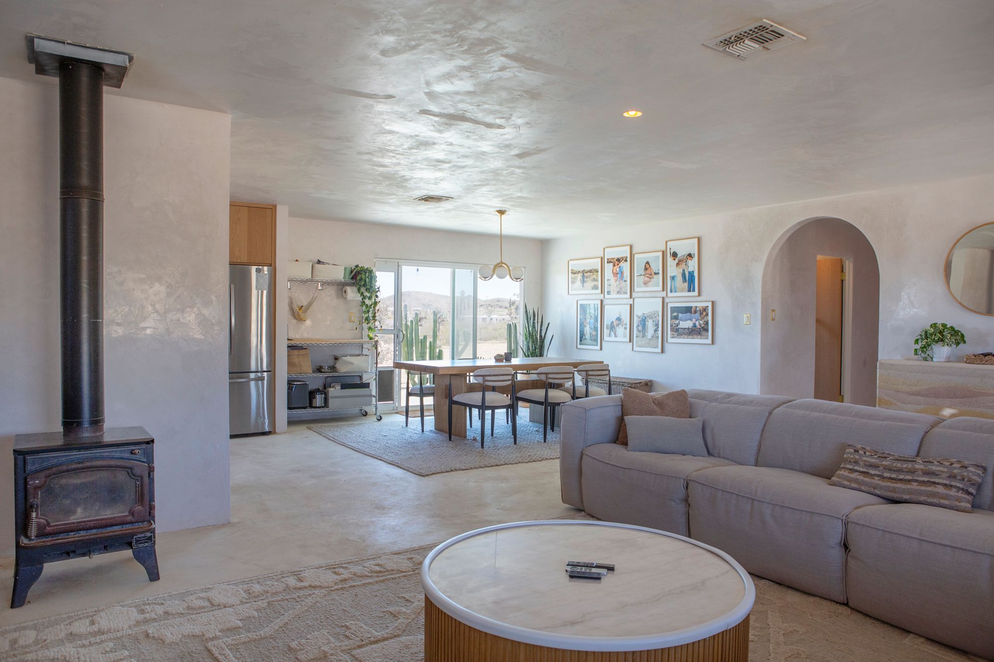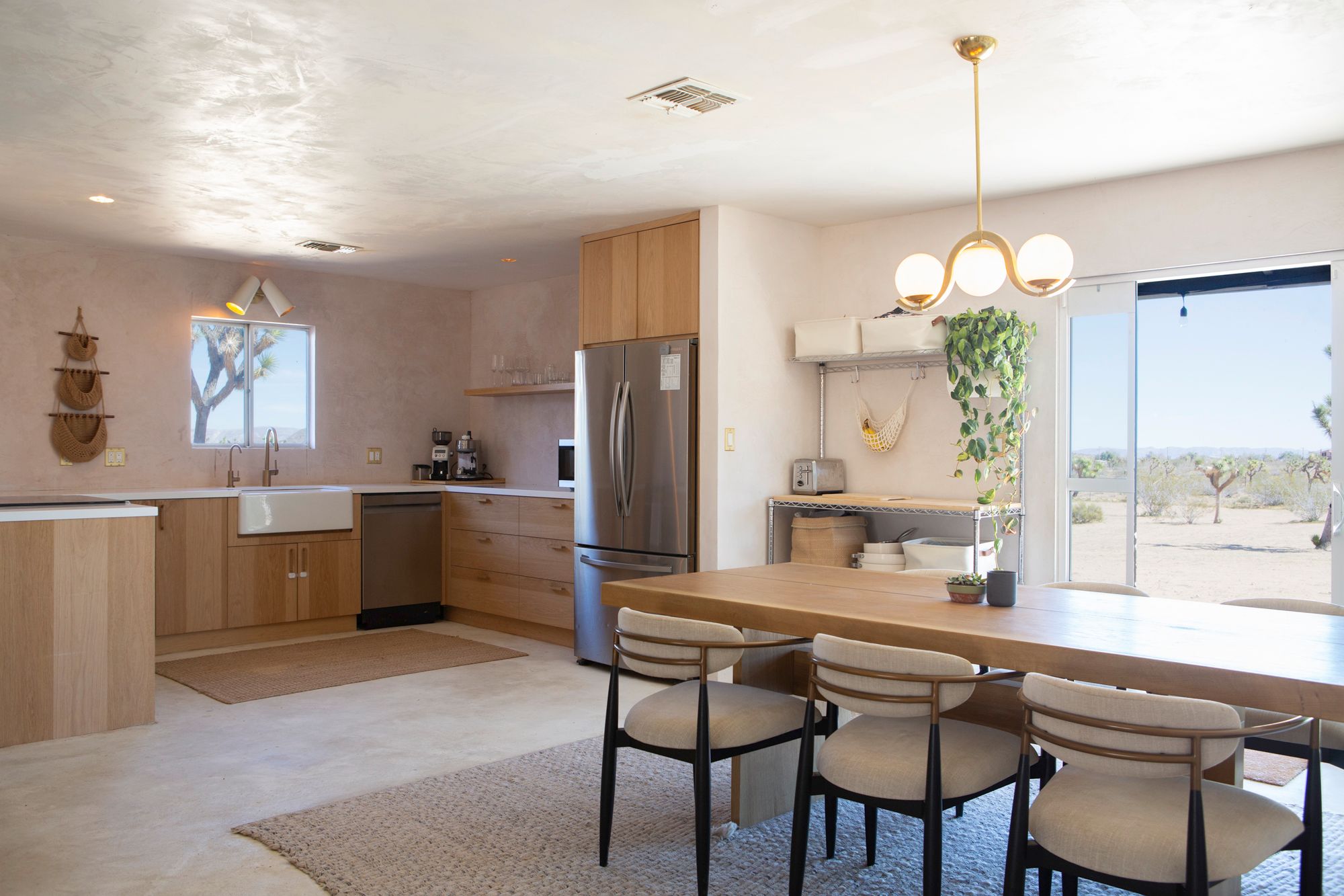 Discover a desert sanctuary thoughtfully designed to harmonize with its natural surroundings. This custom retreat showcases non-toxic, earth-derived materials, seamlessly blending modern living with the beauty of the landscape. Every detail has been carefully considered, from hand-applied lime plaster walls to custom vanities throughout. The home features fully owned solar panels for energy efficiency and long-term peace of mind. Just off the garage, a versatile flex/office space with its own mini-split AC and heating system offers year-round comfort, perfect for work, fitness, or creative use. The fully fenced property, complete with rattlesnake fencing, provides ample space for families and pets to roam freely. Young Palo Verde, Eucalyptus, and Joshua trees are beginning to take root, adding to the property's natural charm and future privacy. Unwind under the desert stars in the hot tub, soaking in breathtaking views and sunsets over Goat Mountain. This home balances privacy and accessibility - remote enough for tranquility, yet just a short drive to town. A rare opportunity to experience desert living at its finest. I'd love to show you this special home!