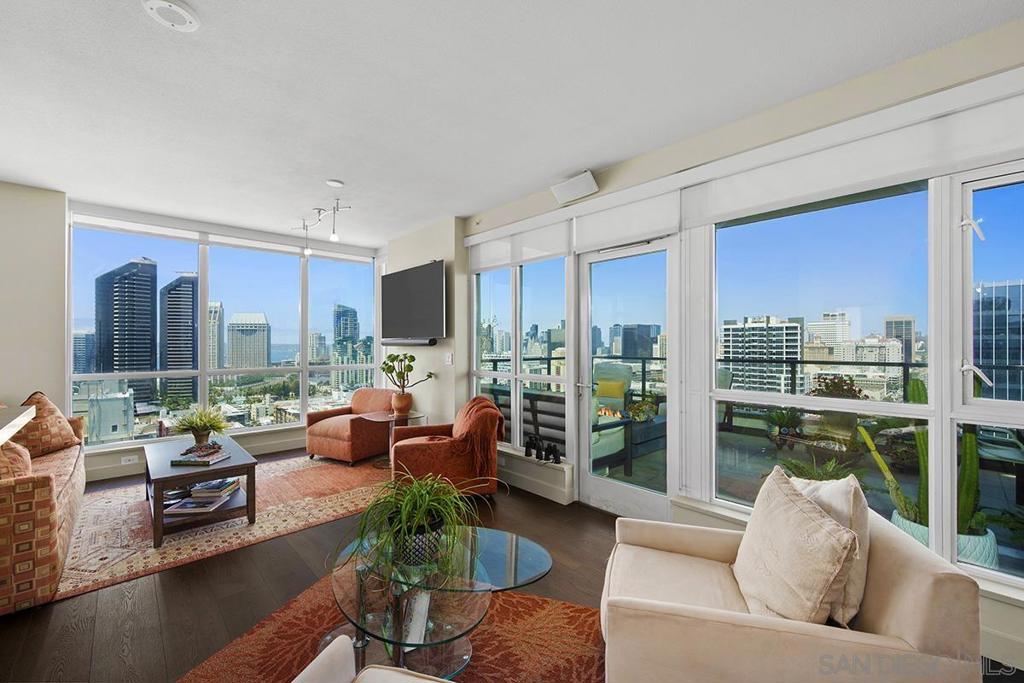 The epitome of Downtown living is realized in this extraordinary northwest corner penthouse series residence on the 21st floor of The Legend with a nearly 400 SQ FT ROOFTOP DECK! Stunning views span to the bay, city, and even Point Loma from this coveted property. Boasting a highly desirable floor plan with 2 separated bedrooms for enhanced privacy, PLUS a flex space, perfect for use a den, office, or media room. 2 side-by-side parking spaces plus a motorcycle space (owners have parked 3 cars in the spaces), 1 storage room and 1 storage cage! Complete with recently installed wood floors, upgraded lighting, ceiling fans, pre-wired for surround sound, and a stainless/granite kitchen with Sub-Zero refrigerator, you will love where you live. Quite possibly the best unit in the entire building with the combination of the views and roof deck - enjoy Petco Park events from 'Club Legend' but then retreat to the quietest corner of the building for some rest and relaxation! Dynamic views are framed by expansive windows in this fabulous residence at the Legend. An entertainer's dream, you will love the space and functionality offered in this condo. Delight in a spacious kitchen with stainless steel appliances, granite counters including an eat-at bar, a convenient pantry closet, Sub-Zero refrigerator, and desirable gas range. Retreat to the primary bedroom boasting a generous walk-in closet with custom organizers. The primary en-suite bath features a dual vanity with upgraded granite counters, a walk-in shower, plus a Toto Washlet. Complete with additional storage and 2 side-by-side parking spaces plus a 3rd space for a motorcycle, this is an idyllic Downtown dwelling. The Legend is the only residential high-rise to be built inside the gates of our Major League Ballpark and the only residential tower to be built on the three-acre Park at the Park! This iconic building overlooking the Padres Ballpark will be treasured for generations with historic detailing preserved by Bosa to create a world-class residential tower. Enjoy a premium central location only steps away from the Gaslamp Quarter and Marina District for convenient access to endless shopping and dining options. The Legend's amenities include a second-floor rooftop deck looking out over Park at the Park complete with pool and spa, a fully-equipped fitness room, rooftop garden, barbecue area, steam, sauna and changing rooms. Your guests and clients will also love 'Club Legend' located on the seventh floor, complete with a huge deck overlooking the ballpark and an outdoor fireplace lounge. An elegant courtyard entrance, creating a private enclave approaching the lobby provides a fitting and impressive sense of arrival for residents and their guests. The concierge service and 24-hour security add a sense of belonging while an ambiance of refinement and contemporary sophistication is apparent throughout the building.Builder's brochure indicated 1587 sqft, assessor's record indicates 1439 sqft.