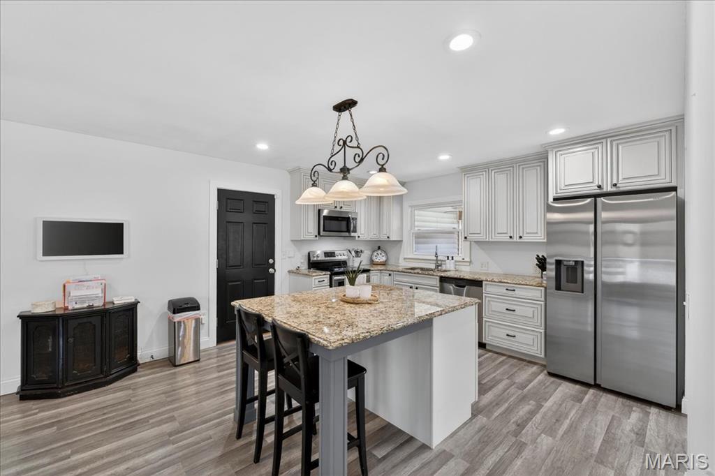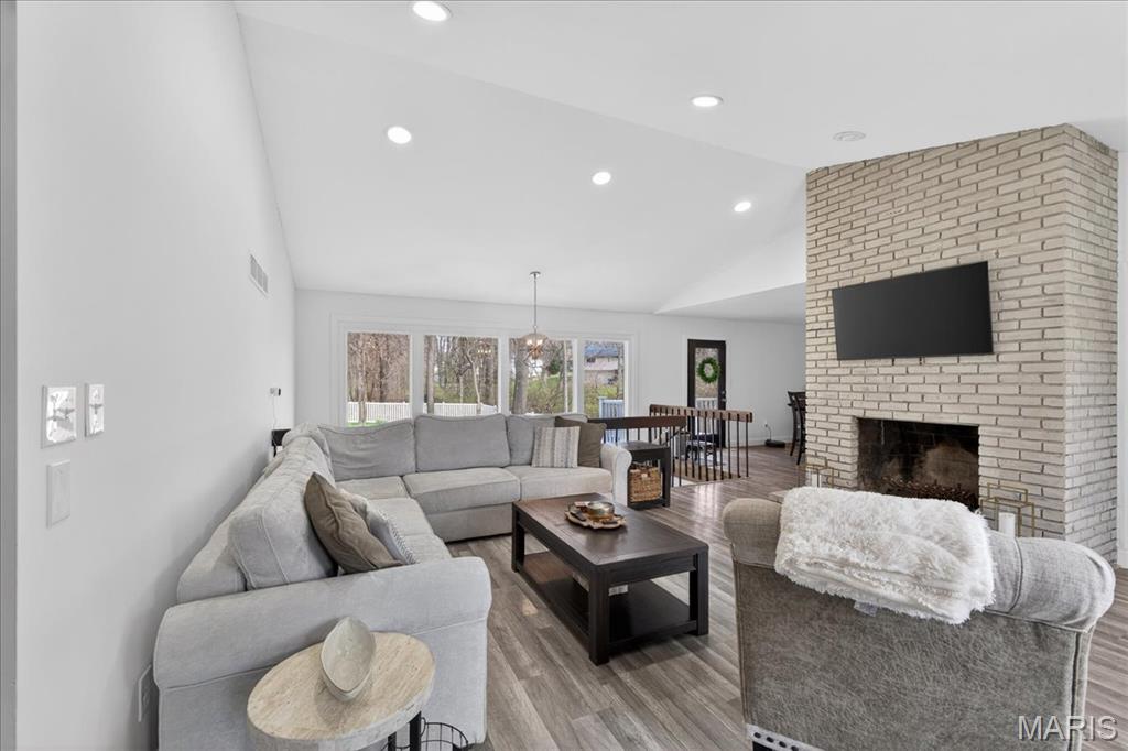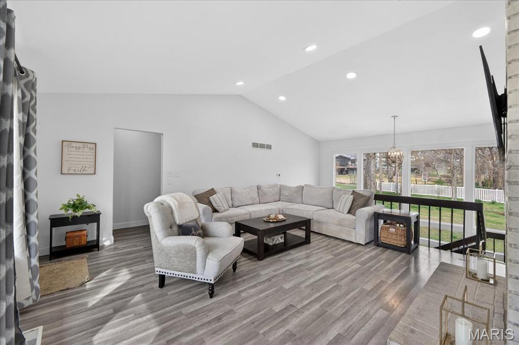 The welcoming curb appeal at 203 Morewood Dr is just the beginning...you'll be WOWed by this open and bright atrium ranch the moment you walk in the door! LVP flooring, white panel doors, coordinated fixtures and features are found throughout the home creating a "display" feel. The great room is flanked by large front windows and atrium window wall at the back letting the outdoors in. Vaulted ceilings with recessed lighting highlight the great room which opens to both the kitchen and breakfast room. The kitchen/breakfast area layout is perfect for hosting with plenty of room for guests while keeping you engaged in the conversation. Access from the breakfast area to covered deck for dining al fresco, day or evening. Soft close cabinetry and granite counters plus center island make meal prep a breeze for any occasion. Find your quiet time in the spacious primary bedroom with roomy full bath, double closet space and lighted ceiling fan. For privacy and separation, the 2nd bedroom and guest bath are on the opposite end of the center hall. Your living space will continue to the lower level brightened by the atrium windows. Here you'll find the family room with recessed lighting, brick fronted wood burning fireplace and access to the expansive patio and back yard. Separated by the family room are the spacious 3rd bed & full bath and the 4th bed & full bath. A great setup to accommodate any lifestyle or extended guest visits! Additionally there are several storage areas and large laundry room with utility sink & shelves in the lower level. The gently rolling, deep back yard allows for privacy when sitting on the patio and is fully fenced to be pet friendly. The oversized garage is wider than most making it easy to unload the car, and deep enough for all your outside storage needs. With Parkway West schools, City of Manchester amenities, and services near by all your boxes will be checked!