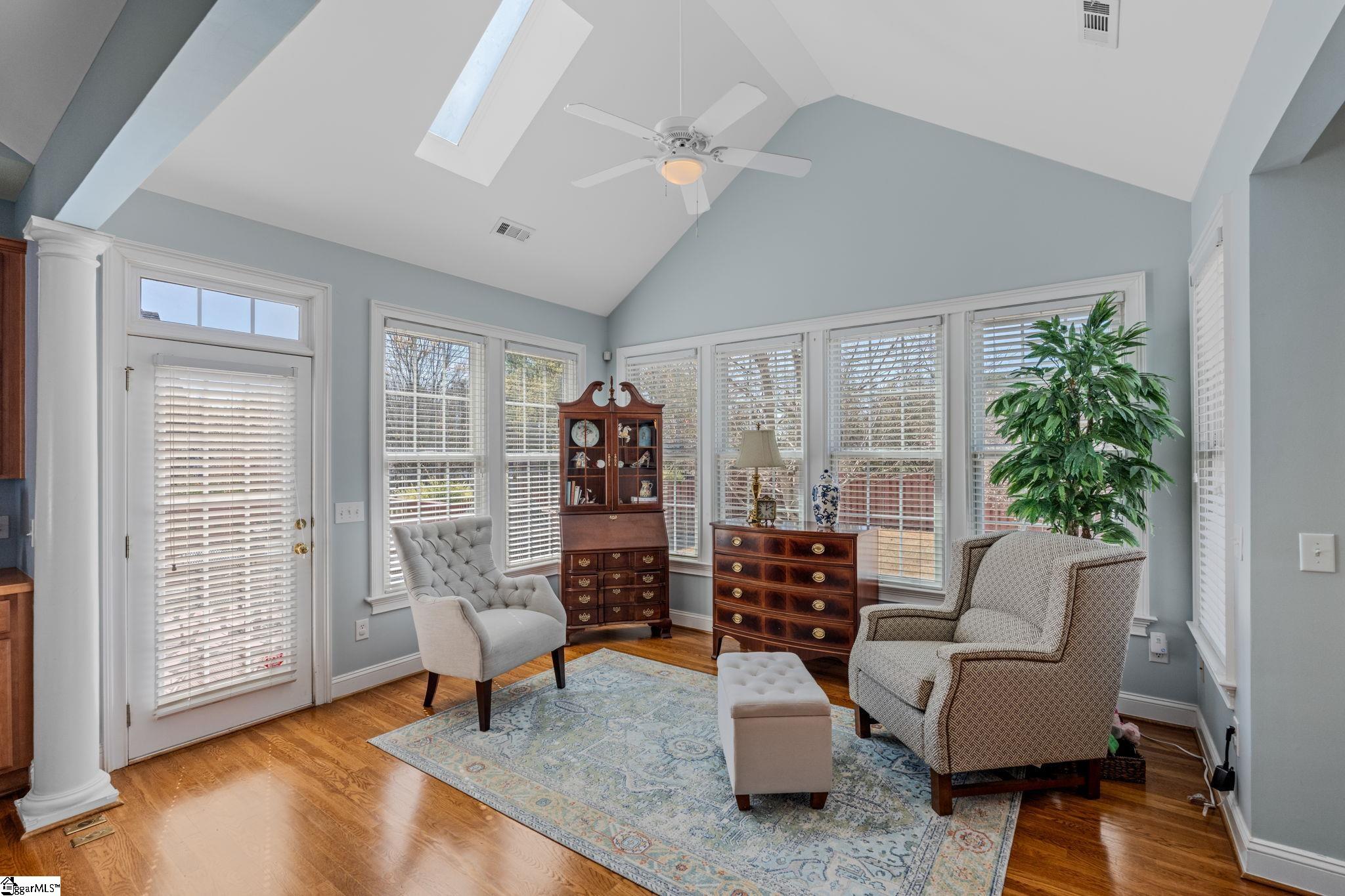 Beautiful 3 bedroom 2 bath, 1.5-story home with an open floor plan and vaulted ceilings in the main living area. The living room features a cozy gas log fireplace with built-in bookshelves and flows seamlessly into the dining room, sunroom, and breakfast area. The kitchen offers granite countertops, stainless steel appliances, and a gas range. The primary suite on the main includes dual vanities, a garden tub, separate shower, and walk-in closet. Two additional bedrooms and a full bath are also on the main level. Upstairs flex room over the garage is perfect for a media room, playroom, or home office. Enjoy hardwood floors in the main living areas, a deck off the sunroom, and a large flat fenced backyard perfect for entertaining, pets, or play. Beautifully landscaped neighborhood with sidewalks and tree-lined streets!