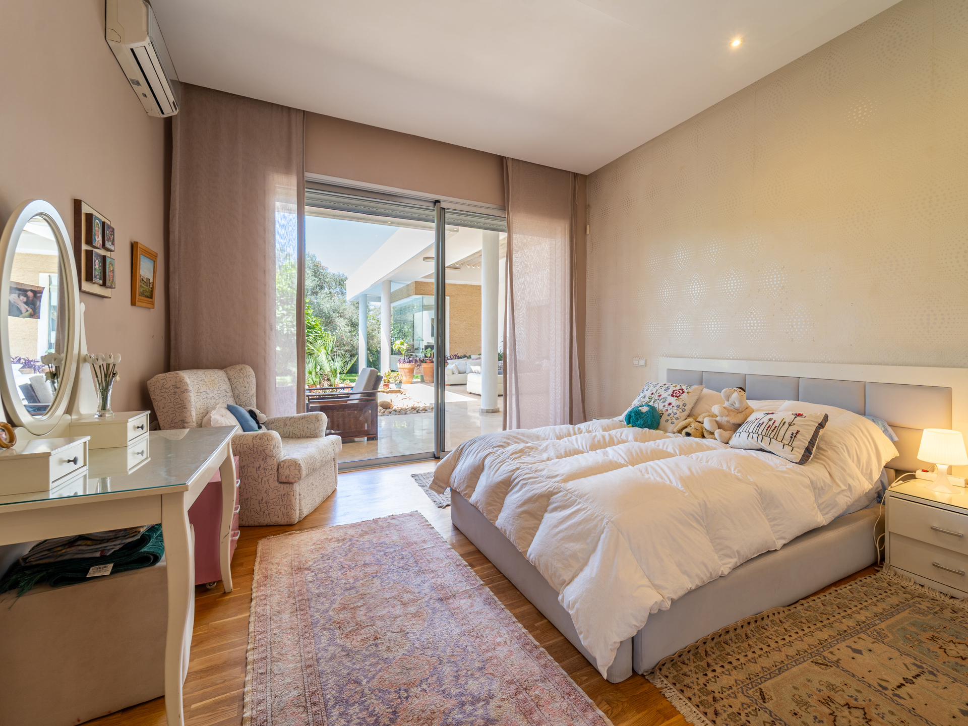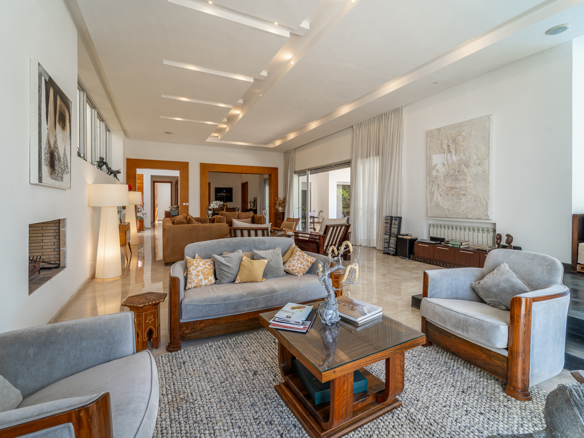 Built on a 2,000 m² plot, the property offers a built area of 750 m² spread over two levels. The ground floor opens onto a vast, light-filled reception area, featuring a living room with a fireplace and a stylish guest powder room. The private quarters include a cozy family lounge, a master suite with dressing room and bathroom, as well as three junior suites, each with its own private bathroom. A functional pantry and a spacious, convivial kitchen complete this level. The generous basement accommodates a laundry room, a service kitchen, a staff bedroom with a bathroom, multiple storage areas, a music room, an inner courtyard, and a large multifunctional room with parquet flooring and a bathroom—ideal for a gym, playroom, or home cinema. This villa, with no overlooking neighbors, impresses with its high-quality finishes: marble floors, solid wood parquet, cedar joinery, integrated sound system, central gas heating, and split air conditioning. An exceptional property offering comfort, privacy, and elegance in one of Rabat’s most sought-after neighborhoods.