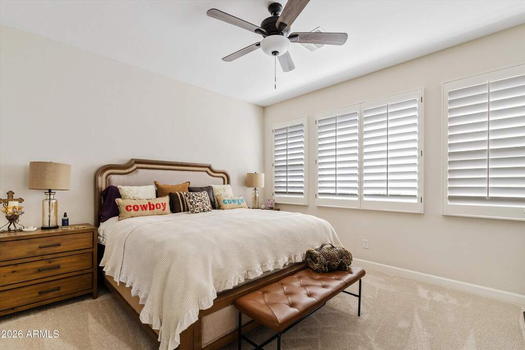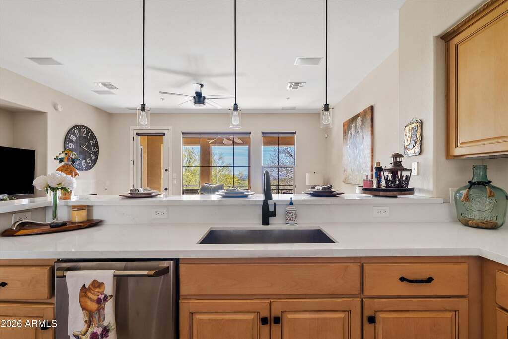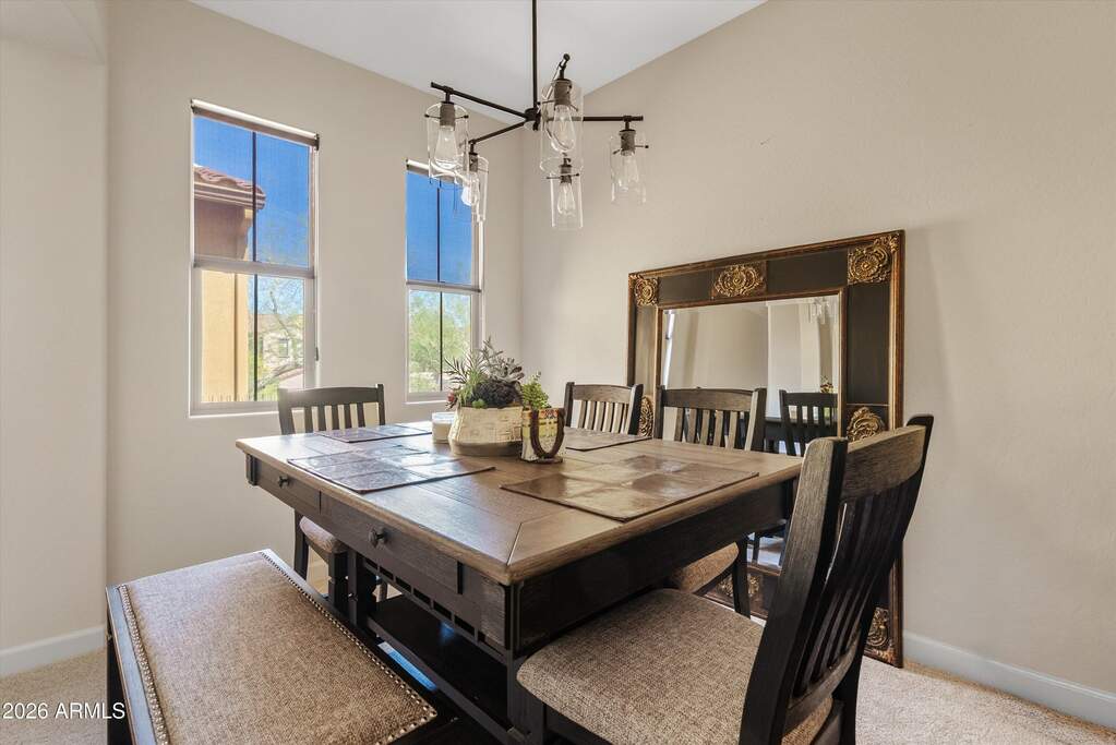 Stunning townhome right at the 18th hole located in the highly sought-after gated community of Encore at Grayhawk. Perfectly positioned on a premium lot, this home showcases breathtaking views of city lights, surrounding mountains, and the Grayhawk Talon Retreat Golf Course. The gourmet kitchen is thoughtfully designed with custom cabinetry featuring oil-rubbed bronze pulls, sleek quartz countertops, a stylish backsplash, breakfast bar, Lusso sink, GE Cafe appliances, and a 5-burner gas cooktop with griddle--ideal for both everyday living and entertaining. Additional highlights include freshly painted exterior, brand-new carpet, a cozy gas fireplace in the family room, a south-facing covered balcony to enjoy the views, and a spacious 2-car garage with durable epoxy flooring. The luxurious primary suite offers a generous walk-in closet and a spa-inspired bathroom complete with dual sinks, quartz counters, custom mirrors and fixtures, a relaxing soaking tub, and a frameless glass walk-in shower. Residents of the gated Encore community enjoy exceptional amenities, including a private access road, heated pool and spa, expansive BBQ area, fitness center, and a beautifully appointed clubhouse with a full kitchen and recreation space.