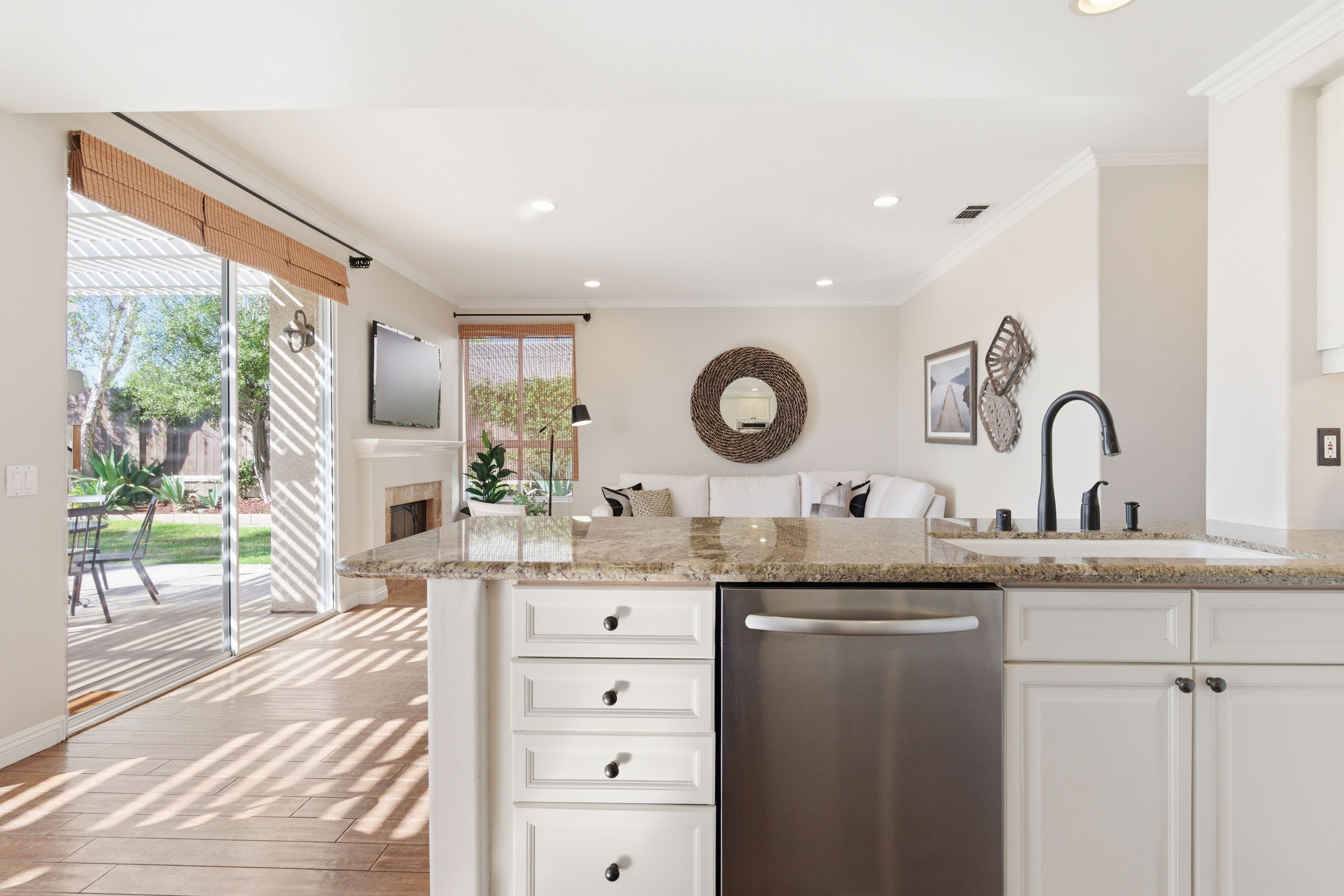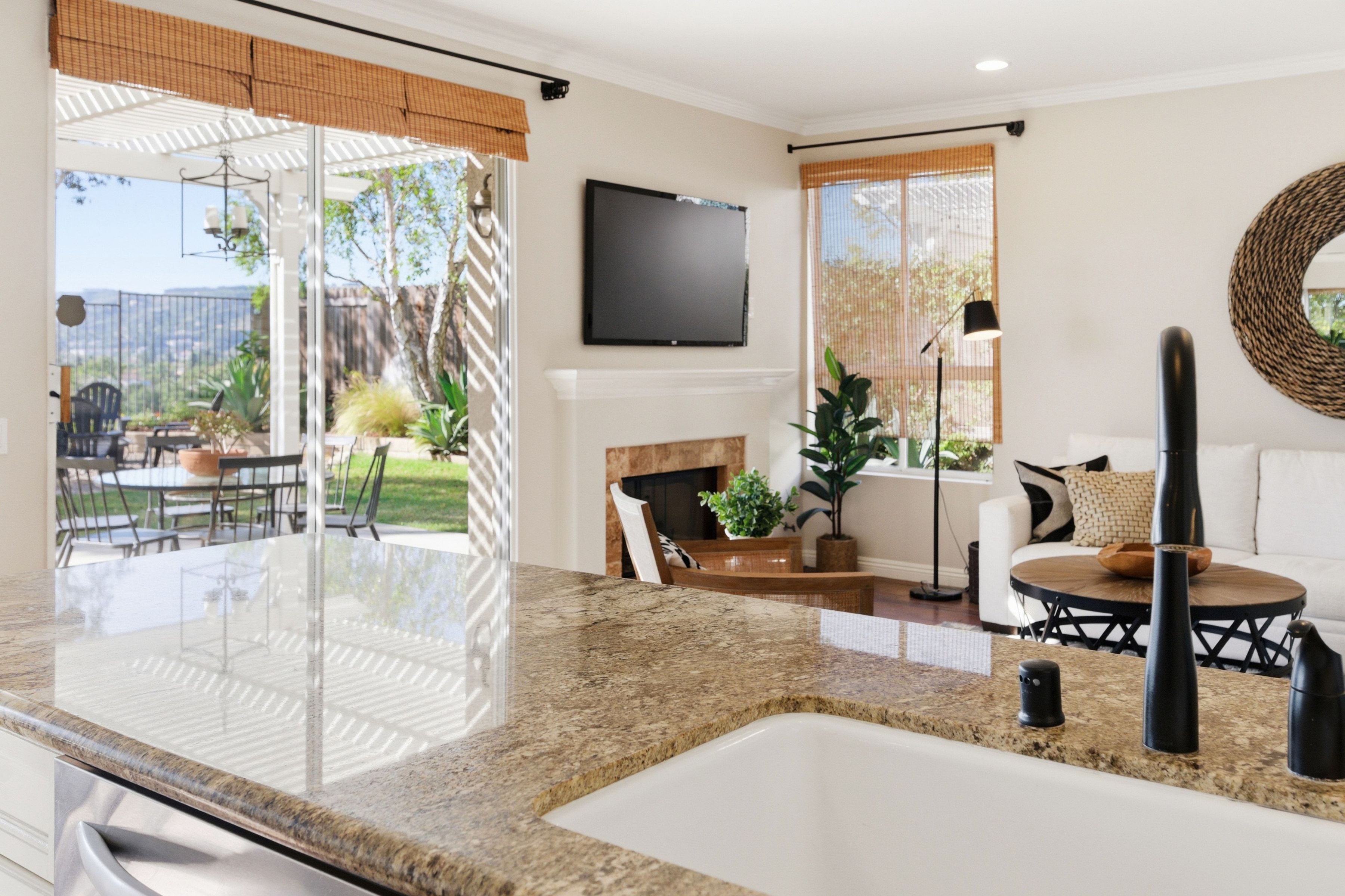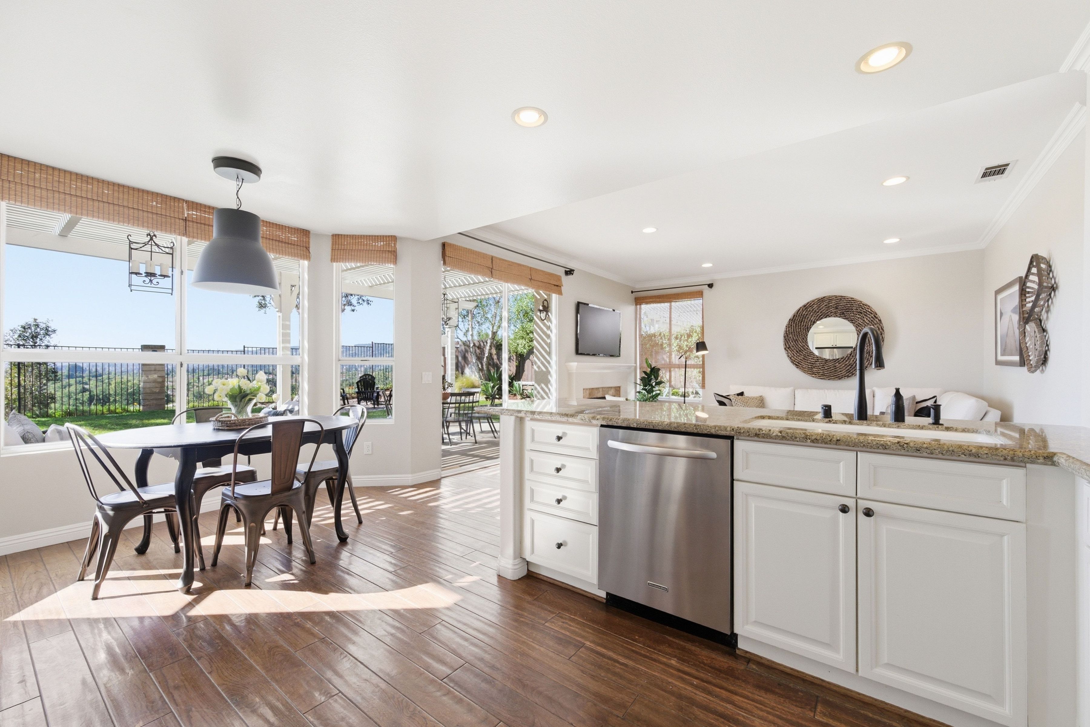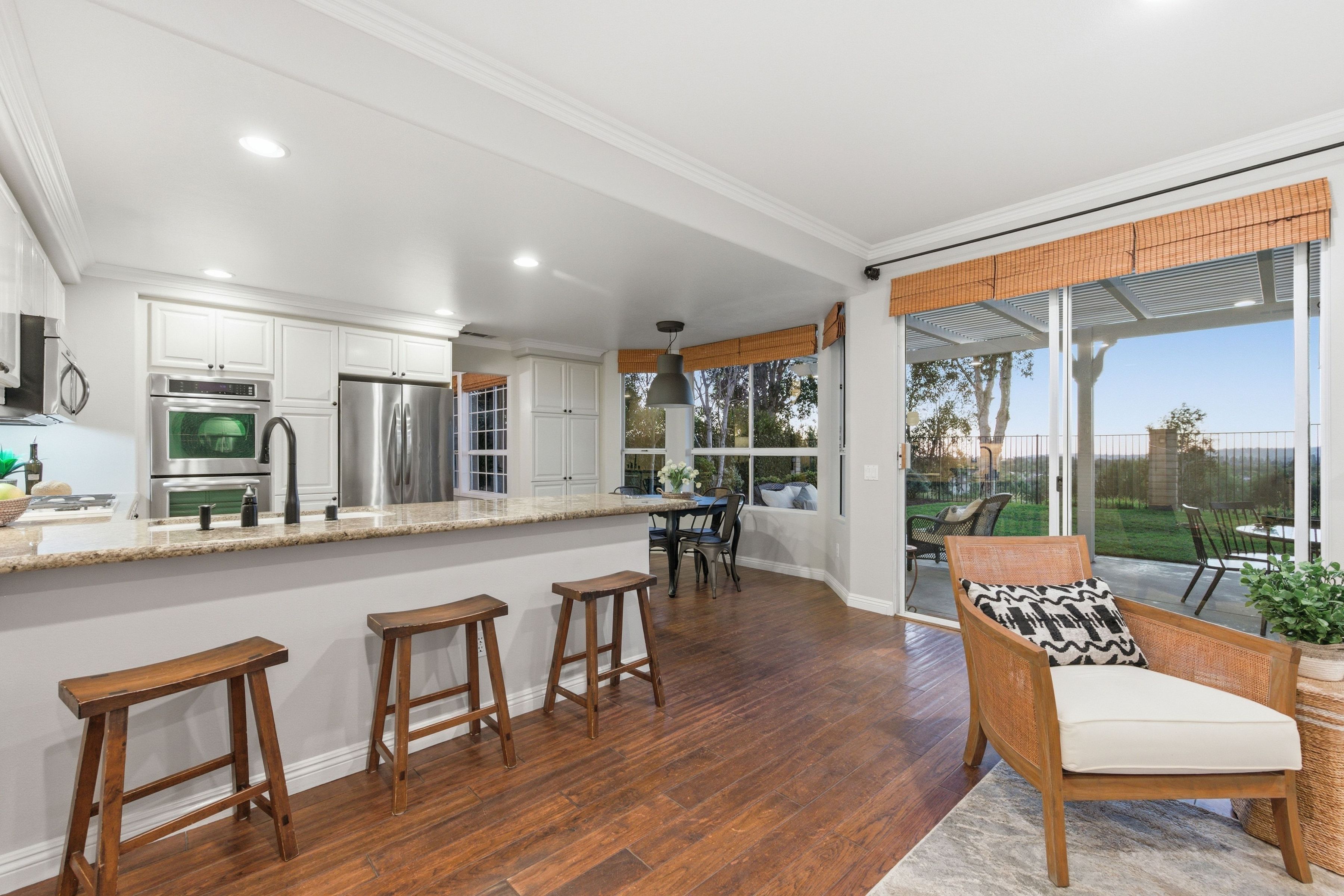 Nestled in the highly sought-after Mission Oaks neighborhood of Camarillo, this beautifully maintained two-story residence offers exceptional curb appeal and a warm, inviting presence from the moment you arrive. Thoughtfully designed, the home features a desirable floor plan with 4 bedrooms and 3.5 bathrooms, including a convenient downstairs bedroom with its own private bath--ideal for guests, multigenerational living, or a private home office. The entry opens to a large, light-filled living room that flows effortlessly into the dining area, creating an elegant space for gatherings and everyday living. The heart of the home is the spacious family room, complete with a cozy fireplace and seamless access to the kitchen. The kitchen itself is generously sized and well-appointed, offering stainless steel appliances, ample cabinetry, and plenty of counter space for cooking and entertaining. A downstairs laundry area and powder bathroom add to the home's functionality and comfort. This home also features distressed wood flooring, crown molding, and large baseboards that elevate the home style with a refined yet welcoming feel. Upstairs, the expansive primary suite serves as a peaceful retreat. The remodeled primary bathroom features modern finishes, dual vanities, and a huge walk-in closet designed for exceptional storage and organization. Two additional upstairs bedrooms include brand-new carpet, and all bathrooms throughout the home have been tastefully updated, ensuring a cohesive and contemporary aesthetic. The serene backyard oasis has meticulously landscaped grounds to create a sense of privacy and tranquility. A new covered patio and inviting sitting area provide the perfect setting for outdoor dining, relaxation, or simply enjoying the stunning views that make this property truly special. Whether hosting friends or savoring quiet moments, the outdoor space is designed to be enjoyed year-round. Located within close proximity to all three highly regarded local schools--Tierra Linda Elementary, Las Colinas Middle School, and Adolfo Camarillo High School--this home offers not only comfort and beauty but also convenience and community. With its thoughtful upgrades, versatile layout, and picturesque surroundings, this Mission Oaks gem is ready to welcome its next chapter.