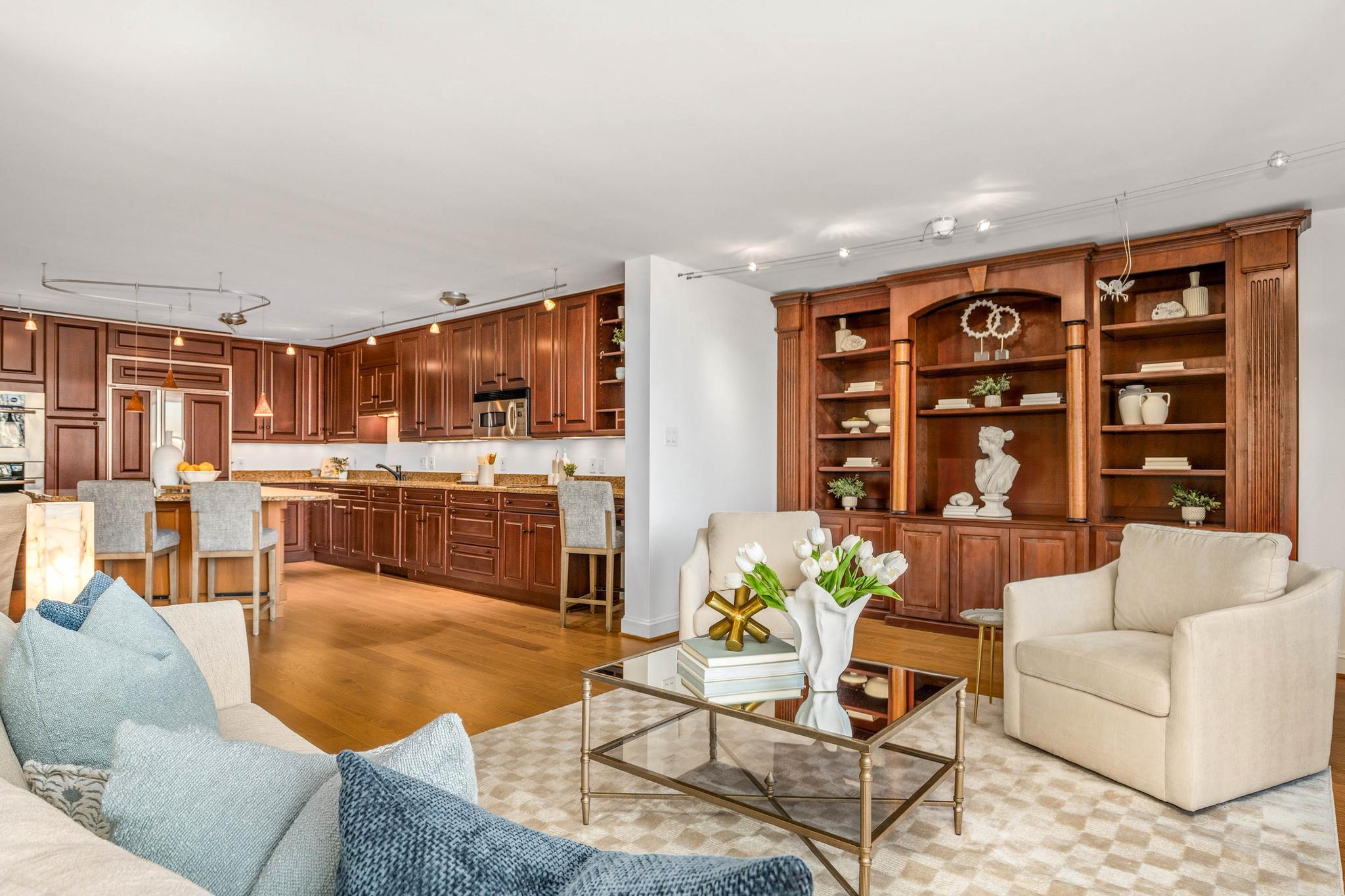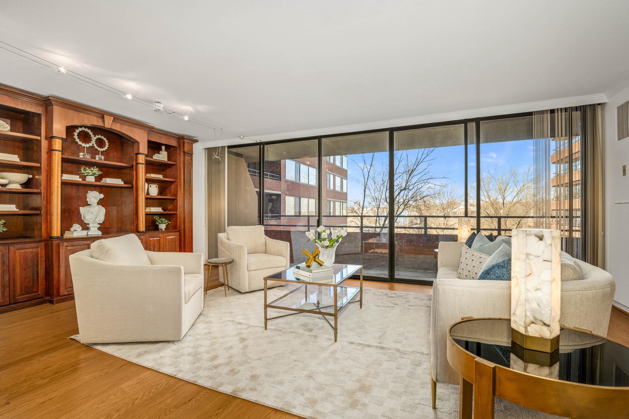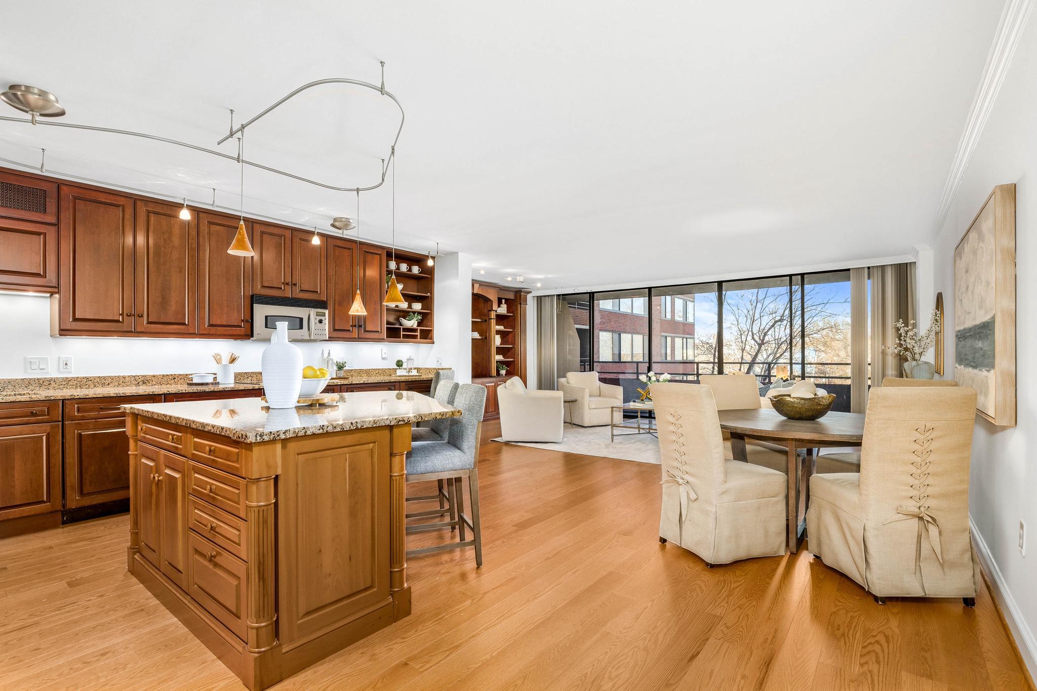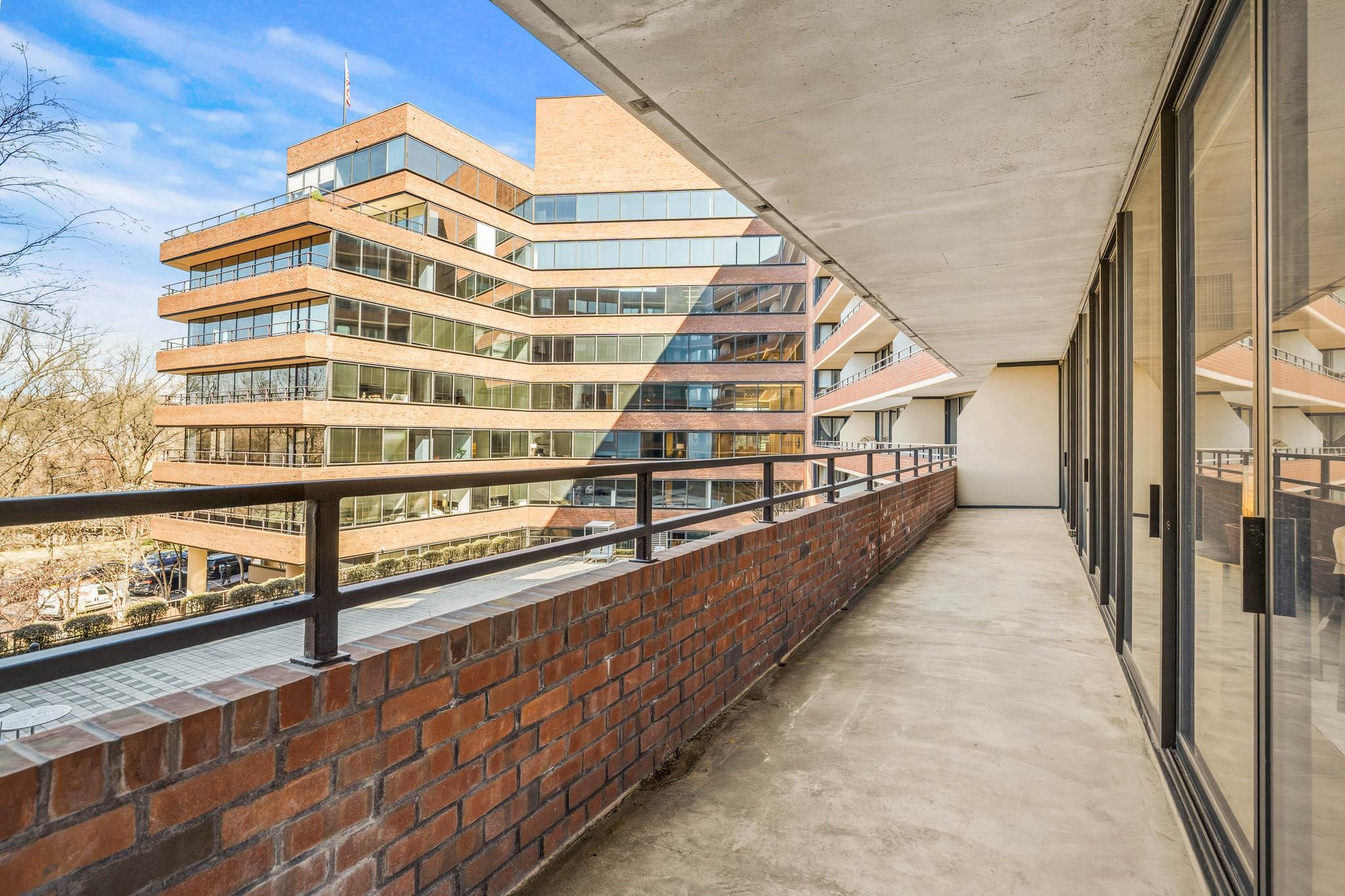 This expansive residence offers nearly 1,400 square feet of thoughtfully designed living space with sweeping sunset views from every room. The well-proportioned two-bedroom, two-bath layout features brand-new imported hardwood floors throughout and an exceptional 45-foot private balcony accessed through floor-to-ceiling sliding glass doors, creating seamless indoor-outdoor living with views toward Georgetown and Rock Creek Park. The open kitchen is anchored by a large center island with granite countertops, custom solid cherry cabinetry, and premium appliances including a Sub-Zero refrigerator and Bosch double ovens, along with additional Bosch appliances. The generous living area includes a custom built-in bookcase with integrated cabinetry, offering both style and functionality. The spacious primary suite features a walk-in closet plus an additional closet, along with a well-appointed bath offering a double vanity, soaking tub, and separate shower. The second bedroom also includes a walk-in closet, providing excellent storage and flexibility for guests or a home office. A side-by-side washer and dryer, garage parking, and a private storage unit complete the offering. Residents of The Westbridge enjoy a full-service lifestyle with 24-hour concierge and security, on-site management, building engineer, and dedicated porters. Building amenities include a heated outdoor swimming pool and a newly updated fitness center, while the corridors have recently been refreshed with new lighting, carpeting, and paint. The building is pet-friendly.Located in the vibrant West End, the residence is moments from Georgetown, Rock Creek Park trails, Trader Joe’s, the Foggy Bottom Metro, and many of Washington’s most acclaimed restaurants and hotels, as well as convenient access to the World Bank and IMF.