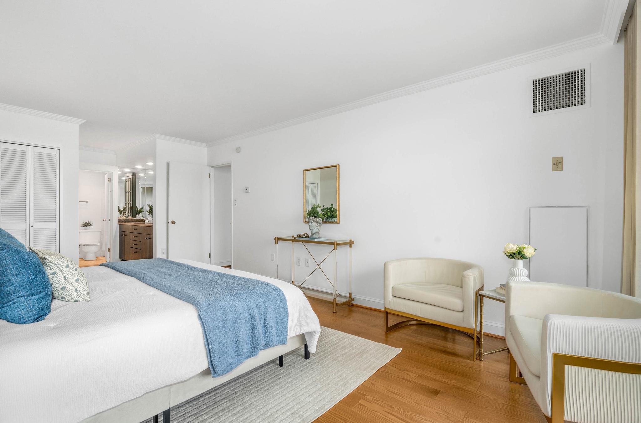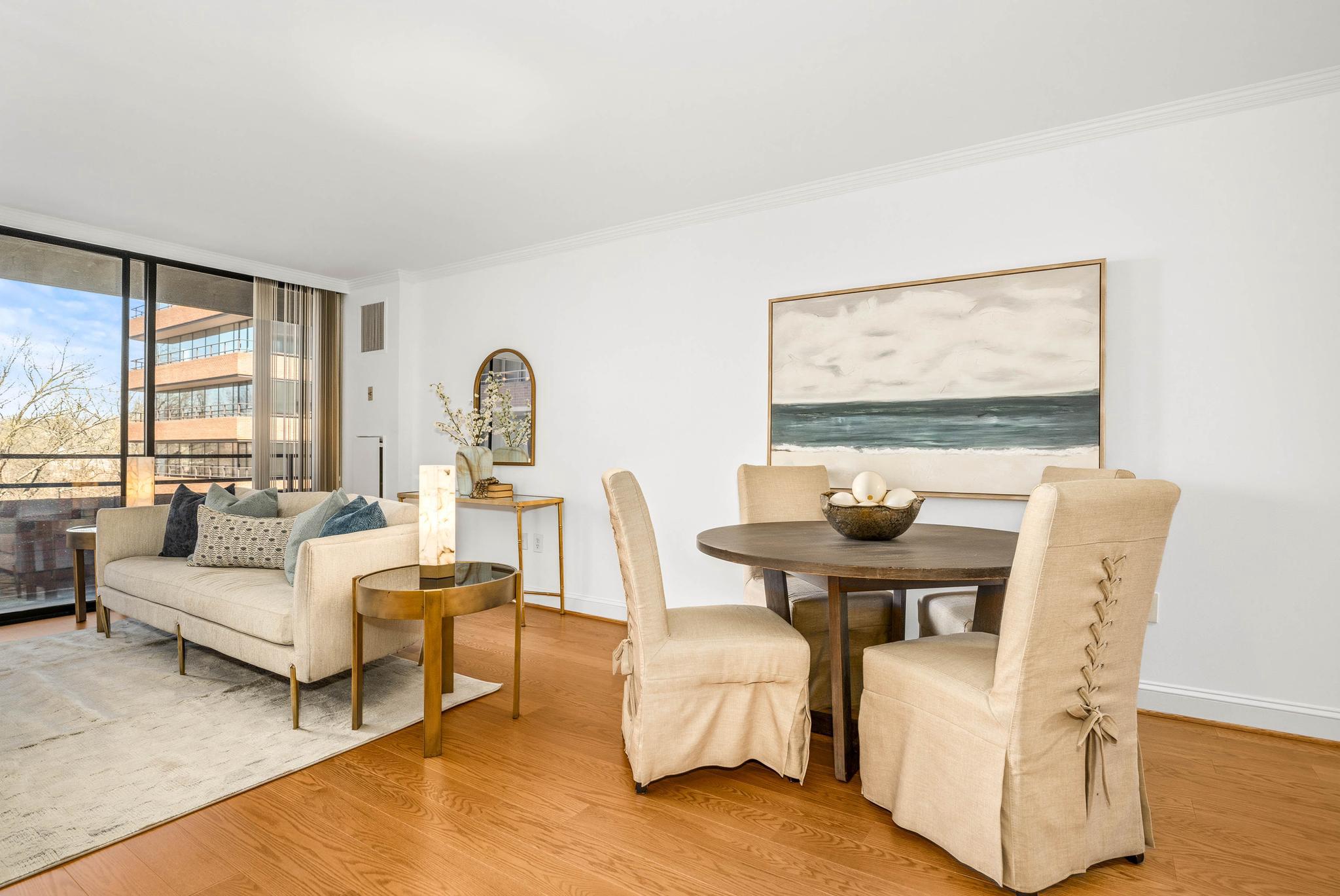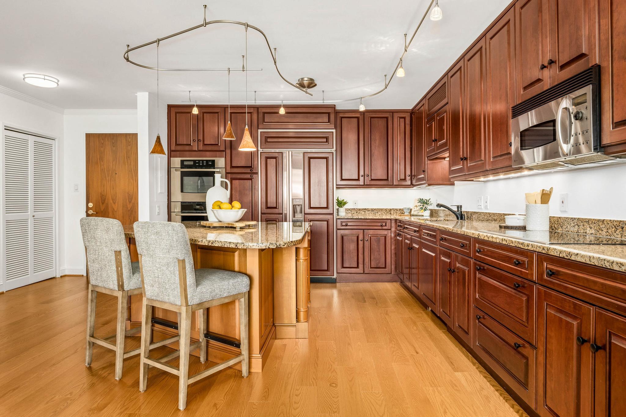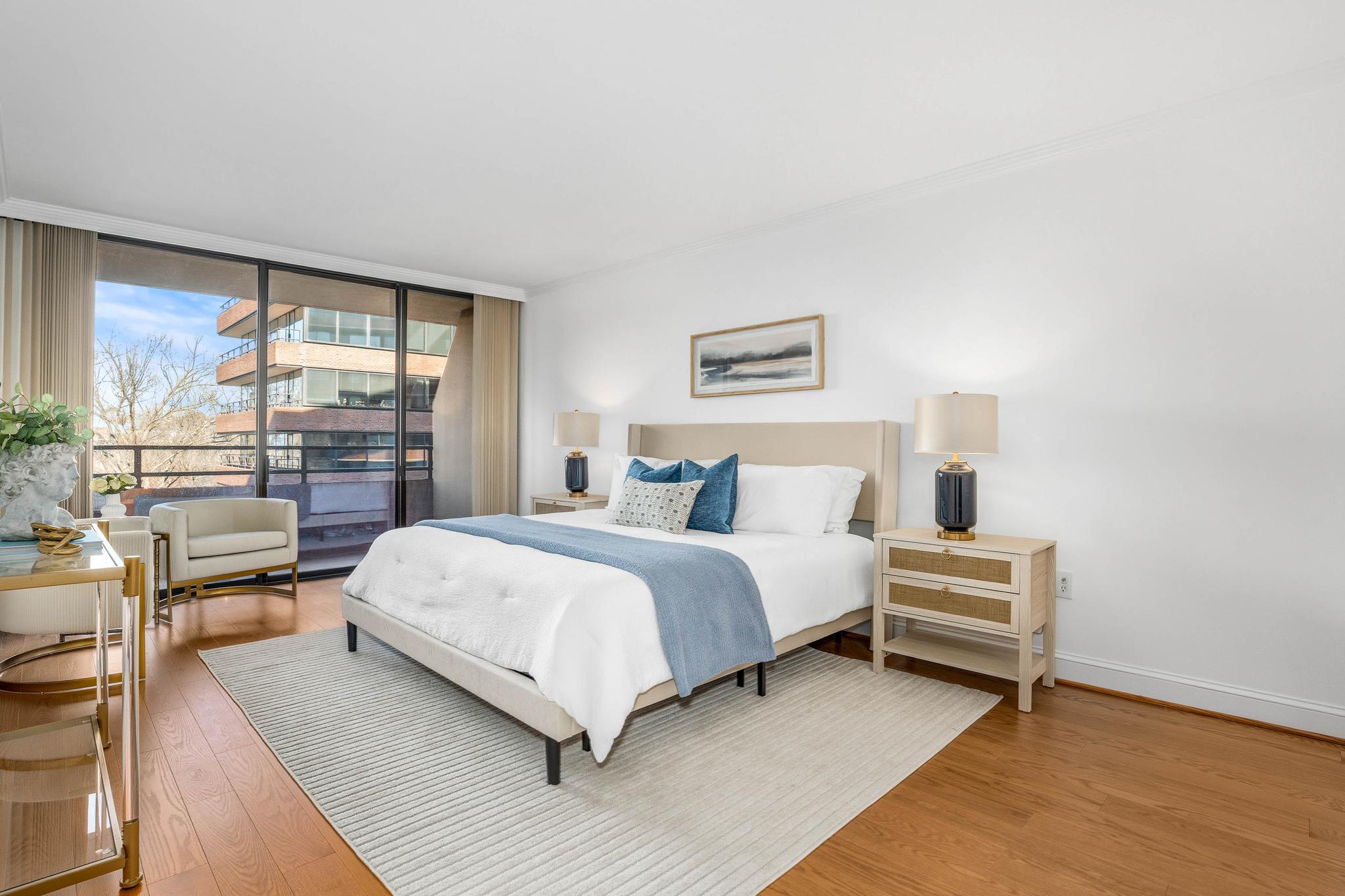 This expansive residence offers nearly 1,400 square feet of thoughtfully designed living space with sweeping sunset views from every room. The well-proportioned two-bedroom, two-bath layout features brand-new imported hardwood floors throughout and an exceptional 45-foot private balcony accessed through floor-to-ceiling sliding glass doors, creating seamless indoor-outdoor living with views toward Georgetown and Rock Creek Park. The open kitchen is anchored by a large center island with granite countertops, custom solid cherry cabinetry, and premium appliances including a Sub-Zero refrigerator and Bosch double ovens, along with additional Bosch appliances. The generous living area includes a custom built-in bookcase with integrated cabinetry, offering both style and functionality. The spacious primary suite features a walk-in closet plus an additional closet, along with a well-appointed bath offering a double vanity, soaking tub, and separate shower. The second bedroom also includes a walk-in closet, providing excellent storage and flexibility for guests or a home office. A side-by-side washer and dryer, garage parking, and a private storage unit complete the offering. Residents of The Westbridge enjoy a full-service lifestyle with 24-hour concierge and security, on-site management, building engineer, and dedicated porters. Building amenities include a heated outdoor swimming pool and a newly updated fitness center, while the corridors have recently been refreshed with new lighting, carpeting, and paint. The building is pet-friendly.Located in the vibrant West End, the residence is moments from Georgetown, Rock Creek Park trails, Trader Joe’s, the Foggy Bottom Metro, and many of Washington’s most acclaimed restaurants and hotels, as well as convenient access to the World Bank and IMF.
