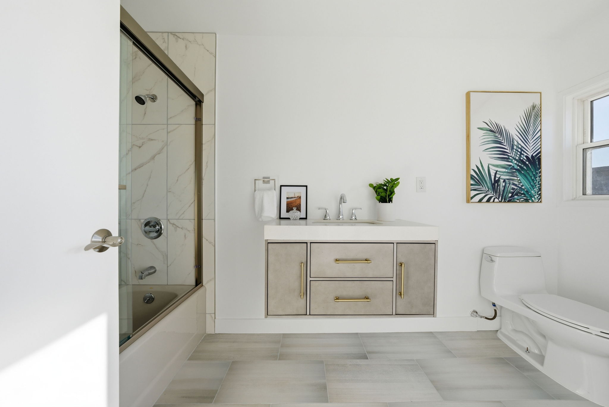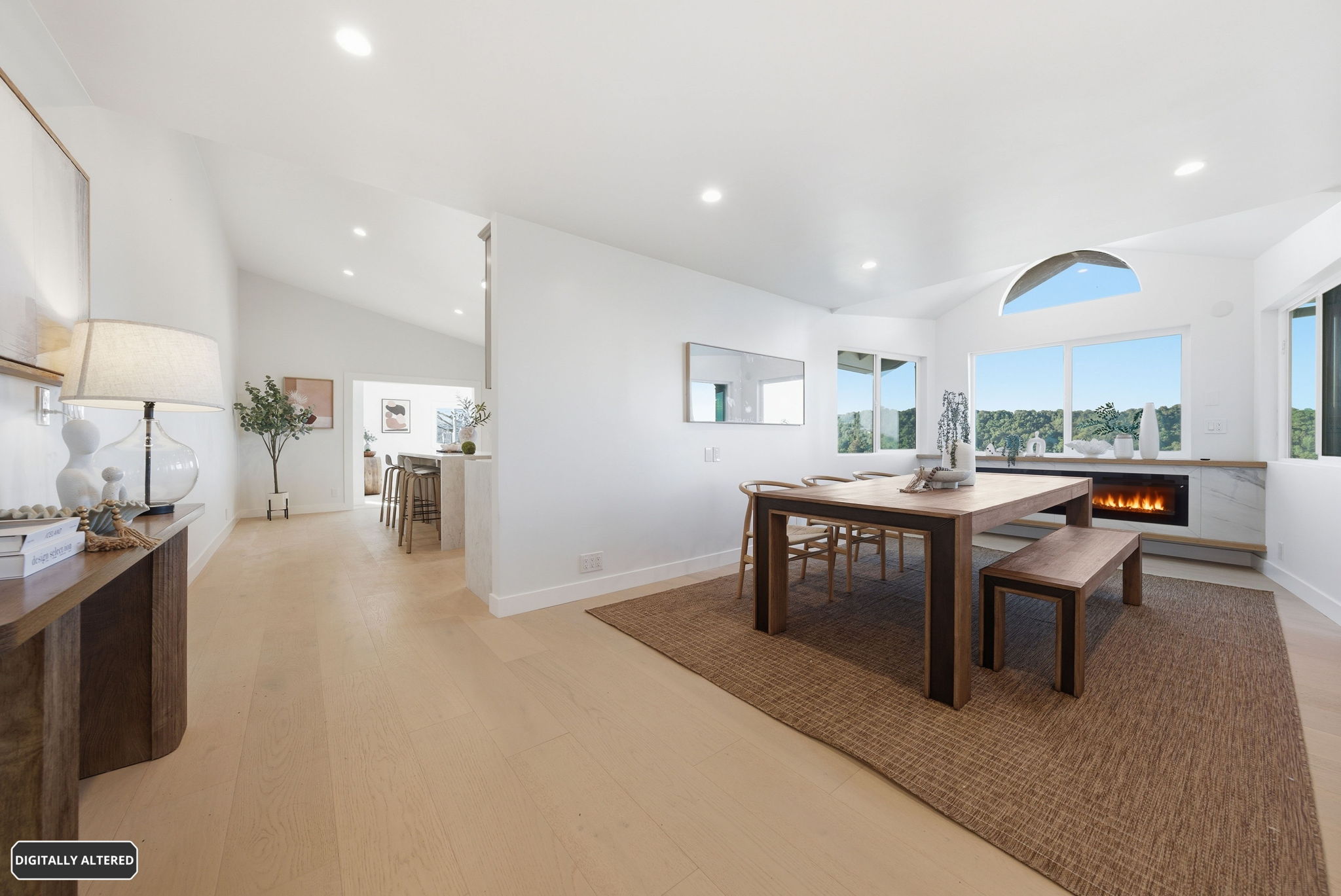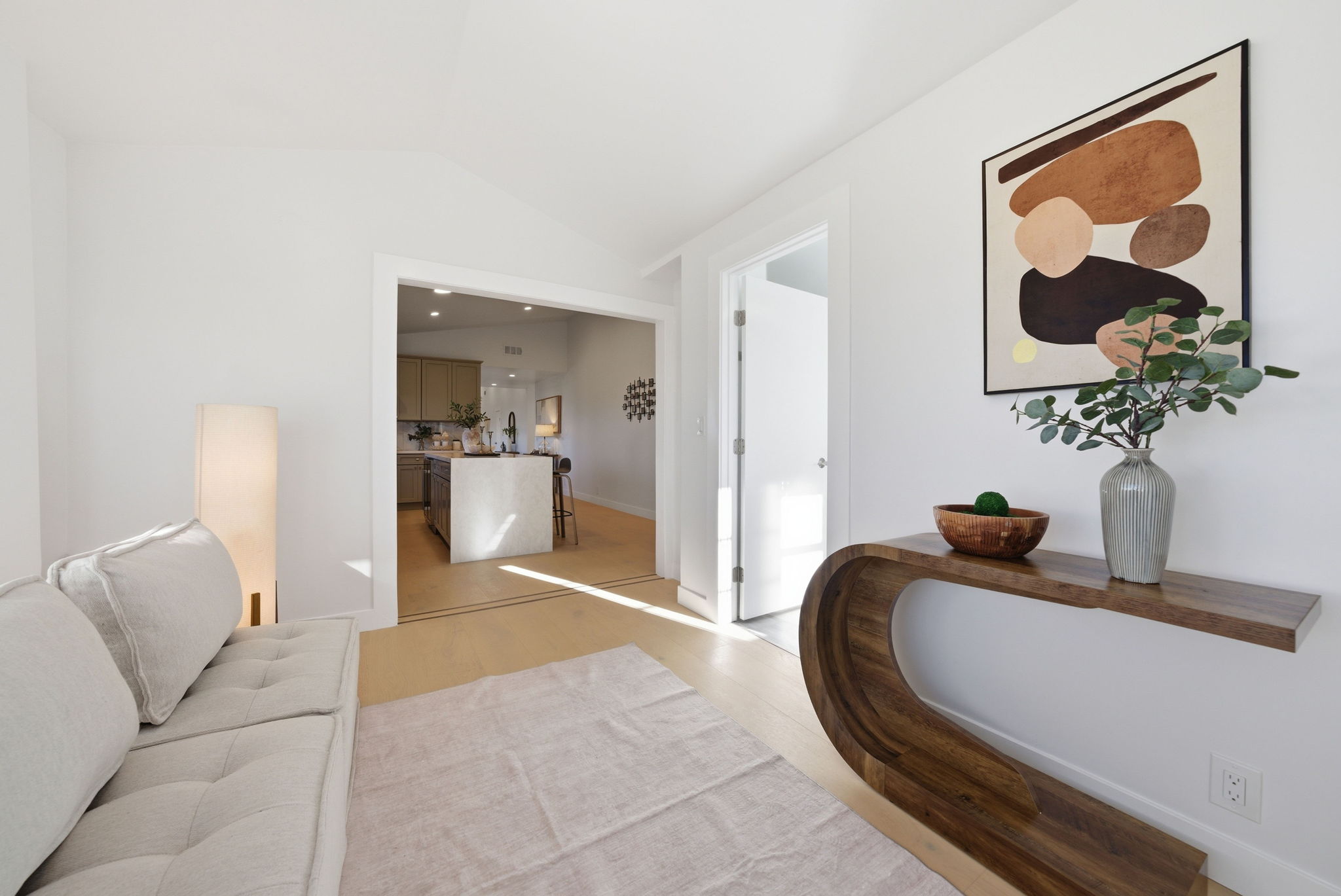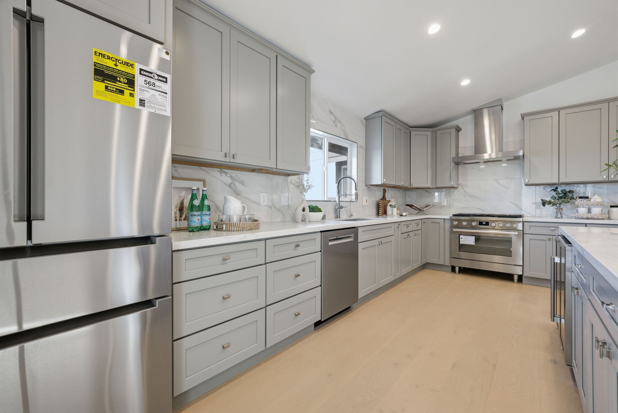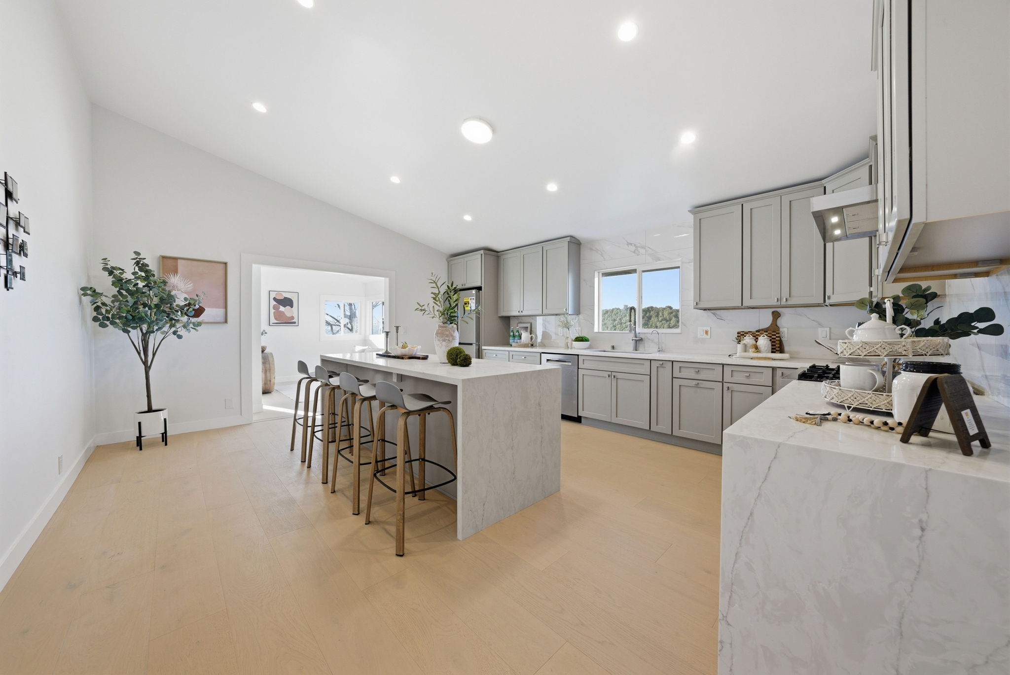 A private gated entry welcomes you into this serene retreat. Inside, the expansive living room provides the perfect setting for relaxing or entertaining, enhanced by recessed lighting throughout that adds warmth and modern sophistication. The chef's kitchen serves as the heart of the home, complete with a striking waterfall island, high-end stainless steel appliances, a wine fridge, and quartz countertopsideal for cooking and gathering.