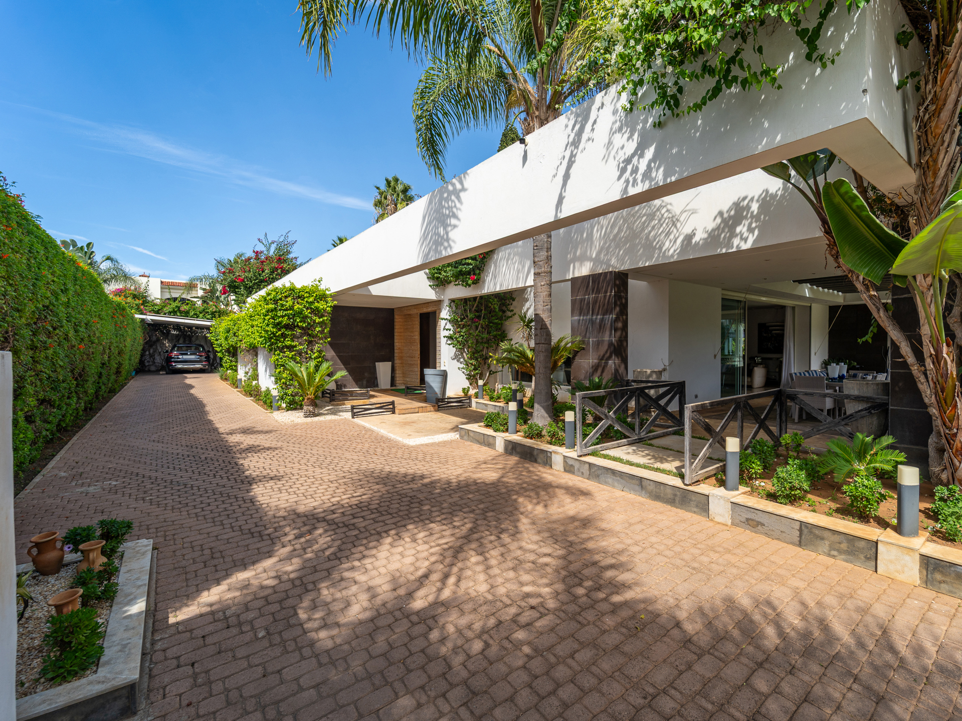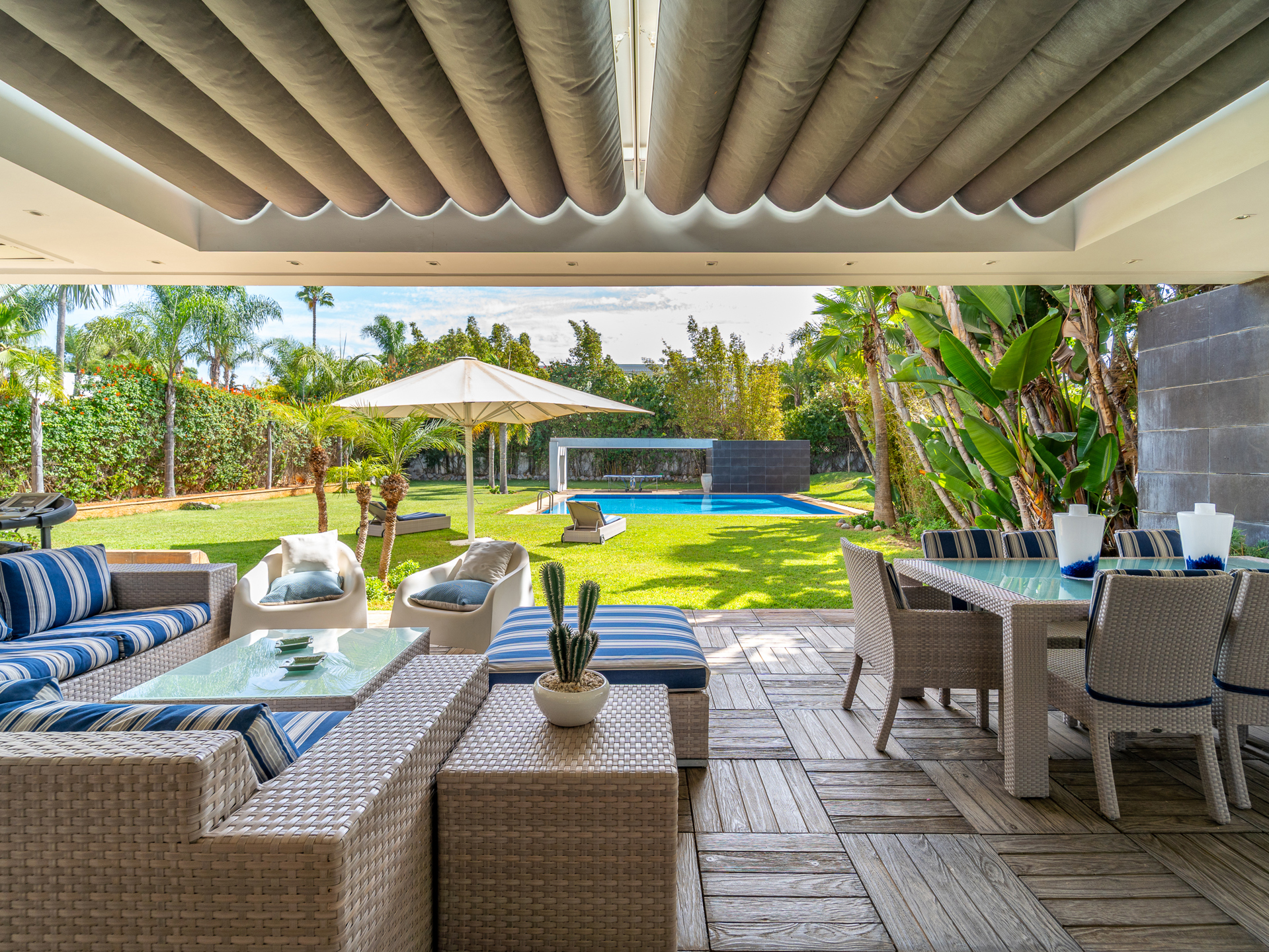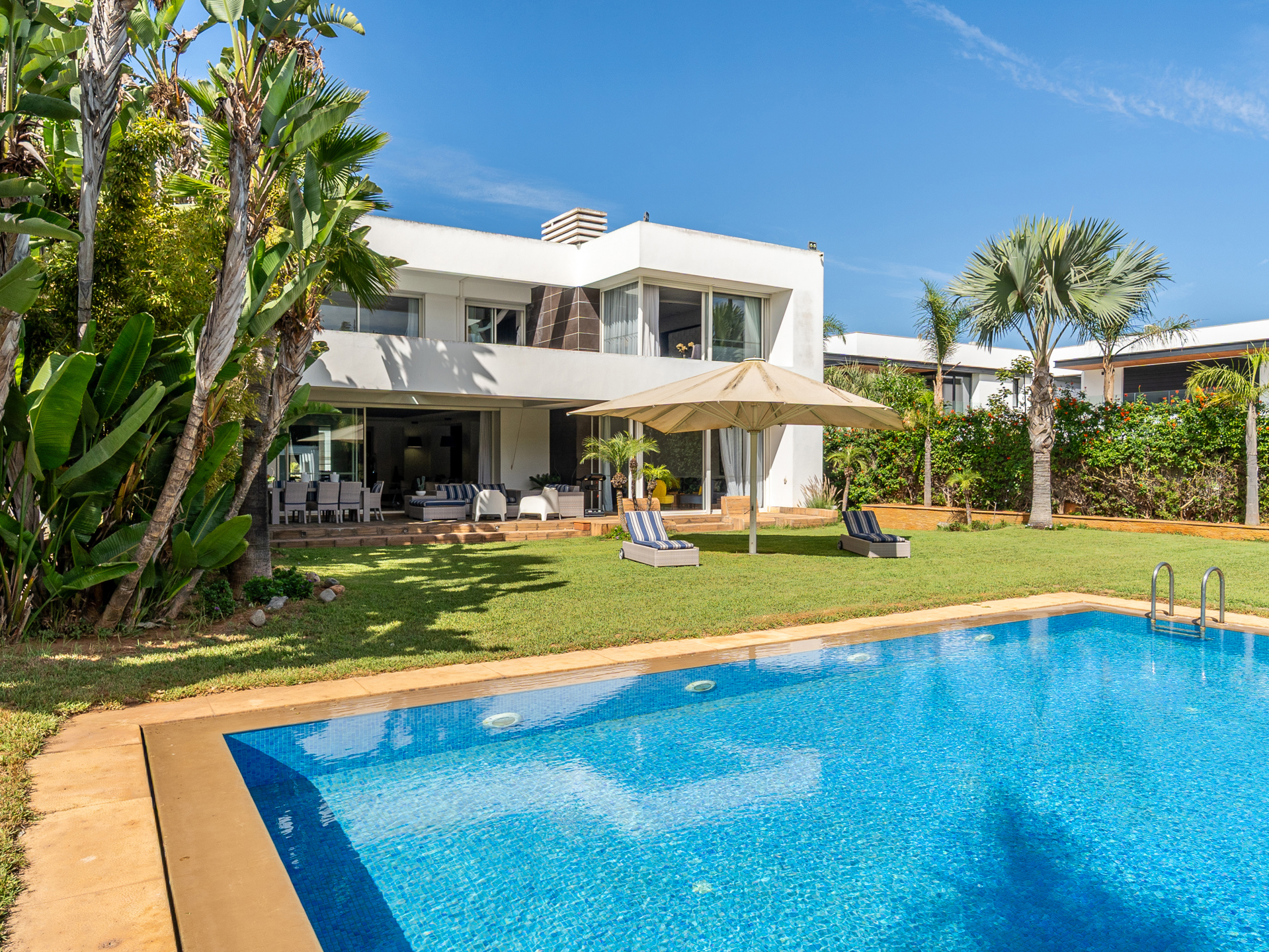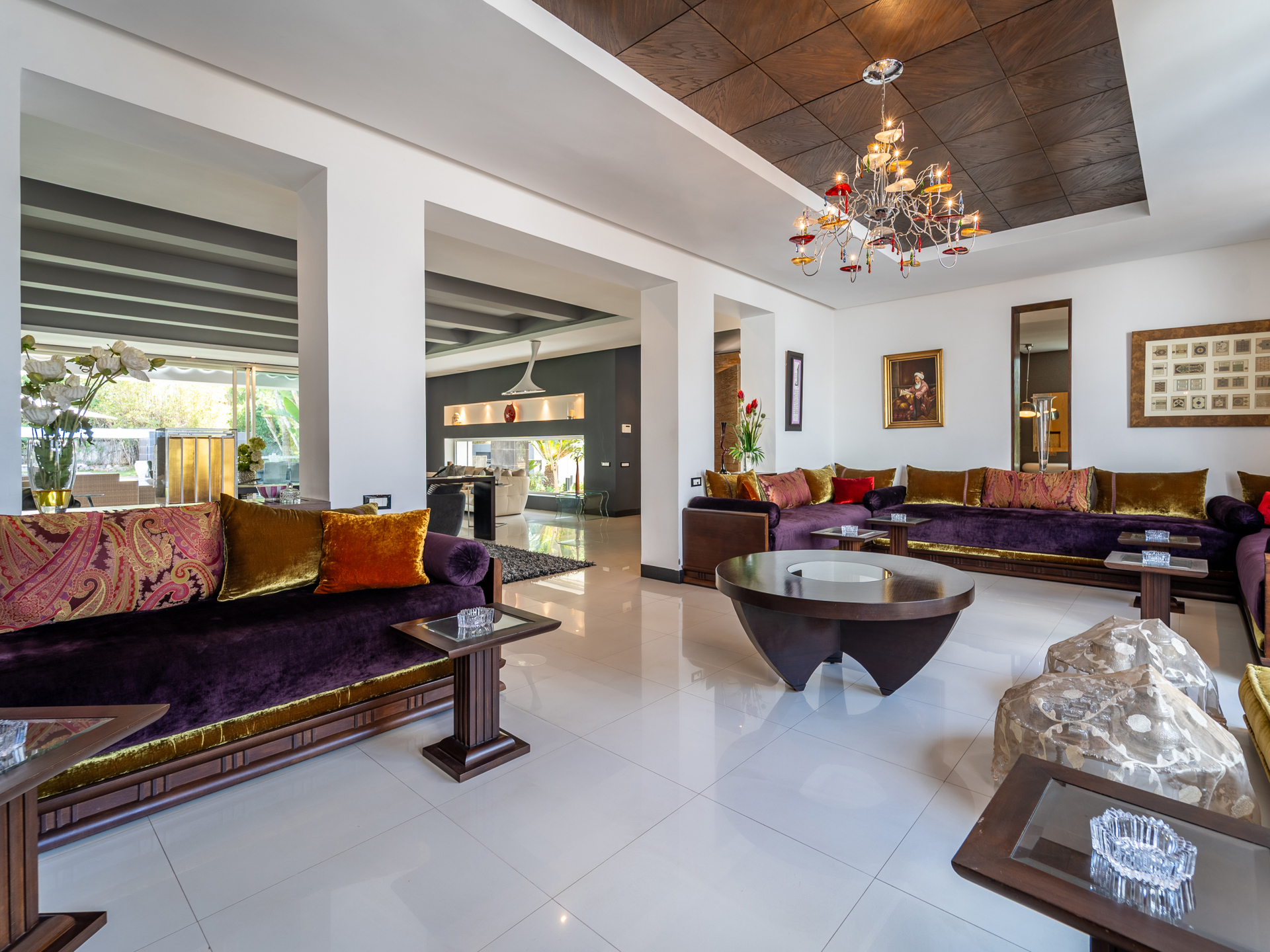 Morocco Sotheby's International Realty in Rabat, presents this villa of 1.000 m² habitable, set in the heart of its garden of 2.000 m² and ideally located in the quiet and secure Orangeraie. Situated in one of Rabat's most sought-after districts, this villa exemplifies refinement and elegance. Spread over three levels, the property offers generous living spaces, a lush garden, and a large swimming pool, all set in an environment of absolute tranquility. On the ground floor, you will find a traditional Moroccan lounge offering a warm ambiance, as well as a modern European lounge. The living area, complete with a fireplace, opens out onto a magnificent garden, while a large dining room allows you to entertain in style. This level also features a guest bedroom with an en-suite bathroom and dressing room, as well as open-plan guest areas with double shower rooms. Additionally, it includes a high-quality fitted kitchen, a practical laundry room overlooking the courtyard, a staff bedroom, and a storeroom. Upstairs, the master suite, featuring a fireplace, is a true sanctuary of luxury, complete with a spacious bathroom. A junior suite with an en-suite bathroom and two further bedrooms with a shared bathroom offers all the comforts you could wish for. The basement of this villa is designed for a resolutely modern and enjoyable lifestyle. It features a fully equipped gym with a sauna and jacuzzi, as well as a multi-purpose room (ideal for a cinema or games area) that opens onto the courtyard. Other facilities include a Garage for 10 cars, a lift, solid wood flooring, split air conditioning, central heating, Bose sound system. The Orangeraie district, part of the Souissi area, is characterized by its tranquillity and lush greenery, in the heart of Rabat. For further information about this property, please contact Zoubida Labdi on +212 6 67 99 08 09.