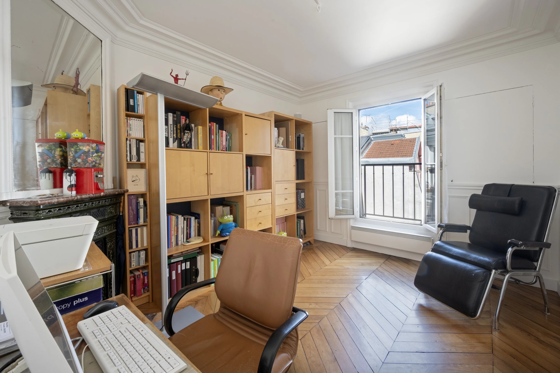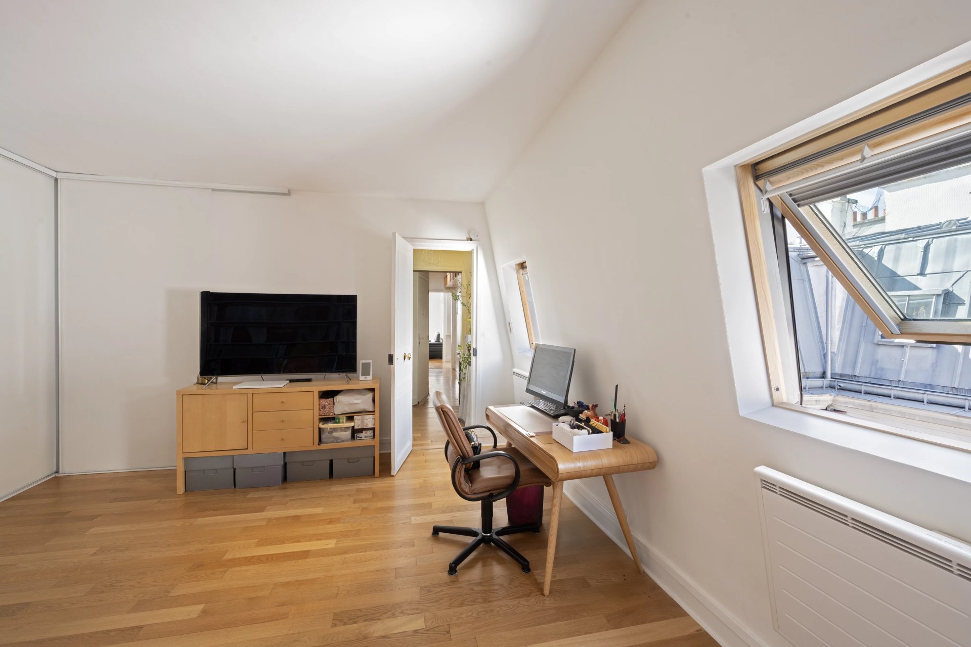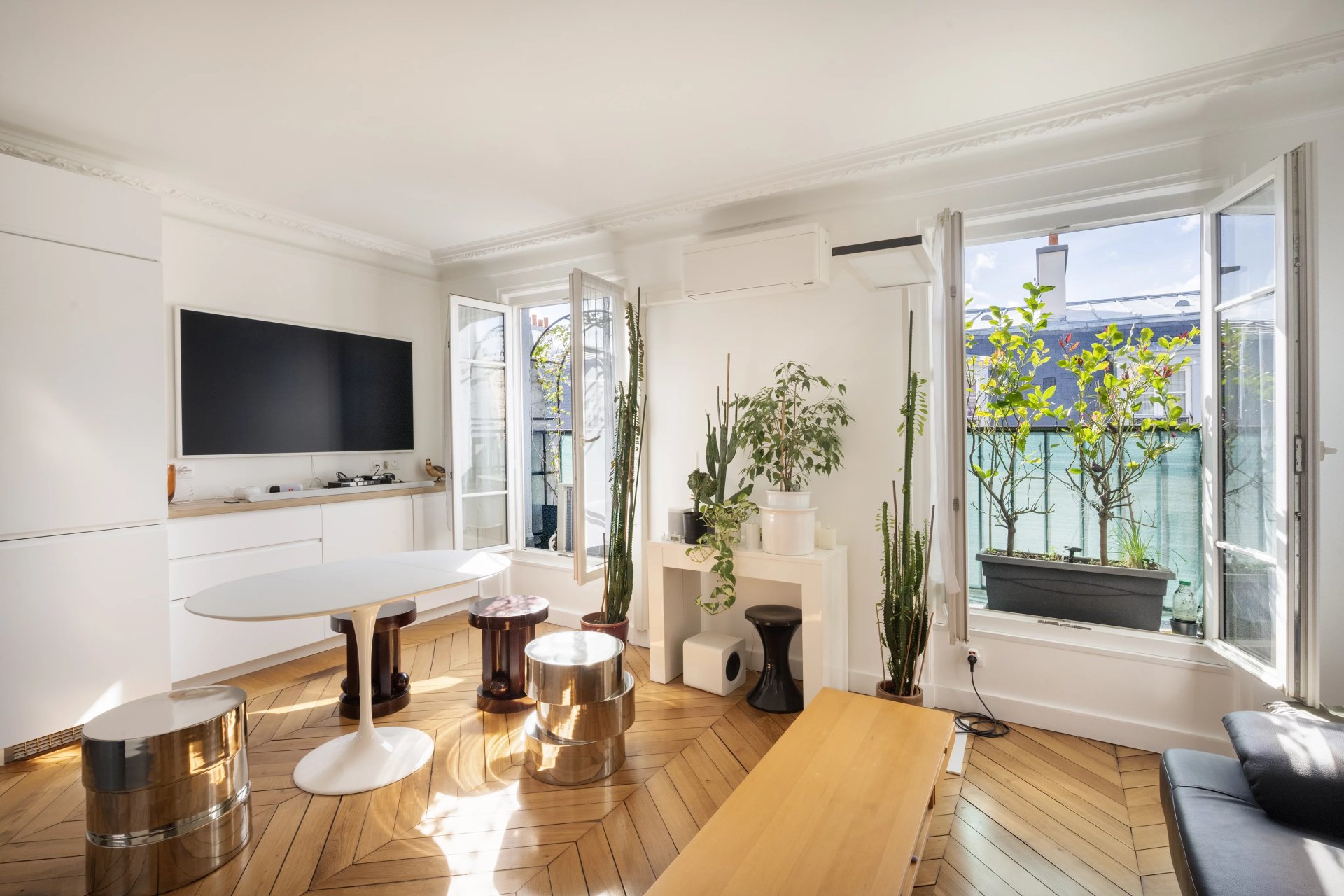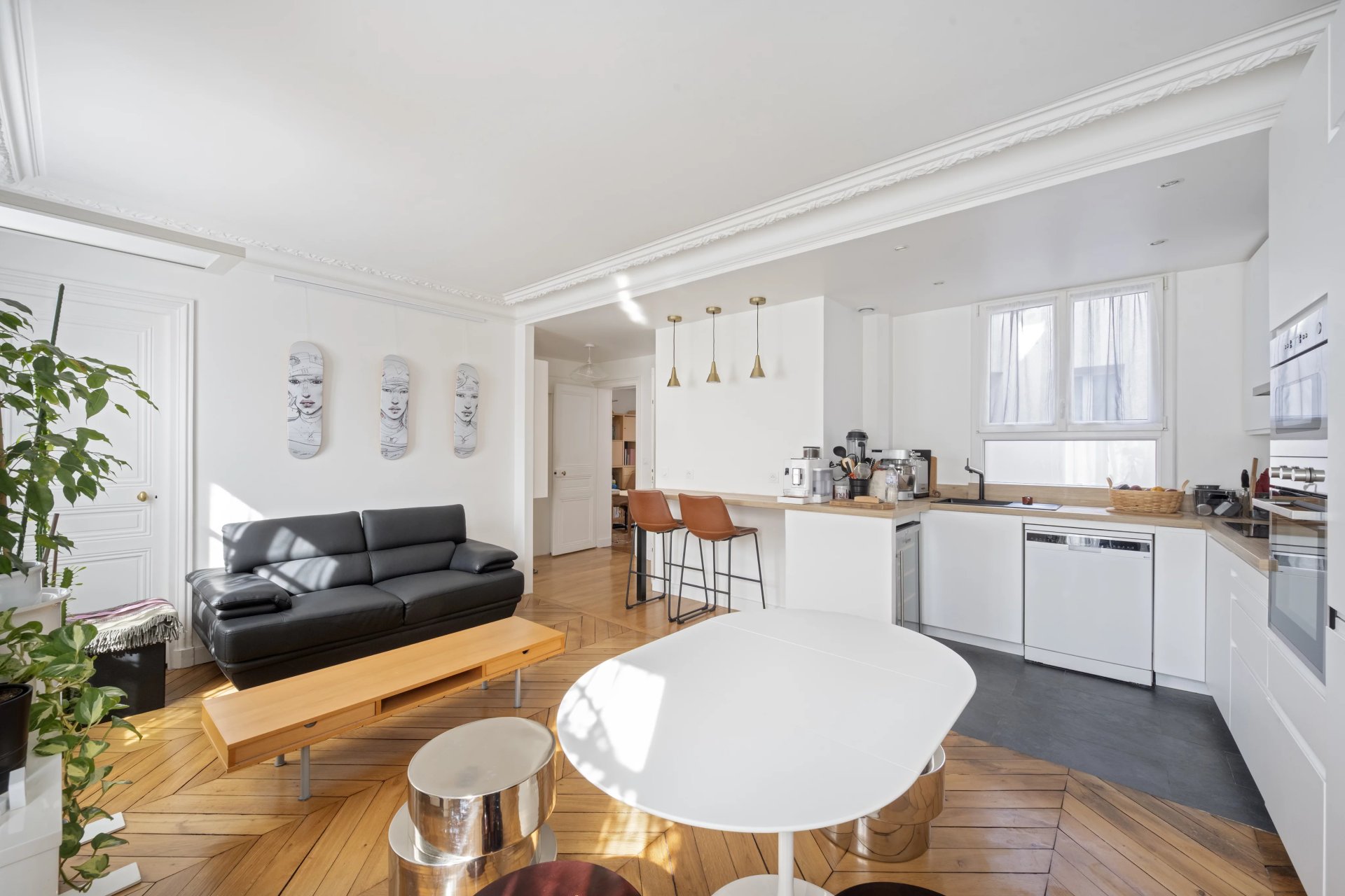 Rue de la Tour d'Auvergne. This air conditioned dual-aspect apartment is on the 5th and top floor of a fine early 20th century building. It includes a fully south-facing living/reception room with an open-plan kitchen, four bedrooms (three overlooking a courtyard, two communicating), a bathroom, a shower room and a utility room.